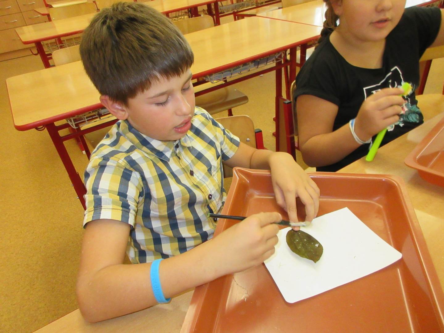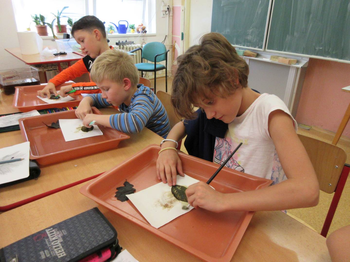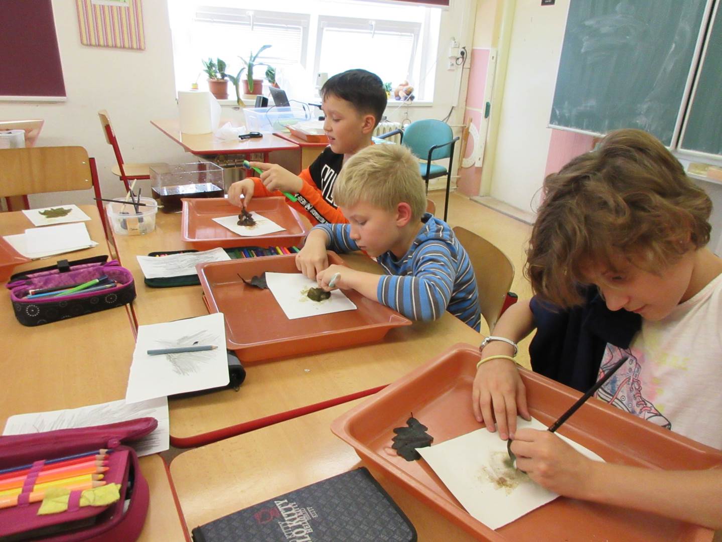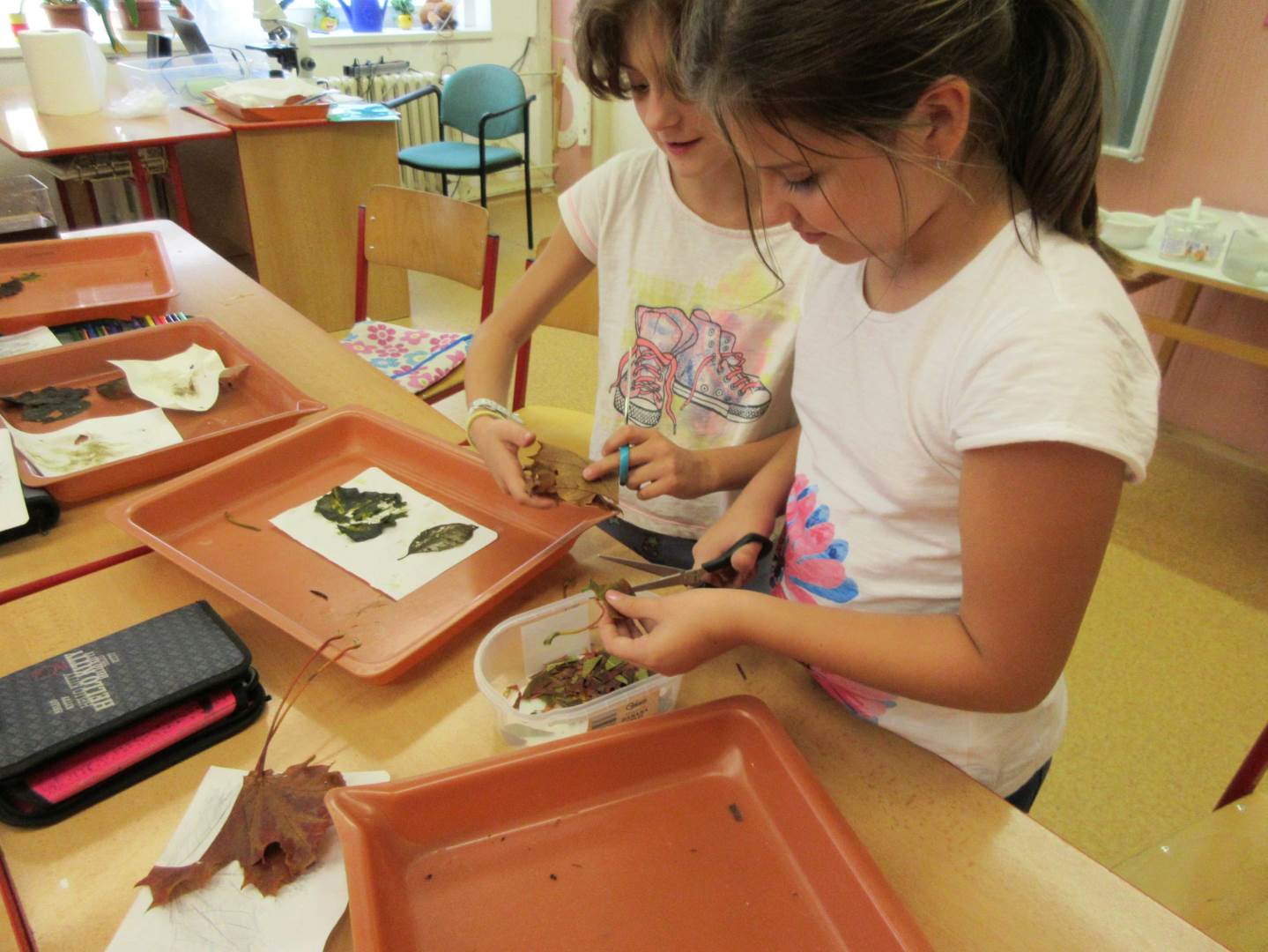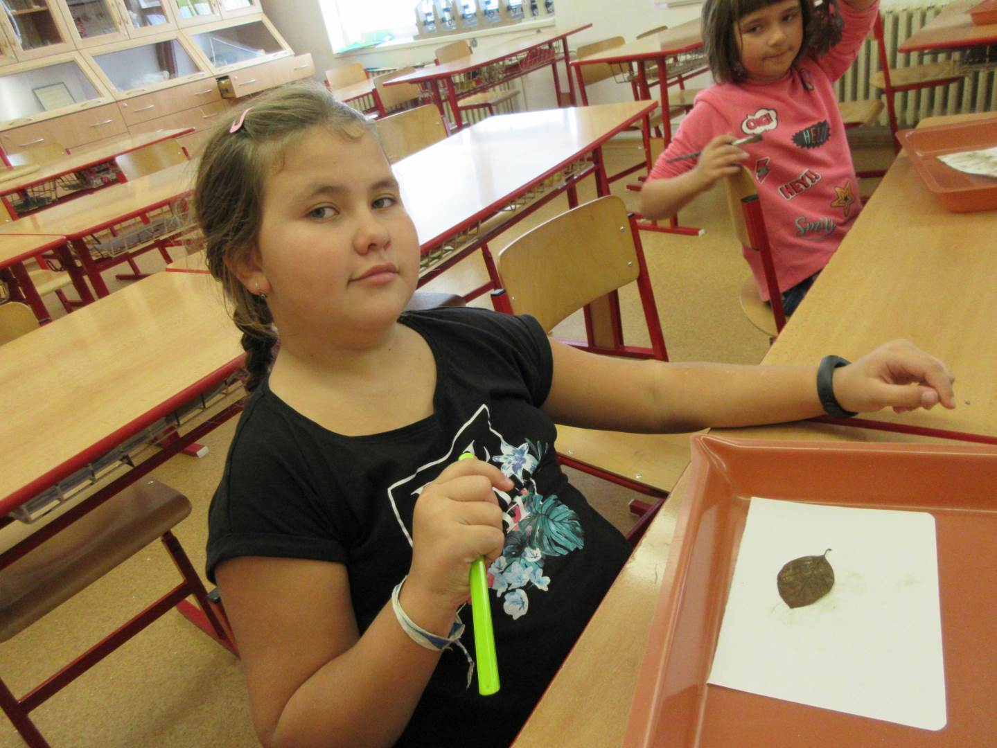 Pozorovali jsme žilnatinu listů, udělali jsme její frotáž. Udělali jsme obtisk průduchů, který jsme si prohlédli pod mikroskopem. Pak jsme z listů získávali jejich "kostřičku" a na závěr si na příště připravili výluh barev z listů.