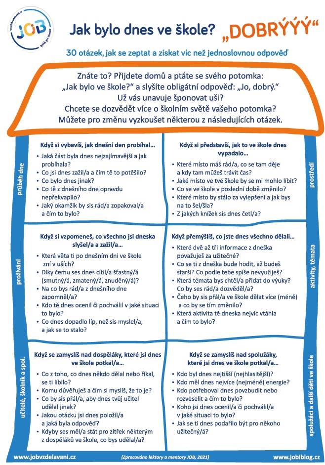Znáte to? Přijdete domů a ptáte se svého potomka "Jak bylo ve škole?" a slyšíte obligátní odpověď "Jo, dobrý." Chcete se dozvědět víc? Zkuste některou z otázek v letáčku (stáhnout zde), který zde uveřejňujeme se souhlasem jeho tvůrců ze stránek www.jobvzdelavani.cz