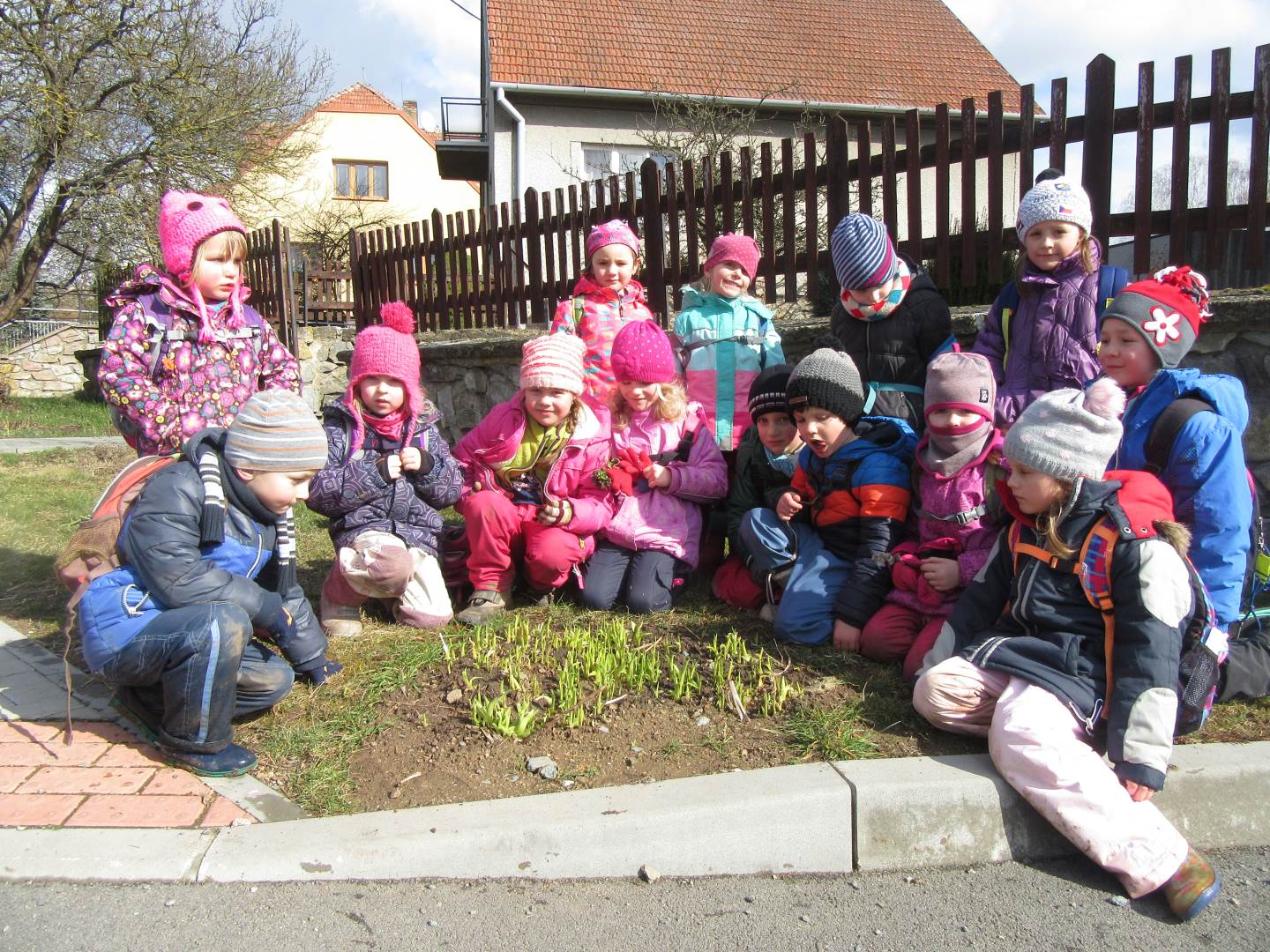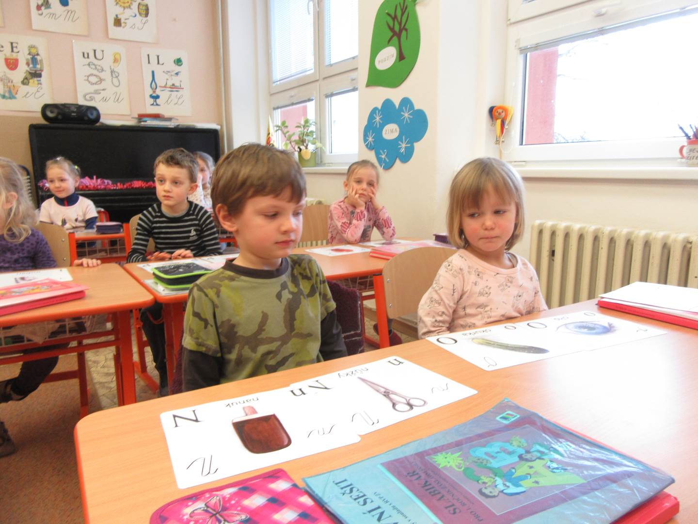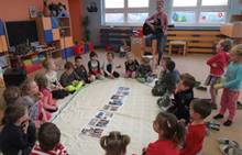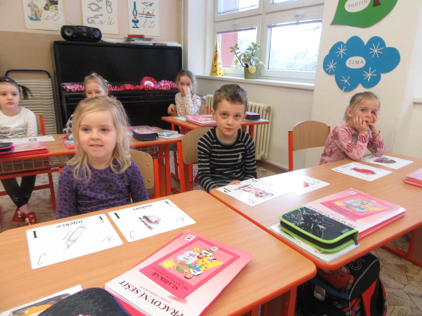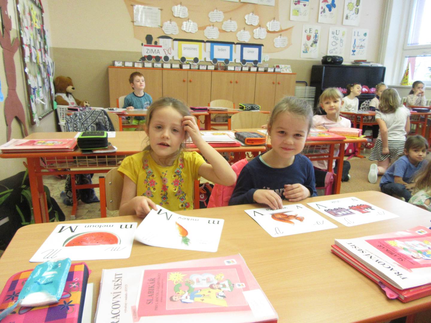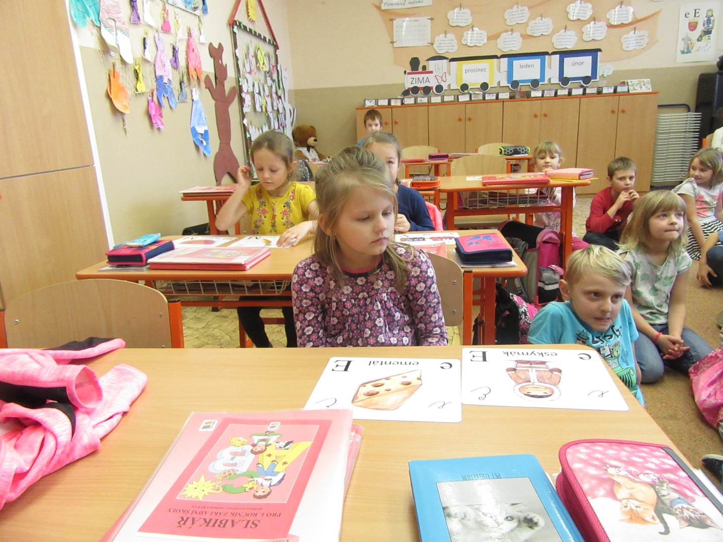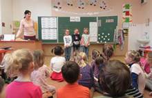 Ve středu jsme navštívili 1. třídu. Prvňáčci nám zarecitovali, my jsme prvňáčkům zazpívali a nakonec jsme společně zopakovali písmenka celé abecedy. Za odměnu všichni dostali bonbón a omalovánku. Po skvělém zážitku s prvňáčky jsme se vydali k maringotce, kde nás čekalo překvapení. Rybník, ve kterém bylo málo vody, teď vodou skoro přetékal. Hladina sahala až po lavečky. Tak děti lákalo si hrát s vodou. Děti pozorovaly housenky, sněženky a změny v přírodě.