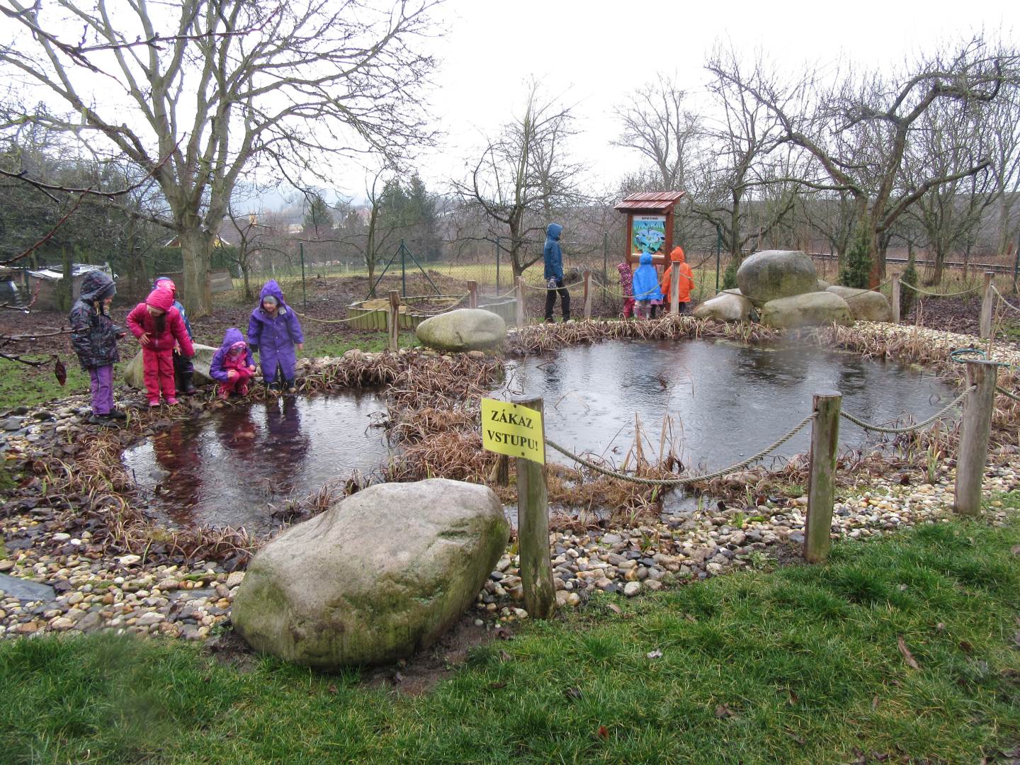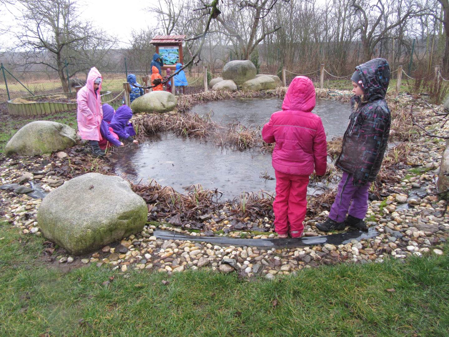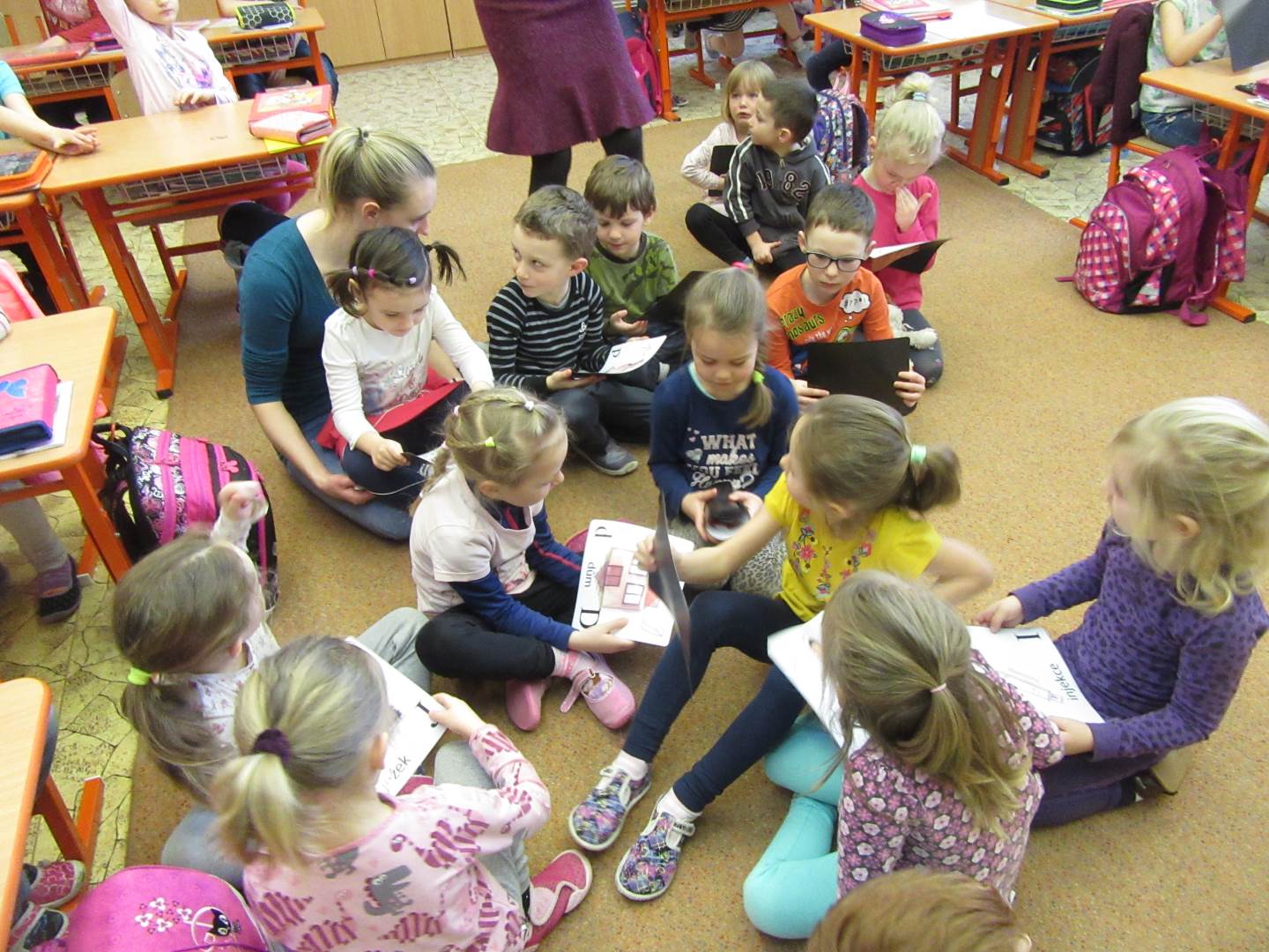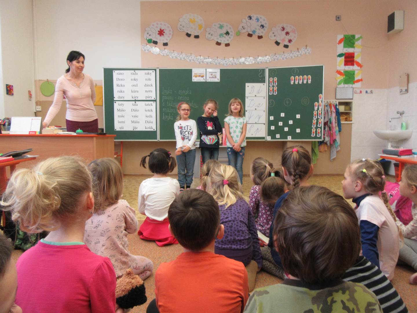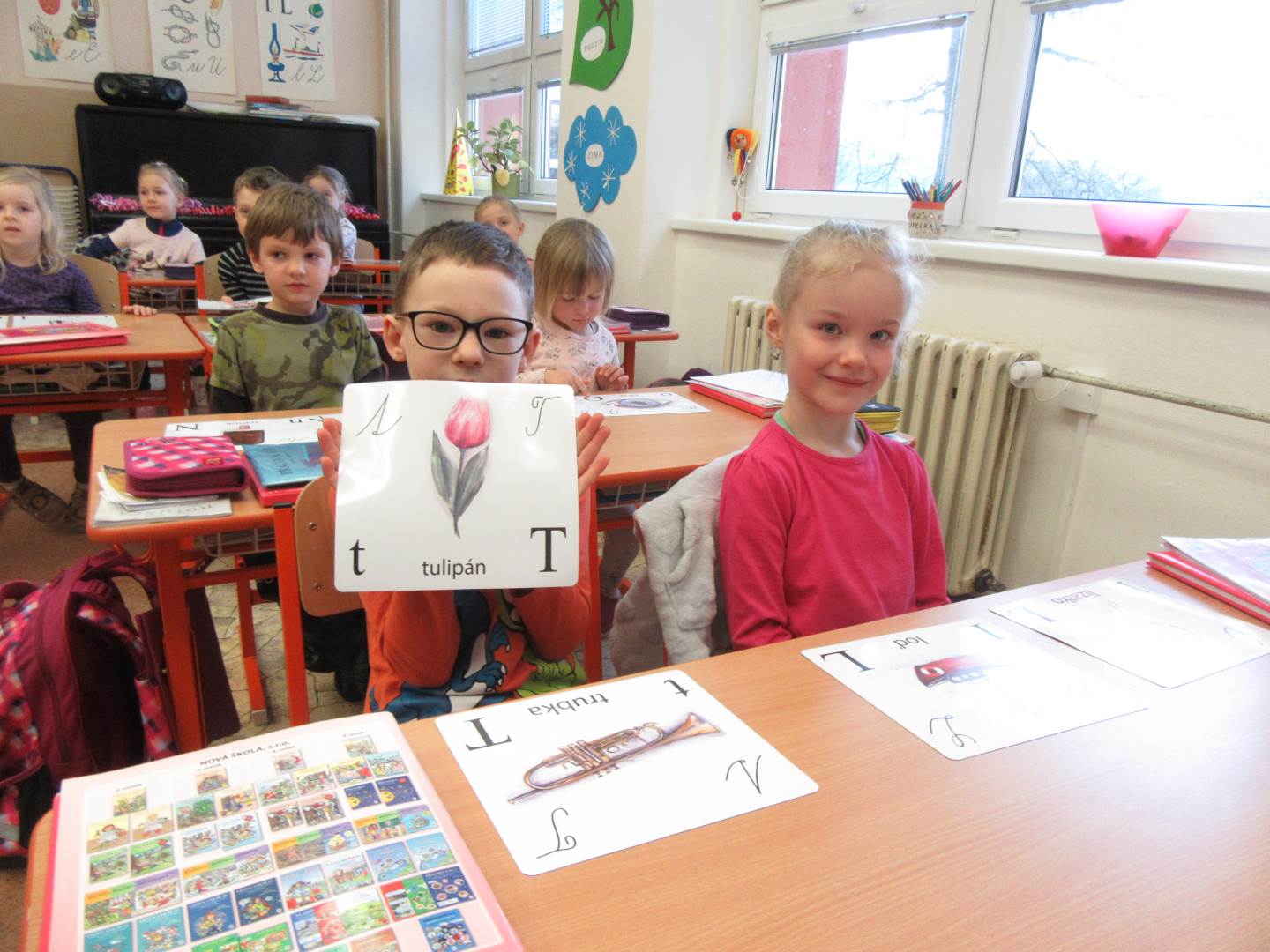Ve středu jsme navštívili 1. třídu. Prvňáčci nám zarecitovali, my jsme prvňáčkům zazpívali a nakonec jsme společně zopakovali písmenka celé abecedy. Za odměnu všichni dostali bonbón a omalovánku. Po skvělém zážitku s prvňáčky jsme se vydali k maringotce, kde nás čekalo překvapení. Rybník, ve kterém bylo málo vody, teď vodou skoro přetékal. Hladina sahala až po lavečky. Tak děti lákalo si hrát s vodou. Děti pozorovaly housenky, sněženky a změny v přírodě.
