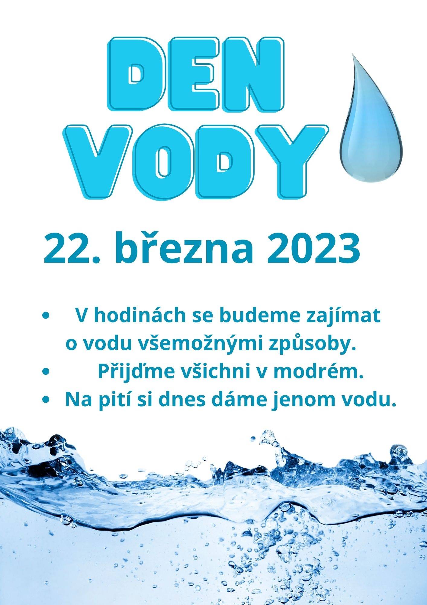 Ve středu 22. března oslavíme Den vody. Všichni přijďme v modré a nachystejme si na pití jen vodu. Ve všech hodinách se budeme vodě věnovat různými způsoby.