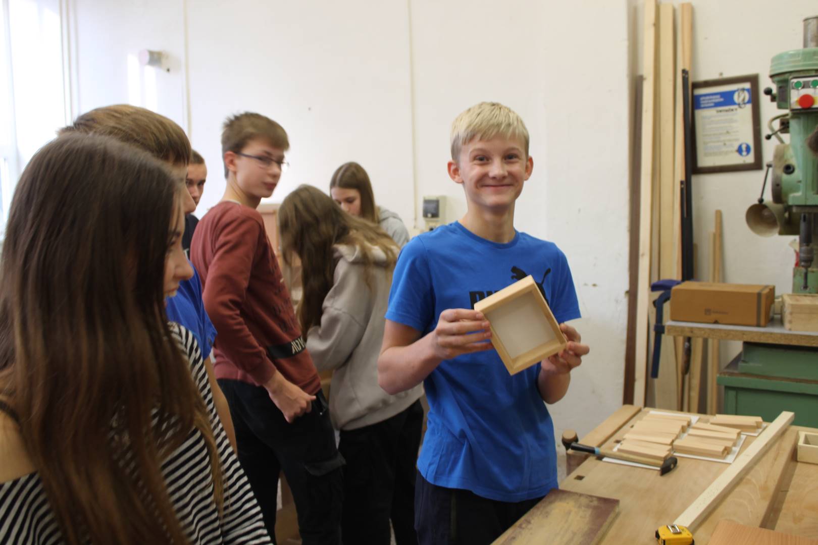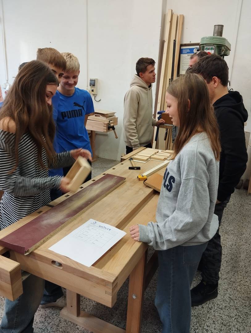 "Dřevo - materiál budoucnosti, je tradiční soutěž, které jsme se zúčastnili 22.10.2024 s 5ti členným družstvem z 9. ročníku. Žáci během soutěže vystřídali 3 stanoviště. Na každém plnili úkoly jako například štafeta v zatloukání hřebíků, konstrukce dřevěné krabičky, výroba 3D modelu pracovního stolu nebo návrh kuchyňské linky v počítačovém programu. Náš tým se umístil na krásném 6. místě.