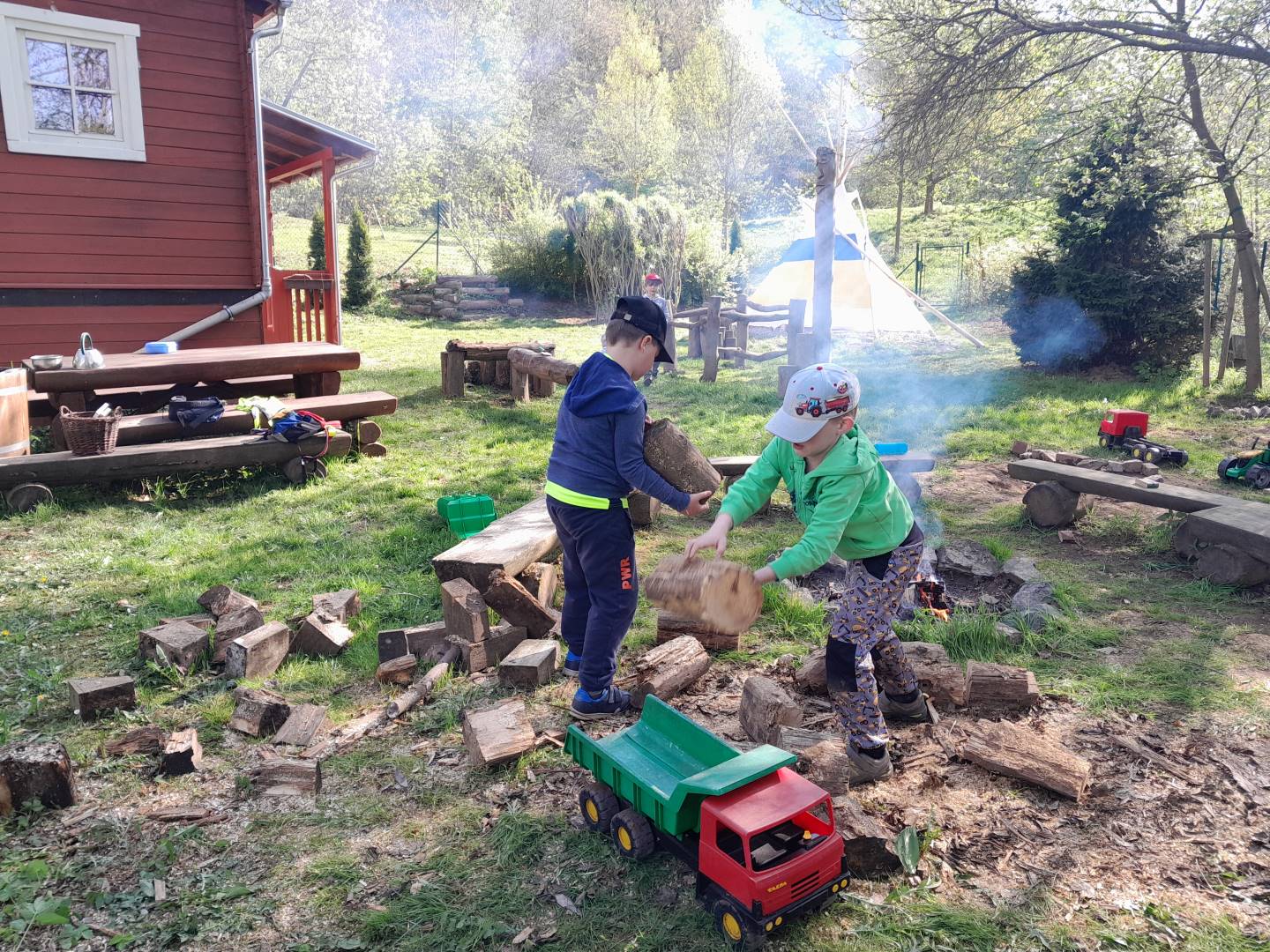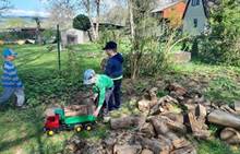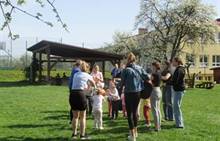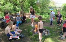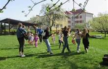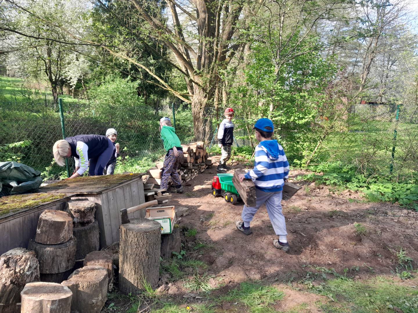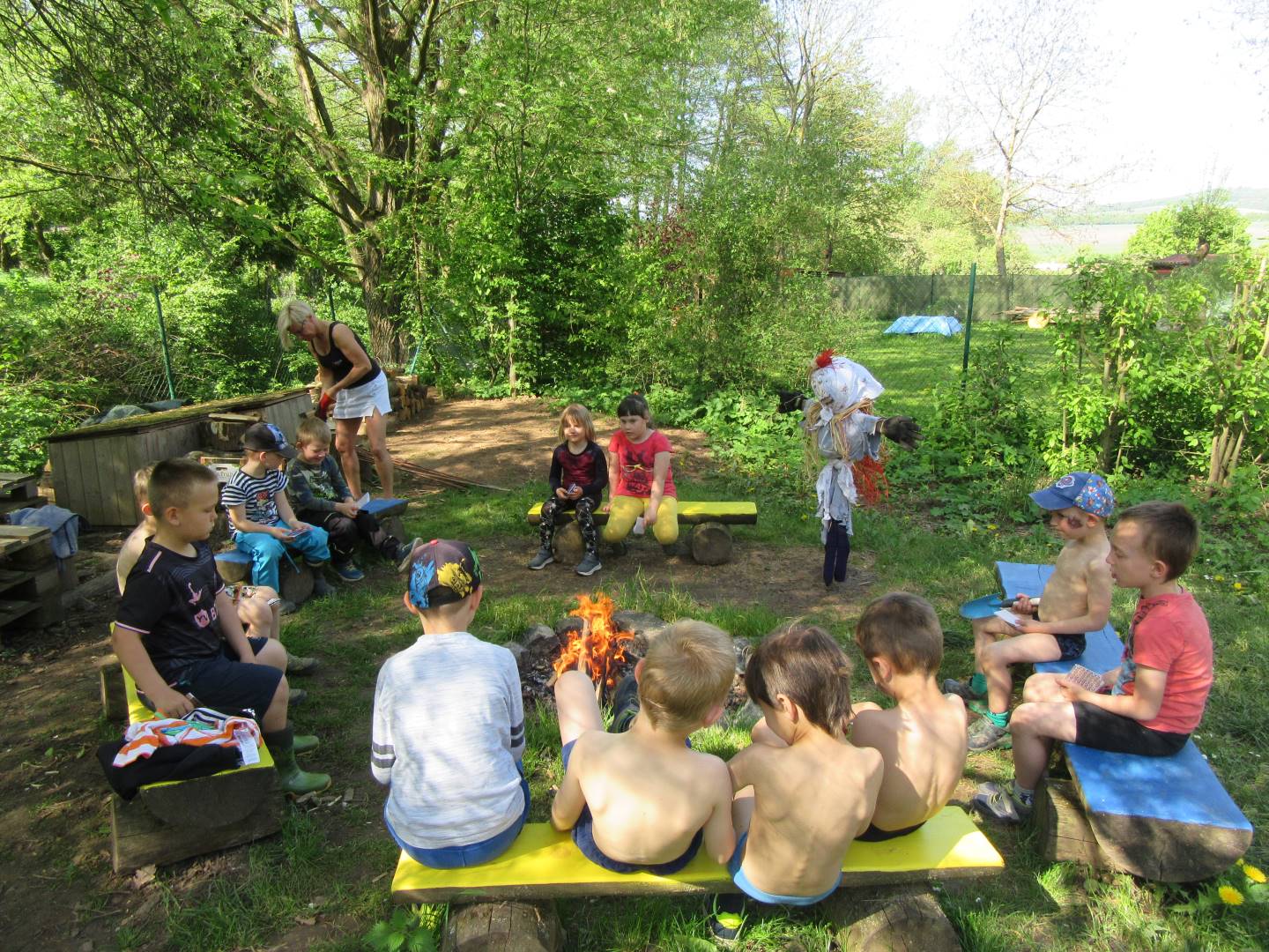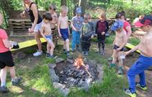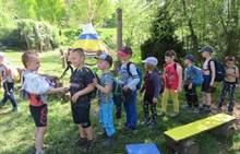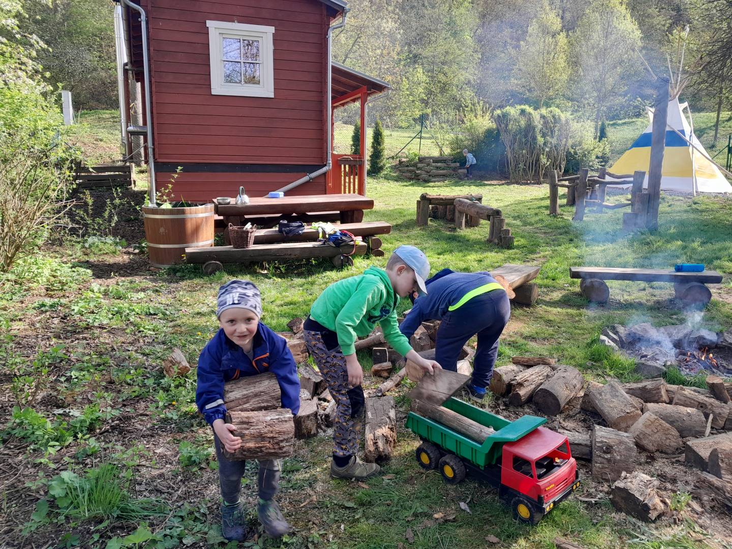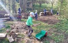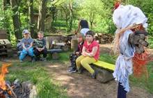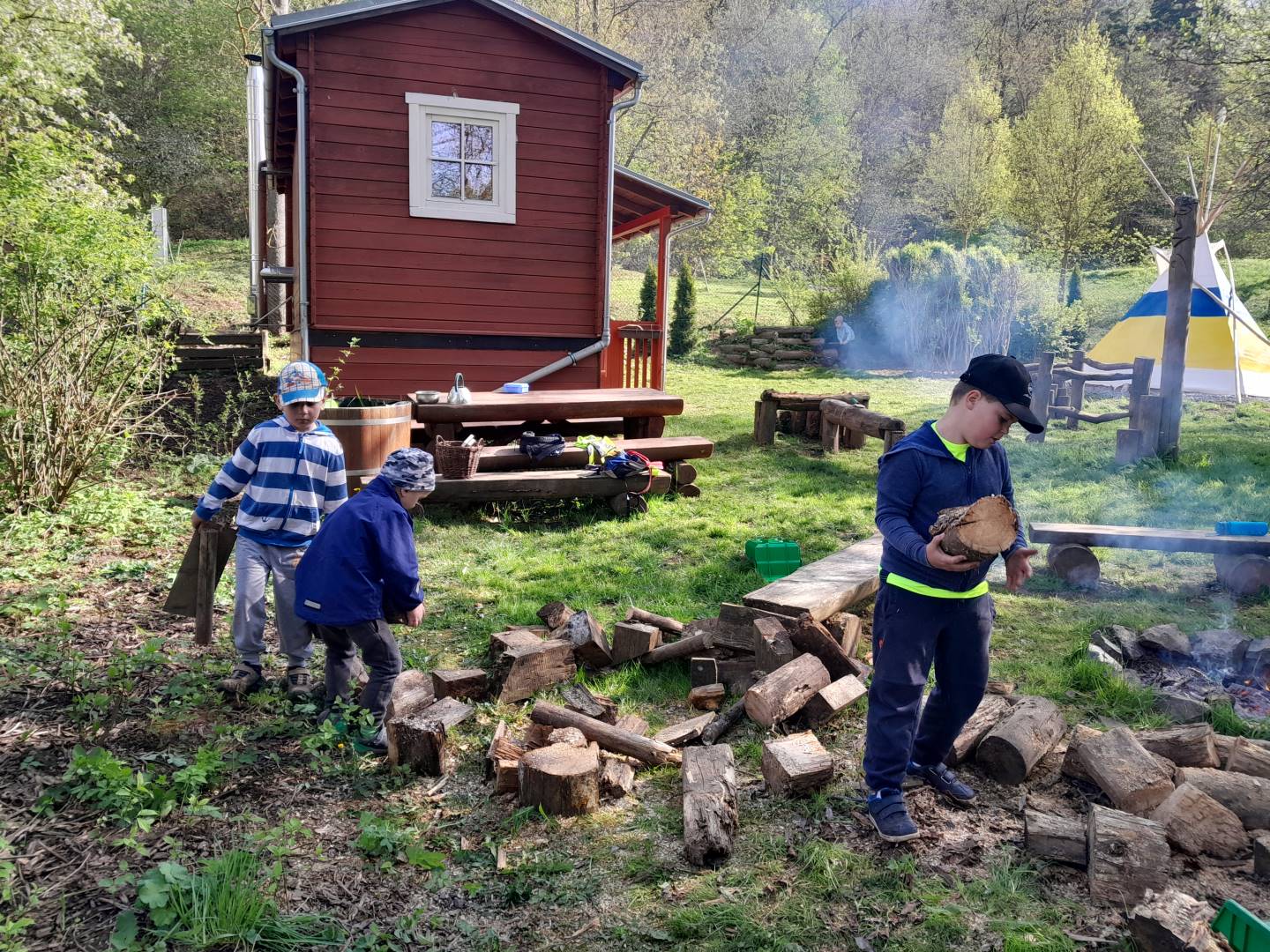 Duben 2024 - jaro, projektový den Fyzika, dopravní prostředky, zdobení týpí a úklid dřeva u maringotky, muzikodrama, slavíme čarodějnice