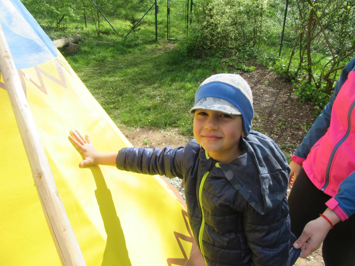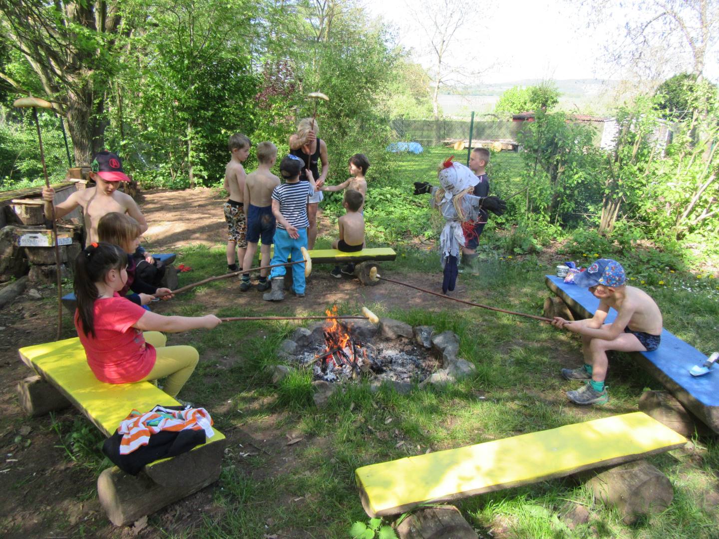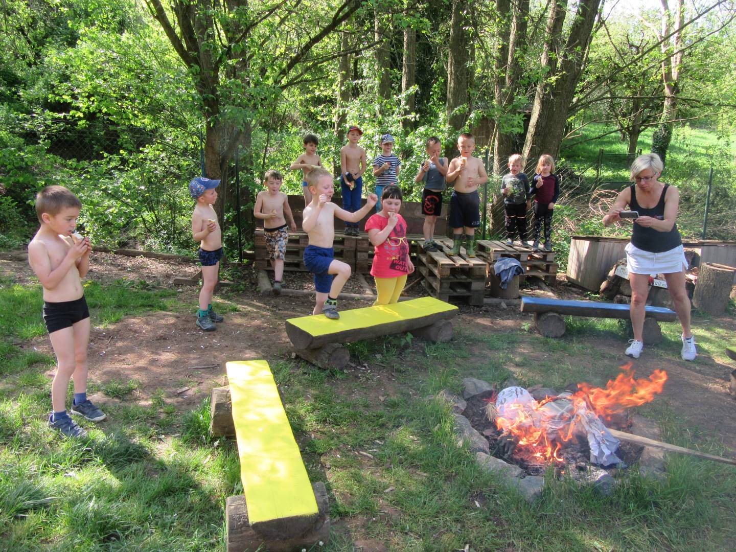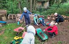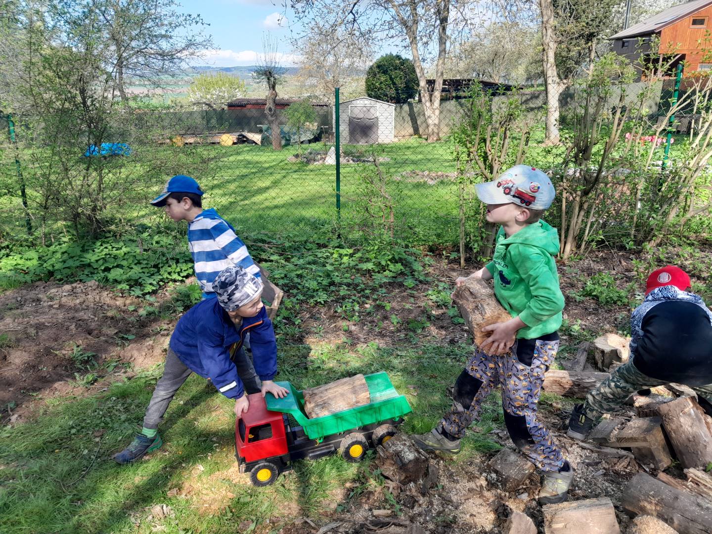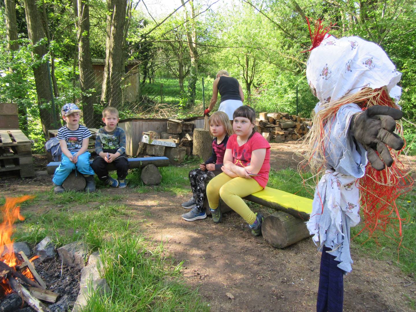 Duben 2024 - jaro, projektový den Fyzika, dopravní prostředky, zdobení týpí a úklid dřeva u maringotky, muzikodrama, slavíme čarodějnice