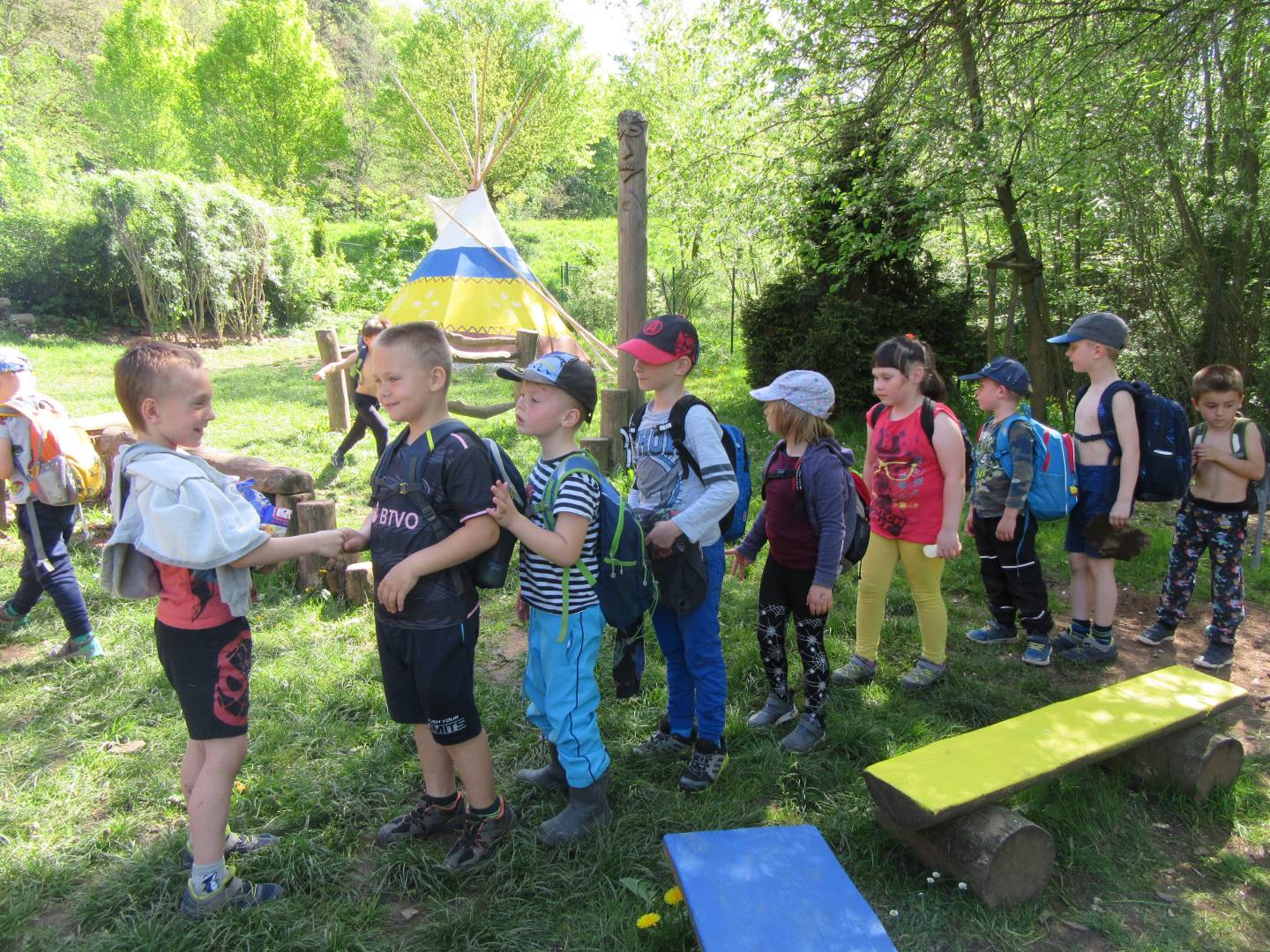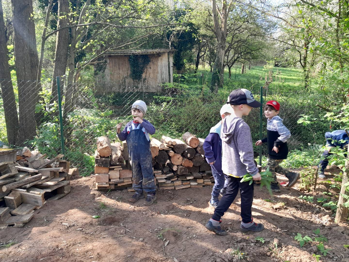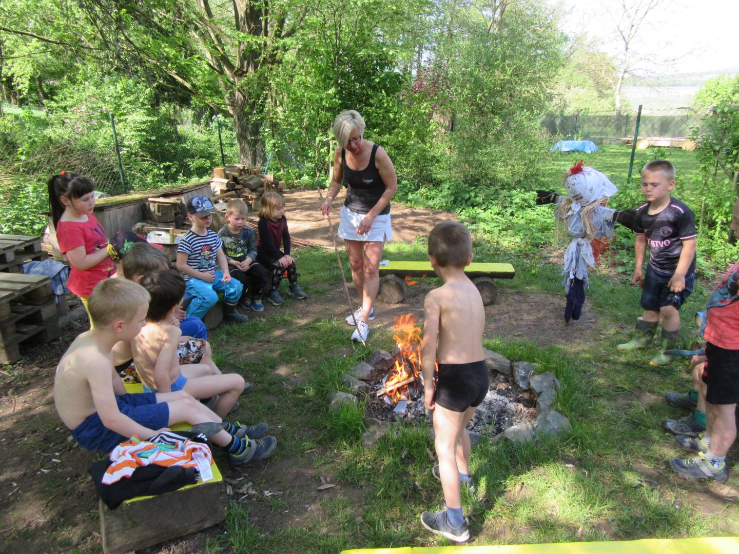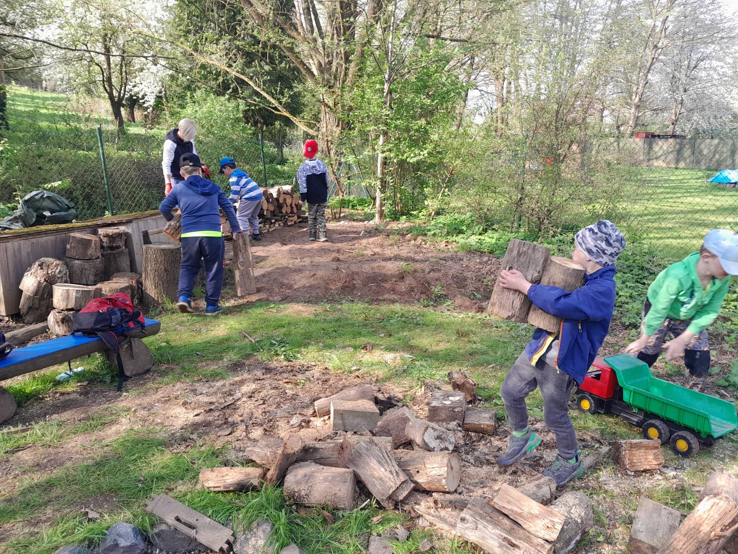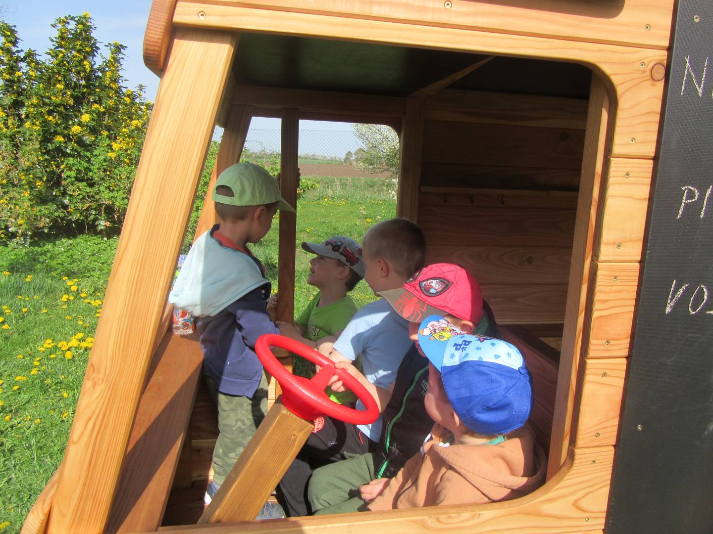 Duben 2024 - jaro, projektový den Fyzika, dopravní prostředky, zdobení týpí a úklid dřeva u maringotky, muzikodrama, slavíme čarodějnice