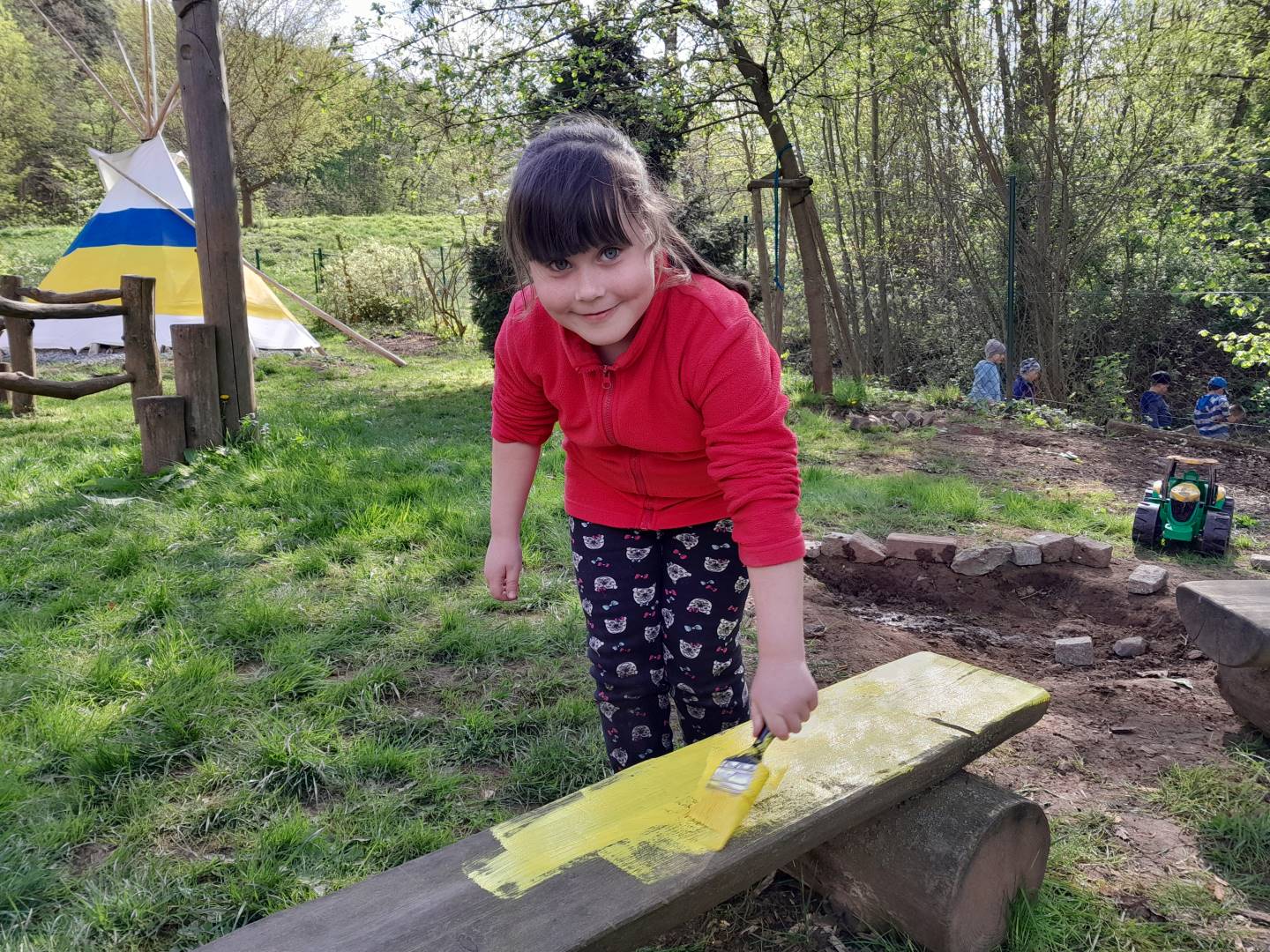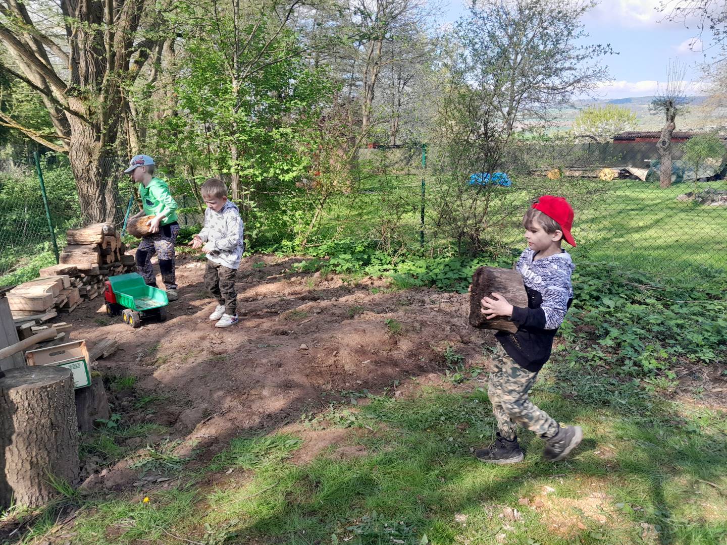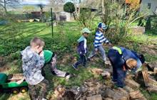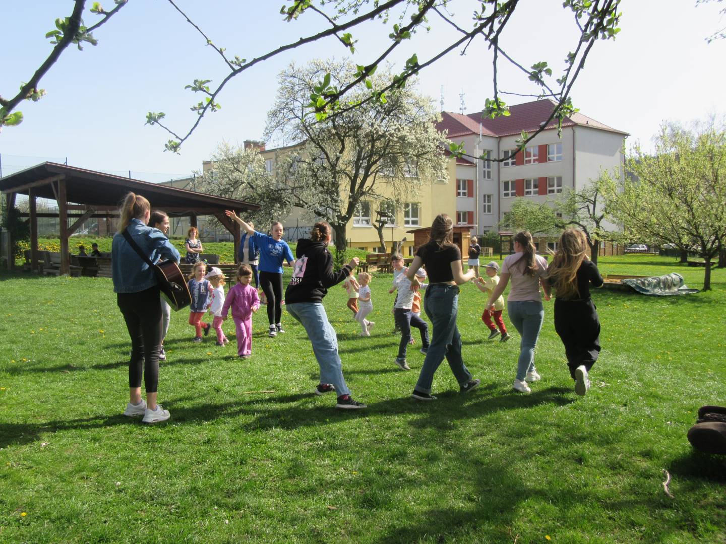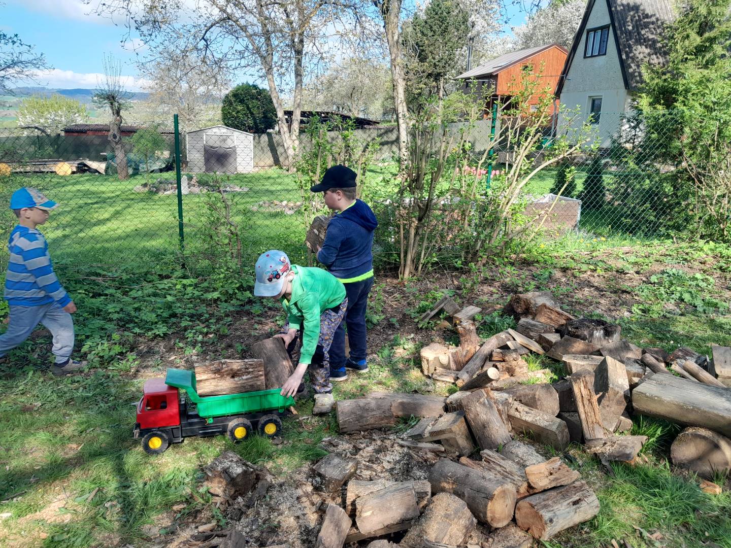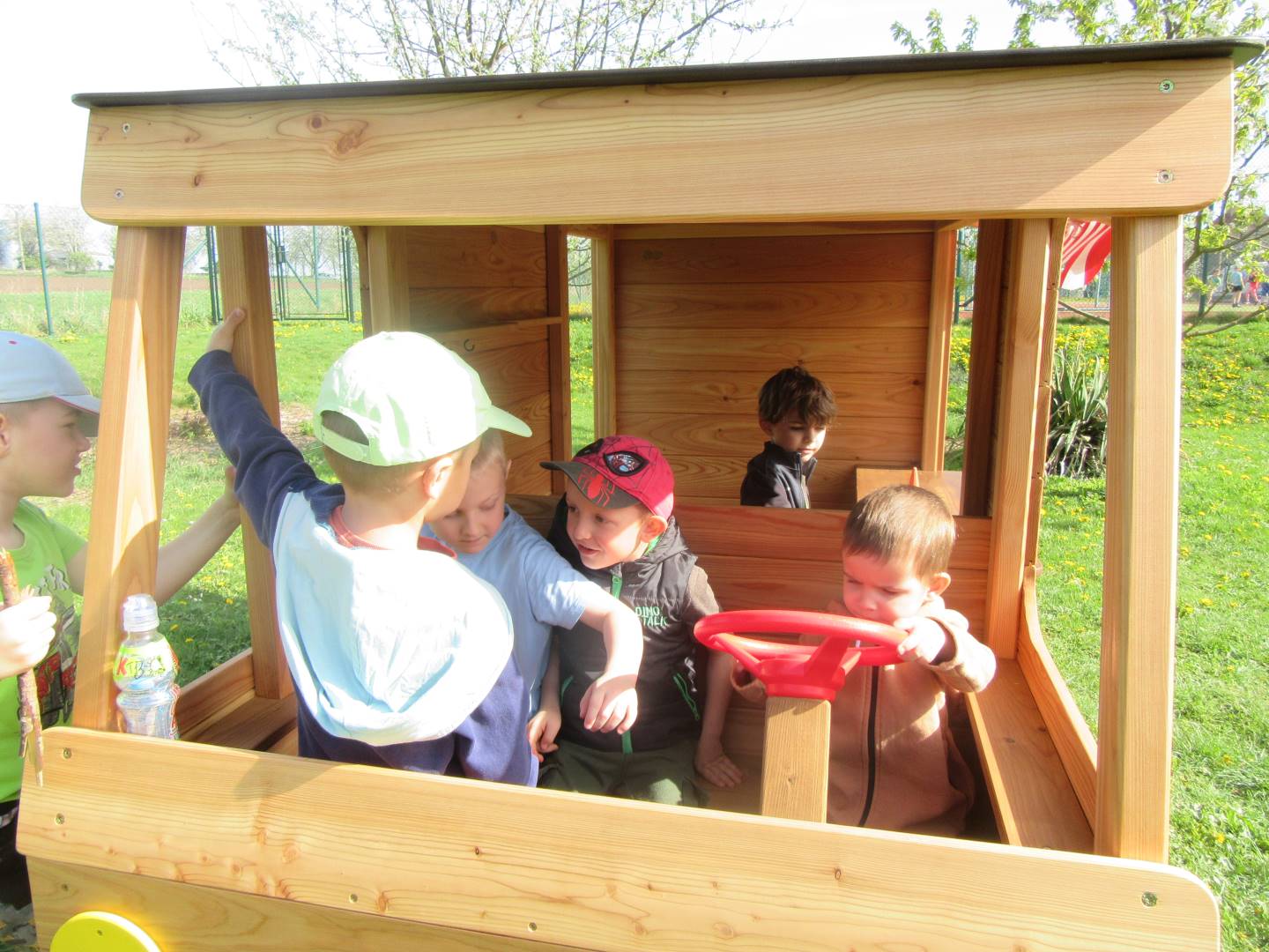 Duben 2024 - jaro, projektový den Fyzika, dopravní prostředky, zdobení týpí a úklid dřeva u maringotky, muzikodrama, slavíme čarodějnice