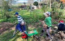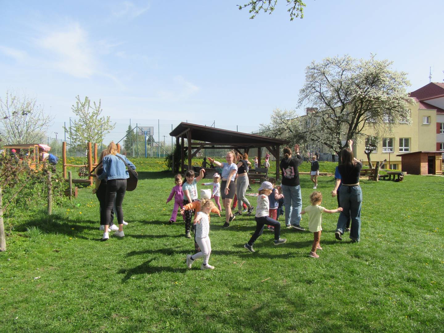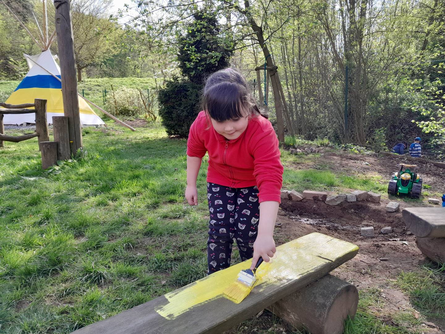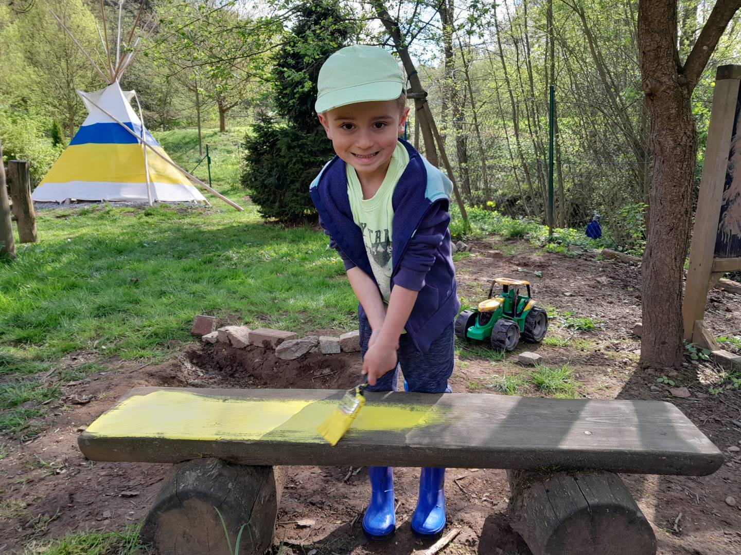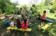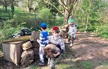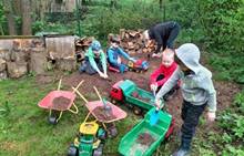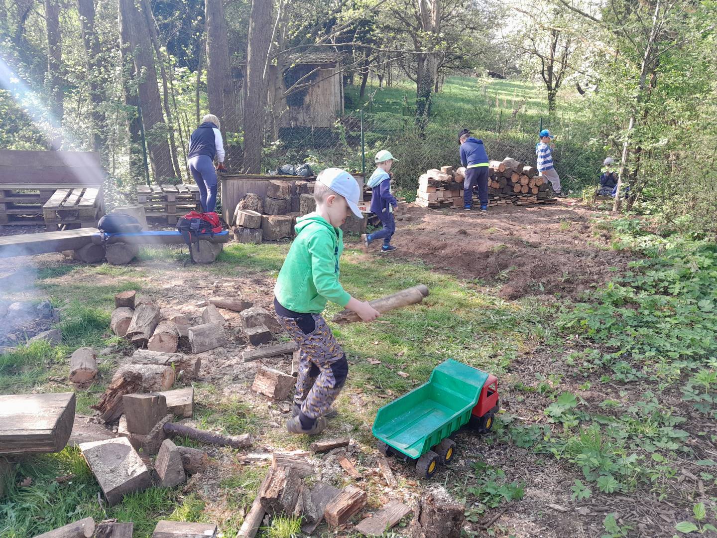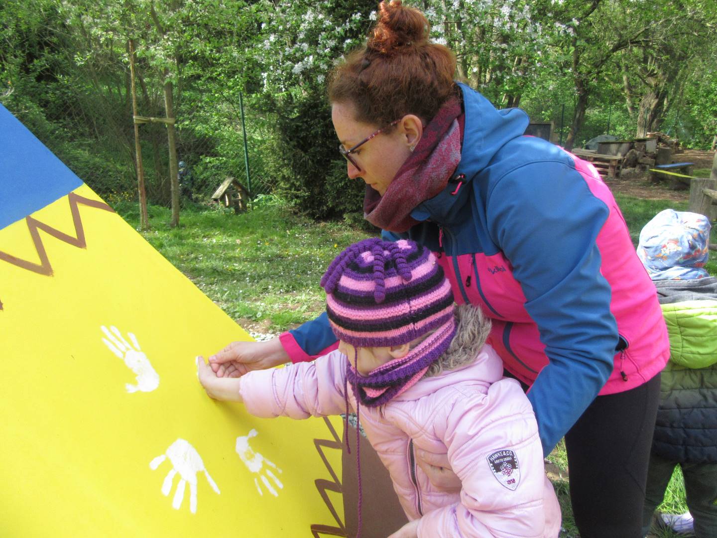 Duben 2024 - jaro, projektový den Fyzika, dopravní prostředky, zdobení týpí a úklid dřeva u maringotky, muzikodrama, slavíme čarodějnice