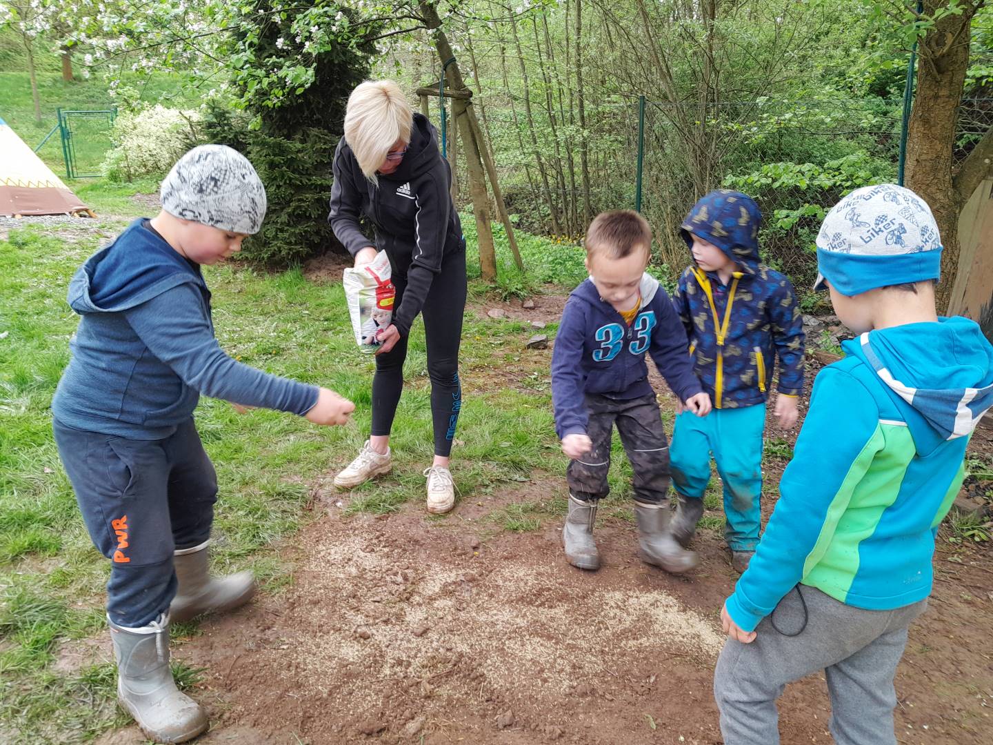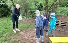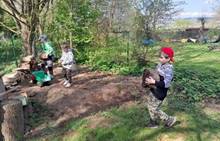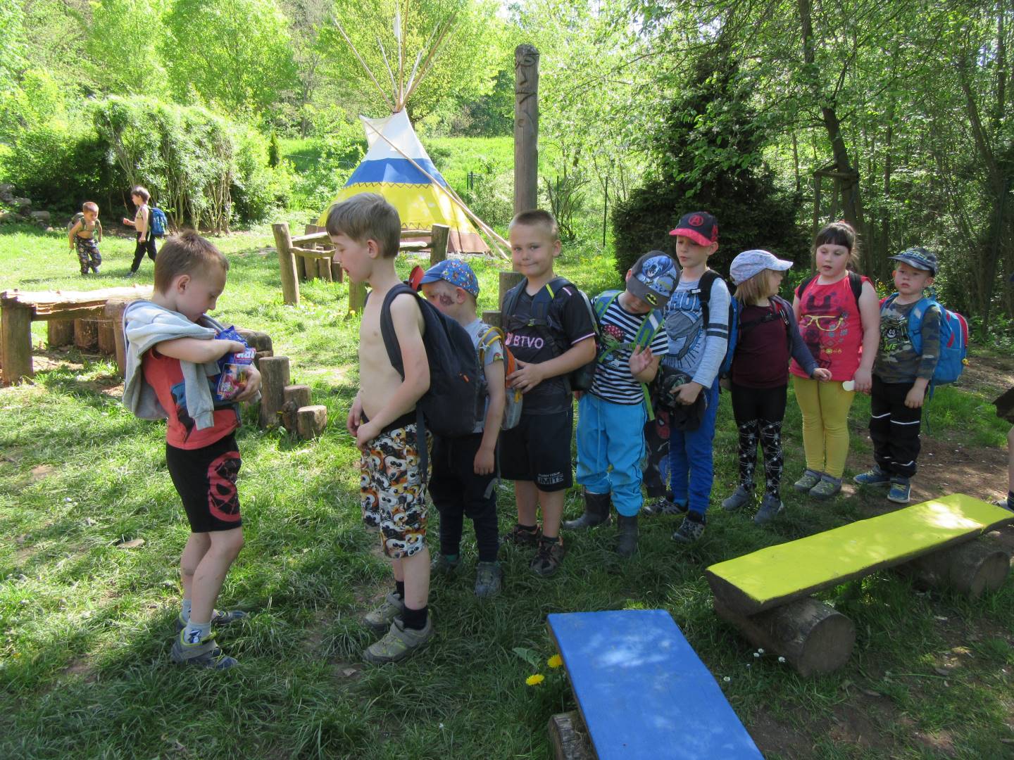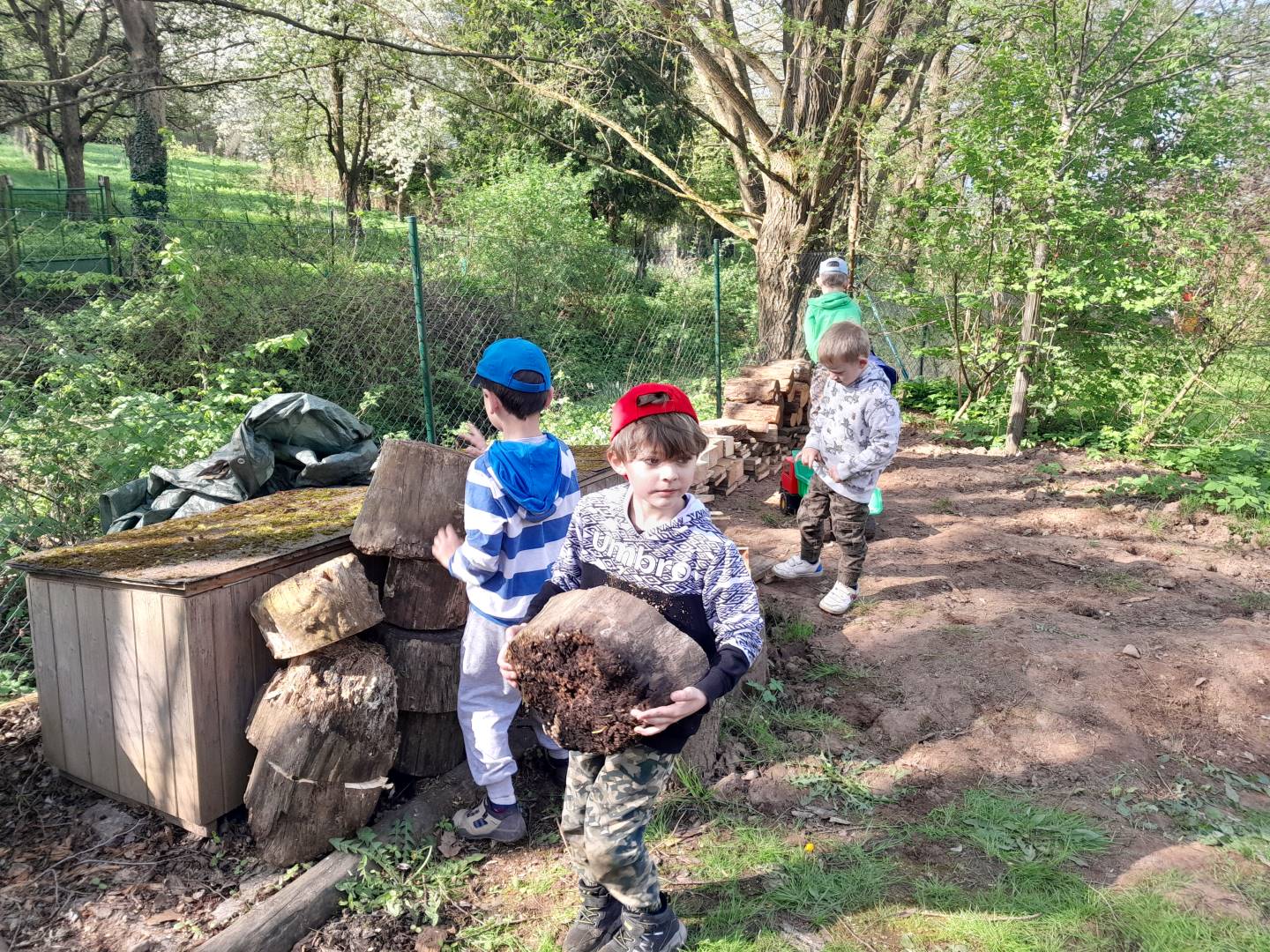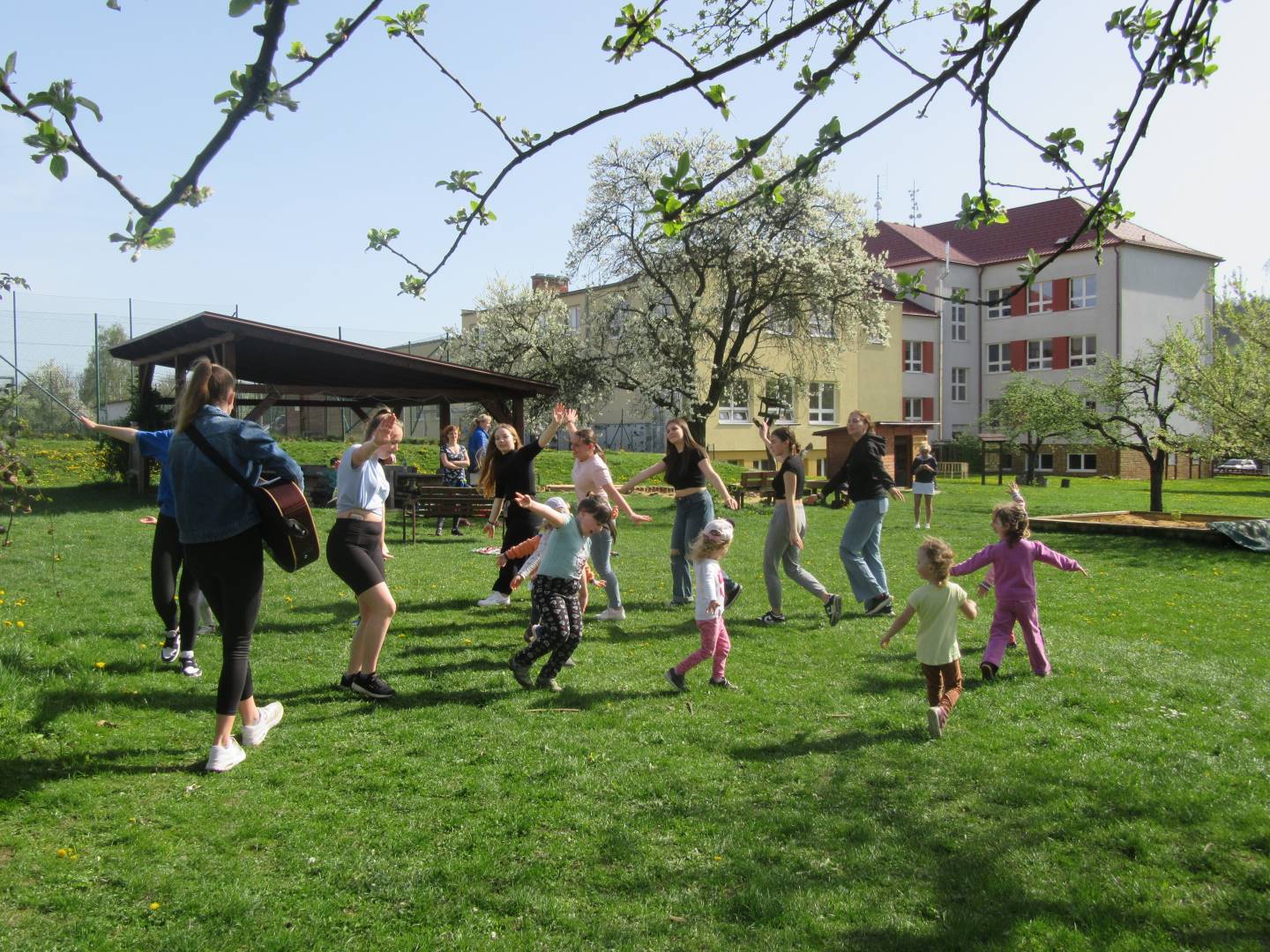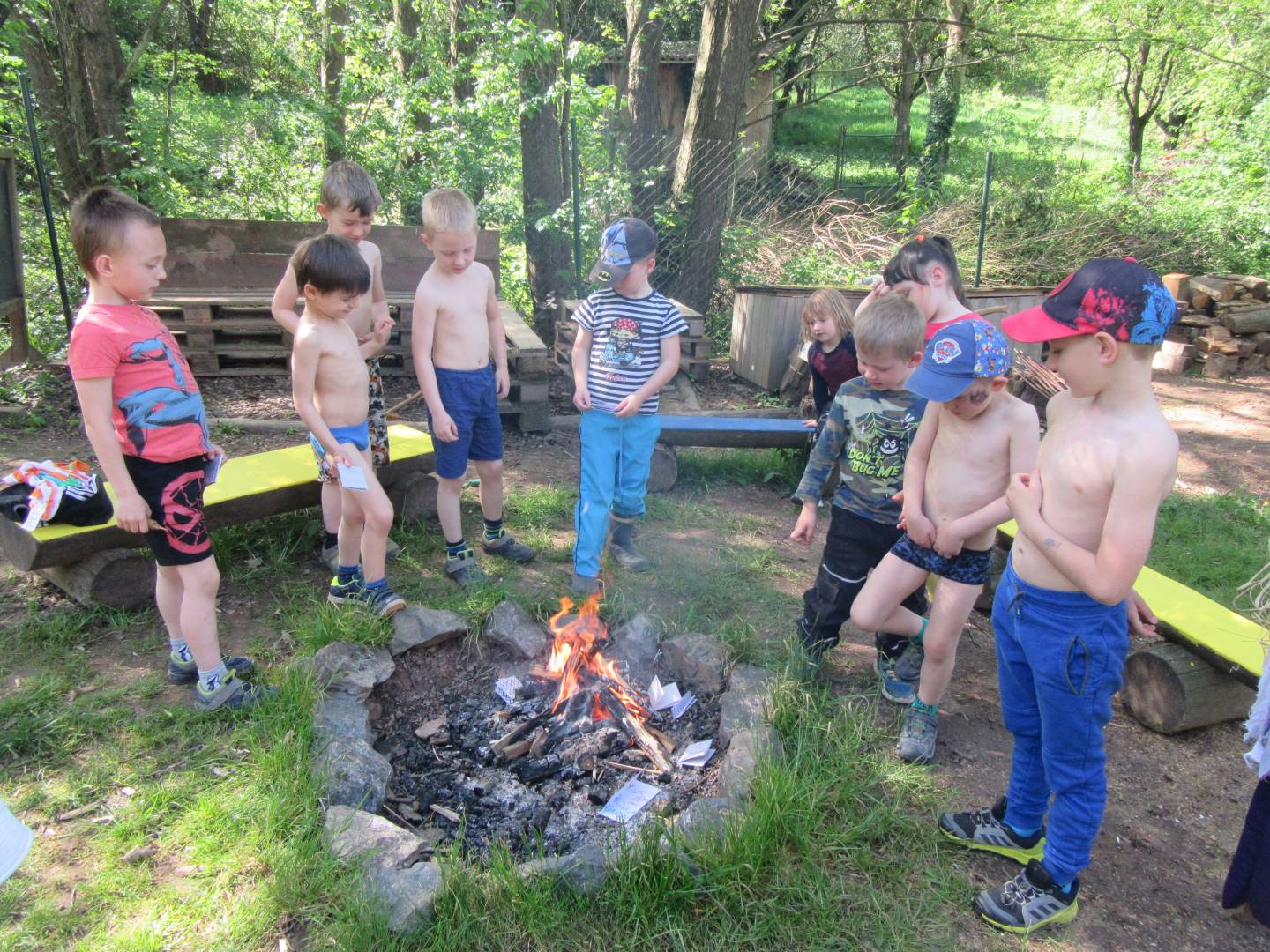 Duben 2024 - jaro, projektový den Fyzika, dopravní prostředky, zdobení týpí a úklid dřeva u maringotky, muzikodrama, slavíme čarodějnice