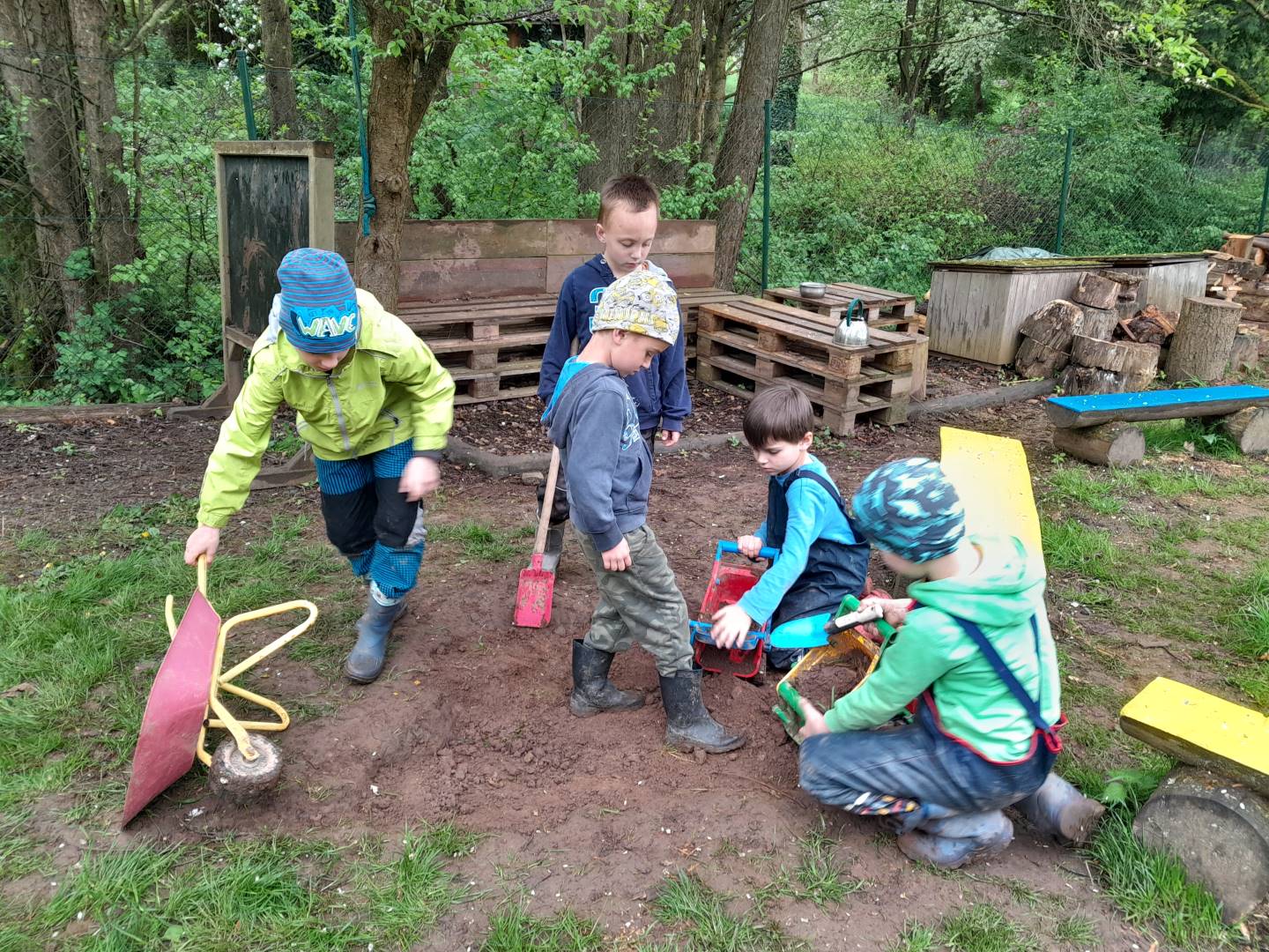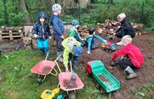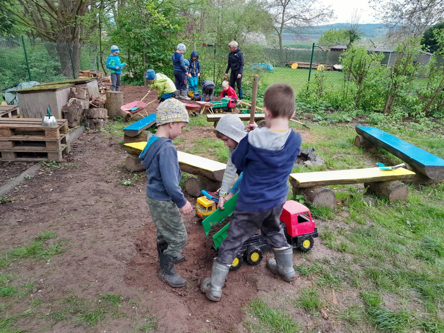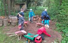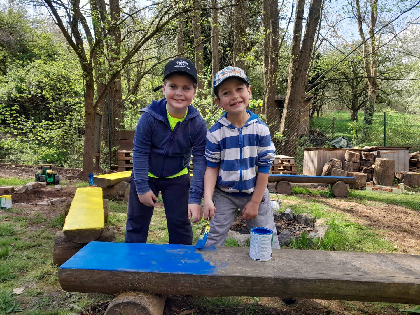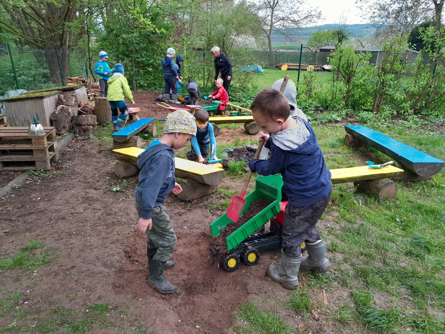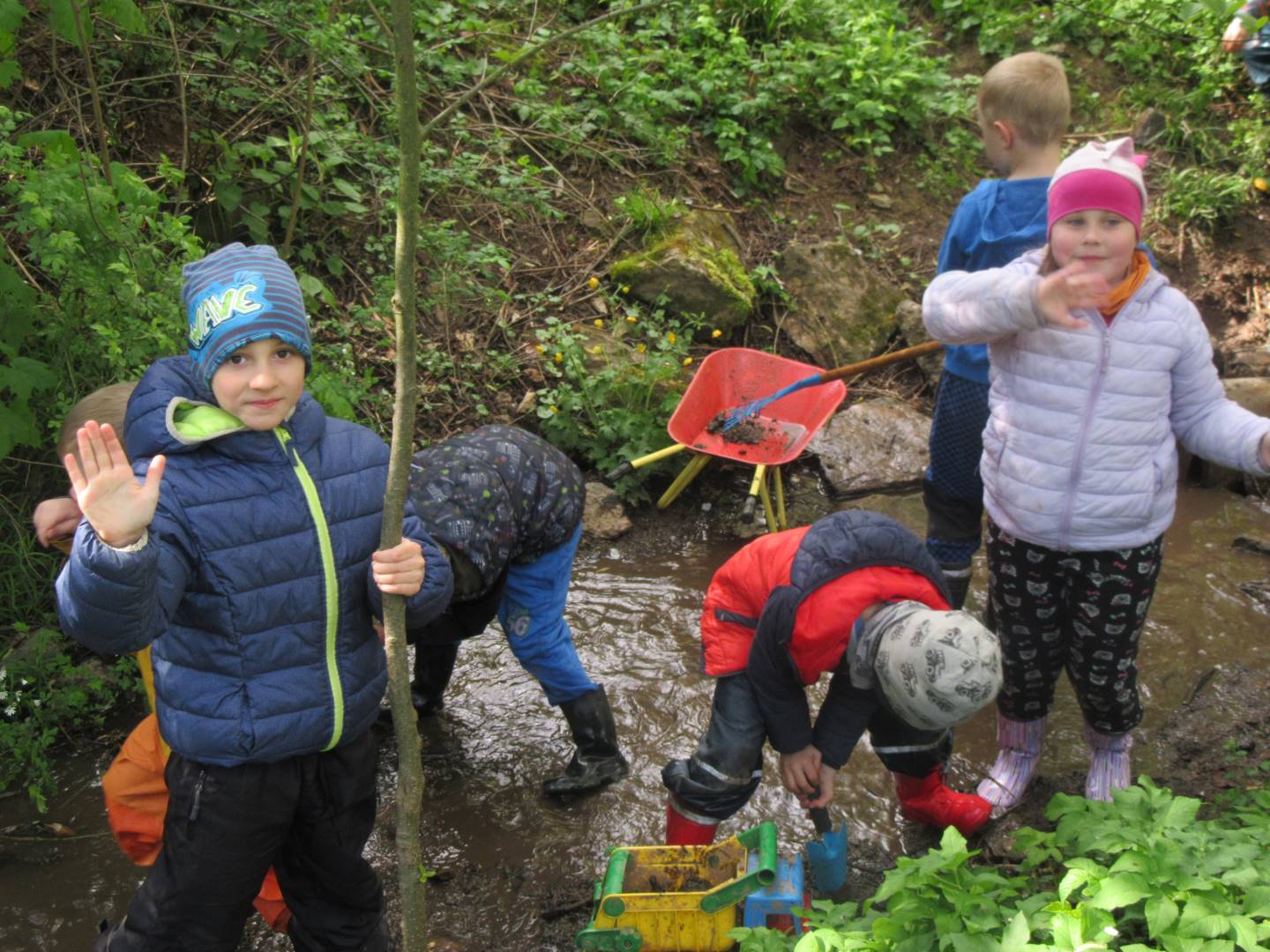 Duben 2024 - jaro, projektový den Fyzika, dopravní prostředky, zdobení týpí a úklid dřeva u maringotky, muzikodrama, slavíme čarodějnice