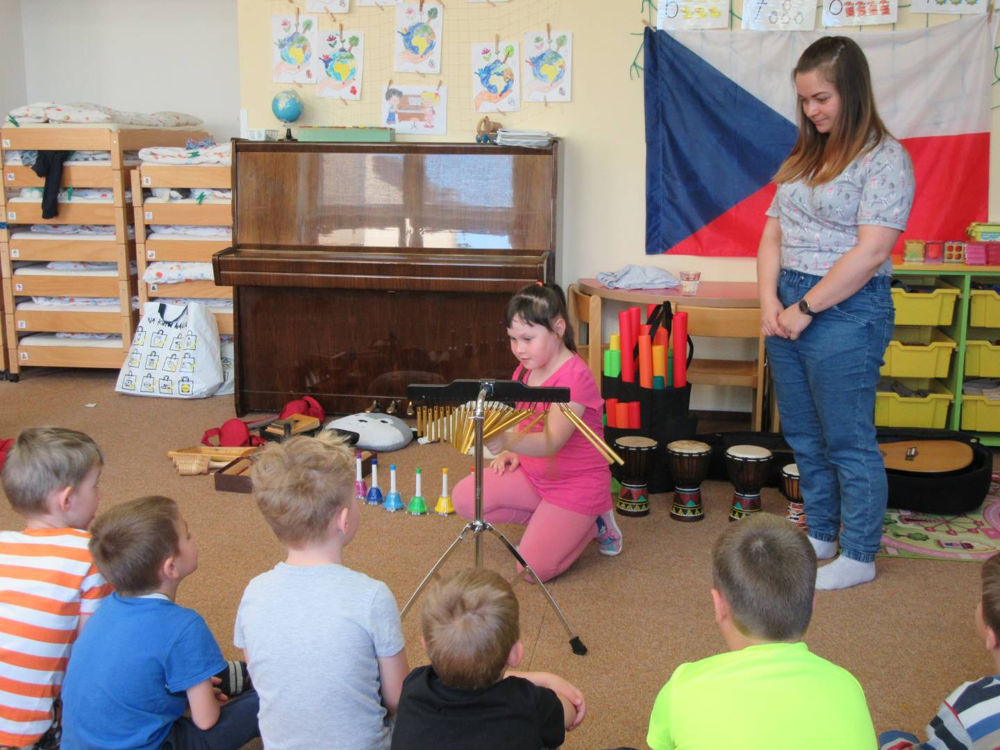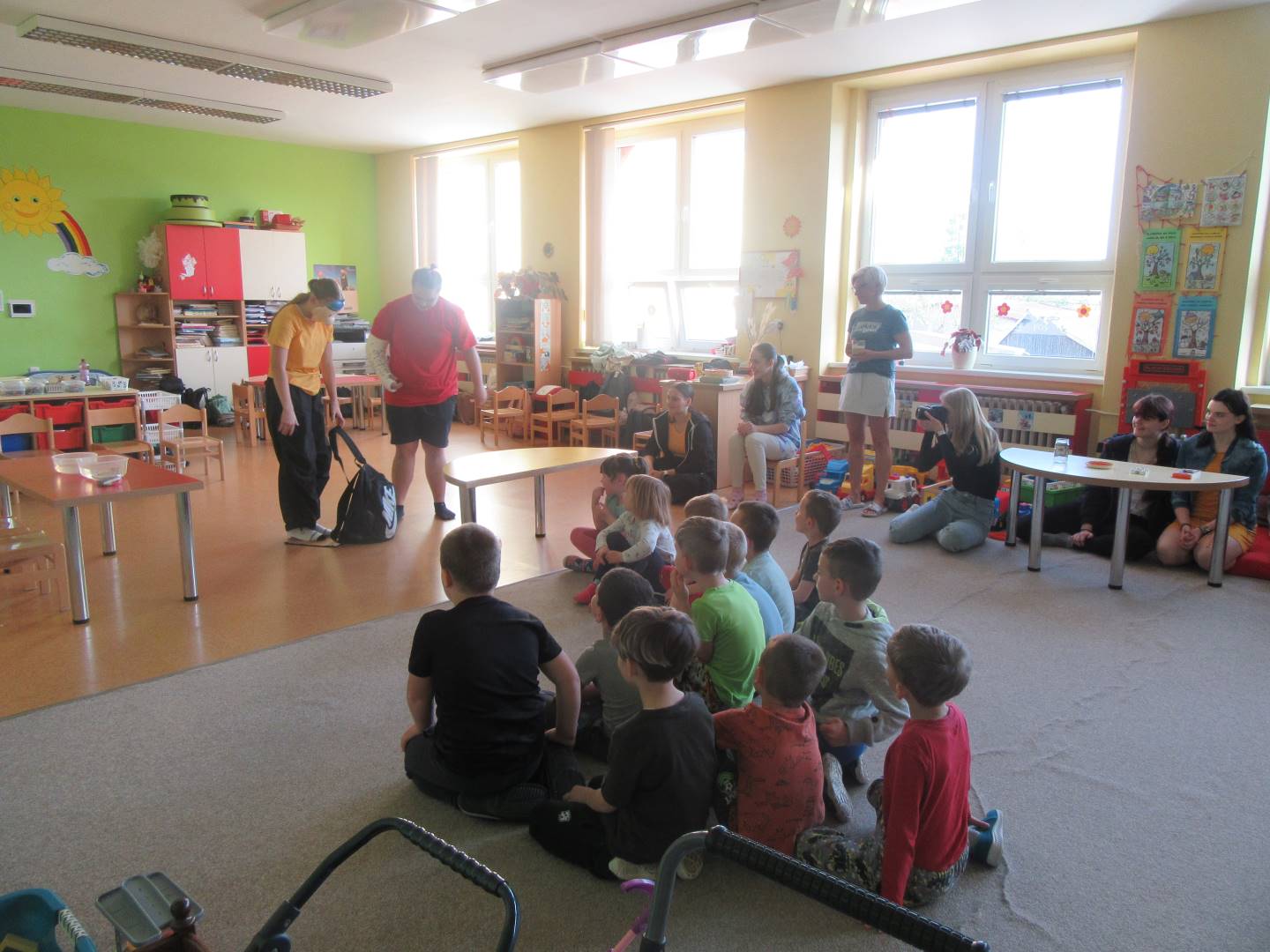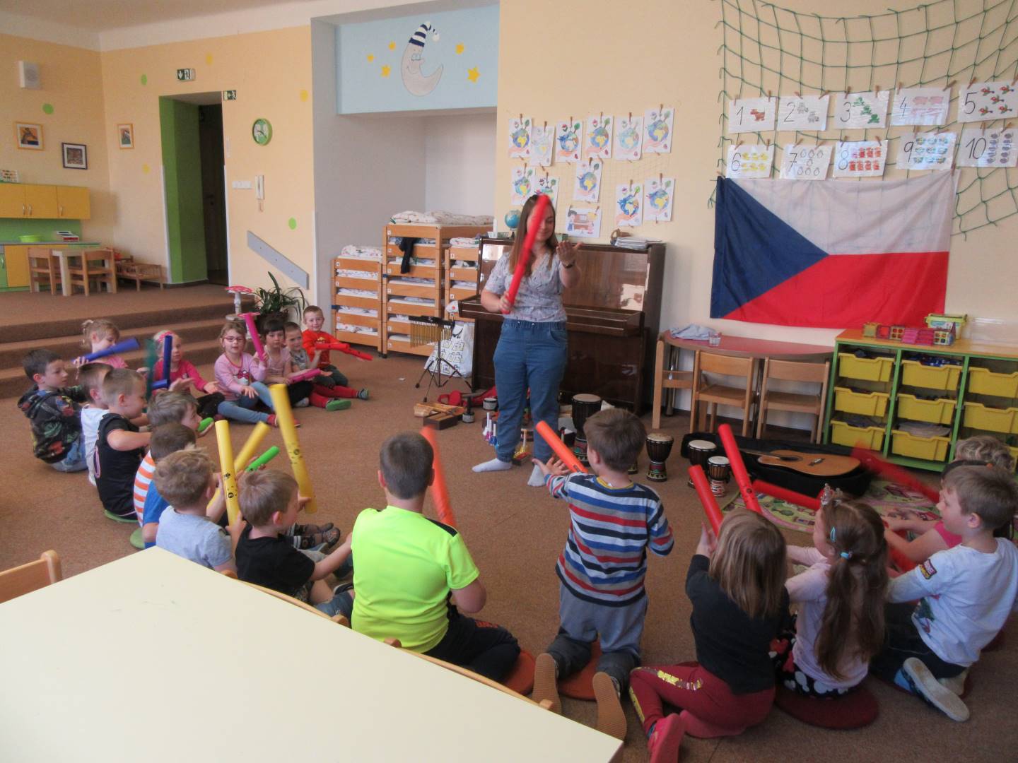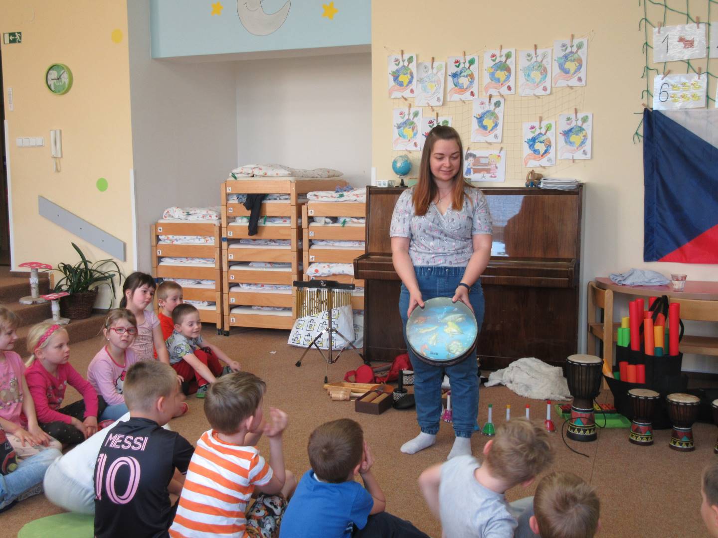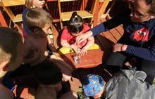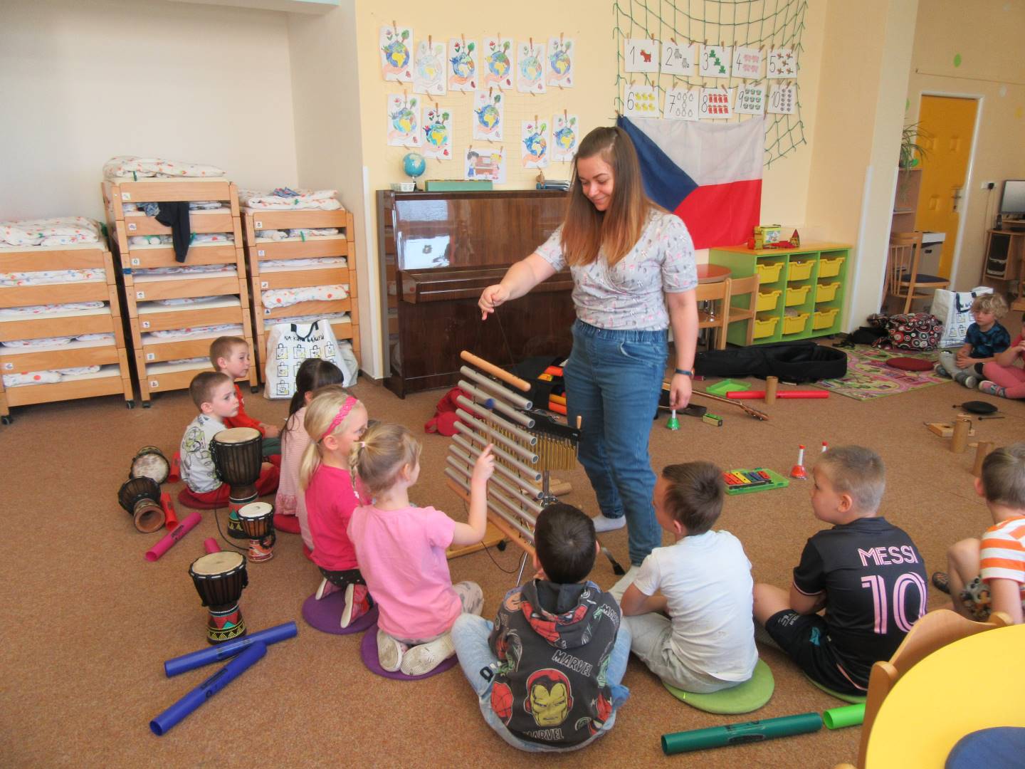 Duben 2024 - jaro, projektový den Fyzika, dopravní prostředky, zdobení týpí a úklid dřeva u maringotky, muzikodrama, slavíme čarodějnice