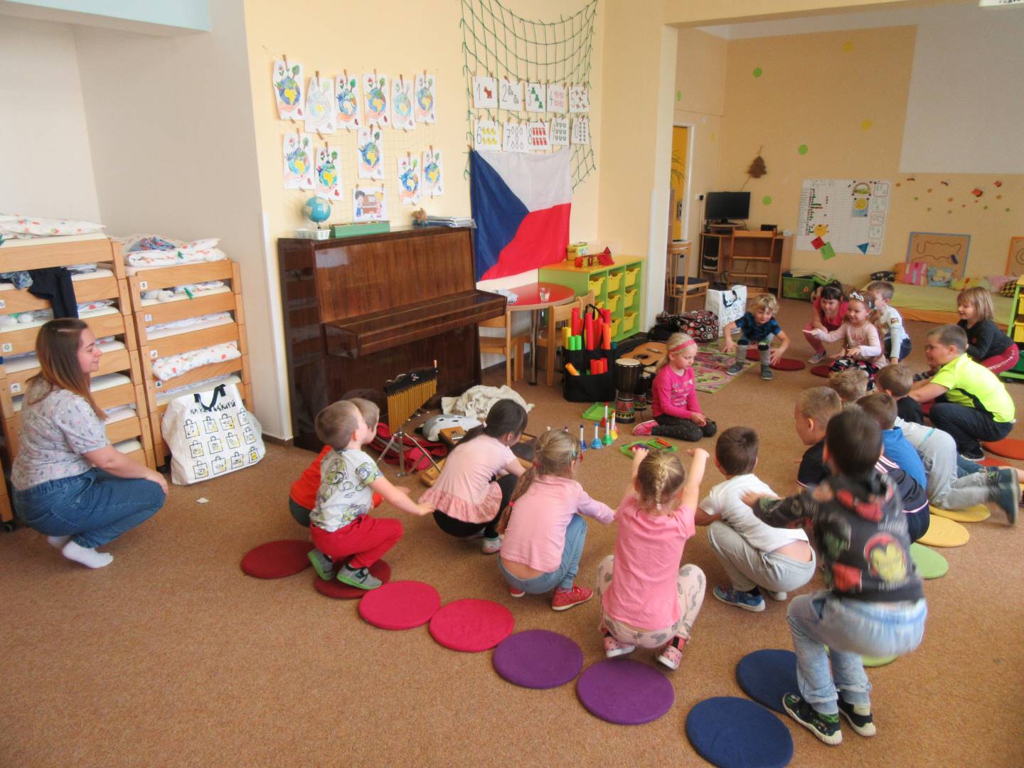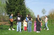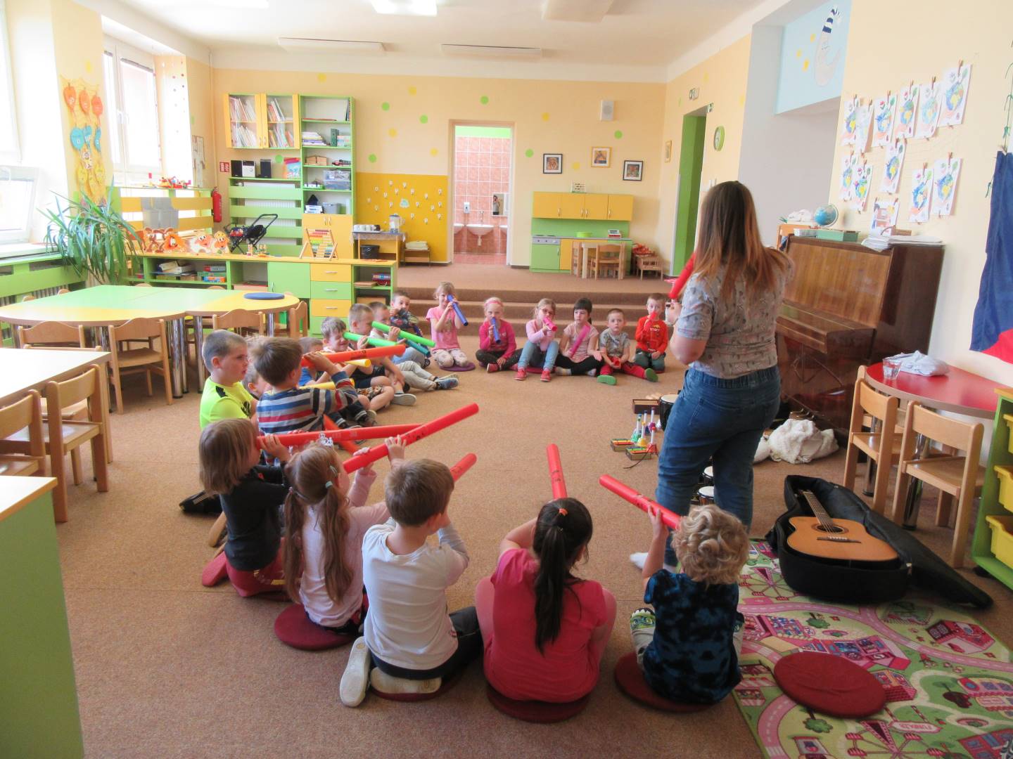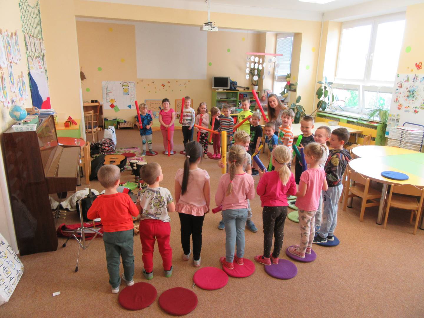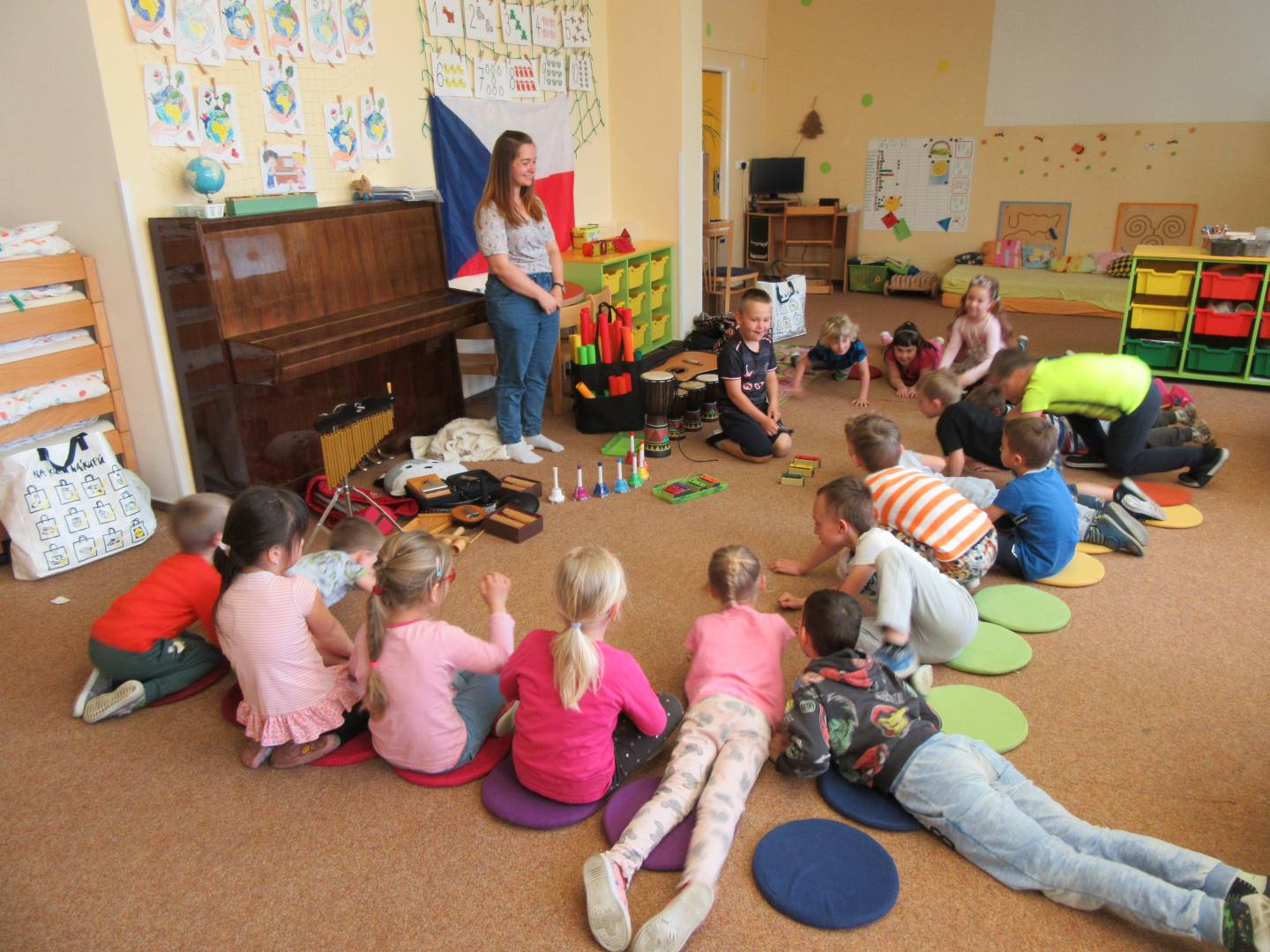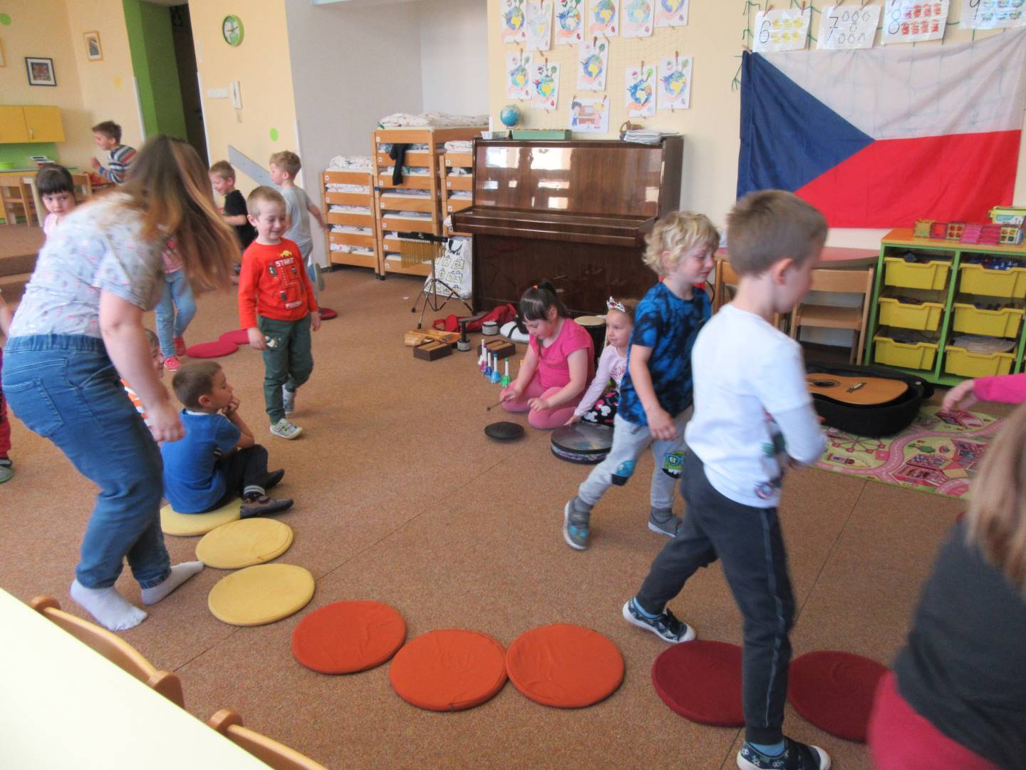 Duben 2024 - jaro, projektový den Fyzika, dopravní prostředky, zdobení týpí a úklid dřeva u maringotky, muzikodrama, slavíme čarodějnice