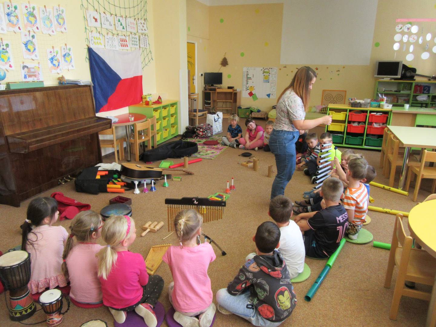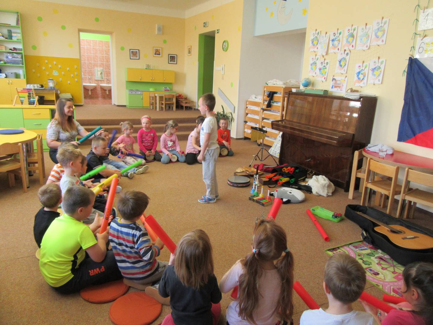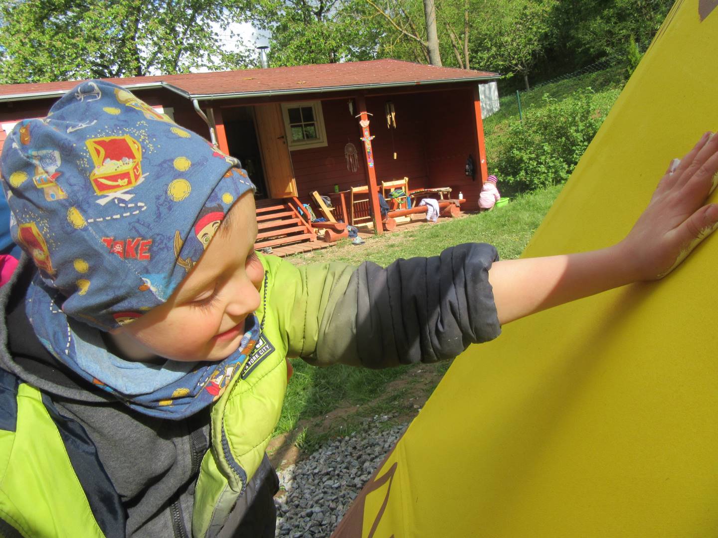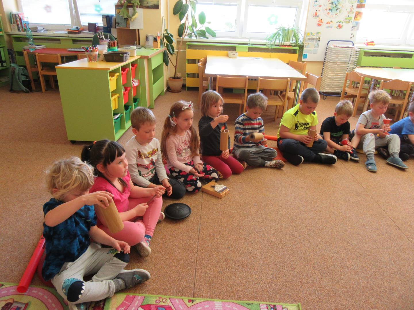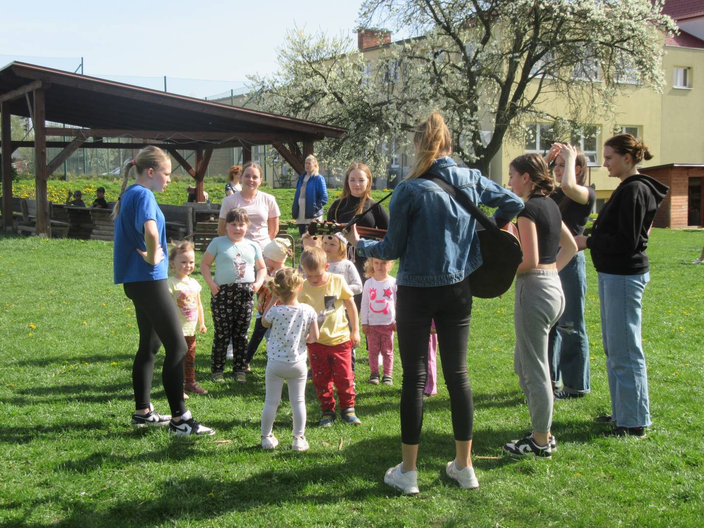 Duben 2024 - jaro, projektový den Fyzika, dopravní prostředky, zdobení týpí a úklid dřeva u maringotky, muzikodrama, slavíme čarodějnice