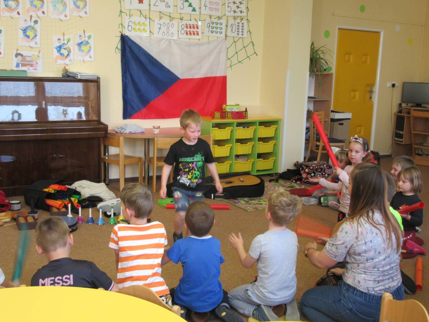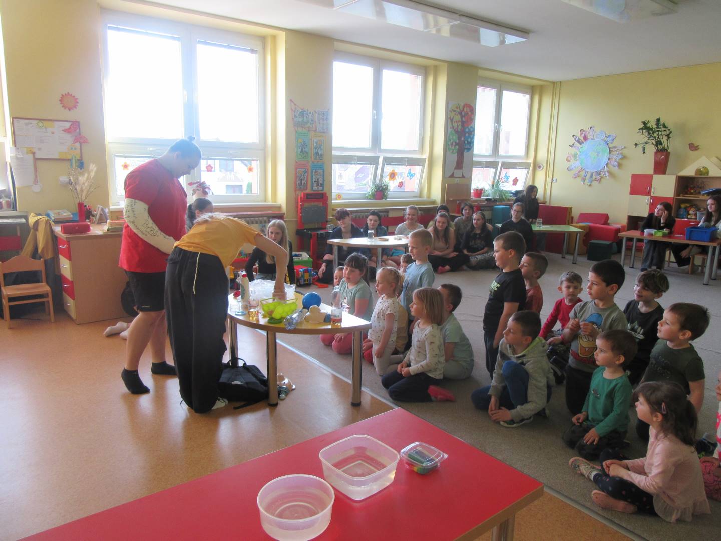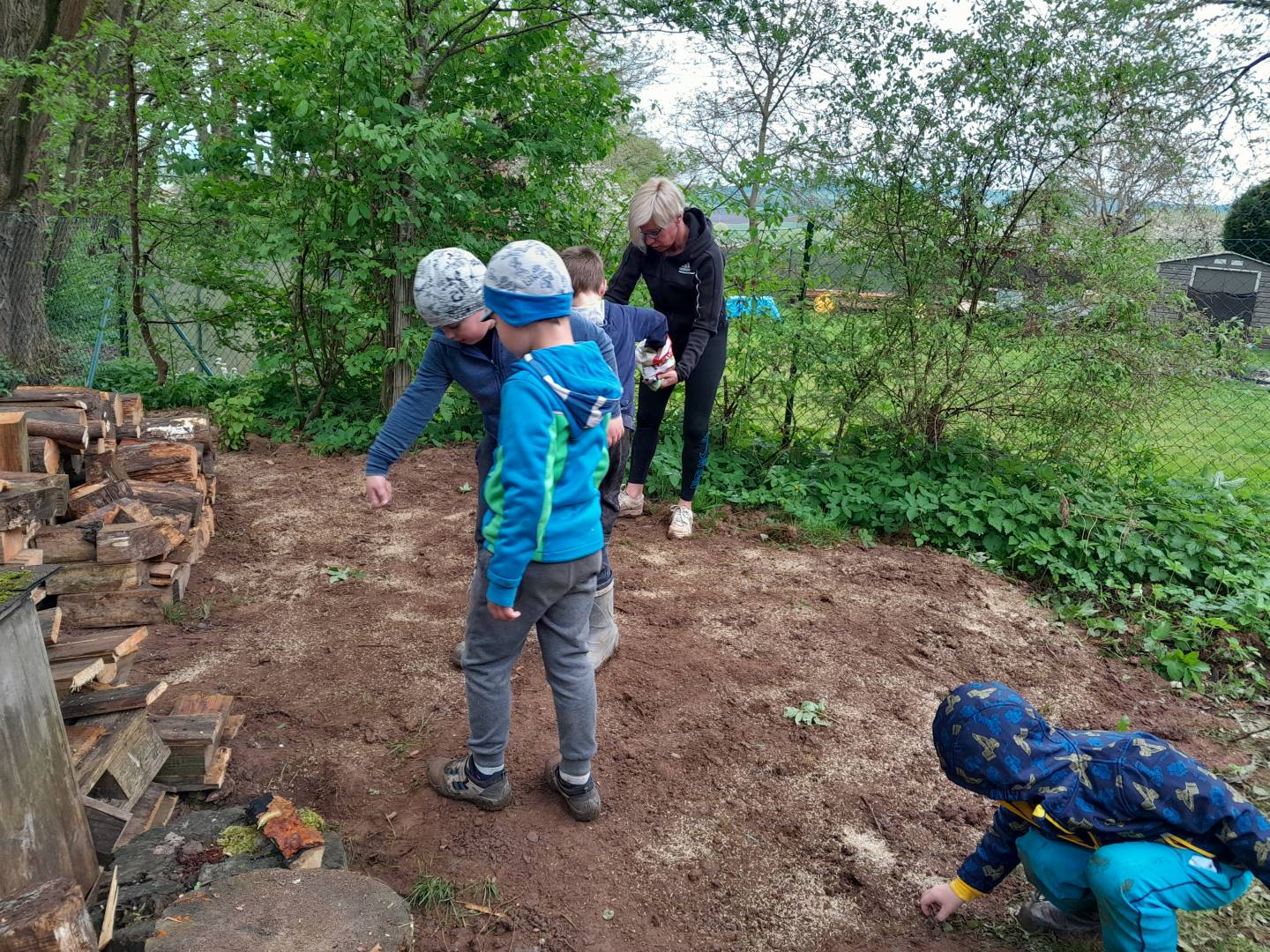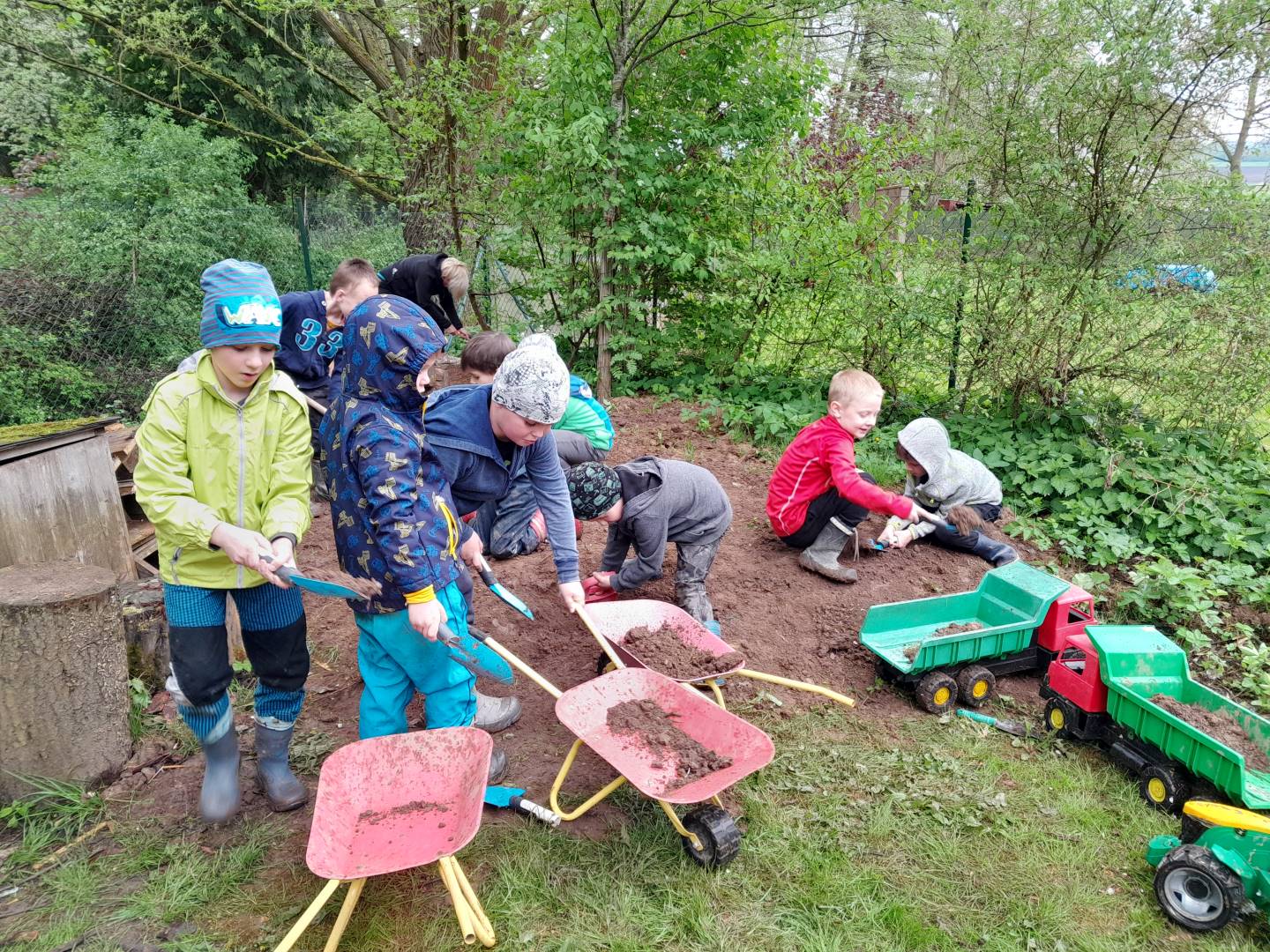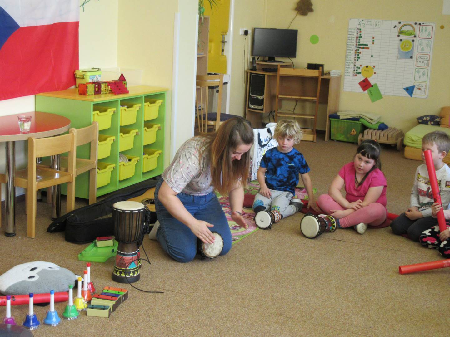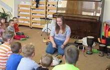 Duben 2024 - jaro, projektový den Fyzika, dopravní prostředky, zdobení týpí a úklid dřeva u maringotky, muzikodrama, slavíme čarodějnice
