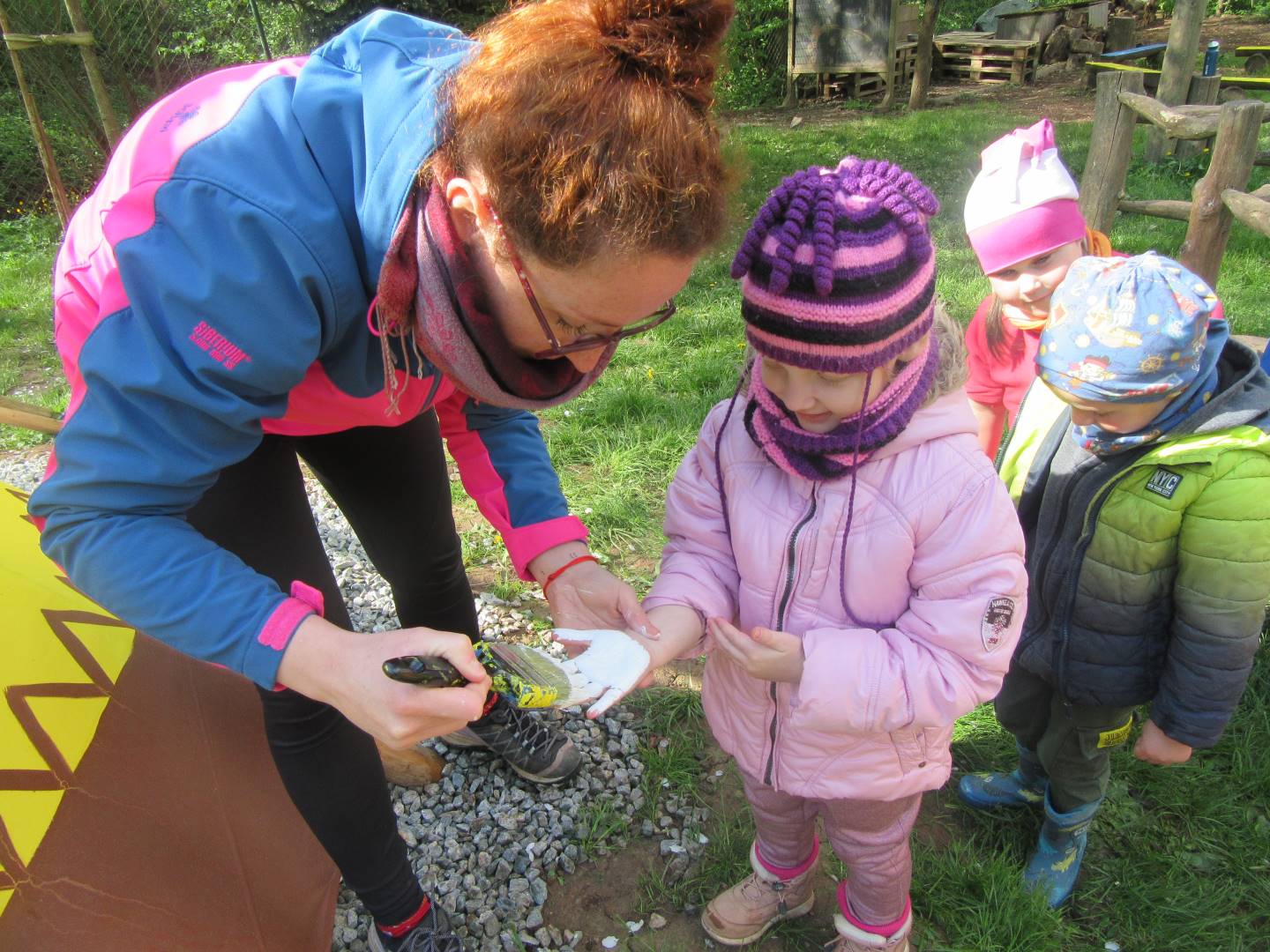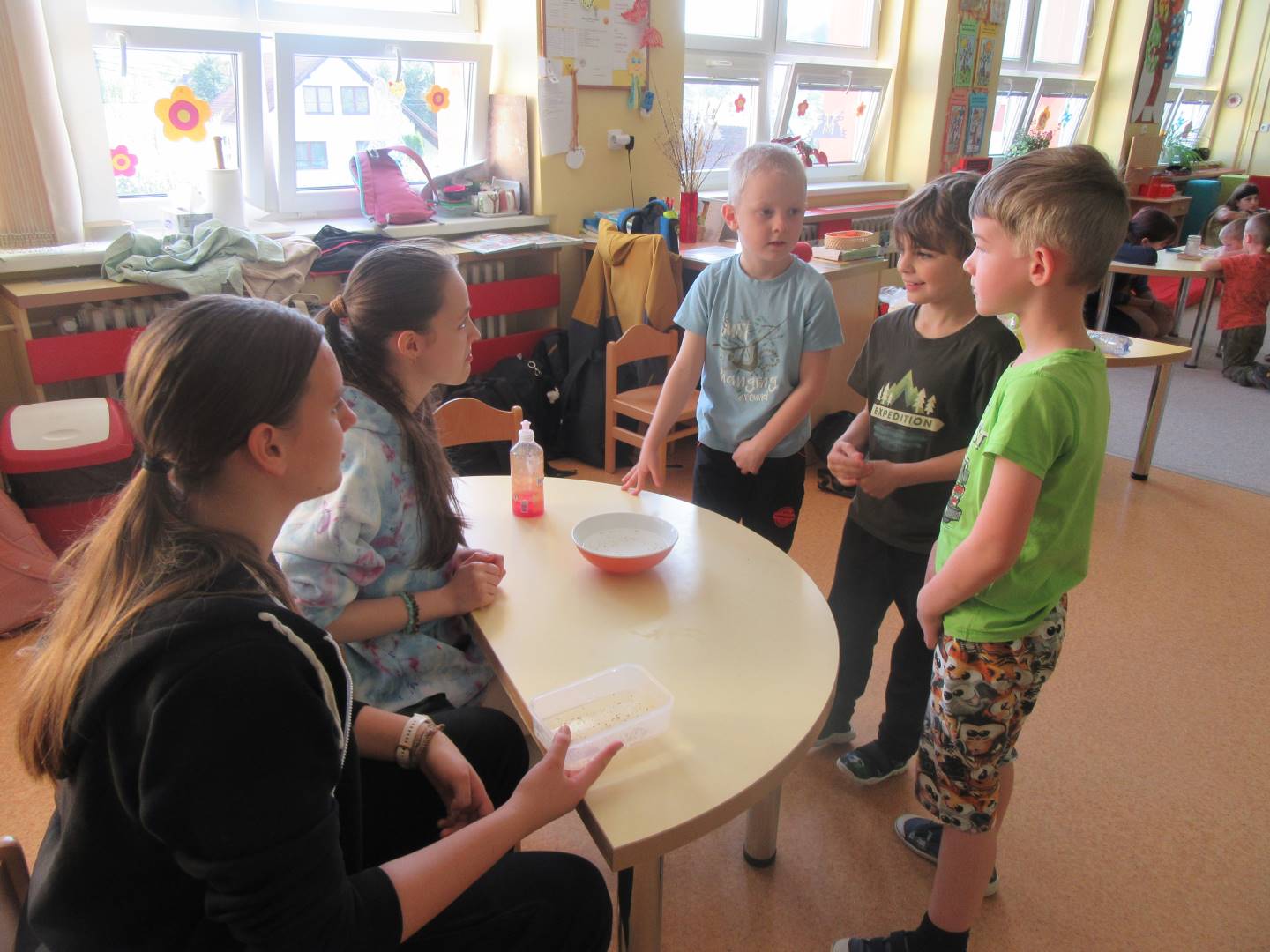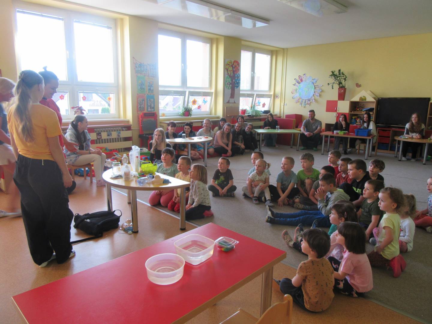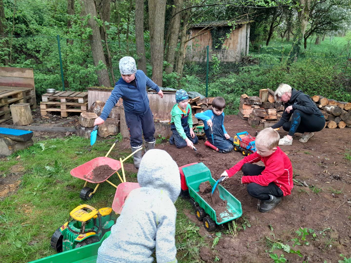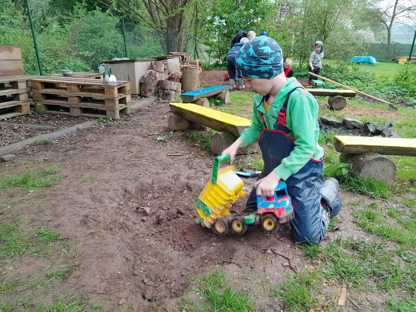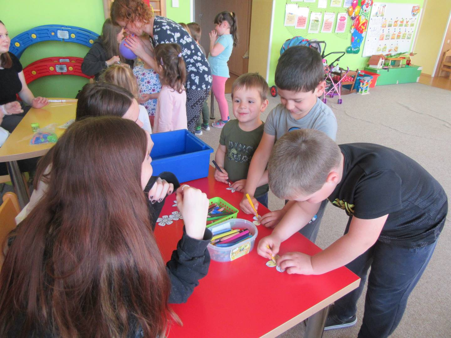 Duben 2024 - jaro, projektový den Fyzika, dopravní prostředky, zdobení týpí a úklid dřeva u maringotky, muzikodrama, slavíme čarodějnice