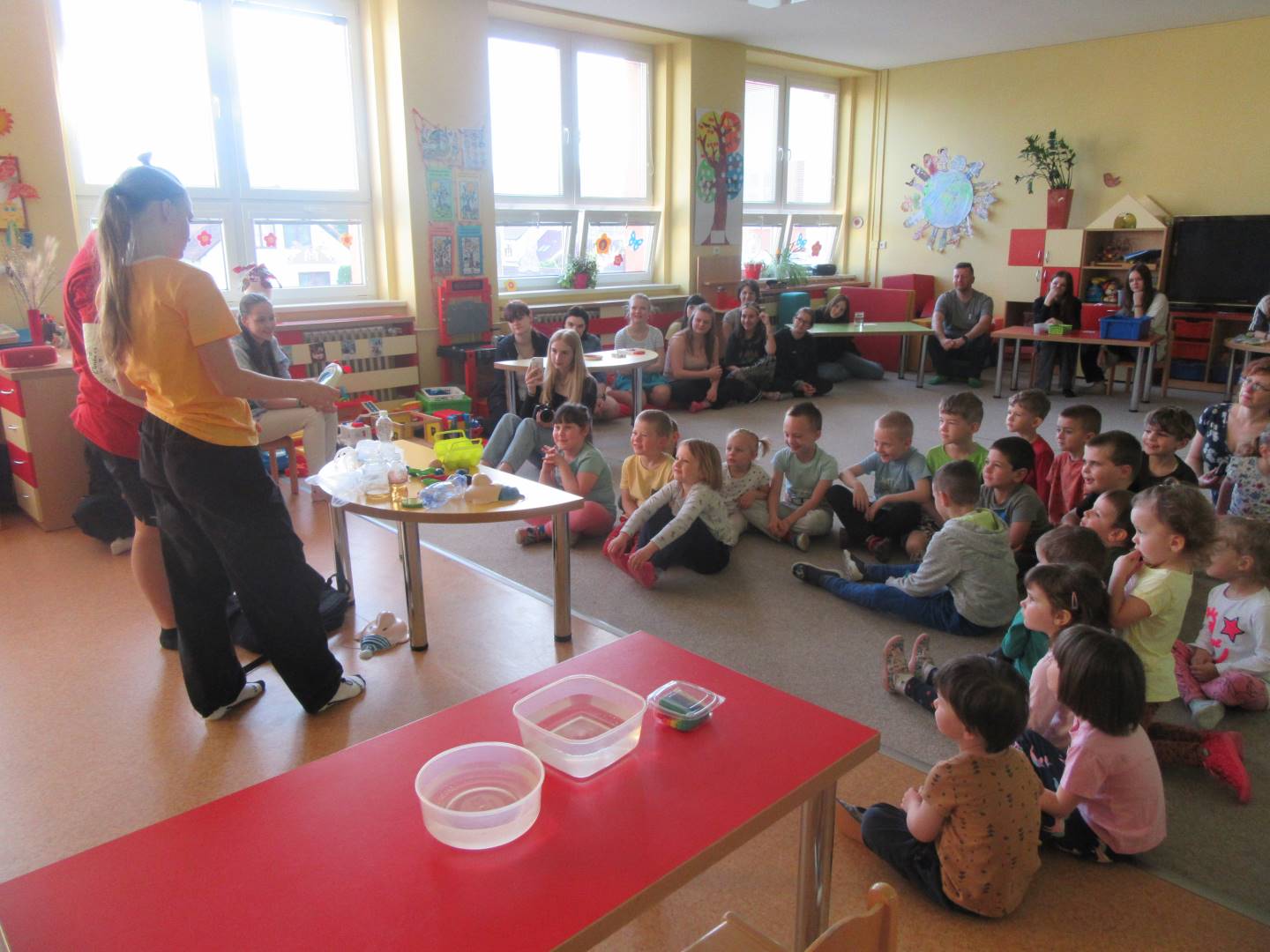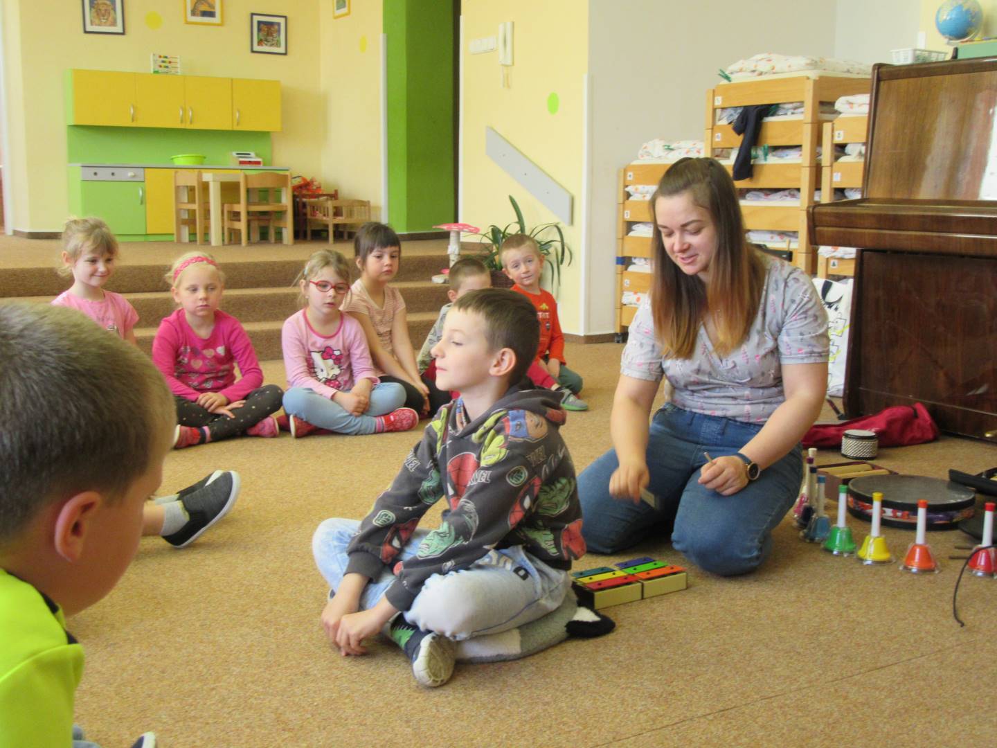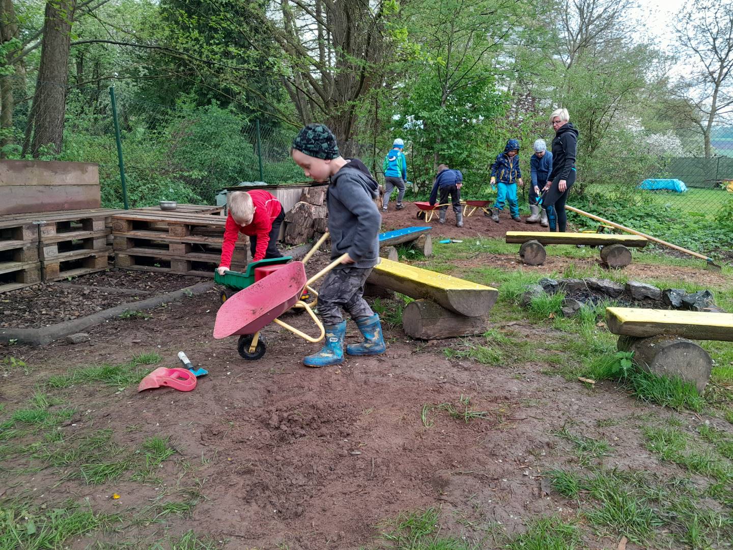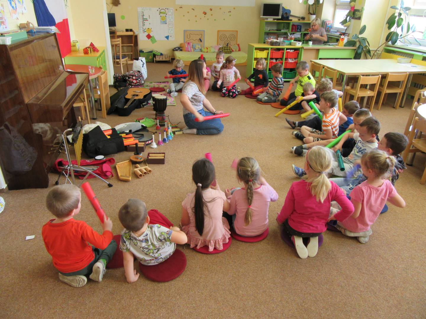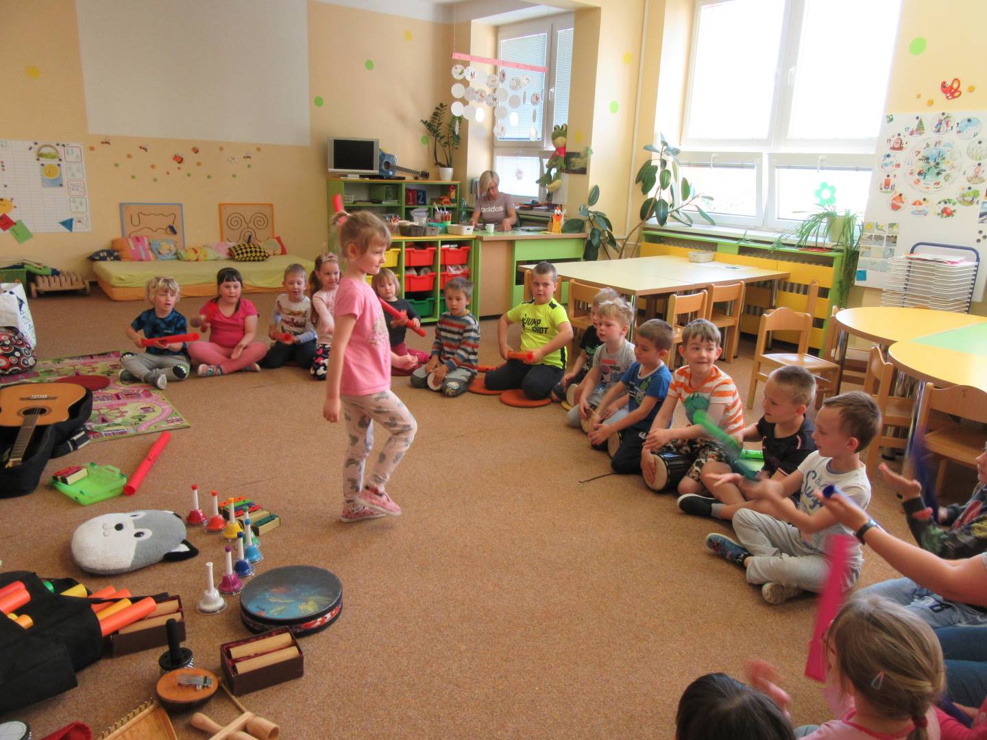 Duben 2024 - jaro, projektový den Fyzika, dopravní prostředky, zdobení týpí a úklid dřeva u maringotky, muzikodrama, slavíme čarodějnice