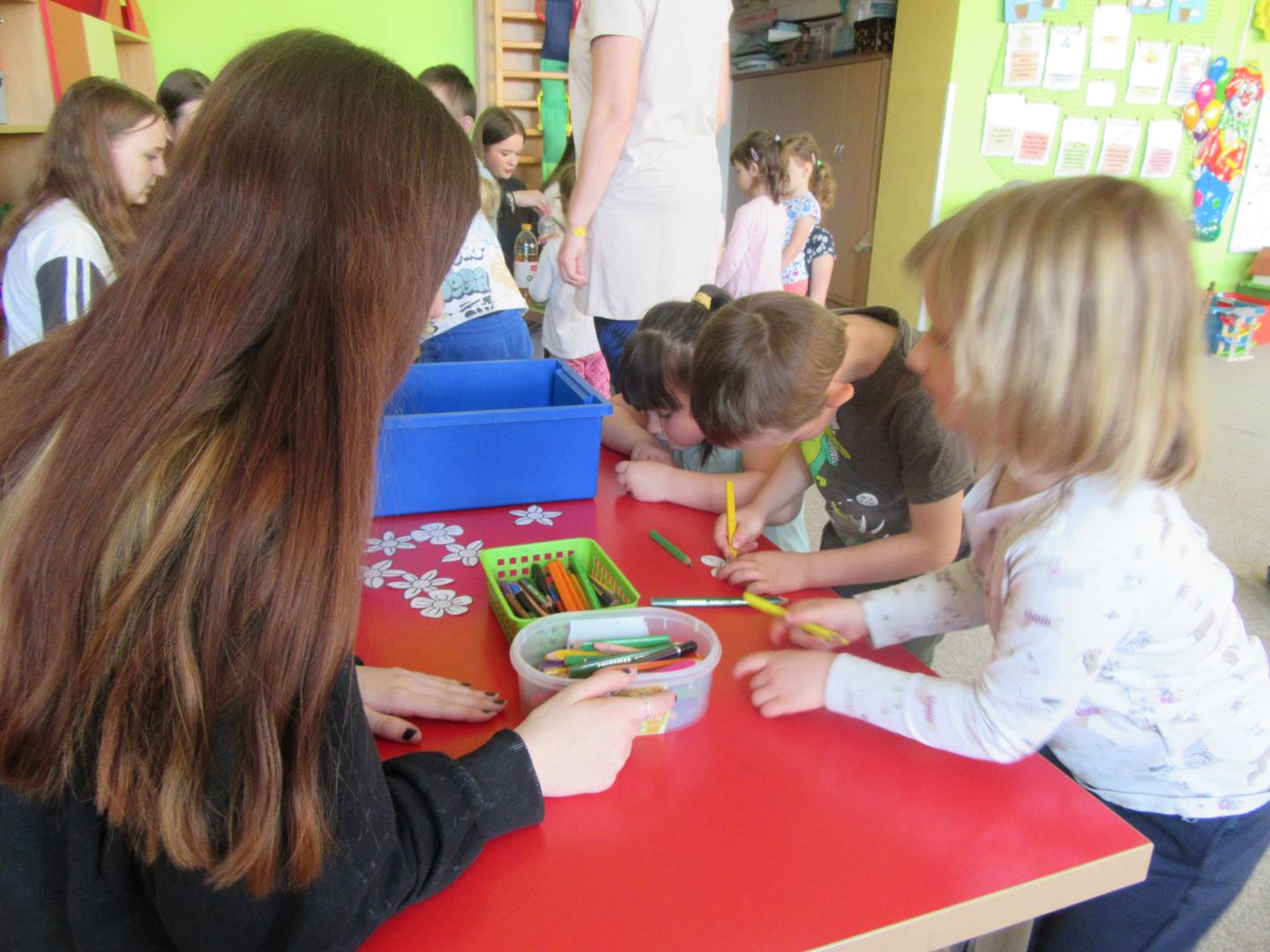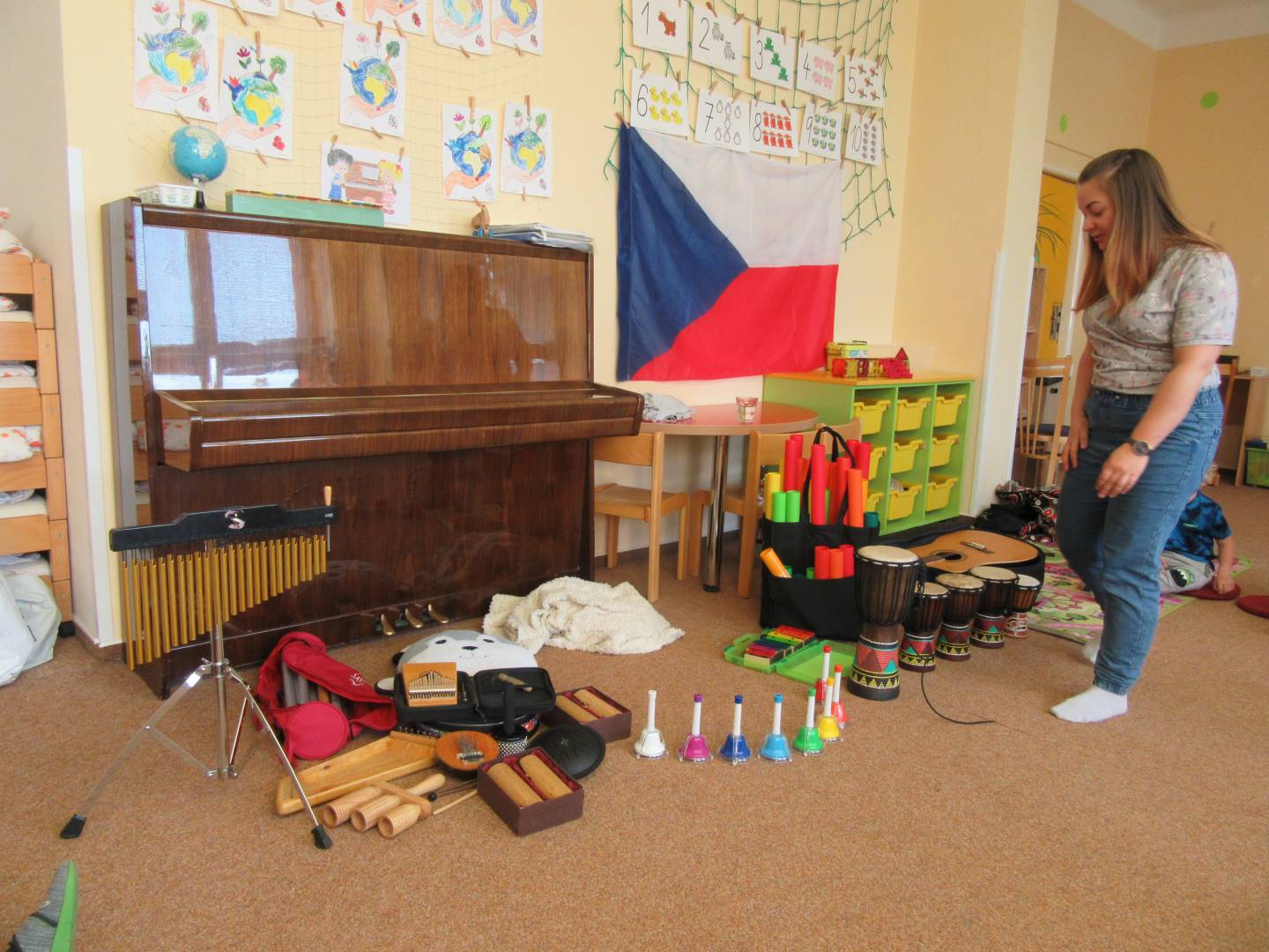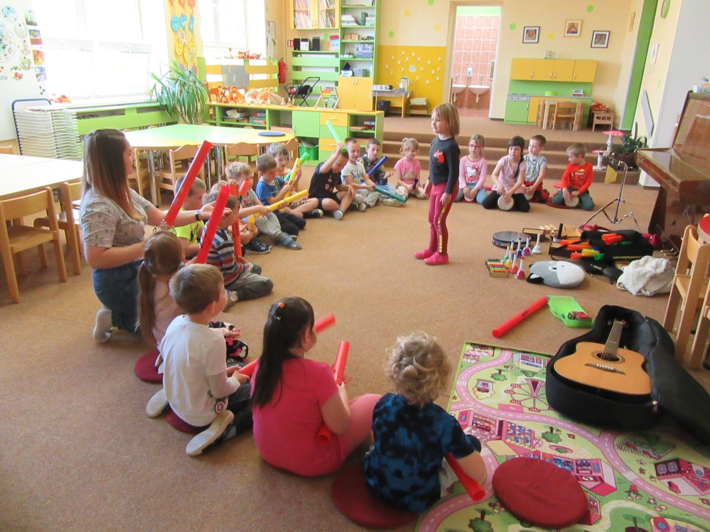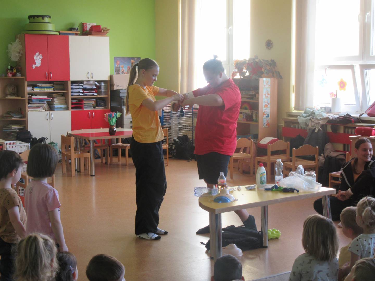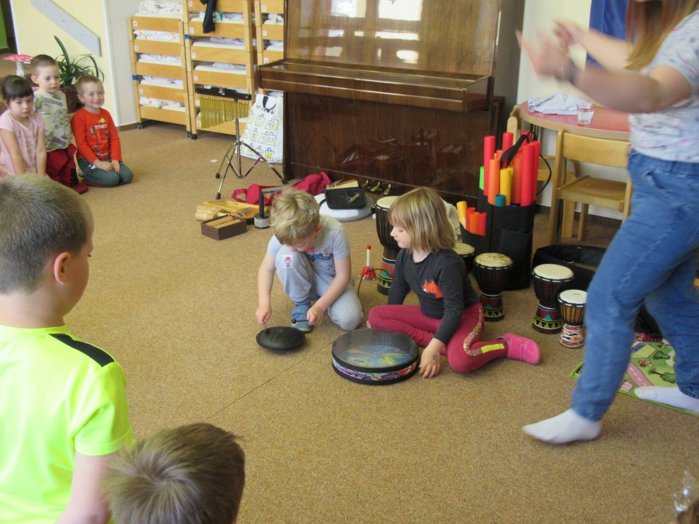 Duben 2024 - jaro, projektový den Fyzika, dopravní prostředky, zdobení týpí a úklid dřeva u maringotky, muzikodrama, slavíme čarodějnice