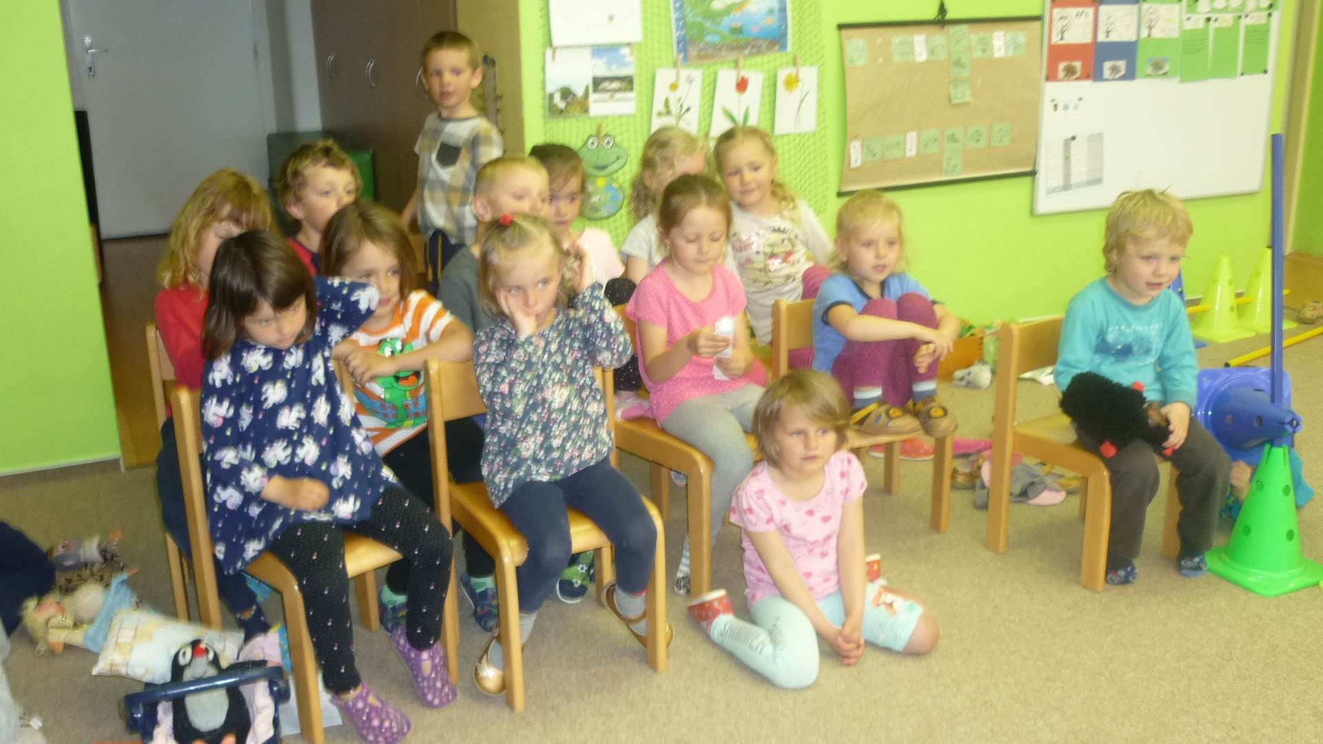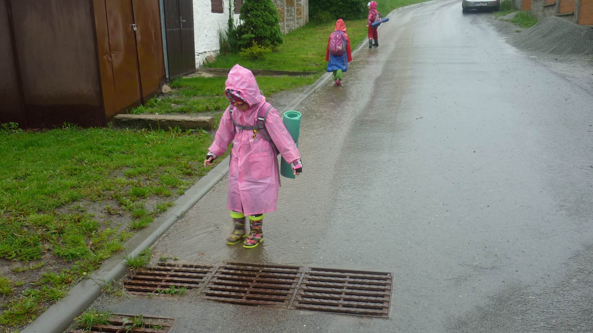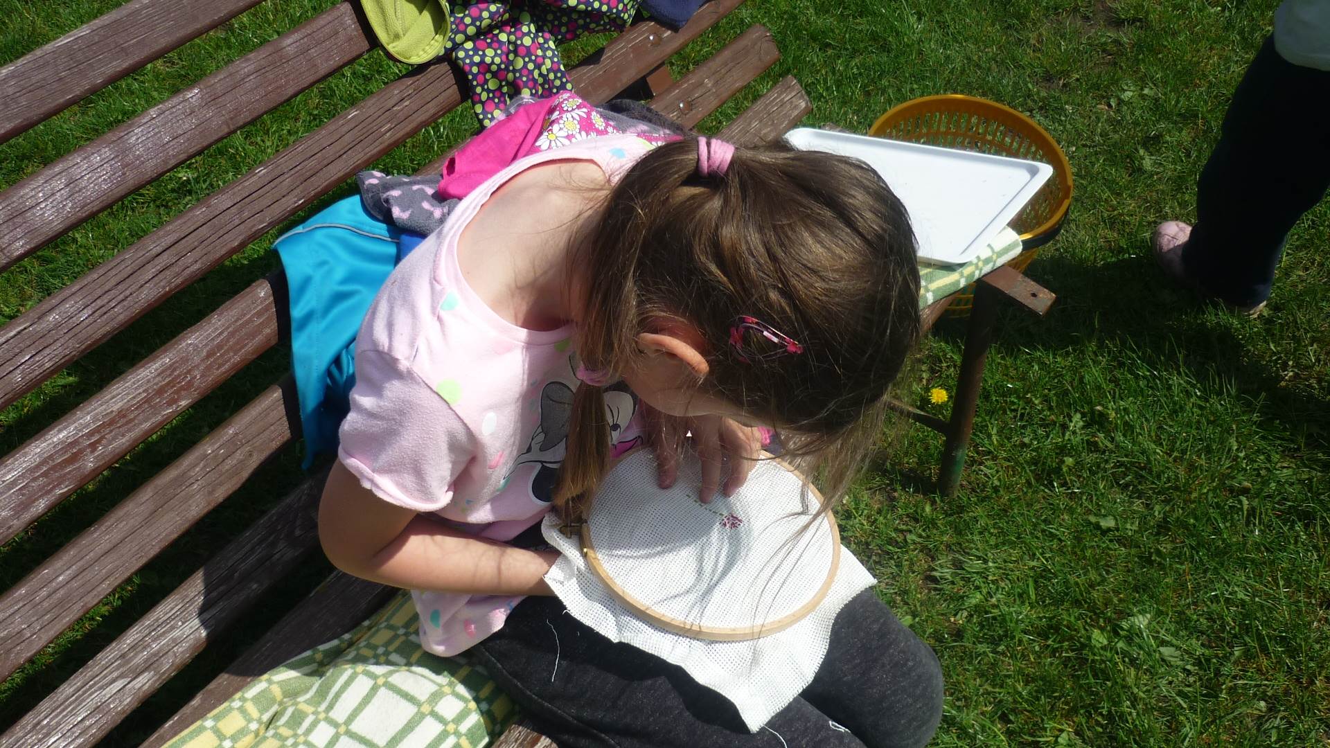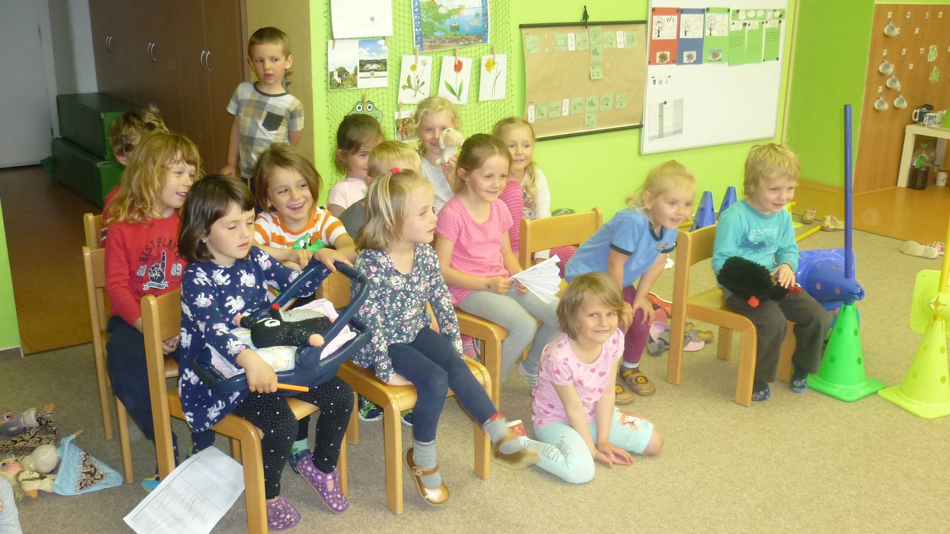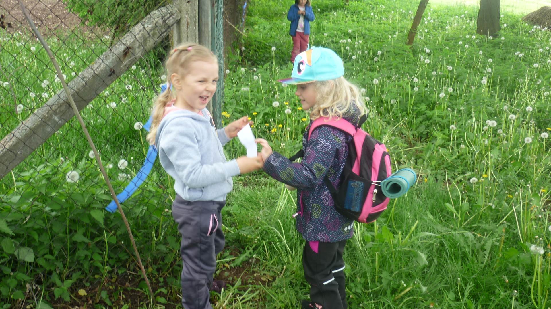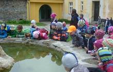 Prší, prší, jen se leje... Tak jsme zahájli tento týden v pláštěnkách! Ale vůbec nám to nevadí, můžeme alespoň sledovat, odkud a kam teče voda. Učíme se básničku Spadla kapka z okapu a vysvětlujeme si, co to ten okap vlastně je. Na cstě jsou proudy vody, na kterých si ukazujeme, jak vypadá mořská delta, co jsou vodopády, stavíme hráze a pouštíme po vodě lodičky z květů či listů. Další den se vyčasilo a všude je plno bílých pampelišek. Necháme se jimi inspirovat k výtvarné činnosti, ale zkoušíme i troubit na jejich stonky a spojovat je dohromady. Vysvětlujeme si, k čemu jsou ta bílá chmýříčka a jak se pampeiška rozmnožuje. Tvoření nás baví, tak zkoušíme ještě květy z obalu na vajíčka, včelu na plástu či rozkvetlou louku z vylisovaných květů. hrajeme maňáskové divadlo, stavíme z dřevěných kostek. Navštívili nás školáci z 5.třídy a vyrážme na výlet na hrad Bouzov, kde nás čeká rytířský turnaj. Na školní zahradě jsme objevili ještěrku a kouzlo vyšívání!