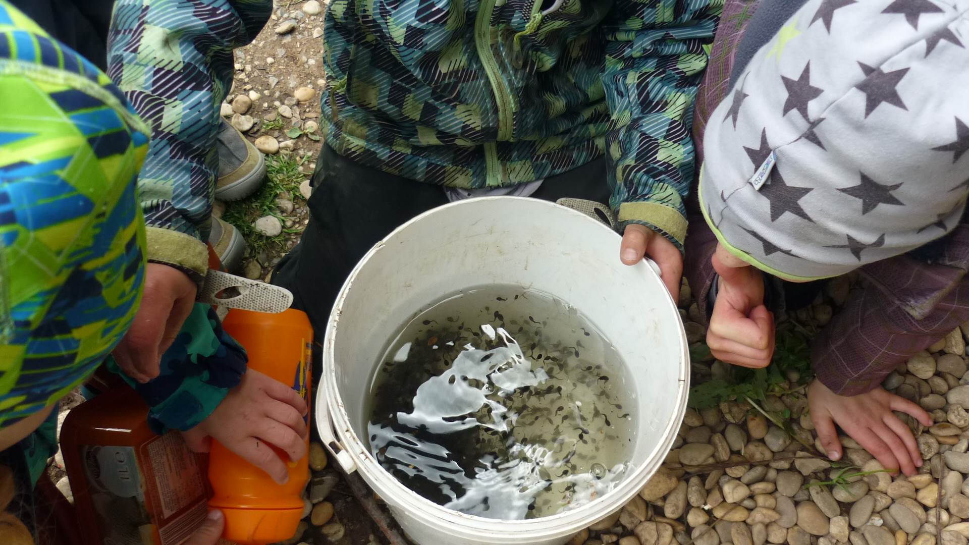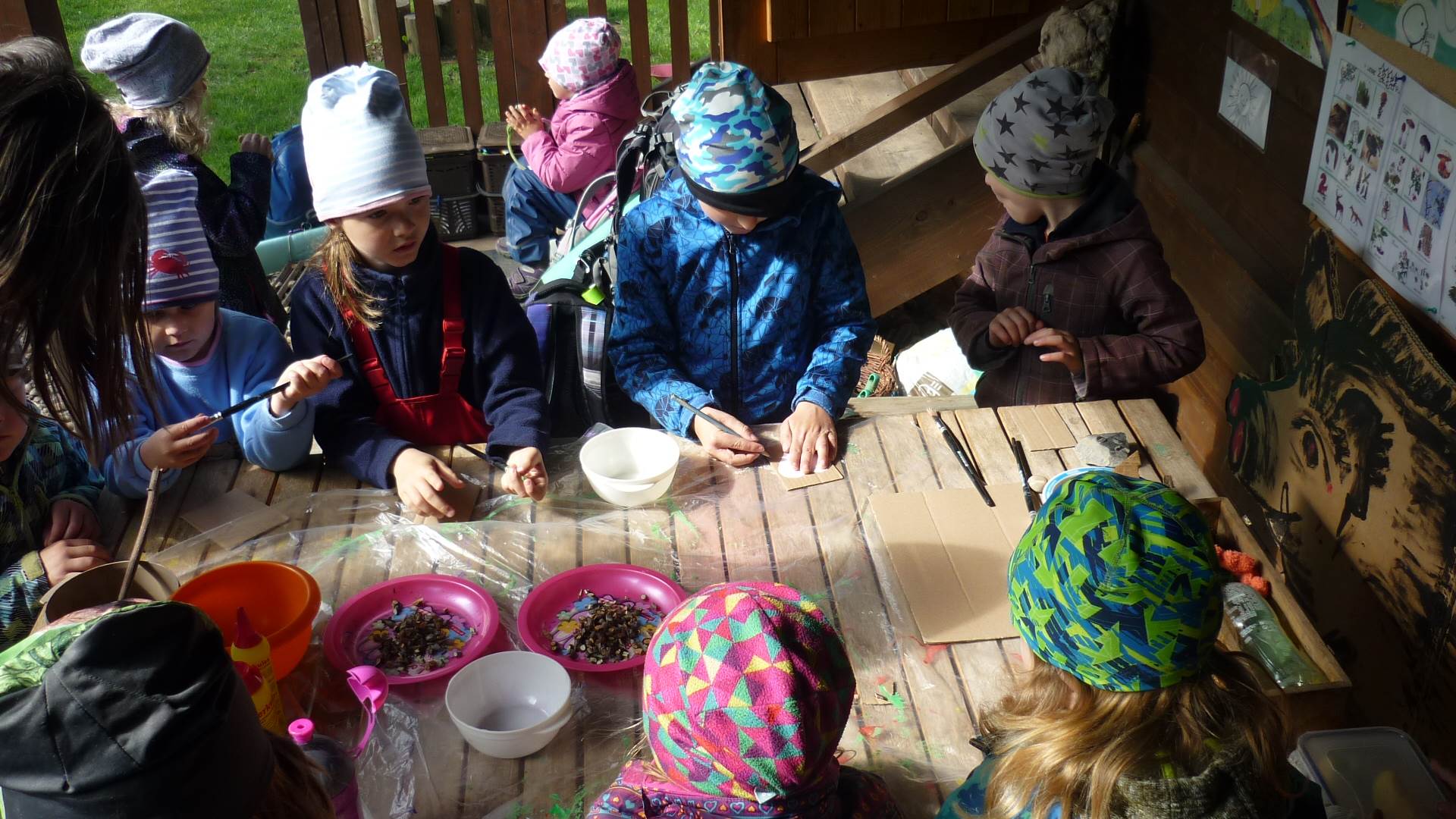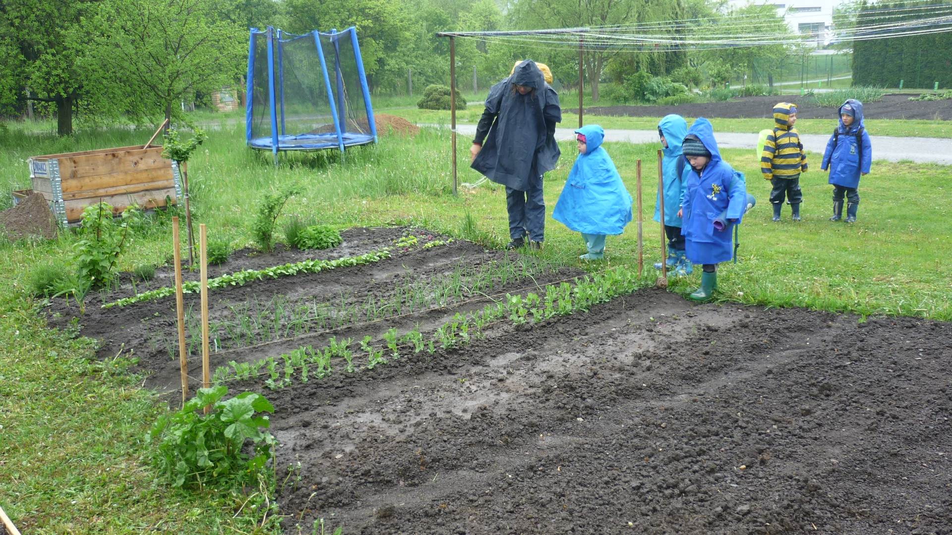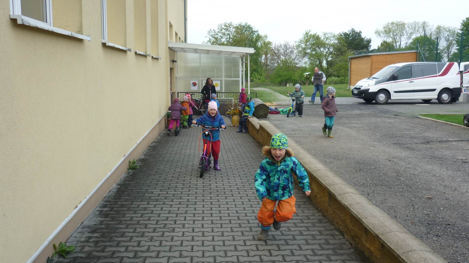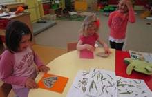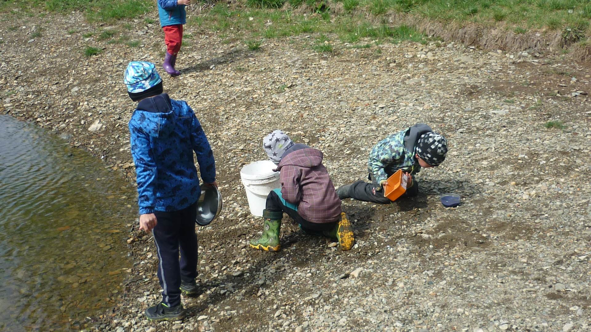 Připravujeme se na Den matek a Den rodiny. Ráno jezdíme na koloběžkách, abychom procvičili hrubou motoriku, a pak teprve vyrážíme k lesu. U rybníčka nás zajímají hlavně pulci. Povídáme si o maminkách, jak se jmenují, co všechno doma musí zvládnout a jak jim s tím můžeme pomoci. Učíme se básničku a vyrábíme srdíčka z klacíků a přáníčka z vylisovaných květů. Po dešti sledujeme, co kde roste, povídáme si, kde se déšť bere a vodu si i malujeme.
