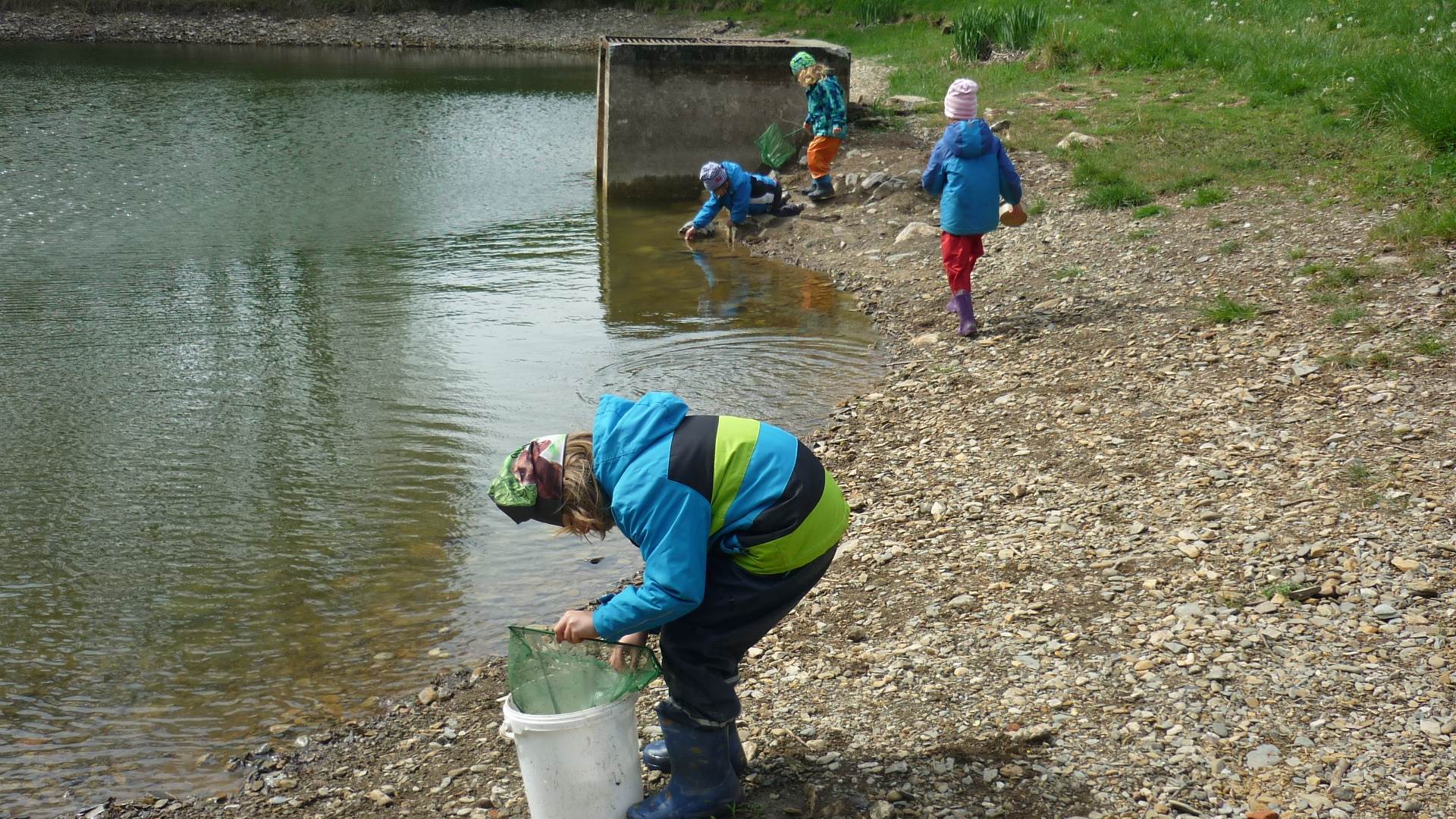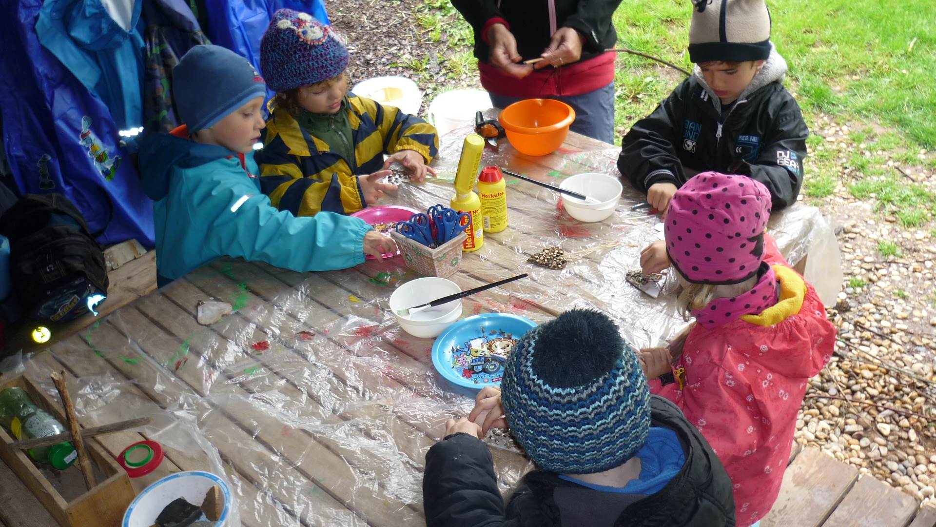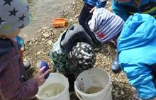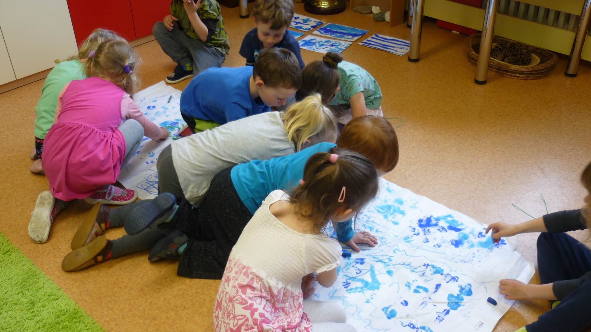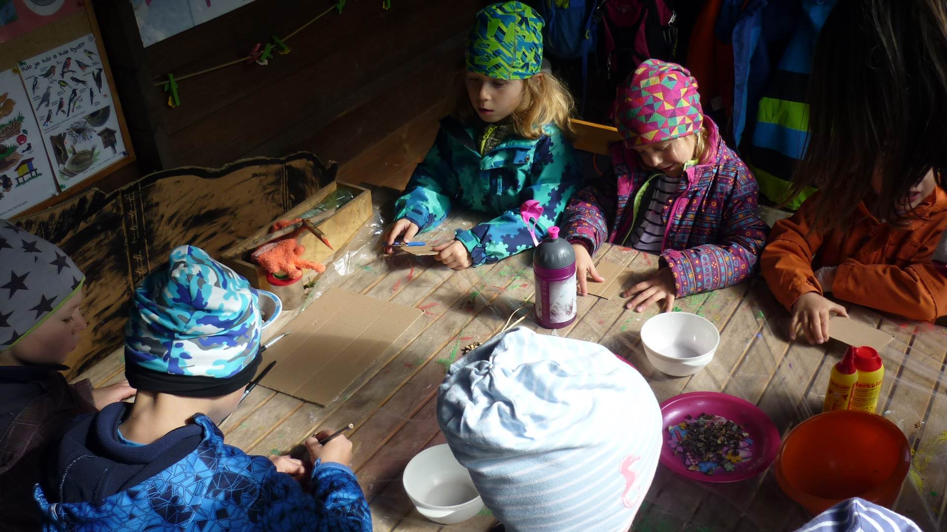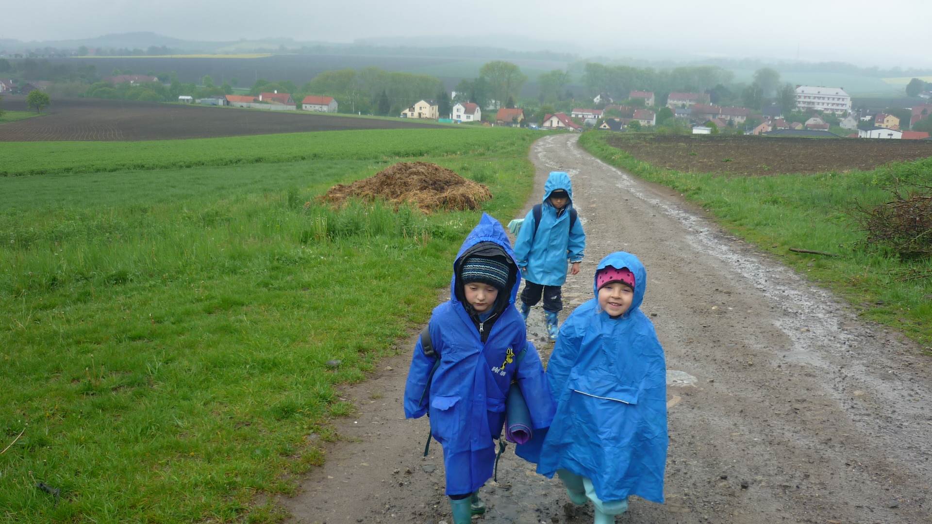 Připravujeme se na Den matek a Den rodiny. Ráno jezdíme na koloběžkách, abychom procvičili hrubou motoriku, a pak teprve vyrážíme k lesu. U rybníčka nás zajímají hlavně pulci. Povídáme si o maminkách, jak se jmenují, co všechno doma musí zvládnout a jak jim s tím můžeme pomoci. Učíme se básničku a vyrábíme srdíčka z klacíků a přáníčka z vylisovaných květů. Po dešti sledujeme, co kde roste, povídáme si, kde se déšť bere a vodu si i malujeme.