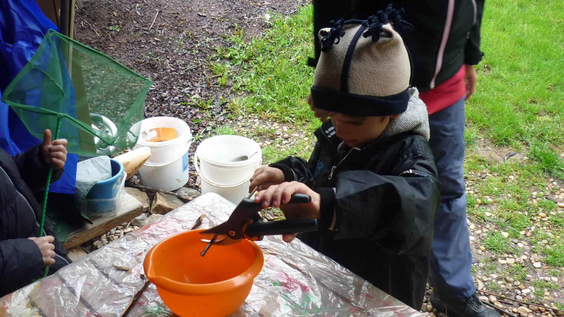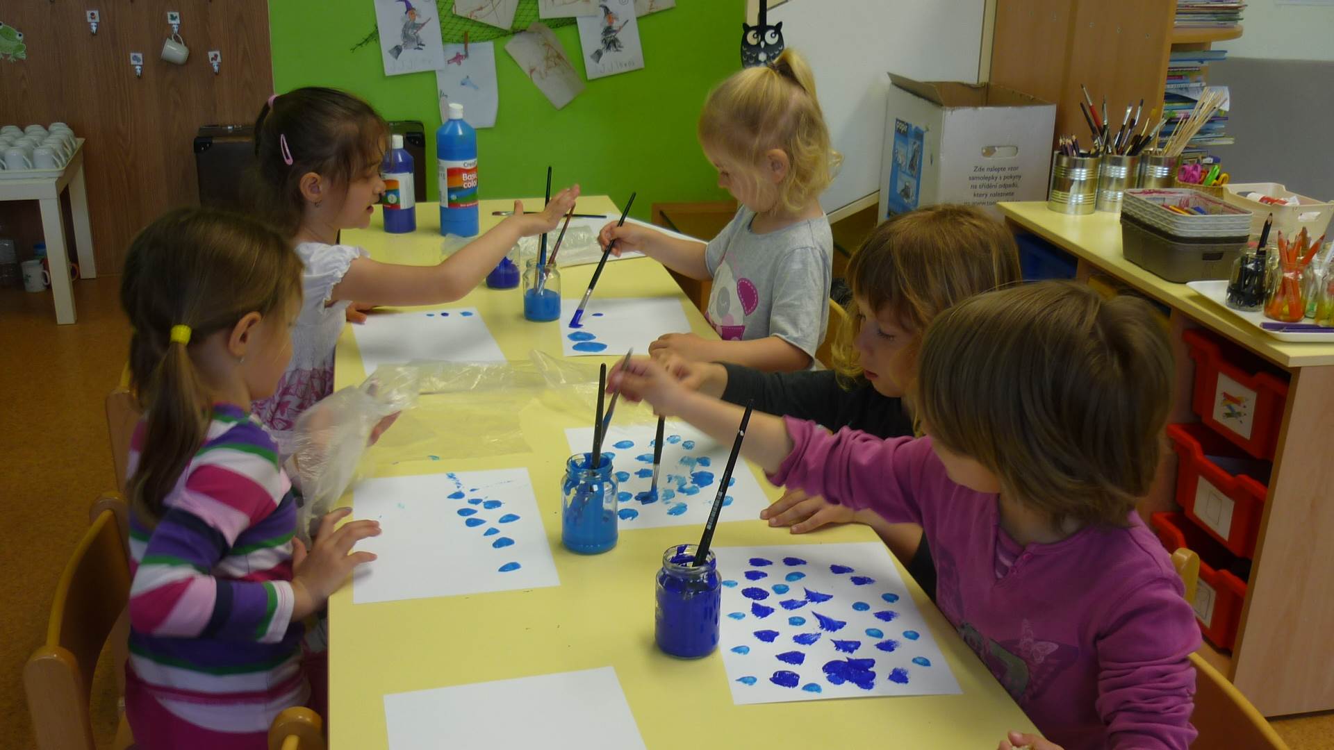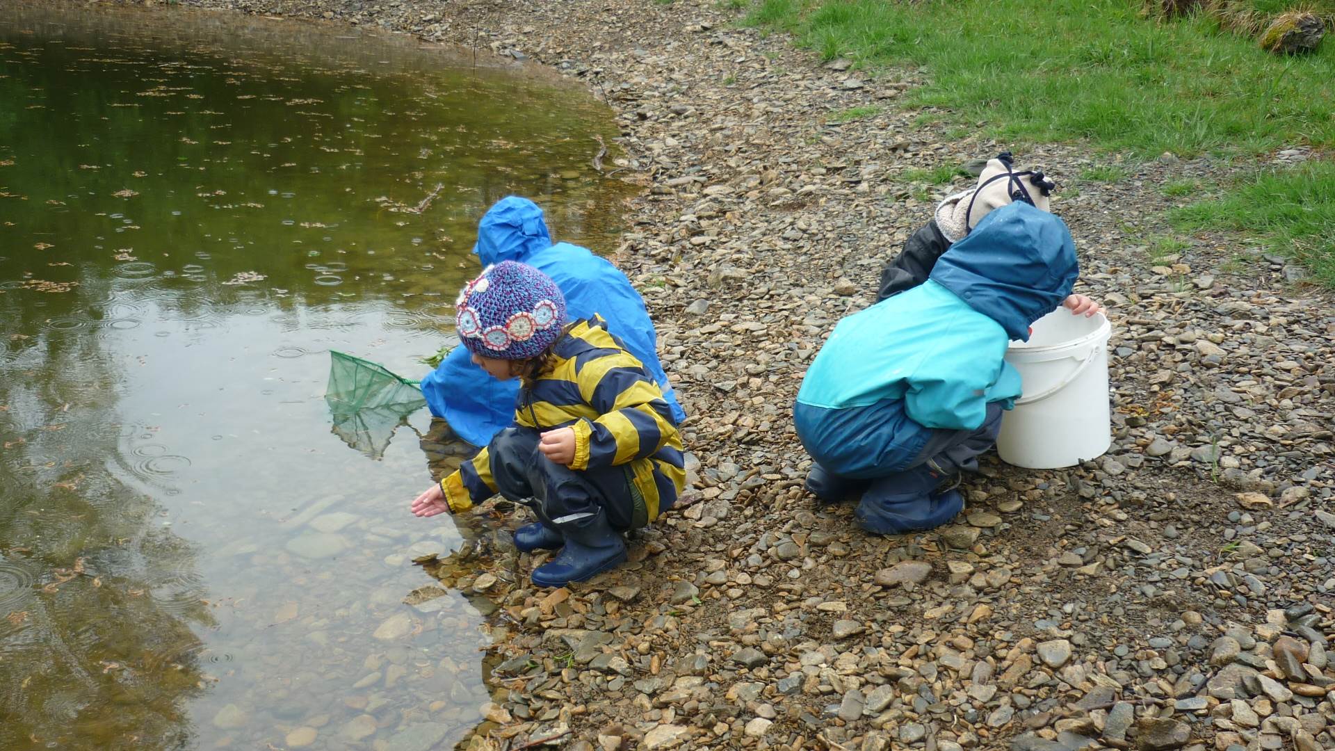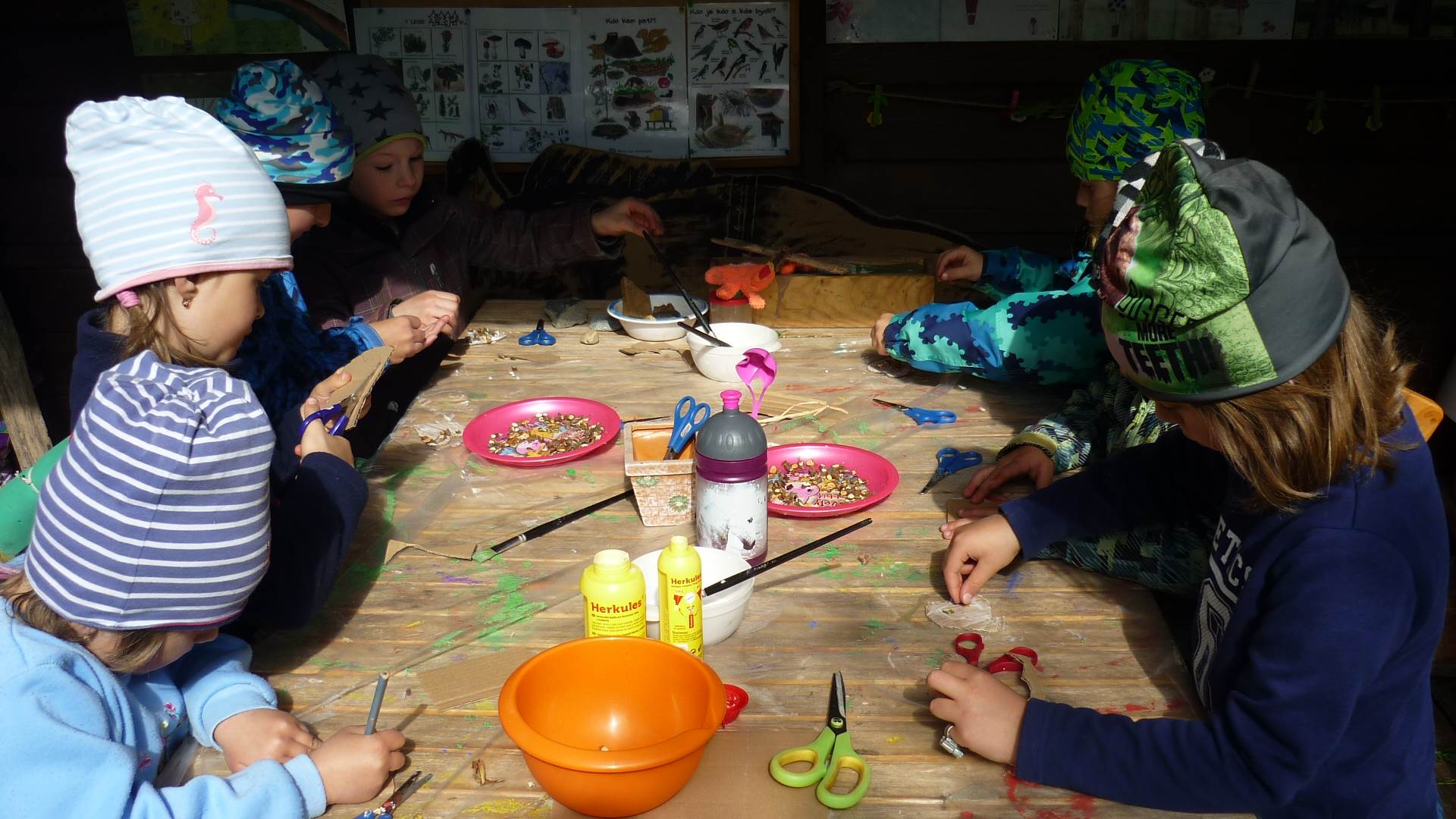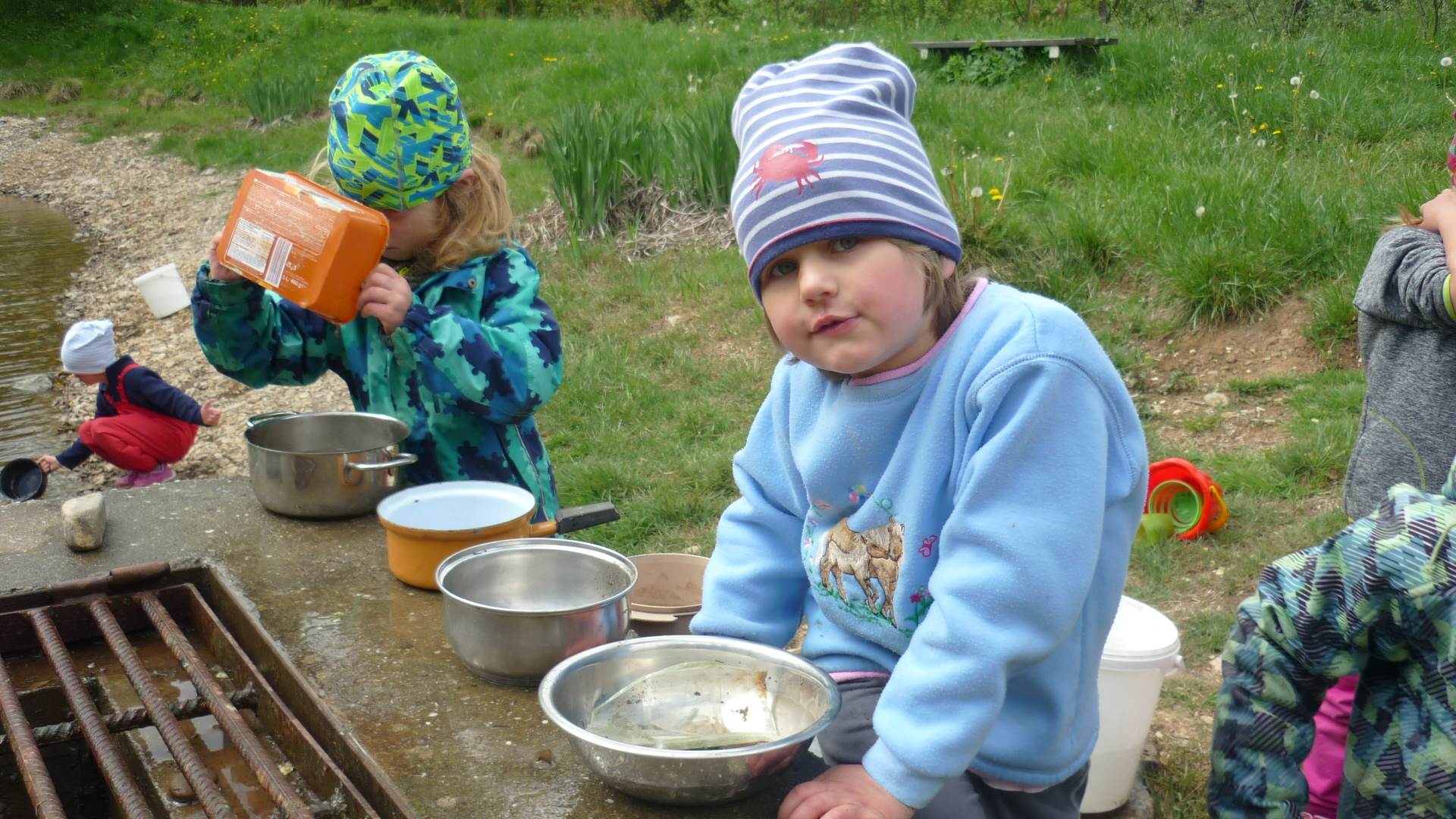 Připravujeme se na Den matek a Den rodiny. Ráno jezdíme na koloběžkách, abychom procvičili hrubou motoriku, a pak teprve vyrážíme k lesu. U rybníčka nás zajímají hlavně pulci. Povídáme si o maminkách, jak se jmenují, co všechno doma musí zvládnout a jak jim s tím můžeme pomoci. Učíme se básničku a vyrábíme srdíčka z klacíků a přáníčka z vylisovaných květů. Po dešti sledujeme, co kde roste, povídáme si, kde se déšť bere a vodu si i malujeme.
