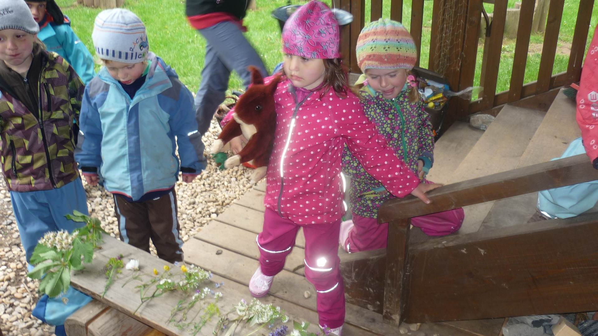 Tento týden je ve znamení květin. Prohlížíme si jejich různé barvy a tvary, třídíme je do skupin. Říkáme si, které jsou léčivé, a ty pak sbíráme na čaj.Starší kluci krásně připravili ohniště: nasbírali dřevo, upravili hranici a zapálili oheň. Už docela obstojně zachází se sekerou! Čaj jsme si osladili pampeliškovým sirupem od paní učitelky Olči. Moc nám všem chutnal a hlavně zahřál! Ledoví muži se totiž činili. Dokonce jsme si na ně i zahráli! Janeček s Tiborkem asi budou bubeníci. Připravili si úžasnou hudební produkci! Také jsme oslavili Barunčiny narozeniny a navštívili výstavu svatebních fotografií na sýpce. V pátek jsme pak dokončili povídání o vodě projektem Od pramene k moři. Výsledné dílo si můžete prohlédnout v MŠ. A protože konečně začalo být hezky, užívali jsme si na školní zahradě.