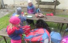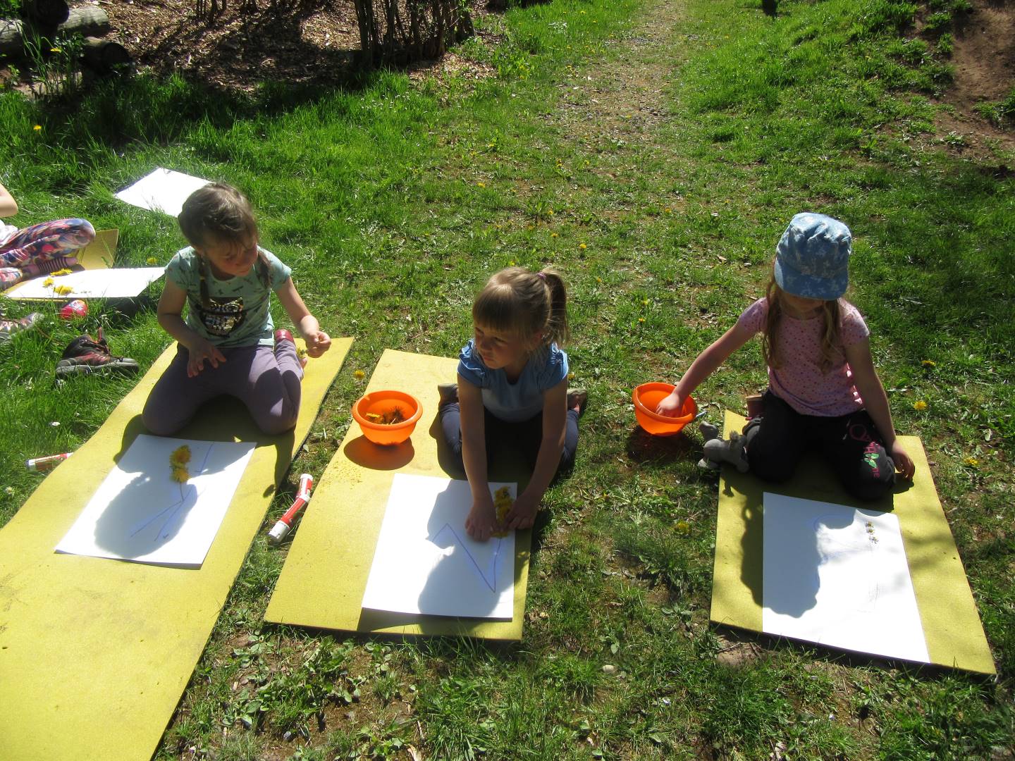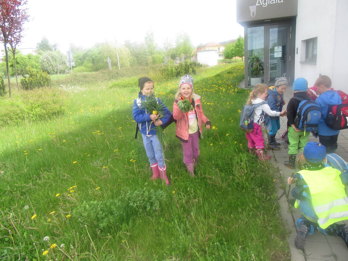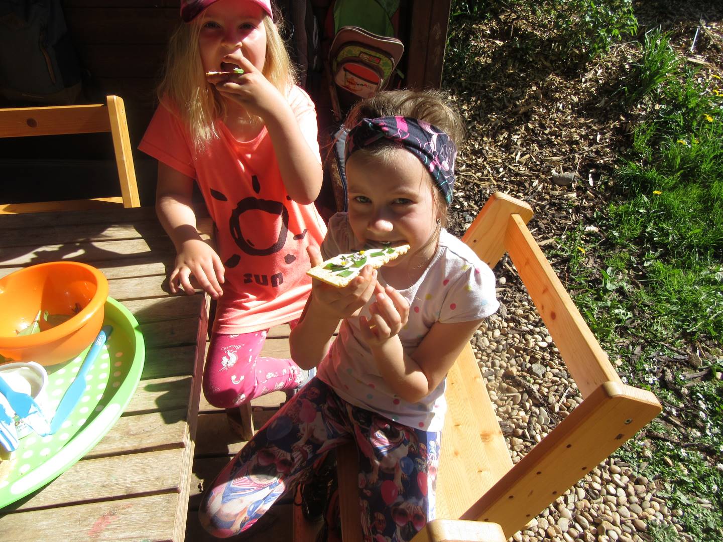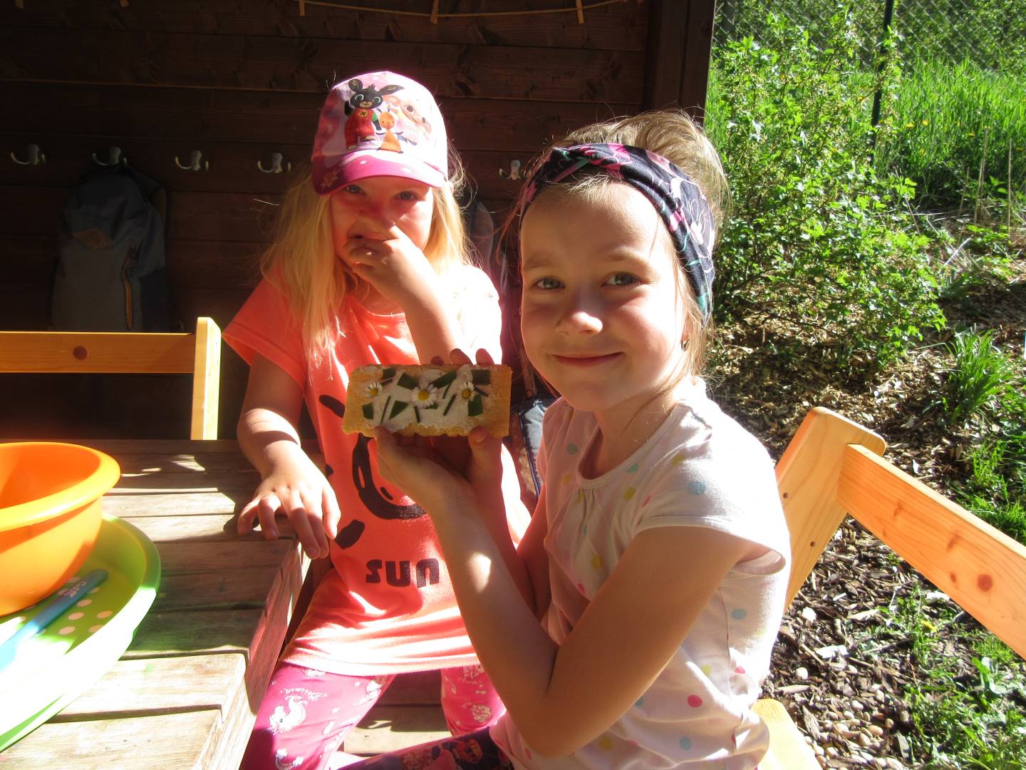 Záhonky v lesním zázemí začaly jarně plodit a holčičky i kluci se pustili do vyrábění pomazánek, obložených sucharů a dalších pochoutek z pažitky, medvědího česneku a sedmikrásek.