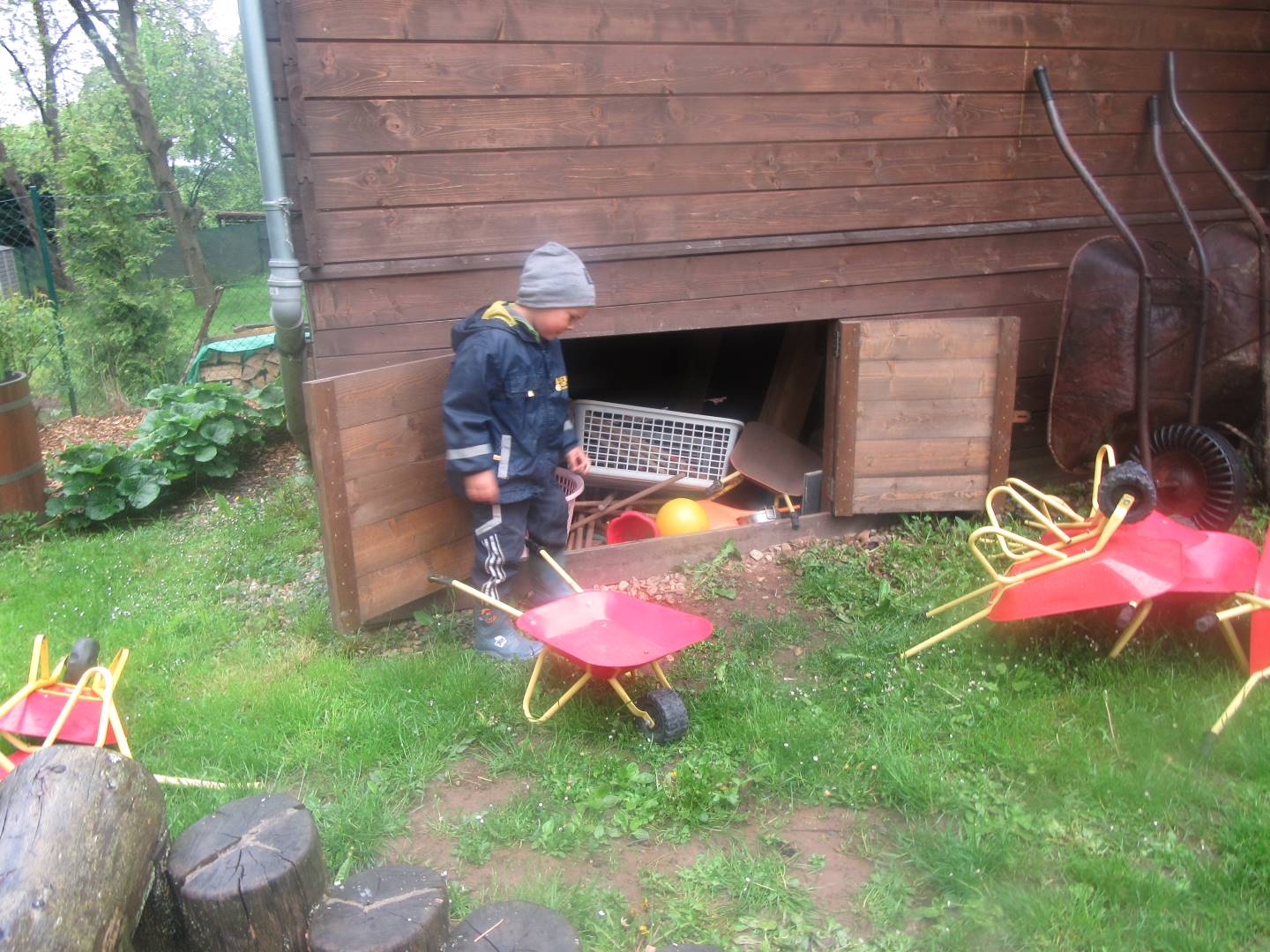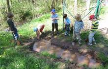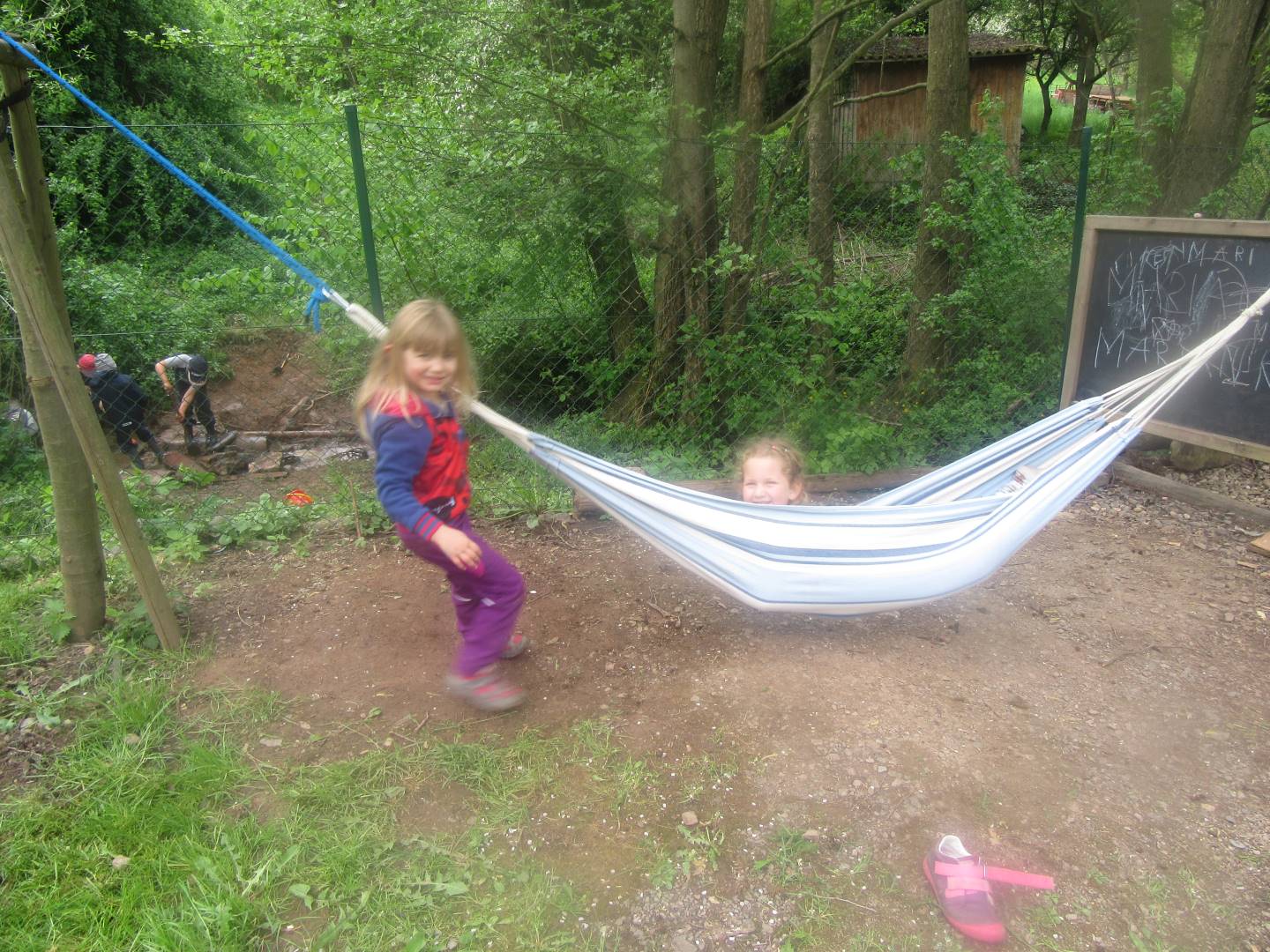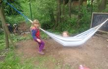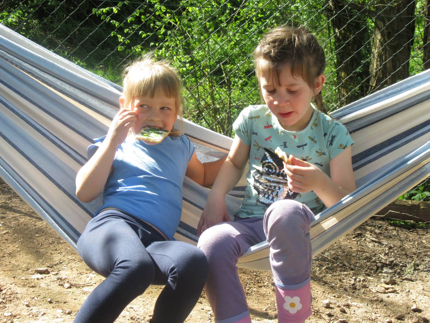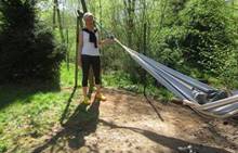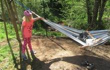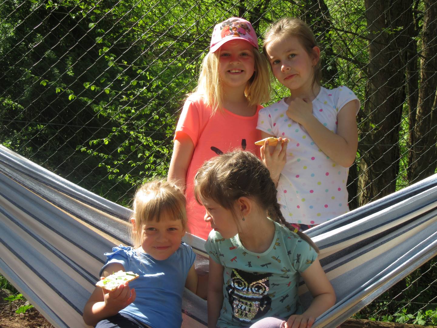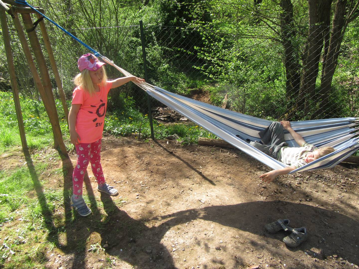 V okolí maringotky se dětem podařilo postavit spoustu hrází a vodních kaskád. Velikou radost nám přinesla nová houpací síť.