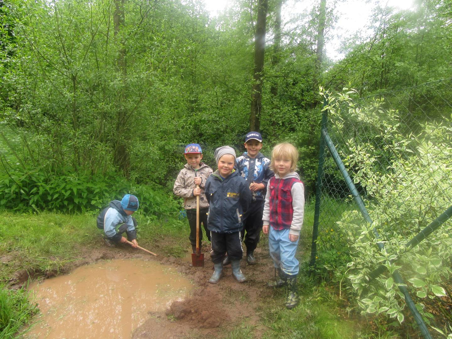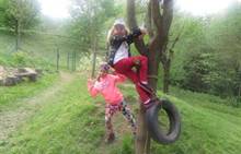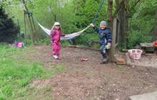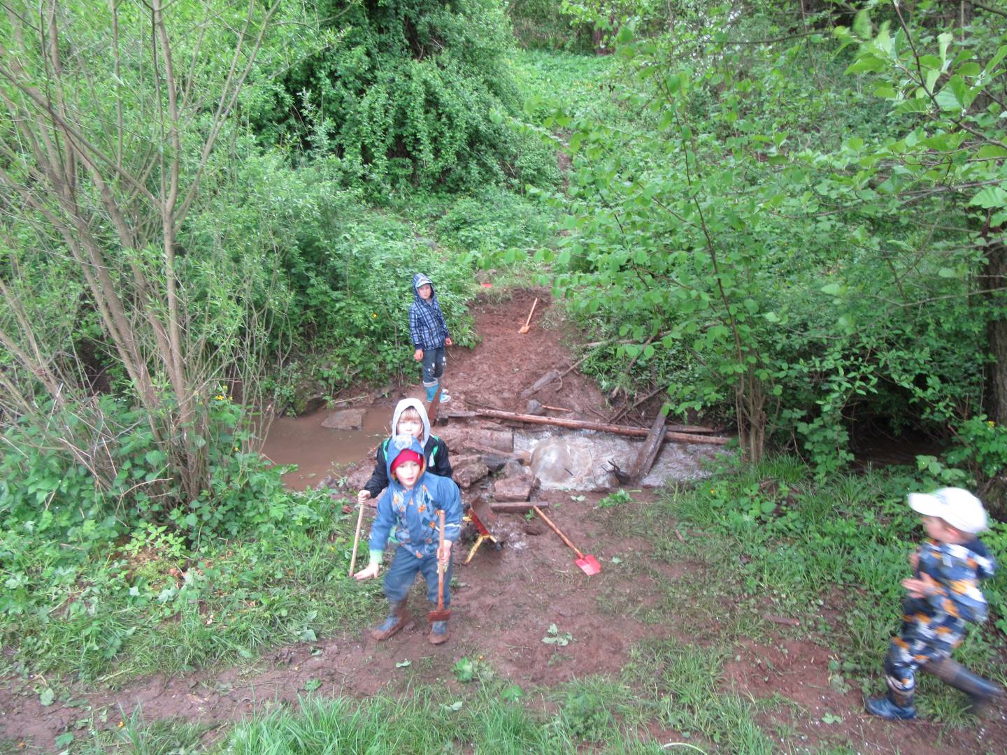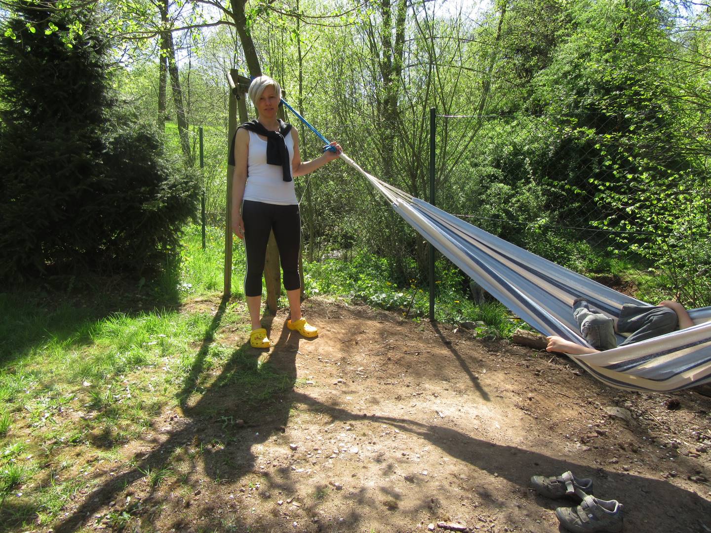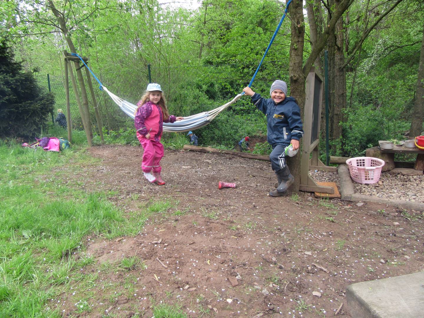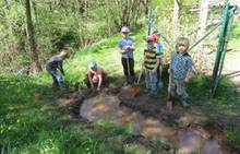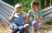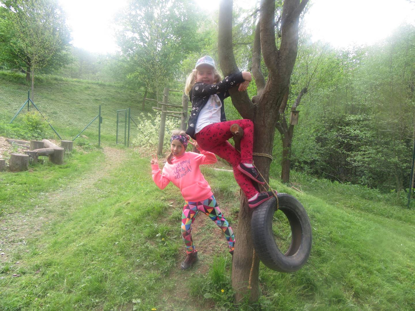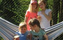 V okolí maringotky se dětem podařilo postavit spoustu hrází a vodních kaskád. Velikou radost nám přinesla nová houpací síť.