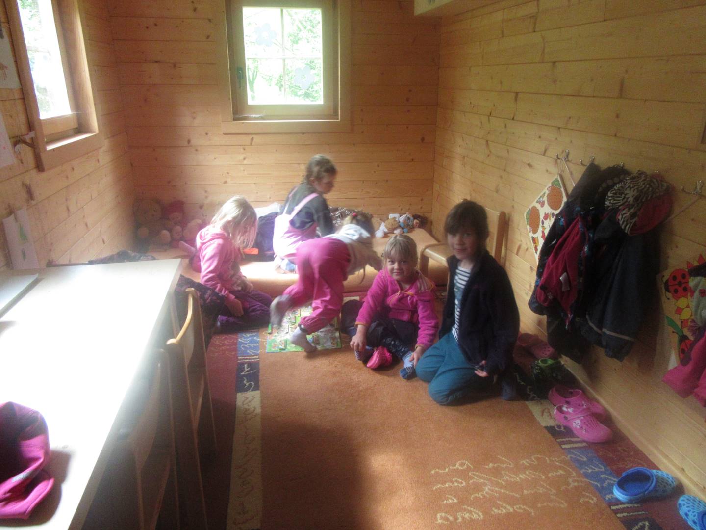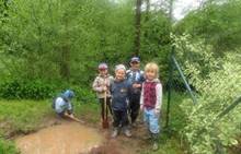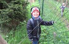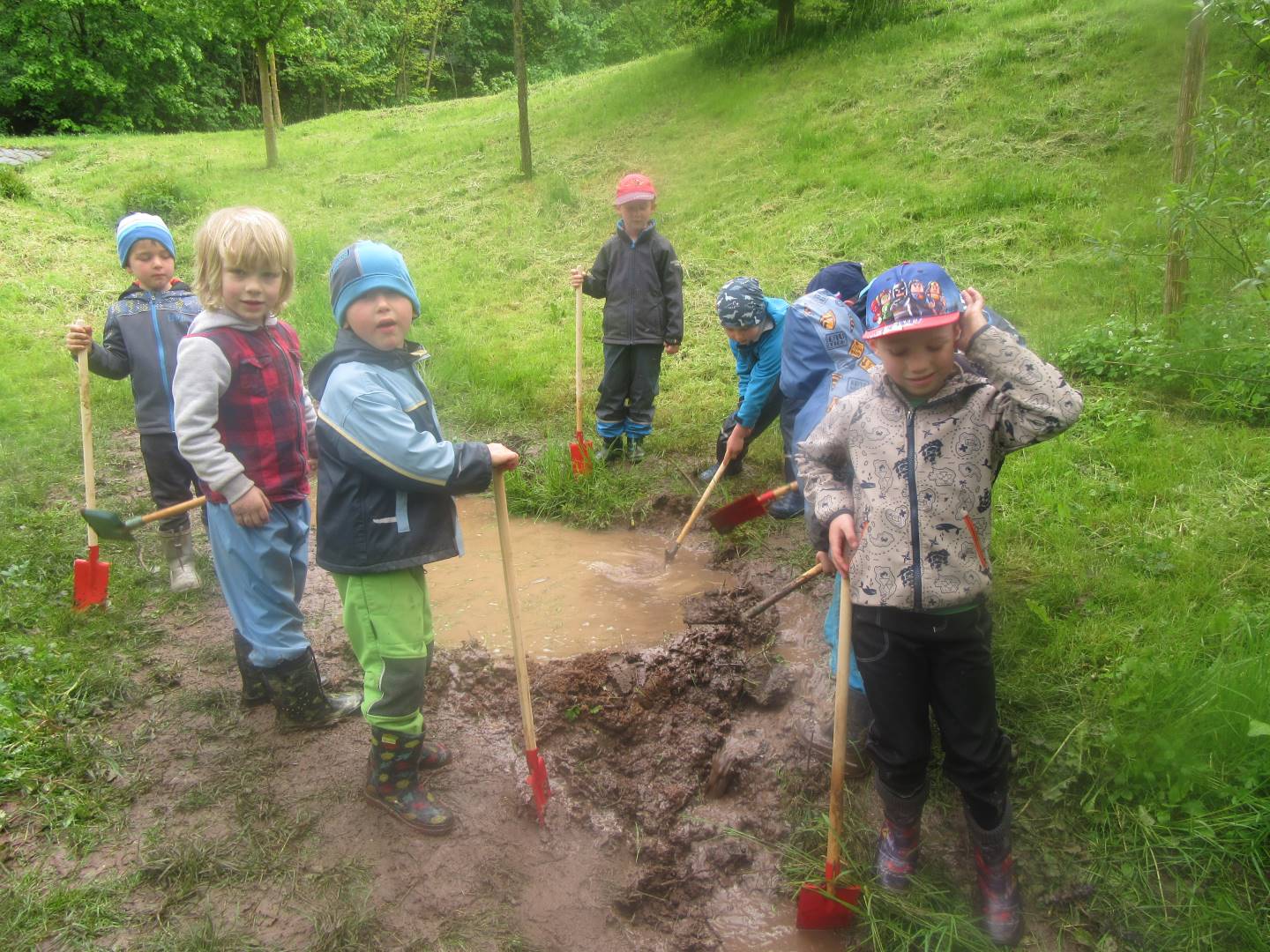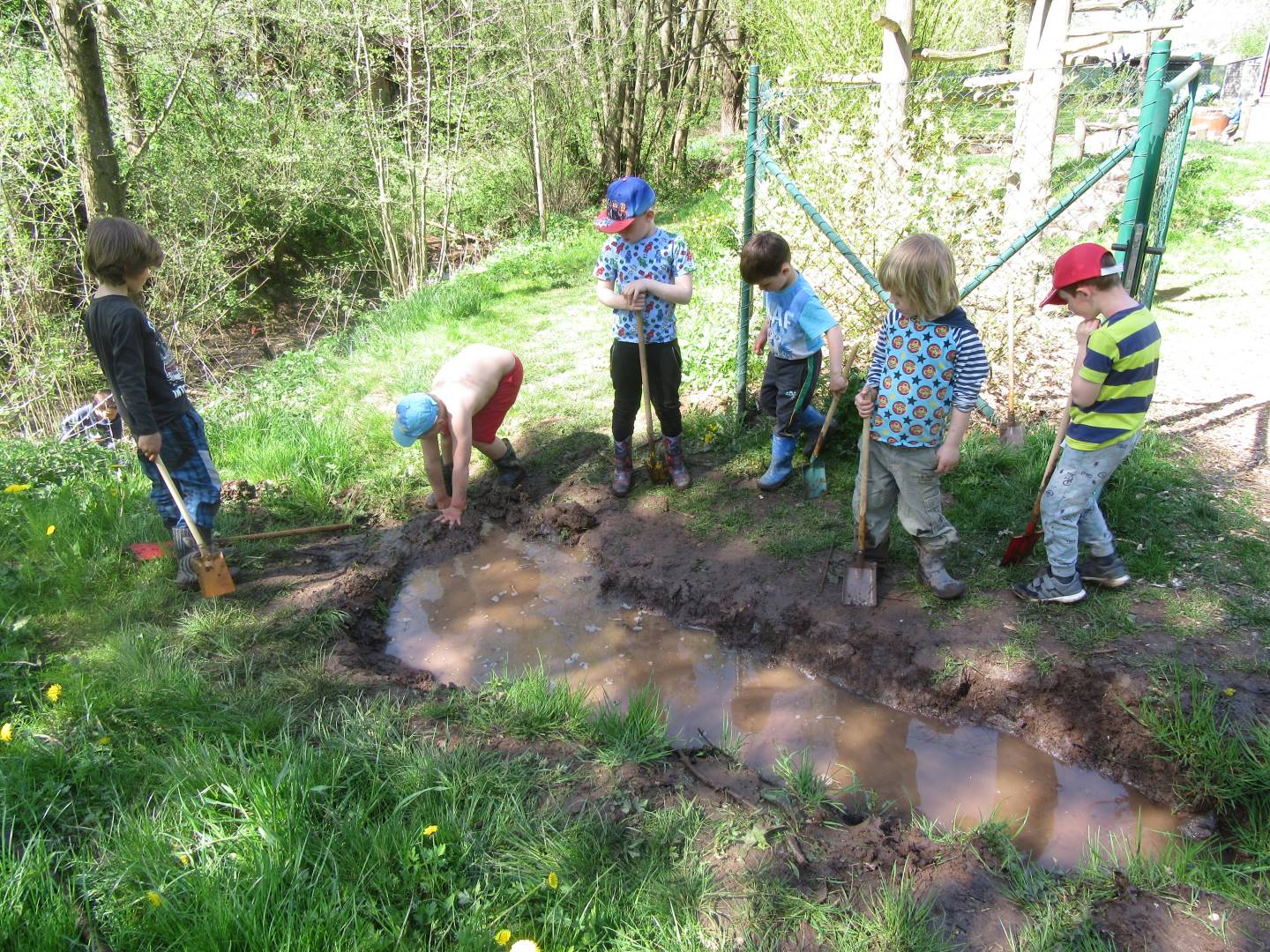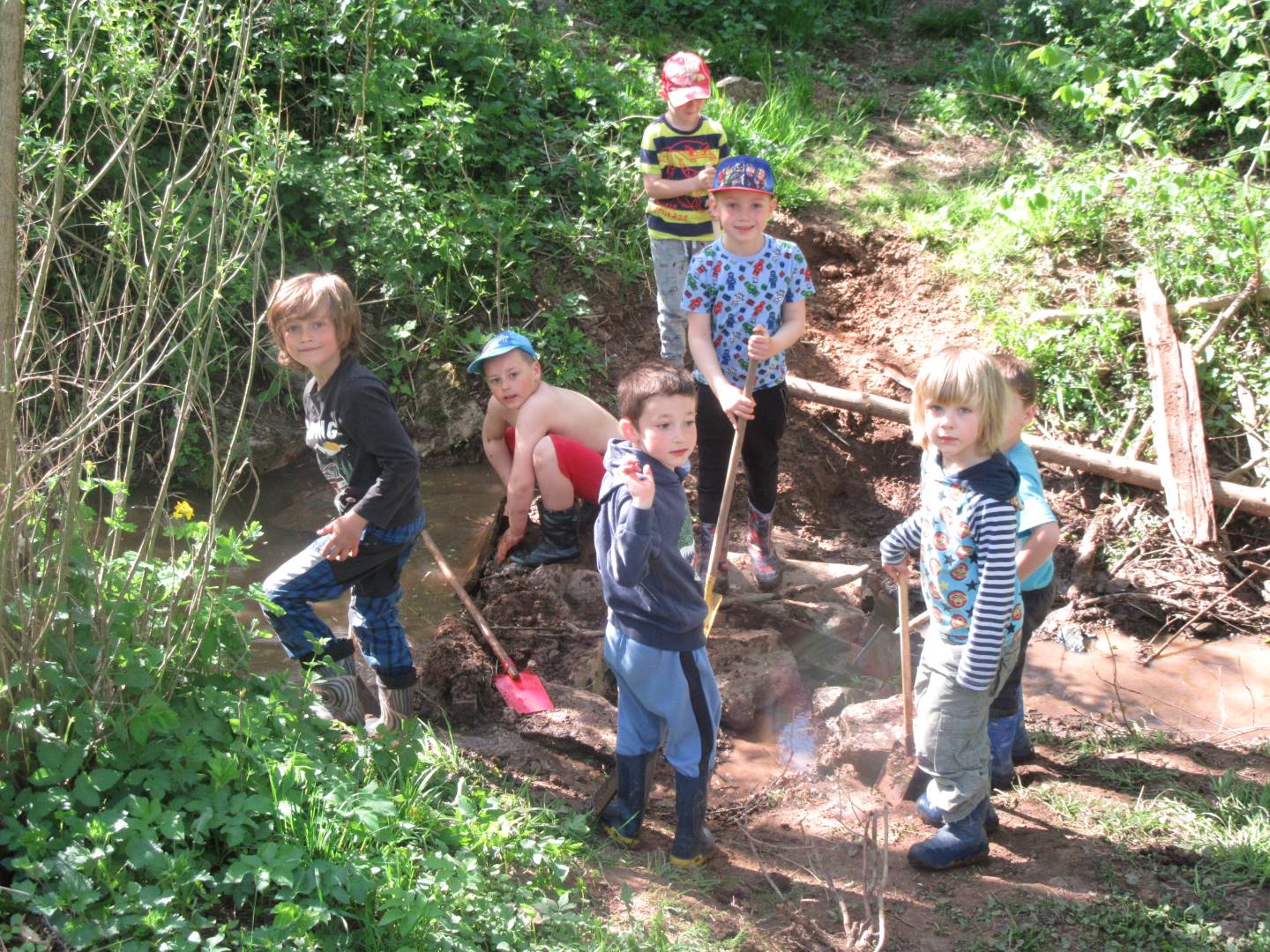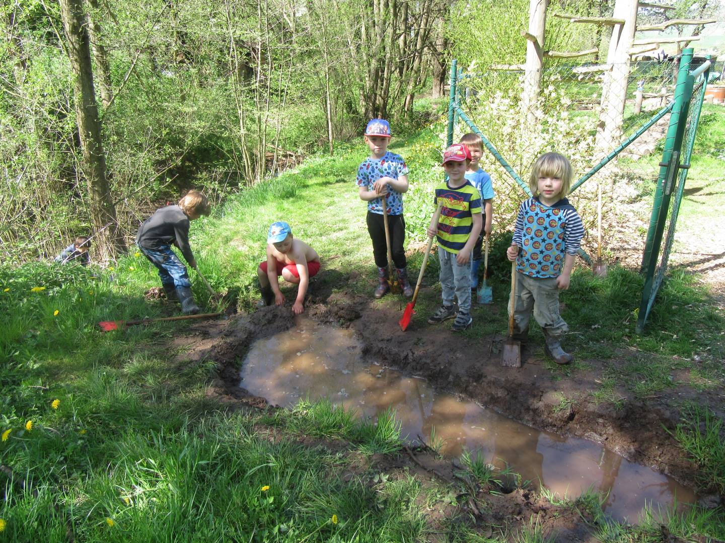 V okolí maringotky se dětem podařilo postavit spoustu hrází a vodních kaskád. Velikou radost nám přinesla nová houpací síť.