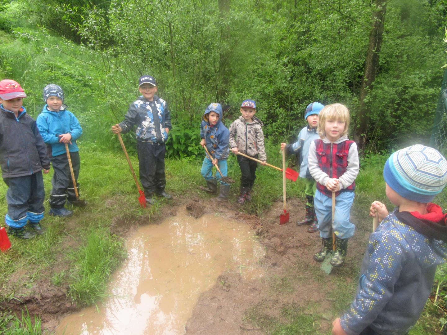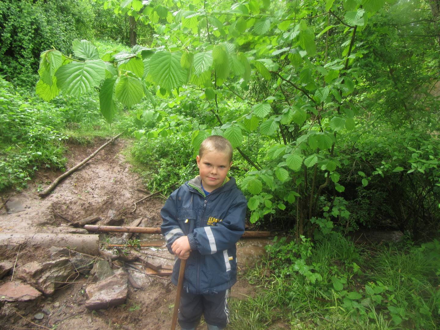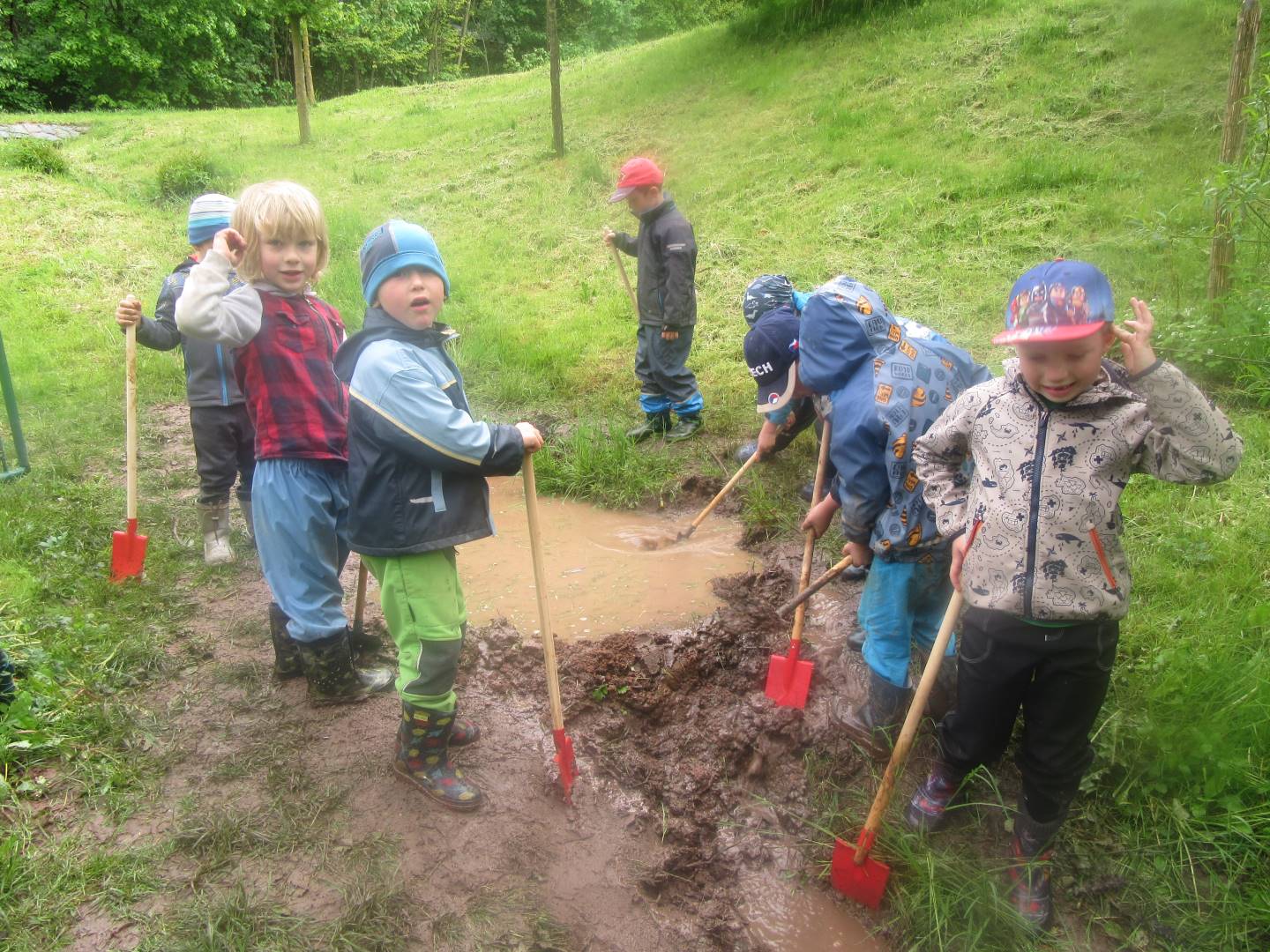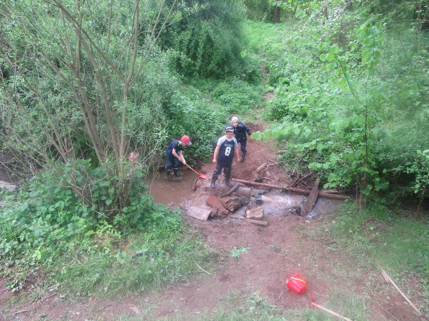 V okolí maringotky se dětem podařilo postavit spoustu hrází a vodních kaskád. Velikou radost nám přinesla nová houpací síť.