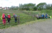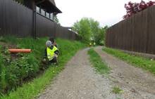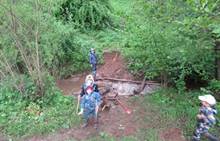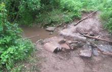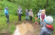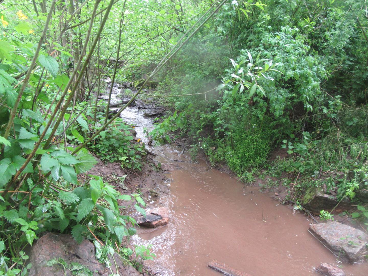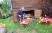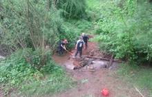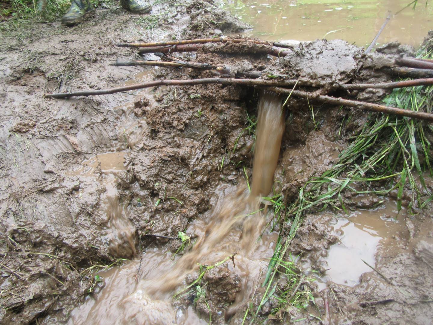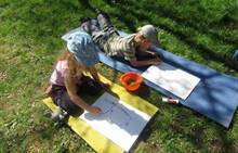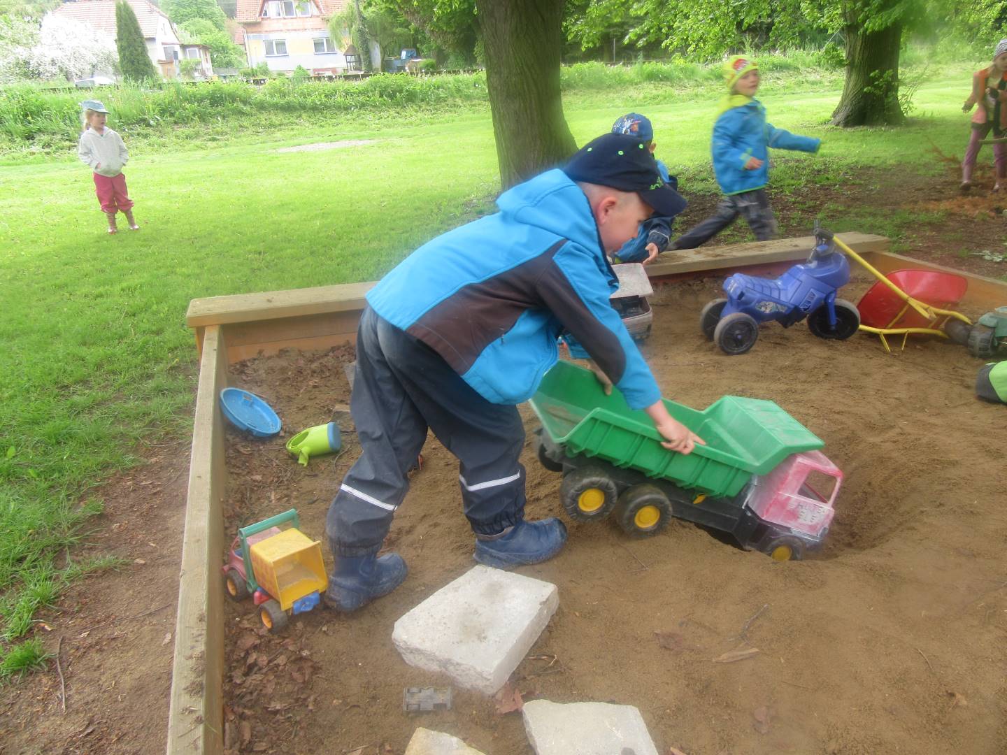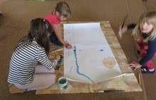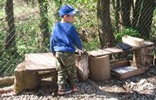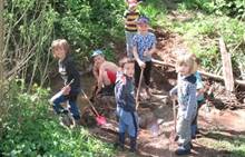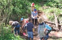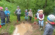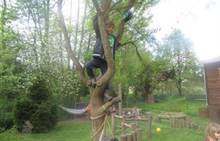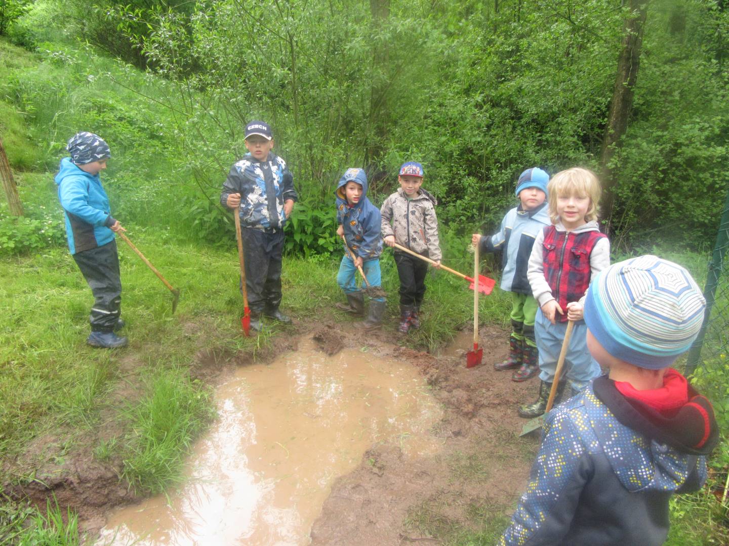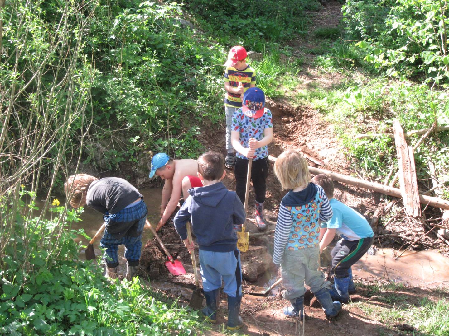 V okolí maringotky se dětem podařilo postavit spoustu hrází a vodních kaskád. Velikou radost nám přinesla nová houpací síť.