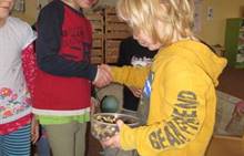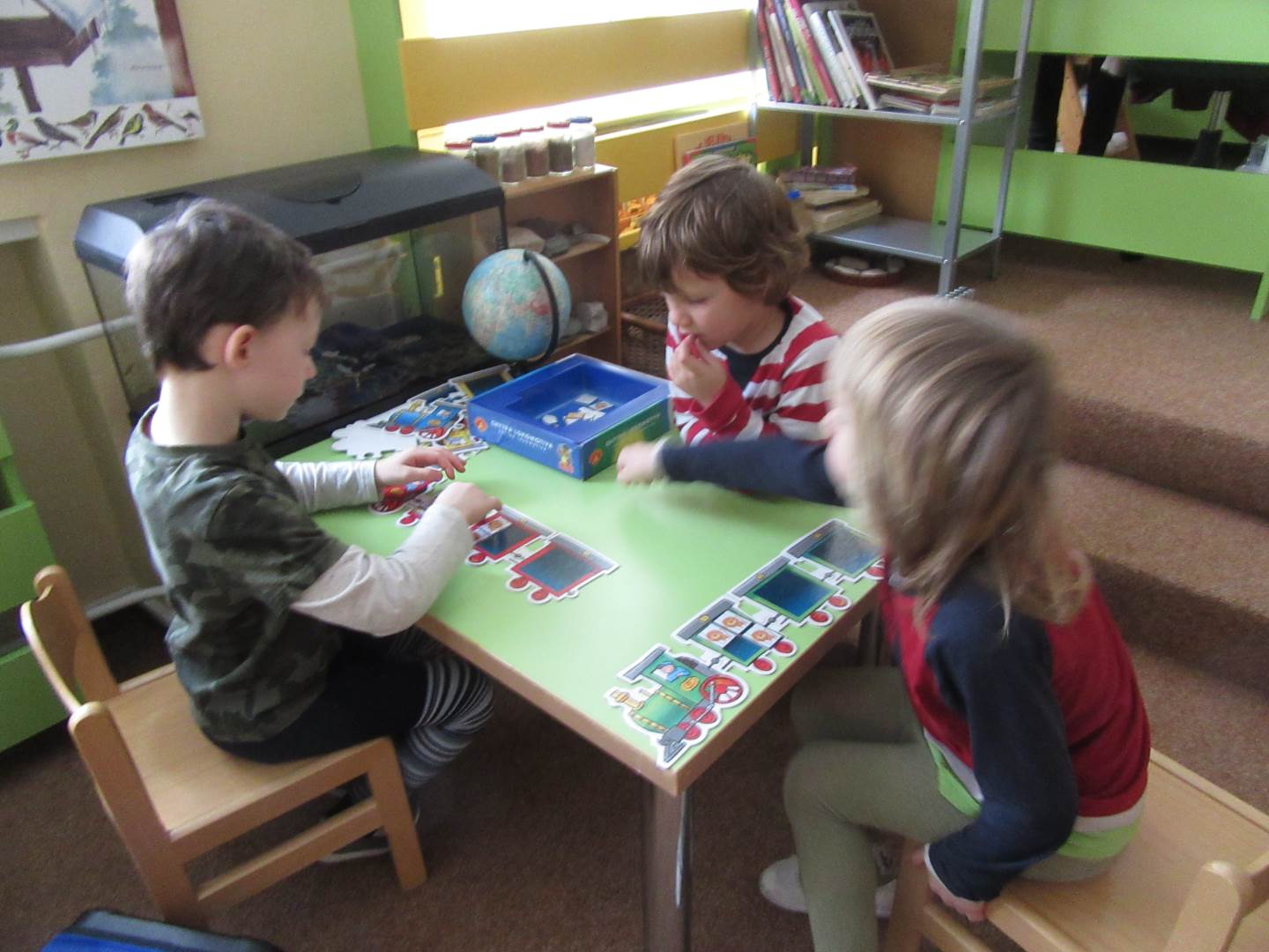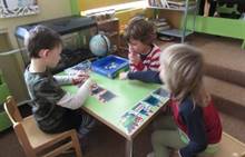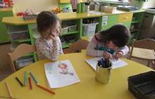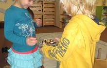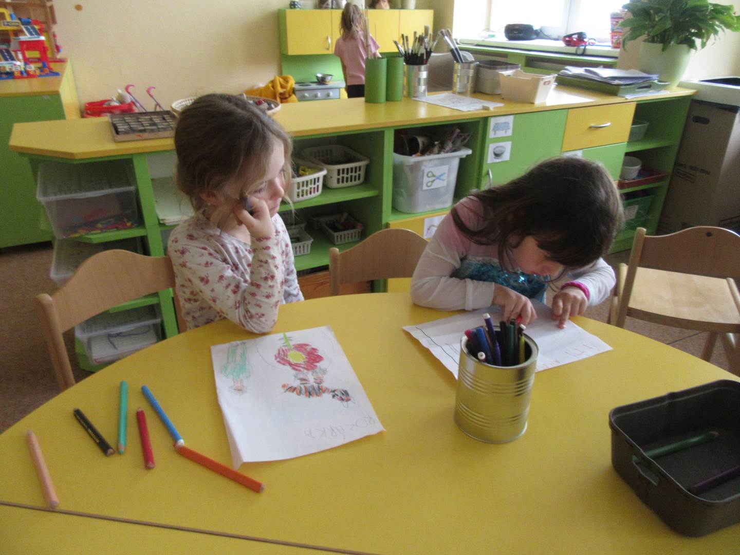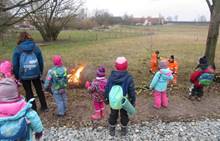 V úterý vedla naše cesta k maringotce, kde děti pozorovaly zmrzlou vodu v rybníku a v zahradním jezírku, kreslily si, hrály si v kuchyňce, v bunkru...