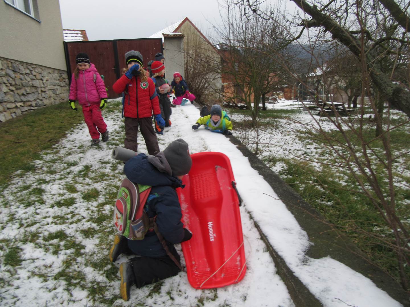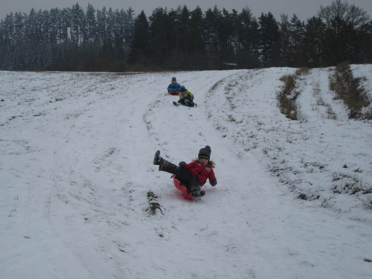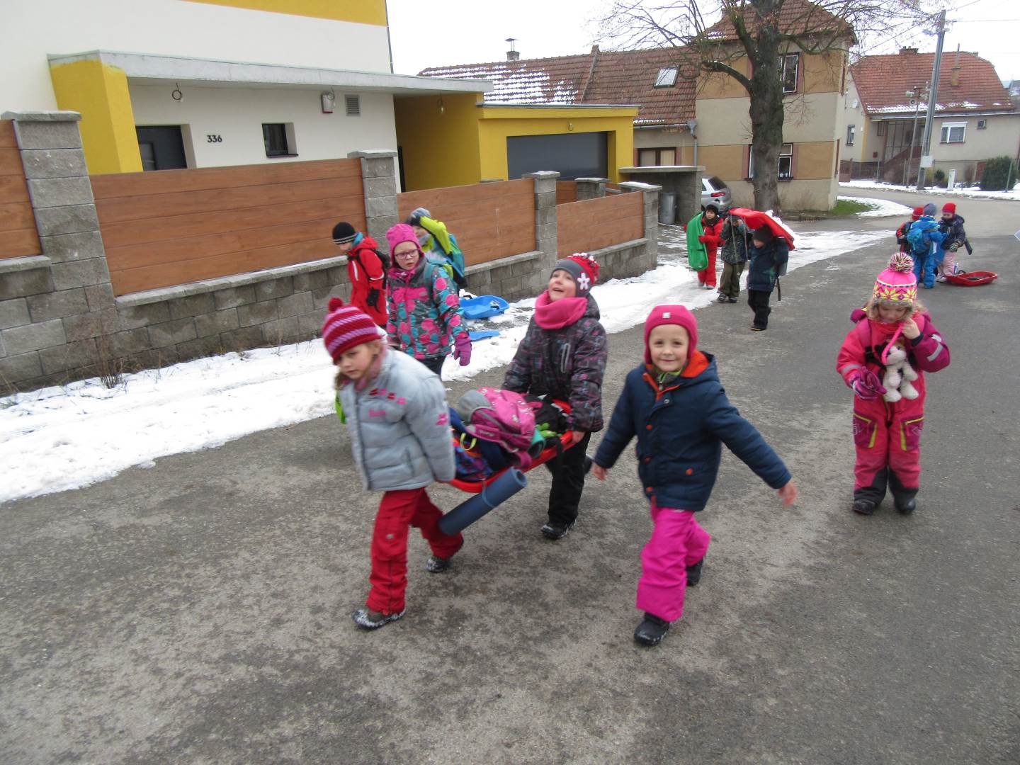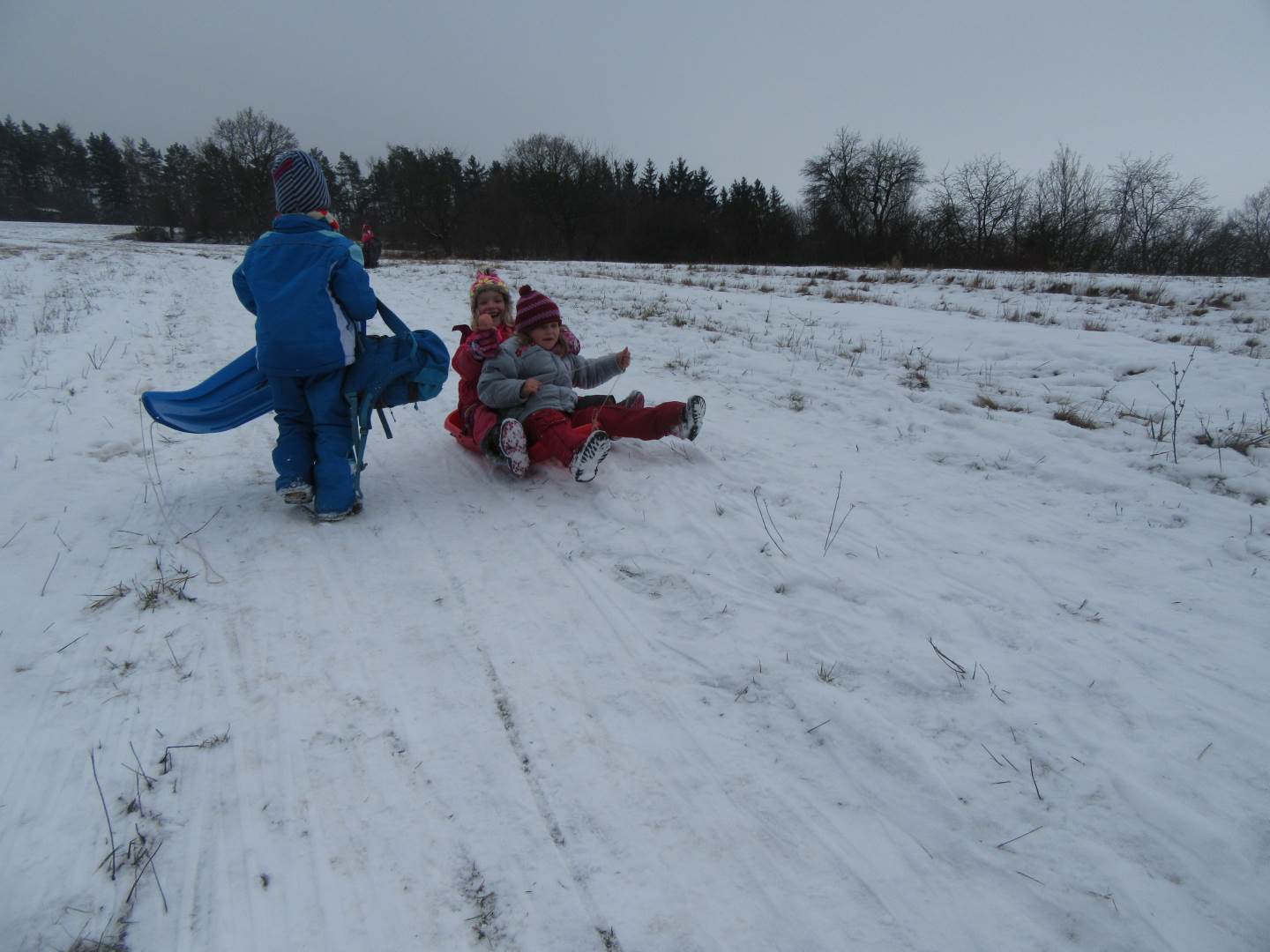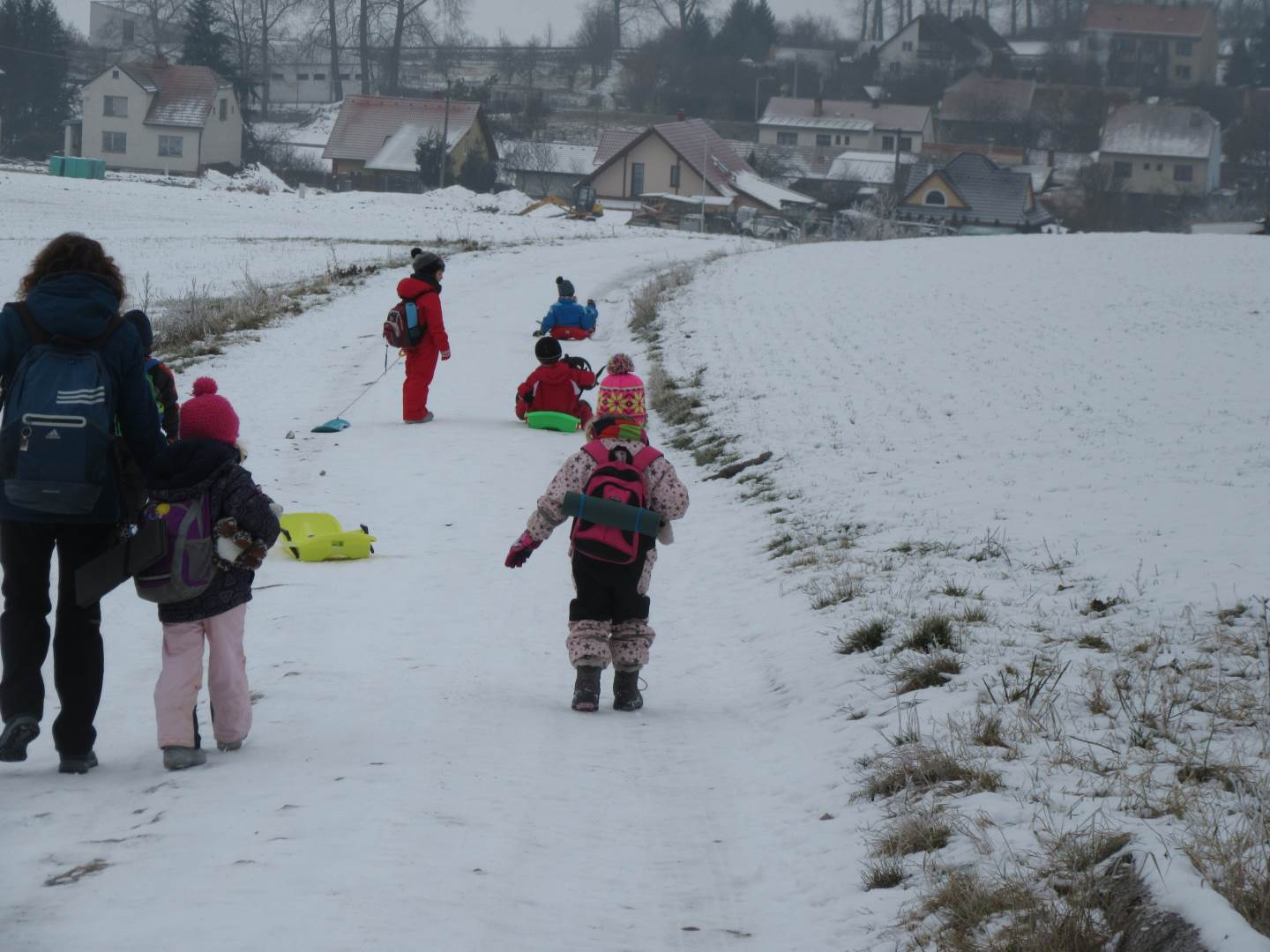 Tento týden jsme měli štestí na sníh, proto jsme vzali boby a lopaty a vydali se na kopec nad lesní školku. Cestou jsme si jako vždycky povídali pohádky, dávali si hádanky a zpívali si. Na kopci se děti nasvačily a poté začaly bobovat, shrabovat sníh a lopatovat. Náramně si to užily.