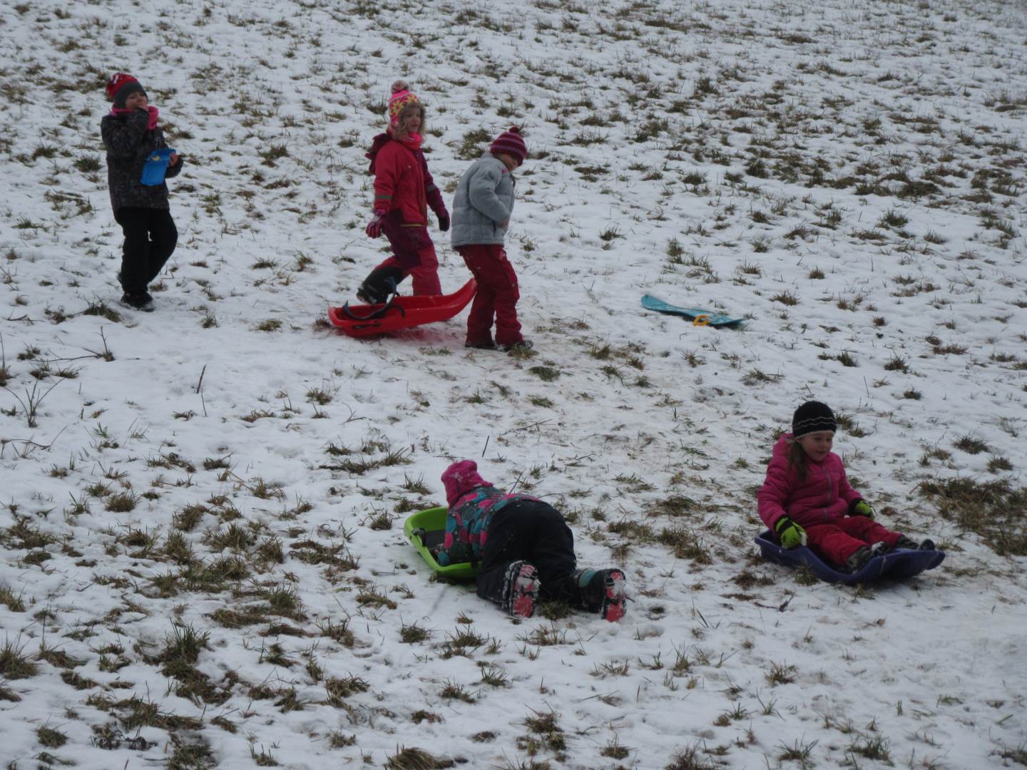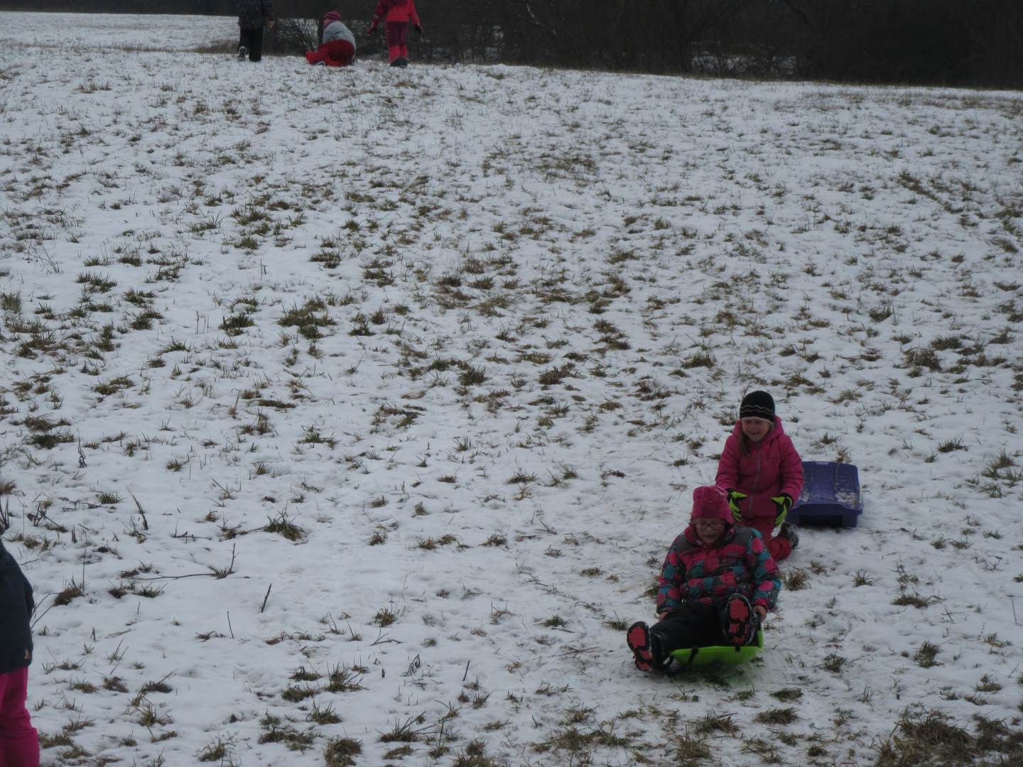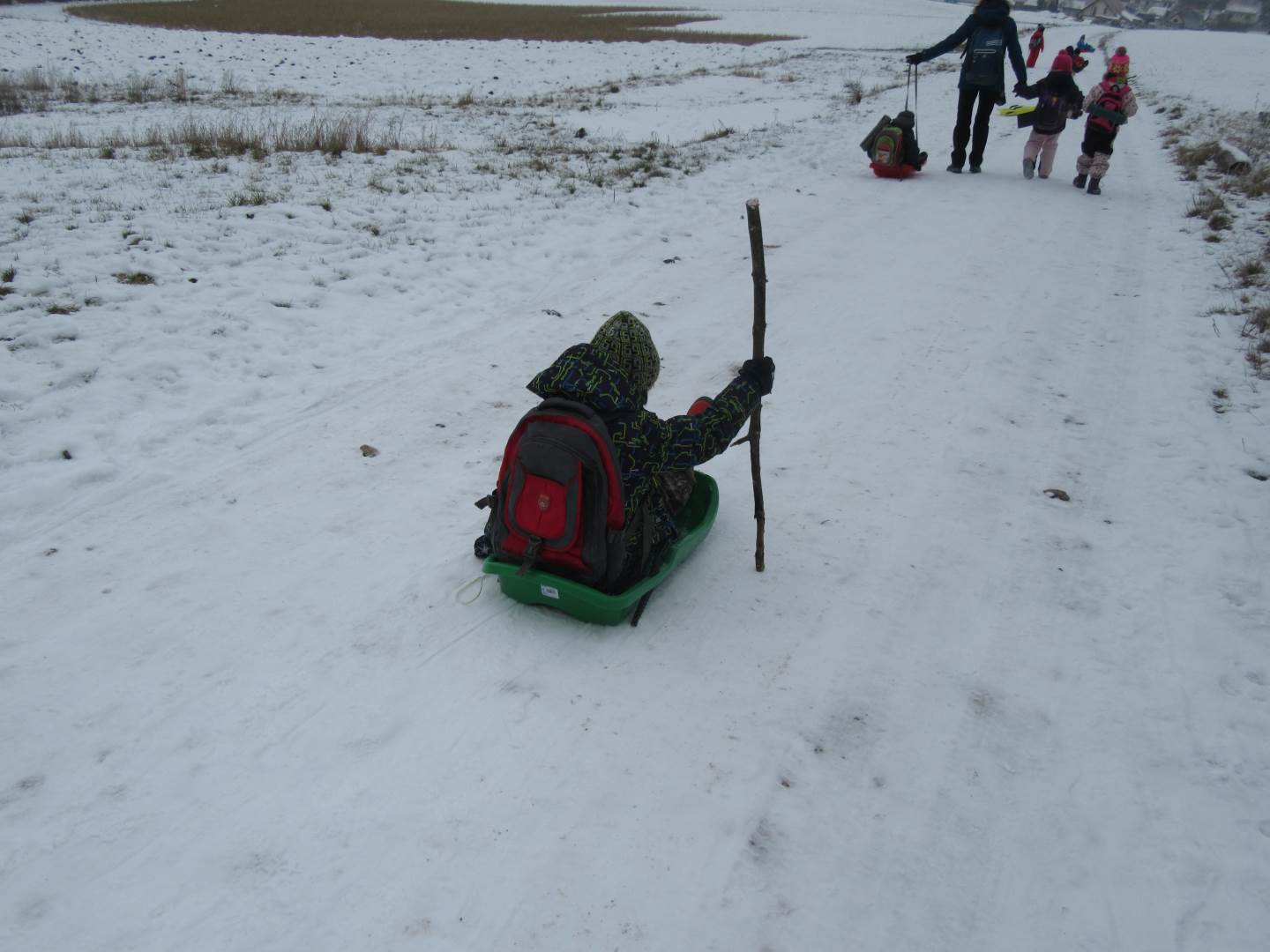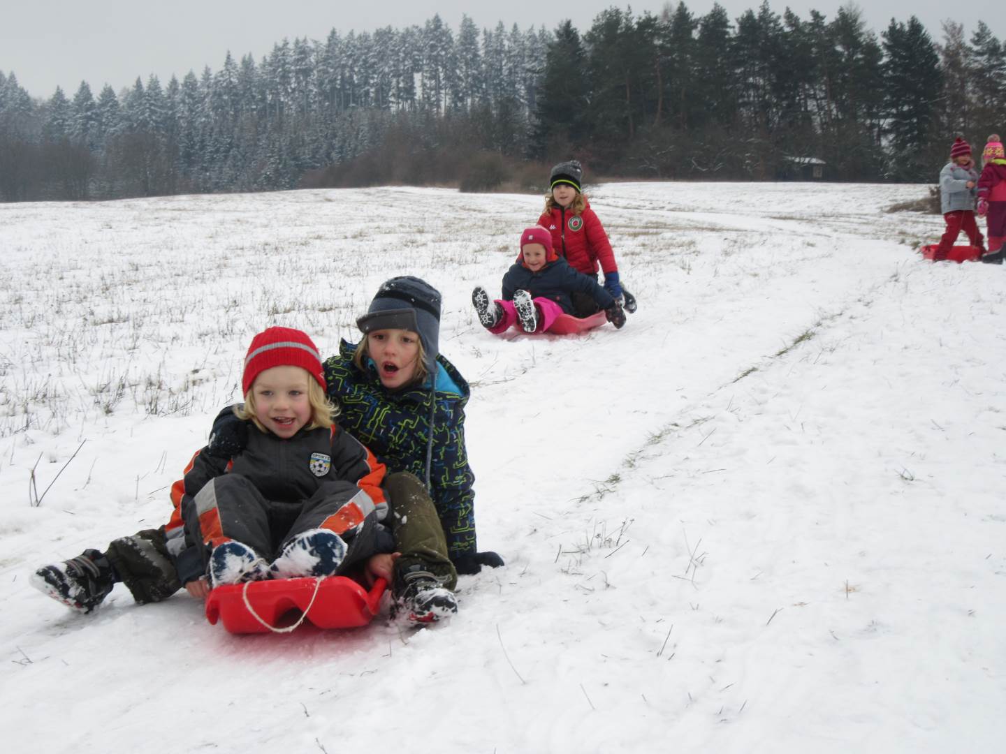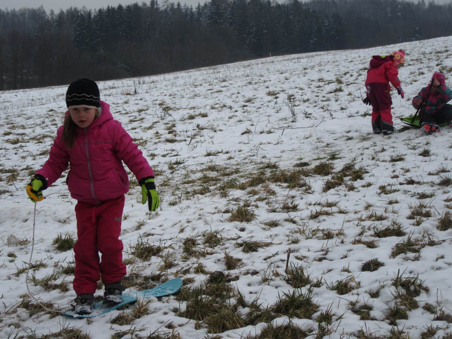 Tento týden jsme měli štestí na sníh, proto jsme vzali boby a lopaty a vydali se na kopec nad lesní školku. Cestou jsme si jako vždycky povídali pohádky, dávali si hádanky a zpívali si. Na kopci se děti nasvačily a poté začaly bobovat, shrabovat sníh a lopatovat. Náramně si to užily.