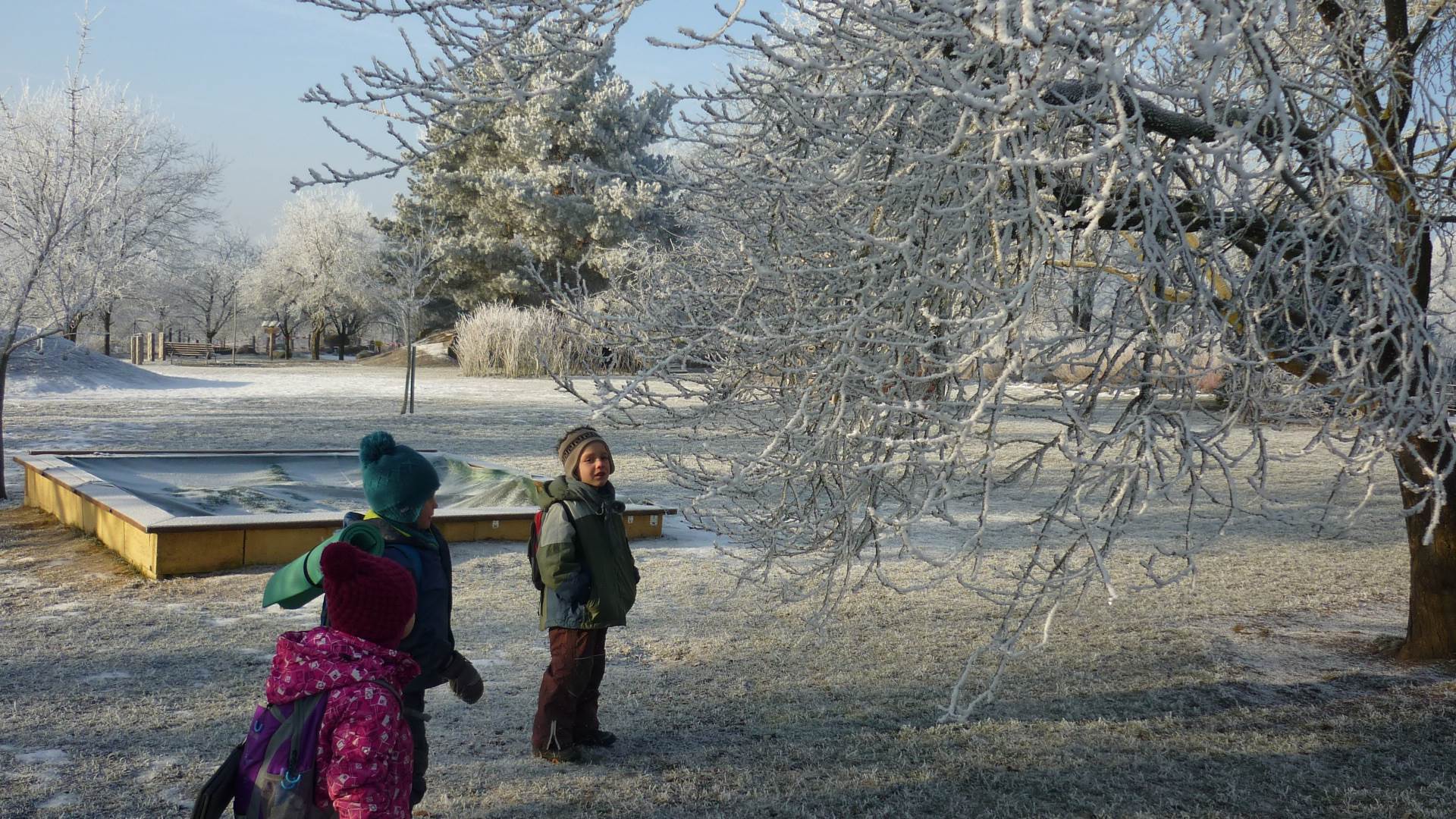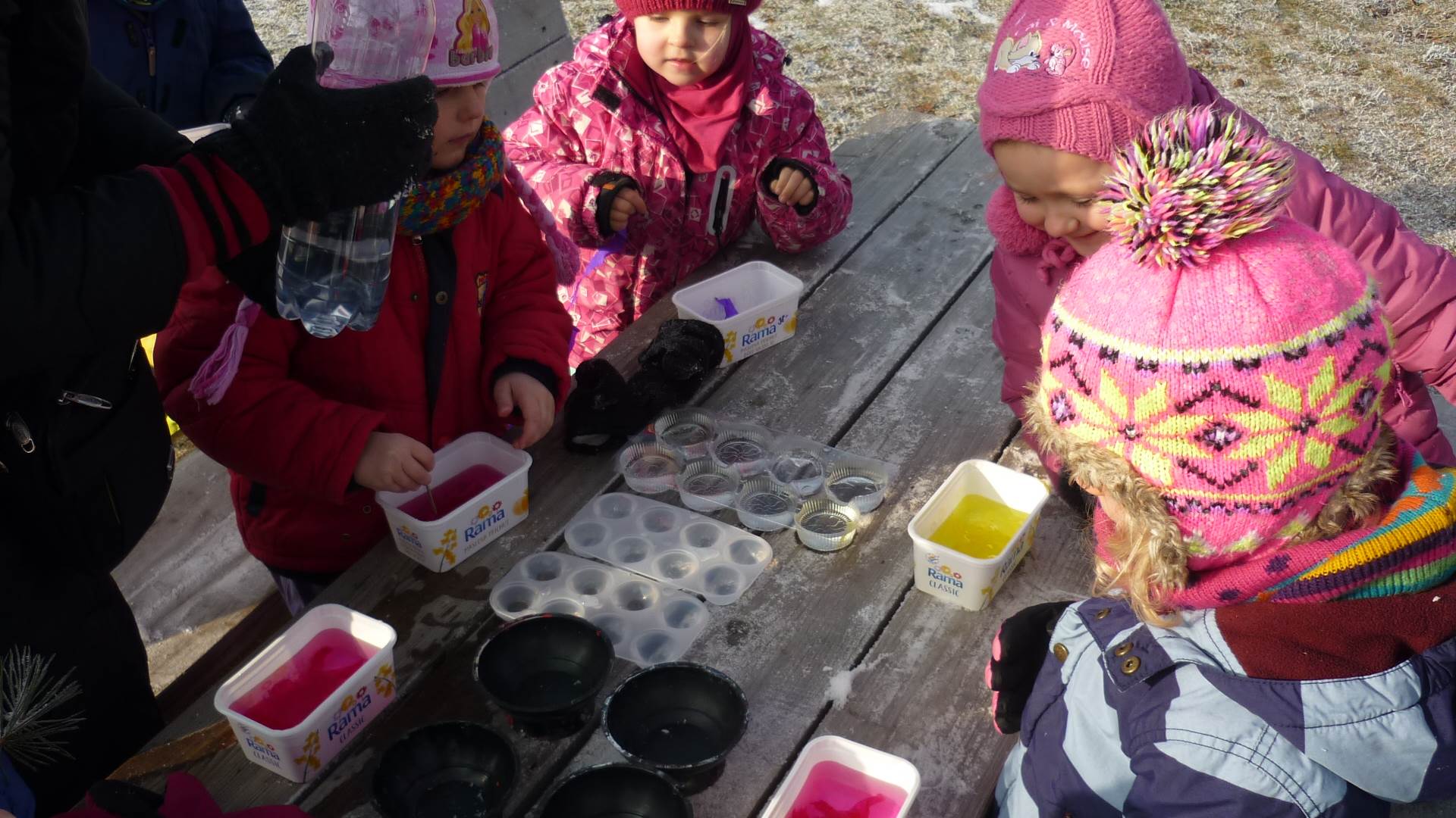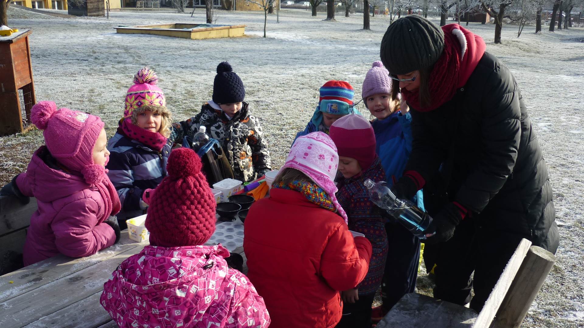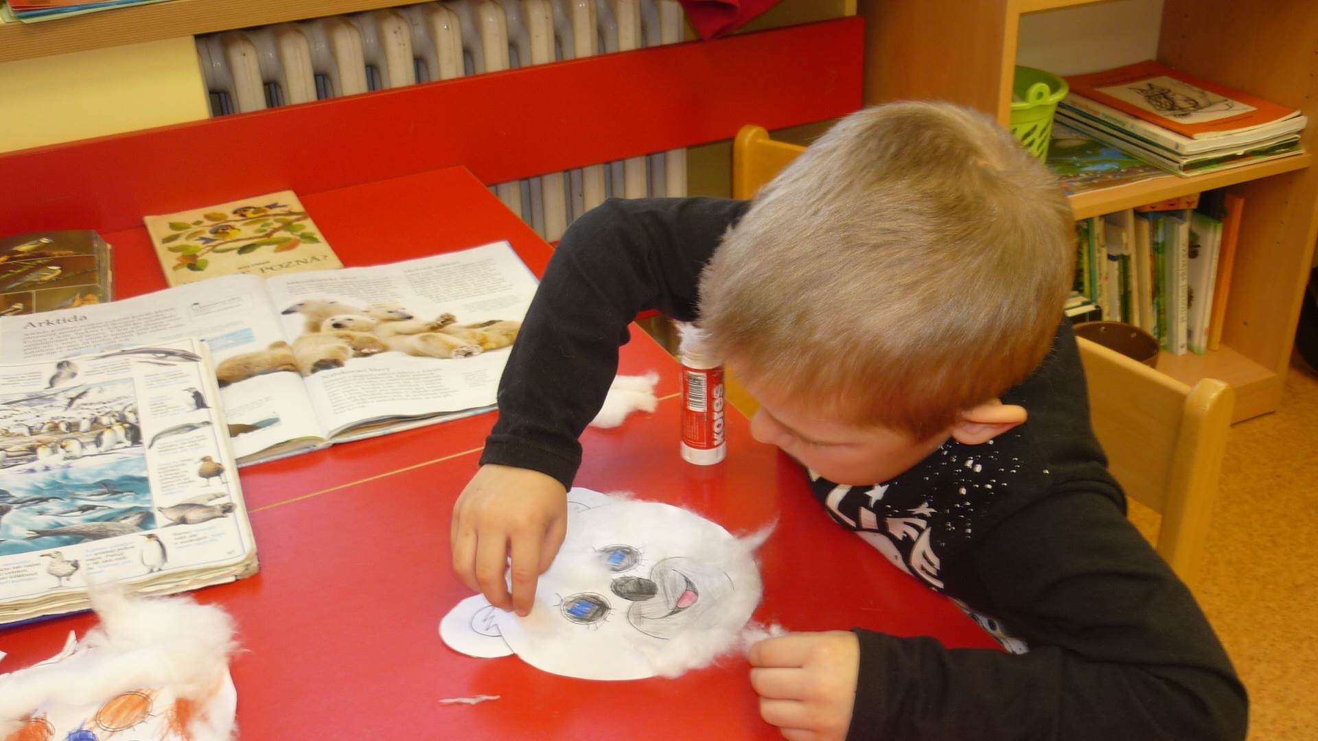 Tento týden je ve znamení ledu a sněhu a hlavně mrazu. Povídáme si o Antarktidě a Arktidě a venku to vypadá stejně. Akorát tu nemáme tučňáky, tuleně, lední medvědy a eskymáky. Tak si ty medvědy a tučňáky alespoň vyrobíme. Venku je začátkem týdne taková zima, že chodíme ven později a stejně je to pro některé děti velice náročné. Snažíme se zahřát pohybem, vydatnou svačinkou a u kamen v maringotce. Vyrábíme barevné ledové kostky a hrjeme si s nimi. Obdivujeme krásu jinovatky a snažíme se ji zachytit na papíře. V úterý se zahříváme v kině při animovaném příběhu o žabáku Gordonovy a myšce Paddy, i když i on se odehrává částečně v zimě. Ve čtvrtek dovádíme na zamrzlém rybníce. Už nás unese! Kloužeme se, odhrnujeme sníh, malujeme do sněhu a obdivujeme ledové otisky listů. Led je místy tak průzračný, že vidíme, co je pod hladinou. V pátek opět slavíme,ale tentokrát u Berušek. Jsme pozvaní na dort! Venku si pak užíváme sněhové nadílky.