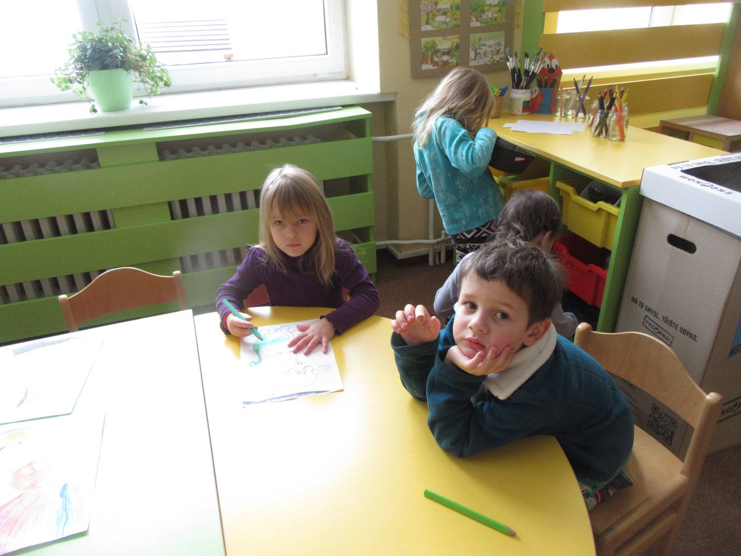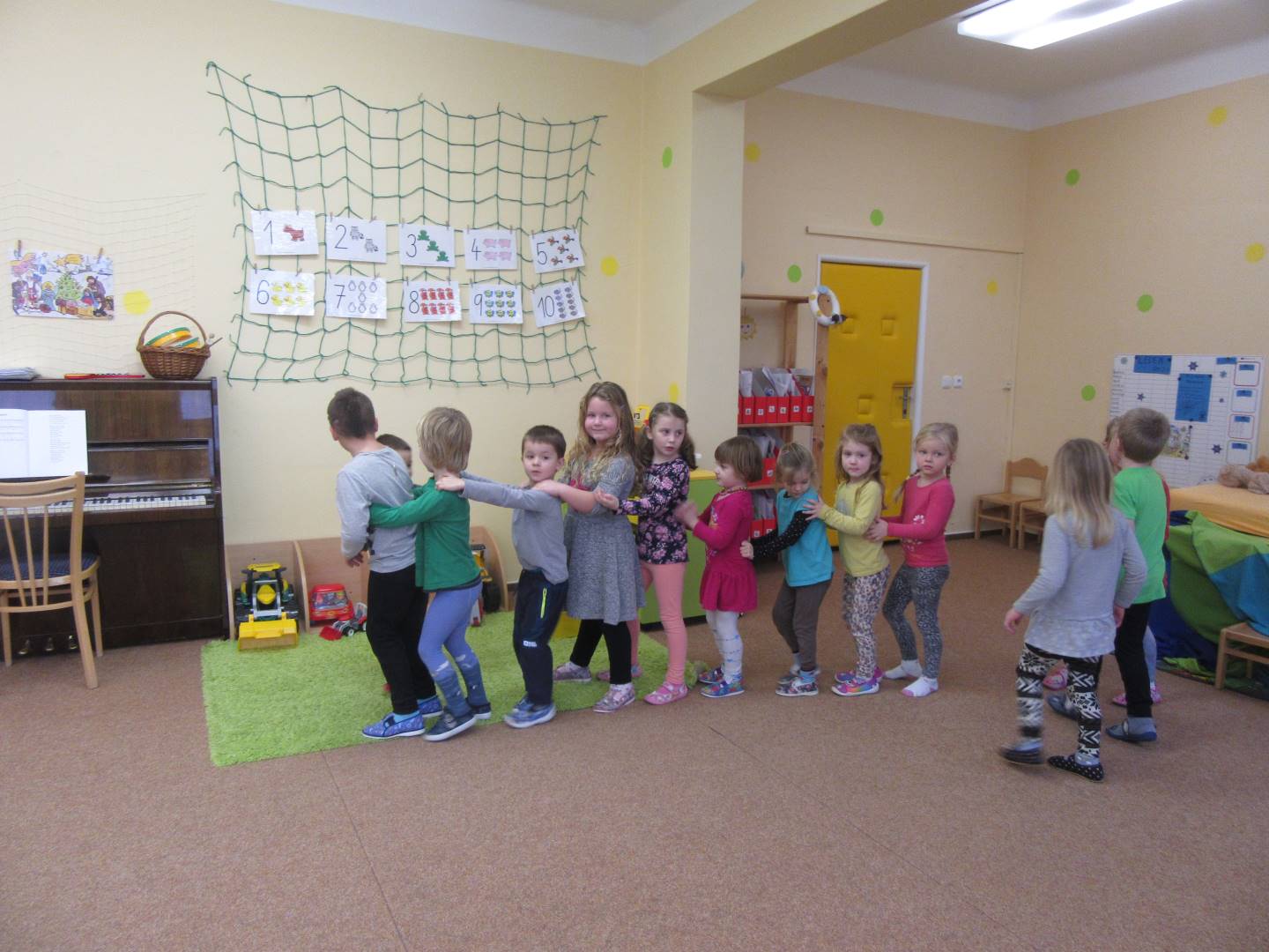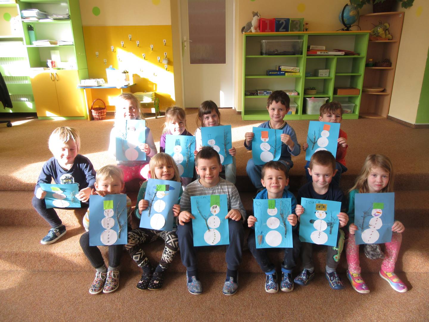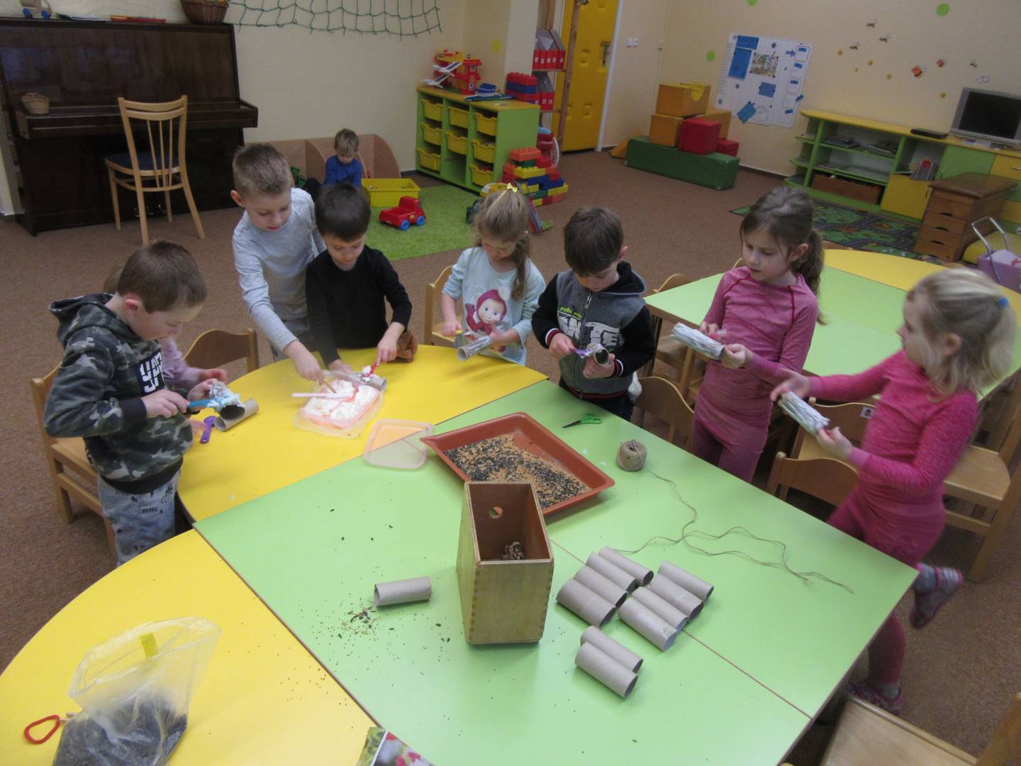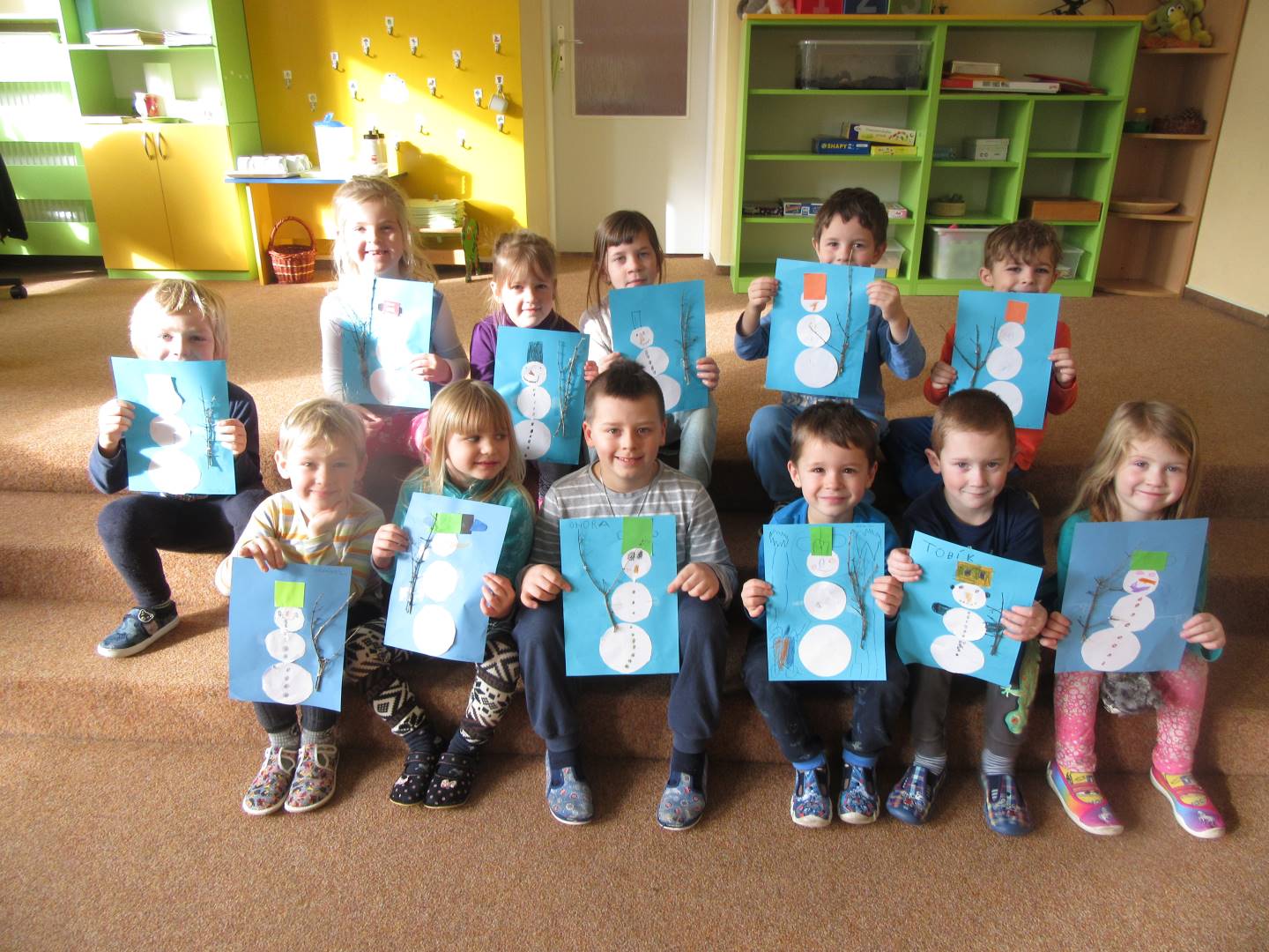 Po Vánocích děti přivítala nově vyzdobená třída. Zelená a žlutá kolečka zaplnily prázdnější zdi třídy. Snažili jsme se děti seznámit s proměnami zimní přírody a vytvářtet u nich kladný vztah k učení. Kromě básniček, písniček a pracovních listů si děti vyrobily první písmeno svého jména ze samotvrdnoucí hmoty. U dětí se nám podařila rozvinout jemná motorika a tím pádem i správné držení tužky. Procvičovali jsme barvy, tvary a pojmy vpravo a vlevo. Děti pracovaly s různými materiály - pastelkami, vodovkami, temperami, vlnou, vatou a dokonce si vyrobily barevný led. Nezapomněli jsme ani na ptáčky a děti vyrobily a rozvěsily po cestě do maringotky krmítka z ruliček do toaletního papíru za pomoci sádla a semínek.