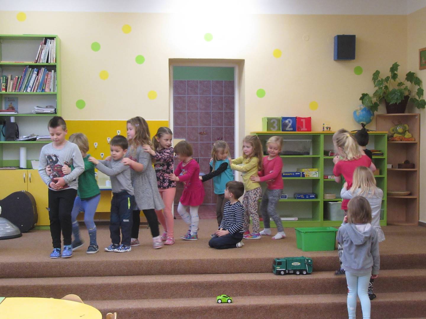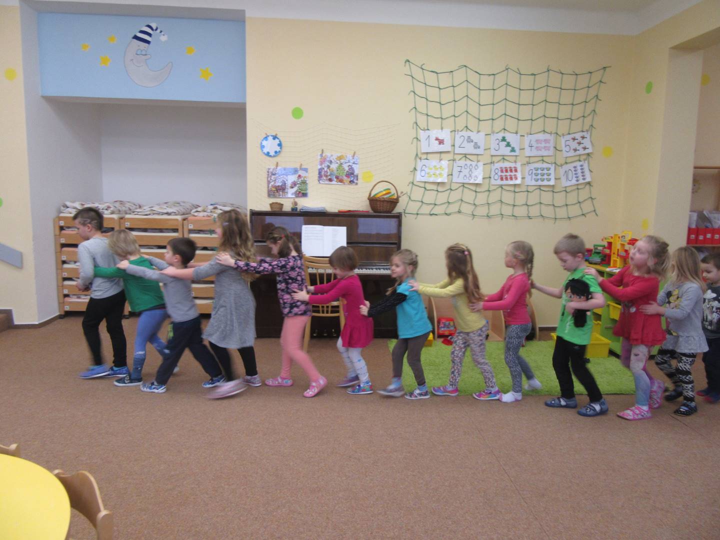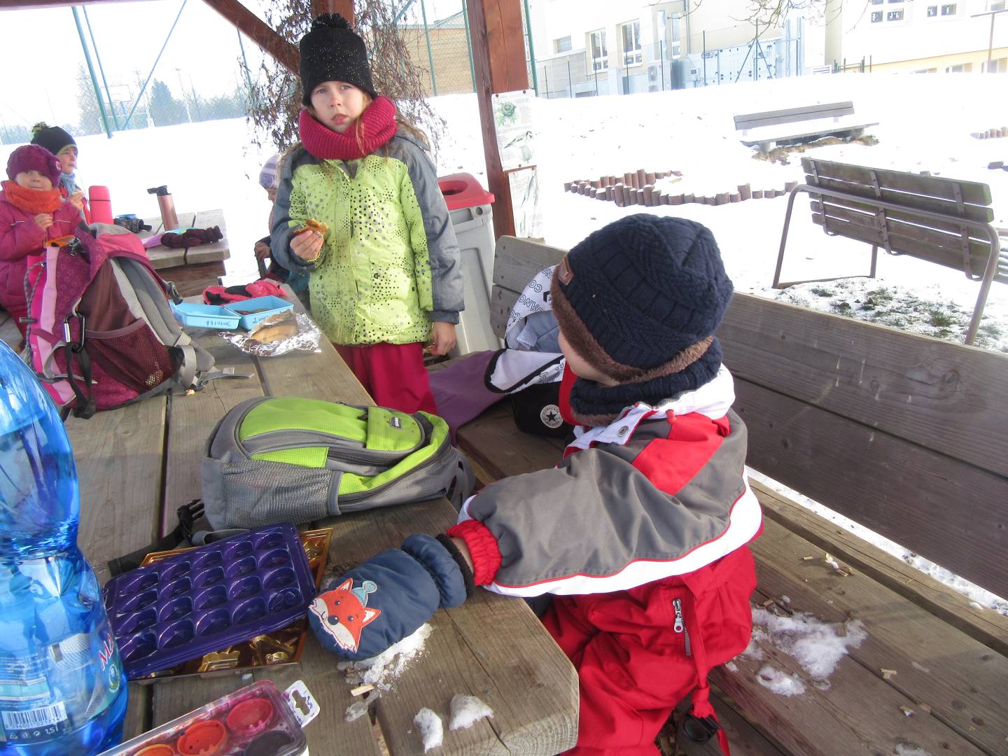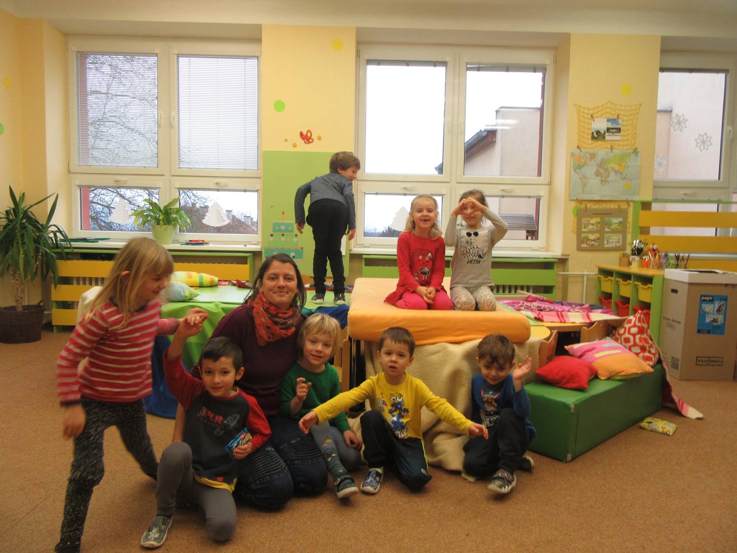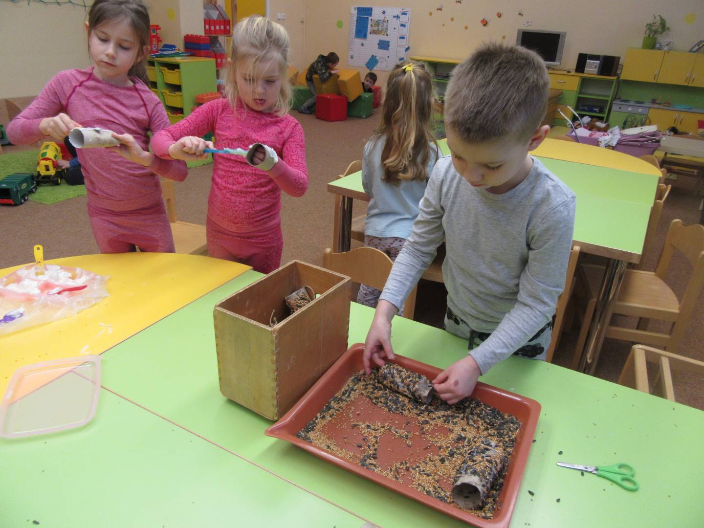 Po Vánocích děti přivítala nově vyzdobená třída. Zelená a žlutá kolečka zaplnily prázdnější zdi třídy. Snažili jsme se děti seznámit s proměnami zimní přírody a vytvářtet u nich kladný vztah k učení. Kromě básniček, písniček a pracovních listů si děti vyrobily první písmeno svého jména ze samotvrdnoucí hmoty. U dětí se nám podařila rozvinout jemná motorika a tím pádem i správné držení tužky. Procvičovali jsme barvy, tvary a pojmy vpravo a vlevo. Děti pracovaly s různými materiály - pastelkami, vodovkami, temperami, vlnou, vatou a dokonce si vyrobily barevný led. Nezapomněli jsme ani na ptáčky a děti vyrobily a rozvěsily po cestě do maringotky krmítka z ruliček do toaletního papíru za pomoci sádla a semínek.