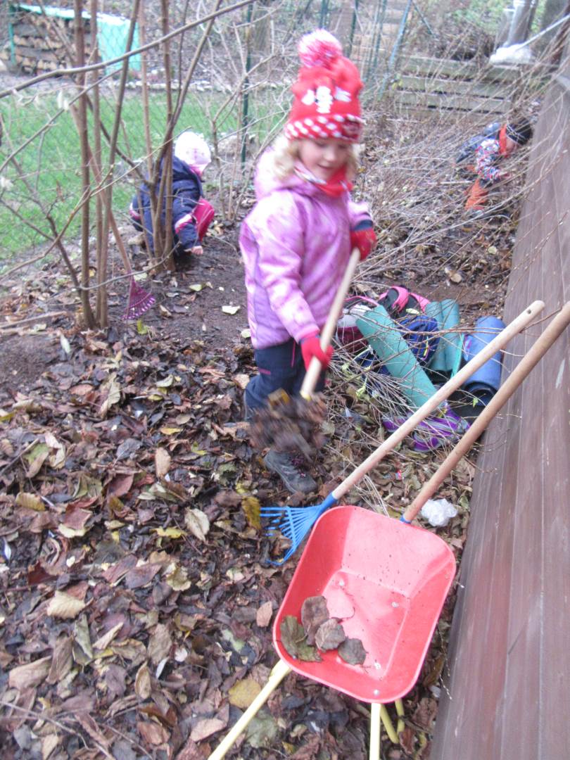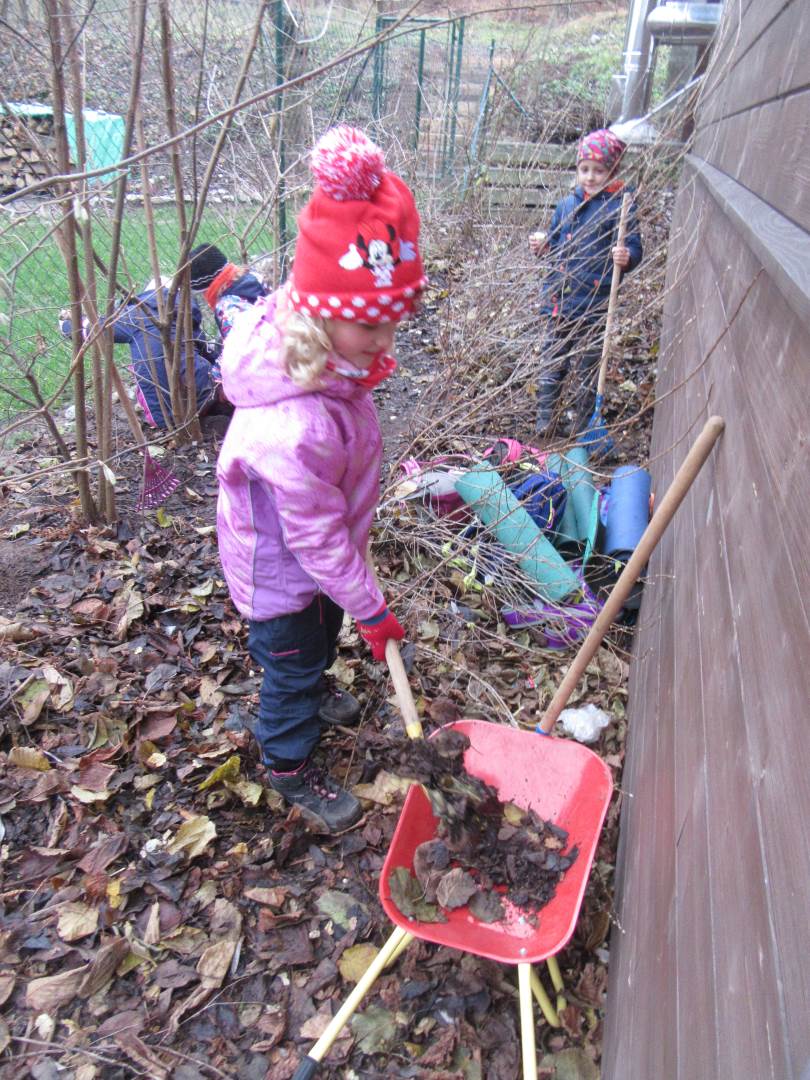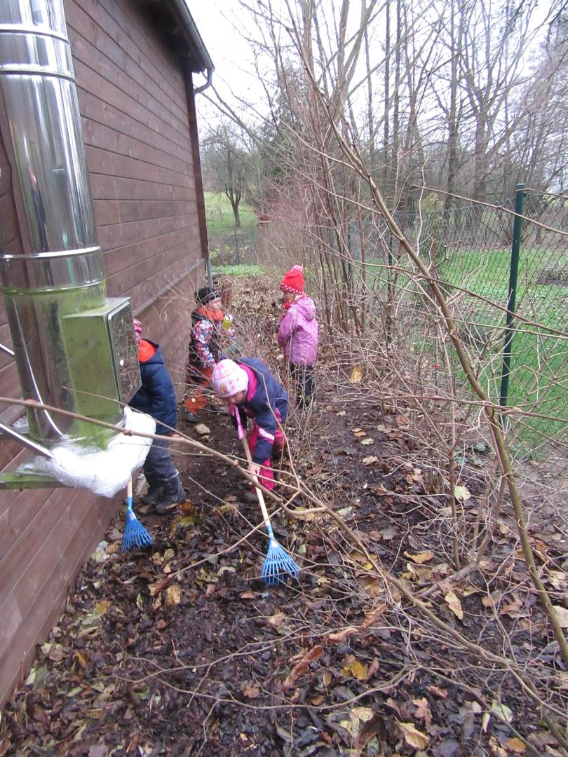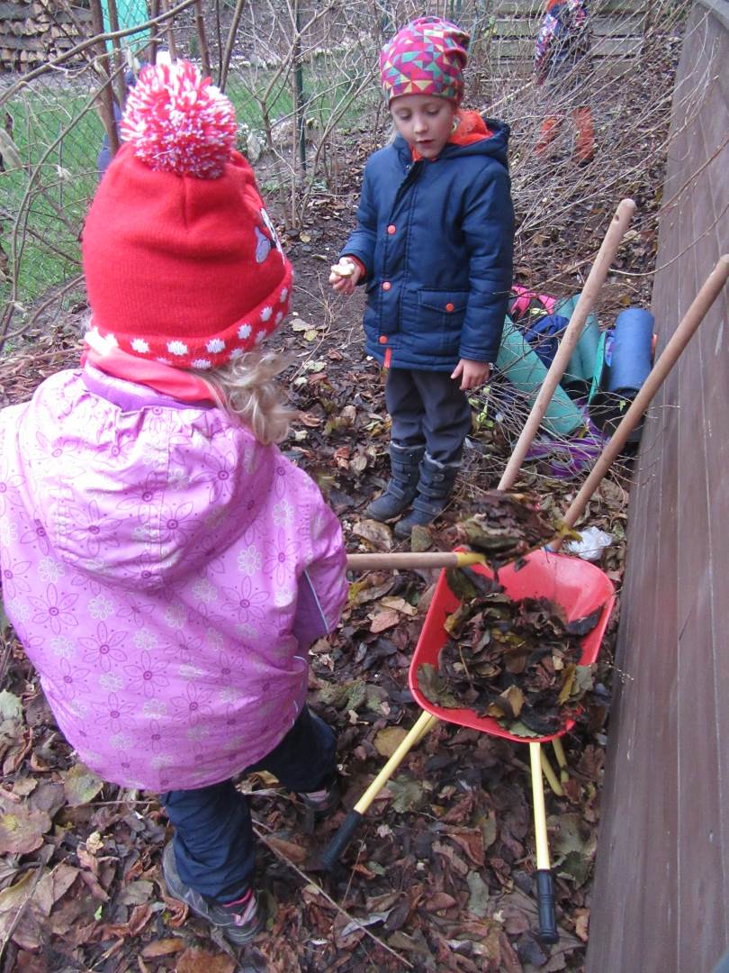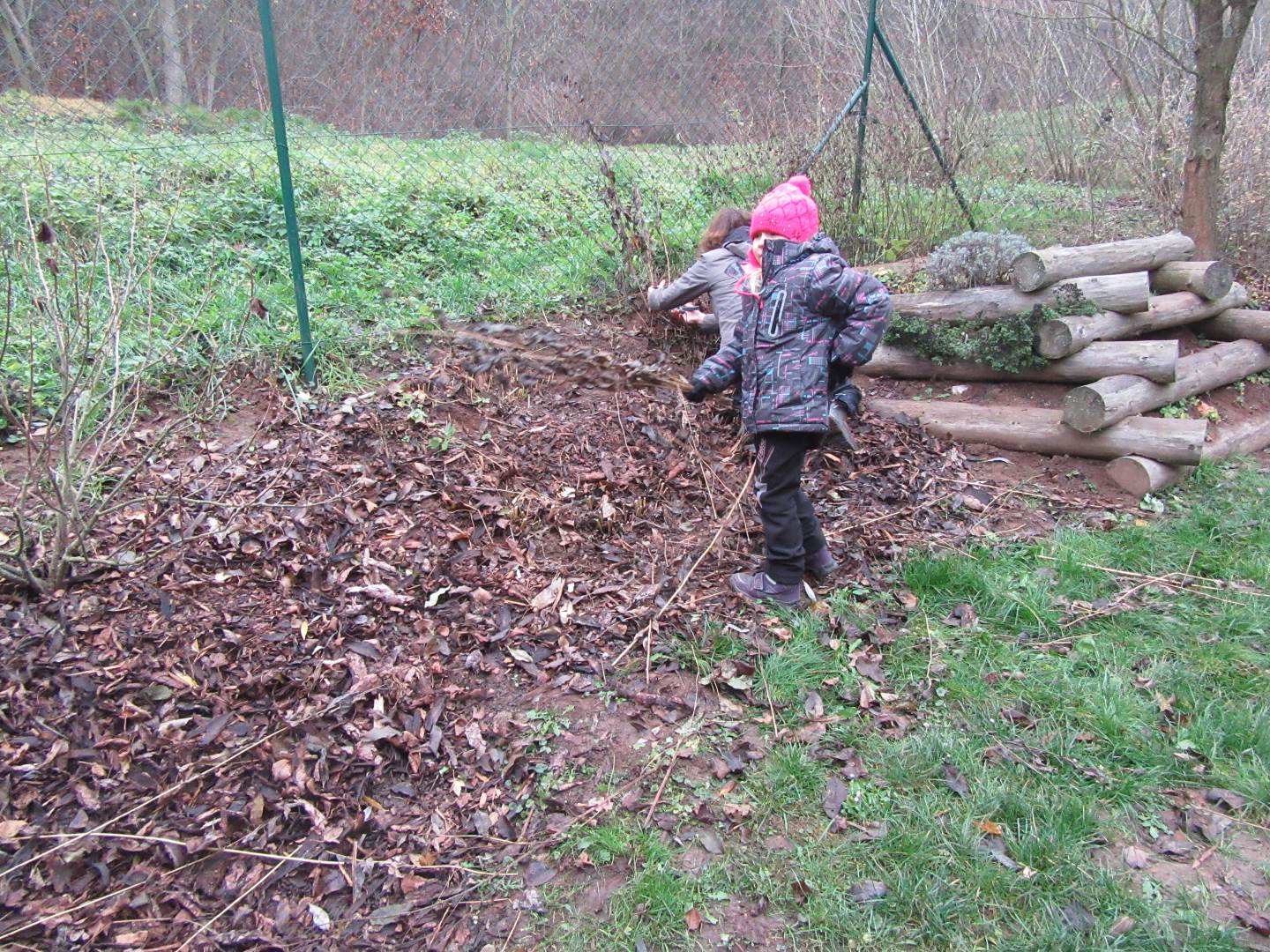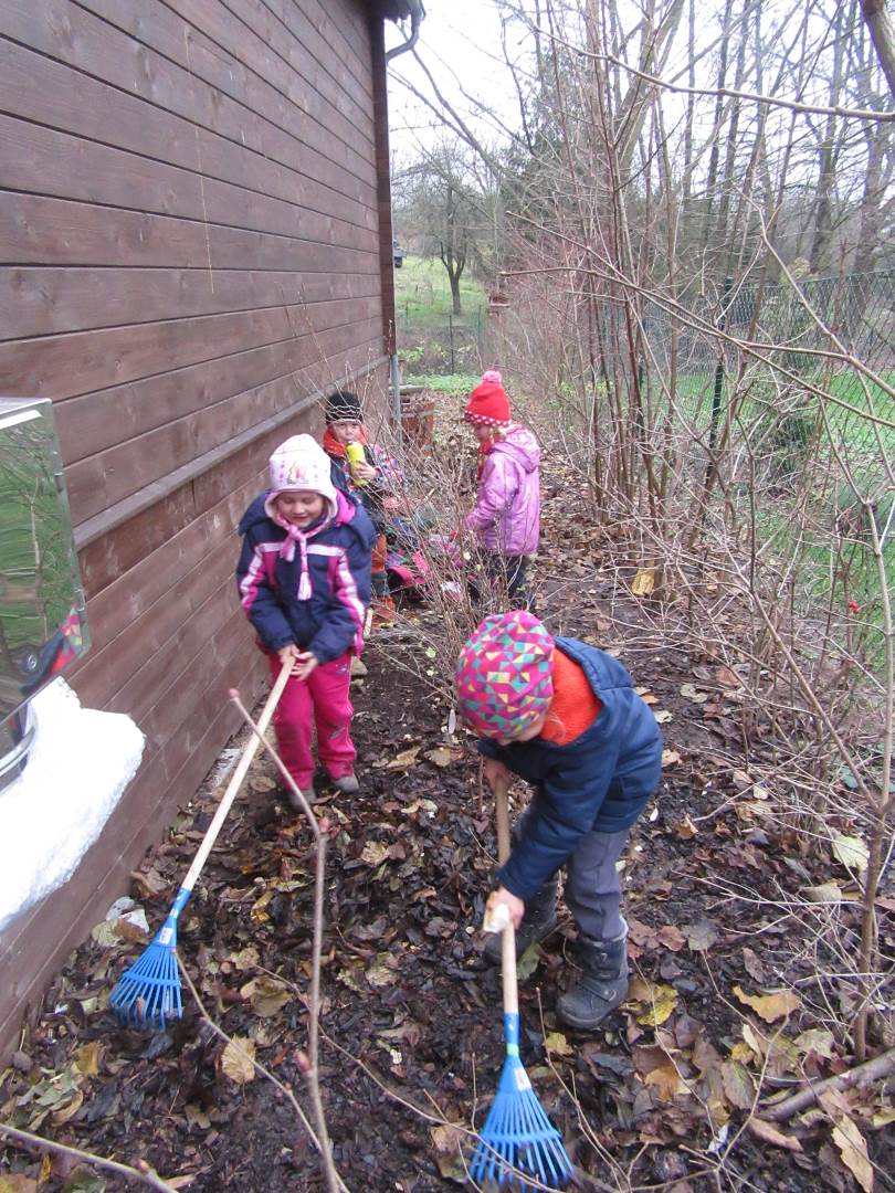 V úterý a ve středu jsme u maringotky udělali mnoho práce. Zryli jsme záhonek, ostříhali keře, shrabali listí. Za odměnu jsme si zahráli zvířecí pexeso. Cestou jsme si vyprávěli pohádky, dávali hádanky a zpívali si. Ve školce si děti vykreslily veverku a pod ni nalepily list.