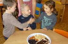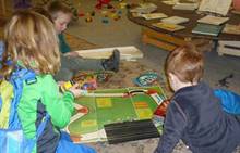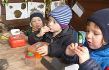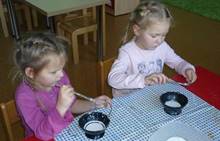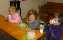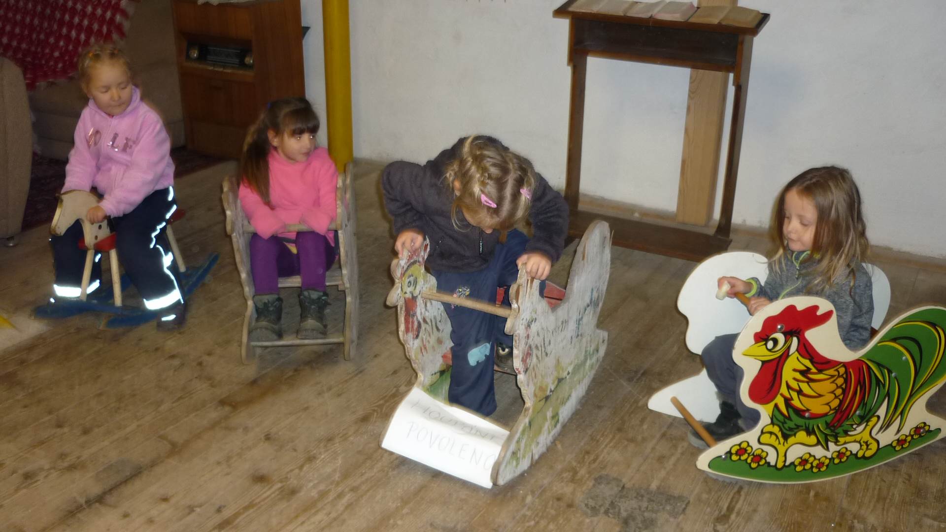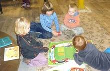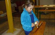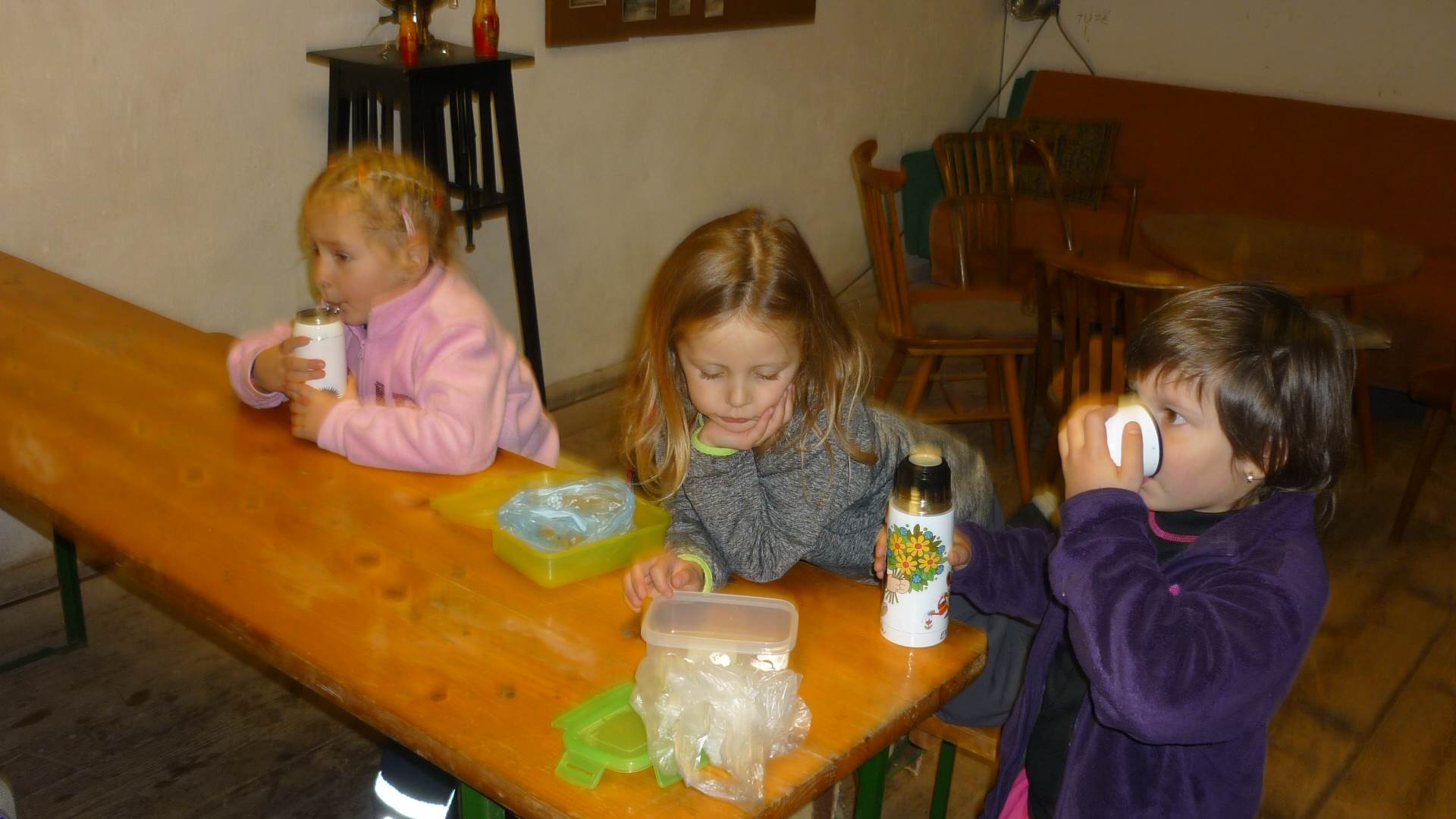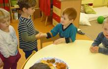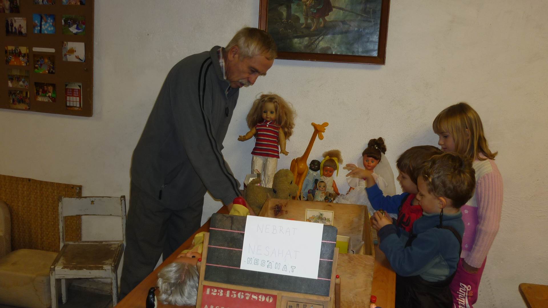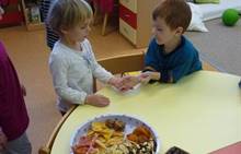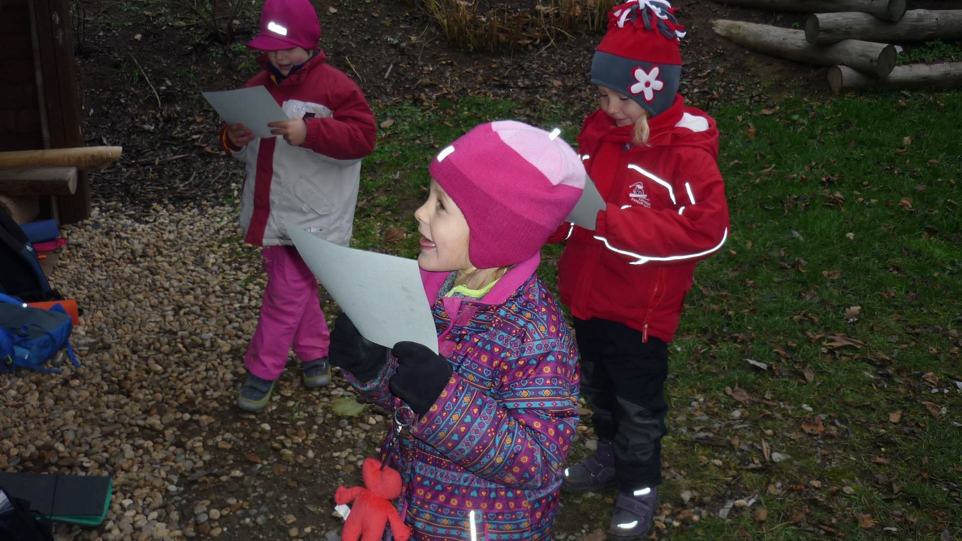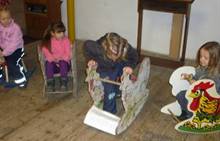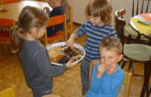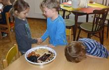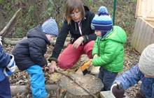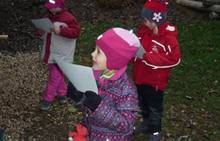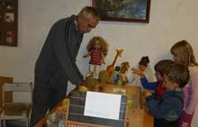 Poslední listopadový týden jsme pozvaní na farní "sýpku" na tzv. Retrovýstavu. Najdeme tu nejen historické hračky, ale třeba i celý obývací pokoj a spoustu věcí k běžnému užívání. V lesním zázemí si každý najde činnost, která je mu blízká. Pracujeme s pilou, sekerou, lopatou či rýči. Povídáme si o ptácích a zvířatech, jak se připravují na zimu, vytleskáváme slabiky ve slovech, hrajeme pexeso, dáváme si hádanky, pozorujeme námrazu a zkoumáme, jak tenký je led na rybníčku. Slavíme také Františkovi a Timonkovi narozeniny a jsme pozváni do Sluníček ke slavnostnímu pasování prvňáčků do řad čtenářů. Umí už všechna písmenka, a tak dostávají svůj první Slabikář. Už se těšíme, až nám budou číst před spaním pohádky!