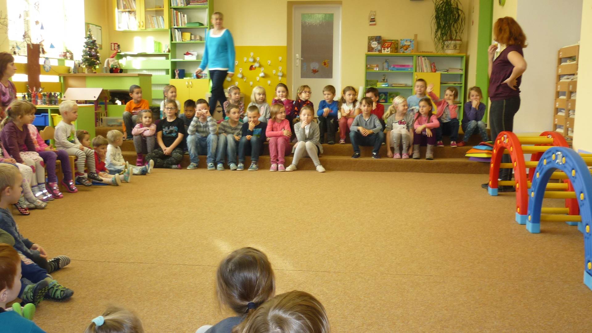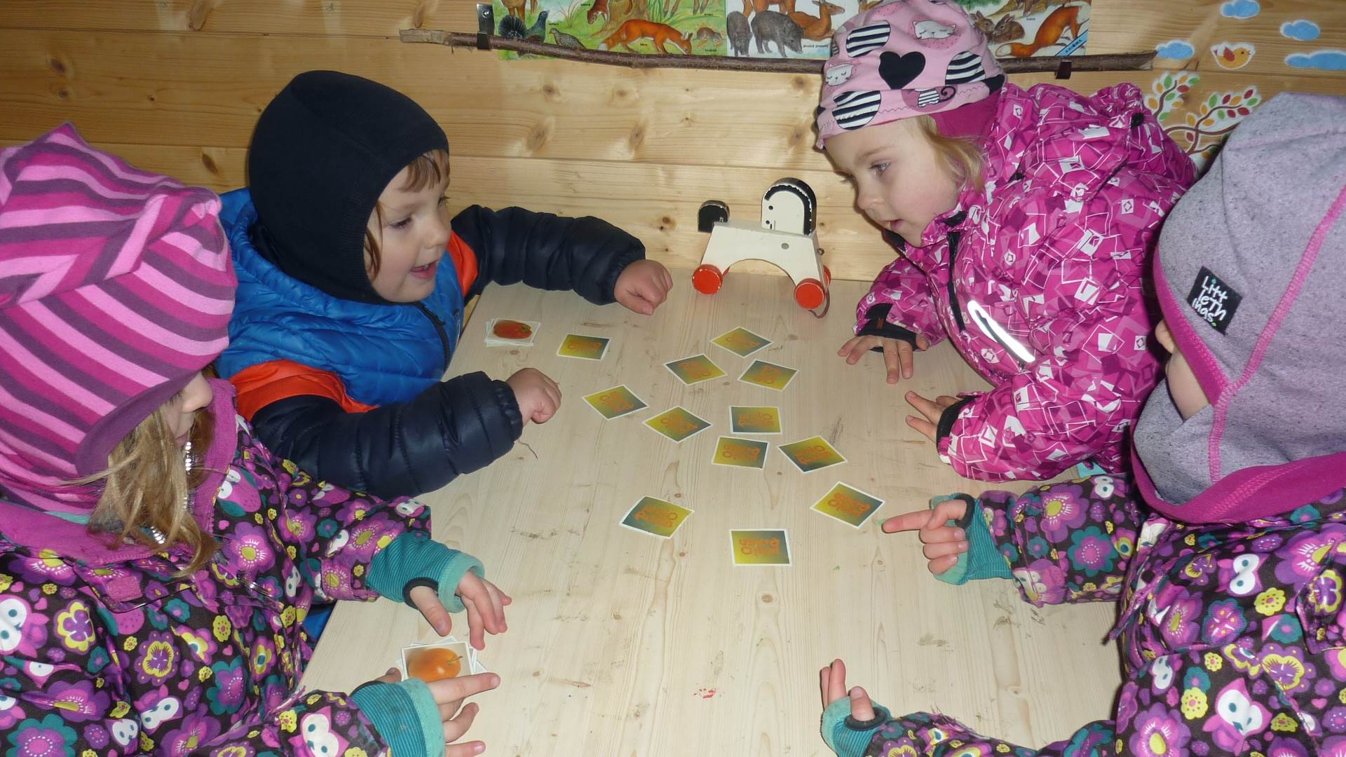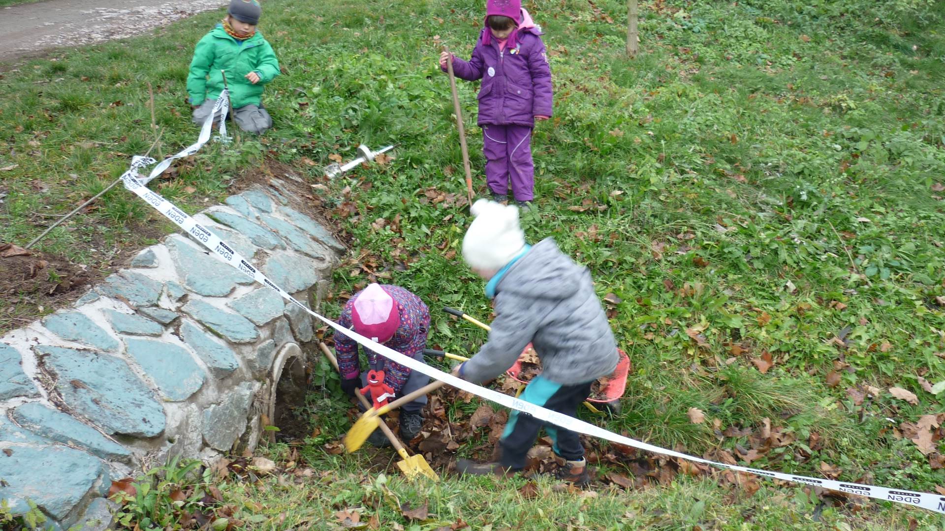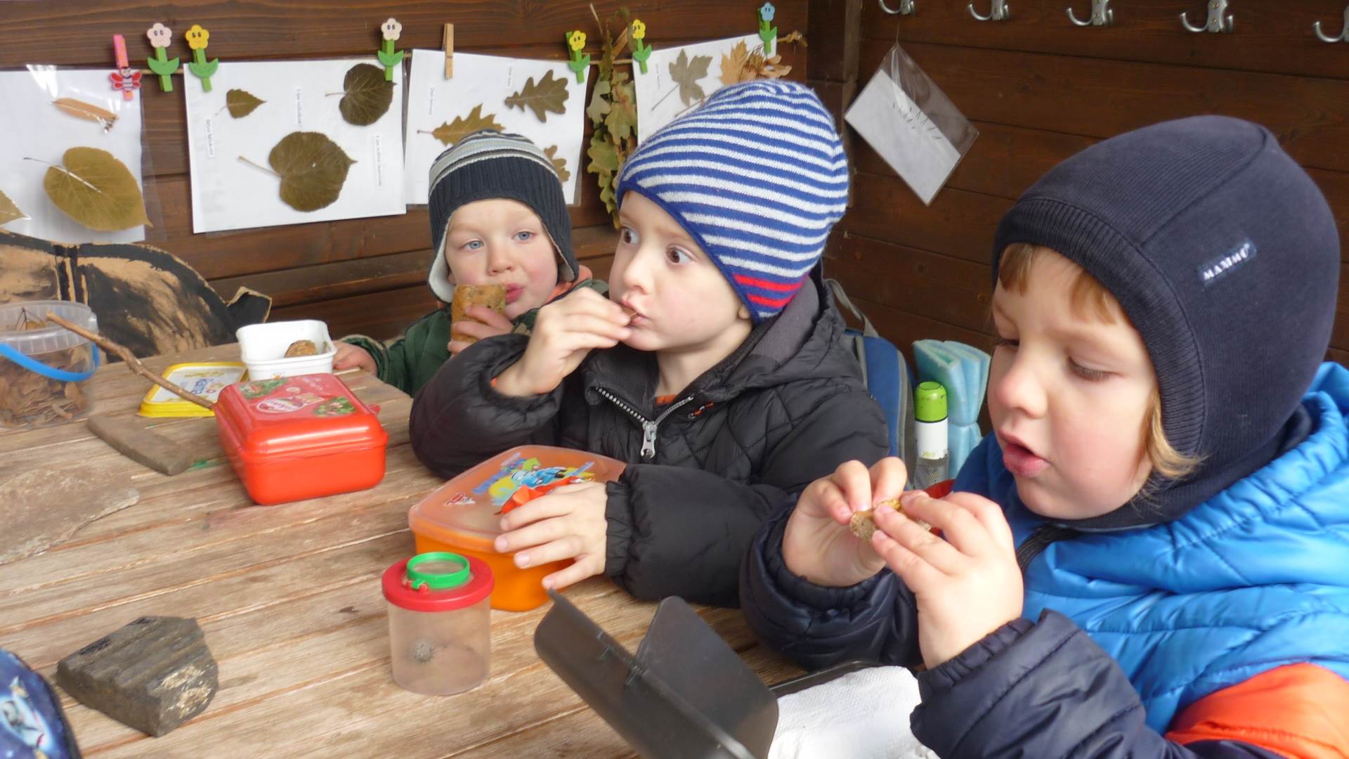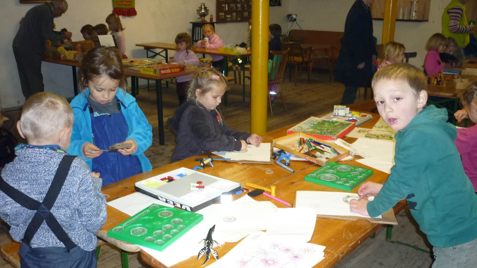 Poslední listopadový týden jsme pozvaní na farní "sýpku" na tzv. Retrovýstavu. Najdeme tu nejen historické hračky, ale třeba i celý obývací pokoj a spoustu věcí k běžnému užívání. V lesním zázemí si každý najde činnost, která je mu blízká. Pracujeme s pilou, sekerou, lopatou či rýči. Povídáme si o ptácích a zvířatech, jak se připravují na zimu, vytleskáváme slabiky ve slovech, hrajeme pexeso, dáváme si hádanky, pozorujeme námrazu a zkoumáme, jak tenký je led na rybníčku. Slavíme také Františkovi a Timonkovi narozeniny a jsme pozváni do Sluníček ke slavnostnímu pasování prvňáčků do řad čtenářů. Umí už všechna písmenka, a tak dostávají svůj první Slabikář. Už se těšíme, až nám budou číst před spaním pohádky!