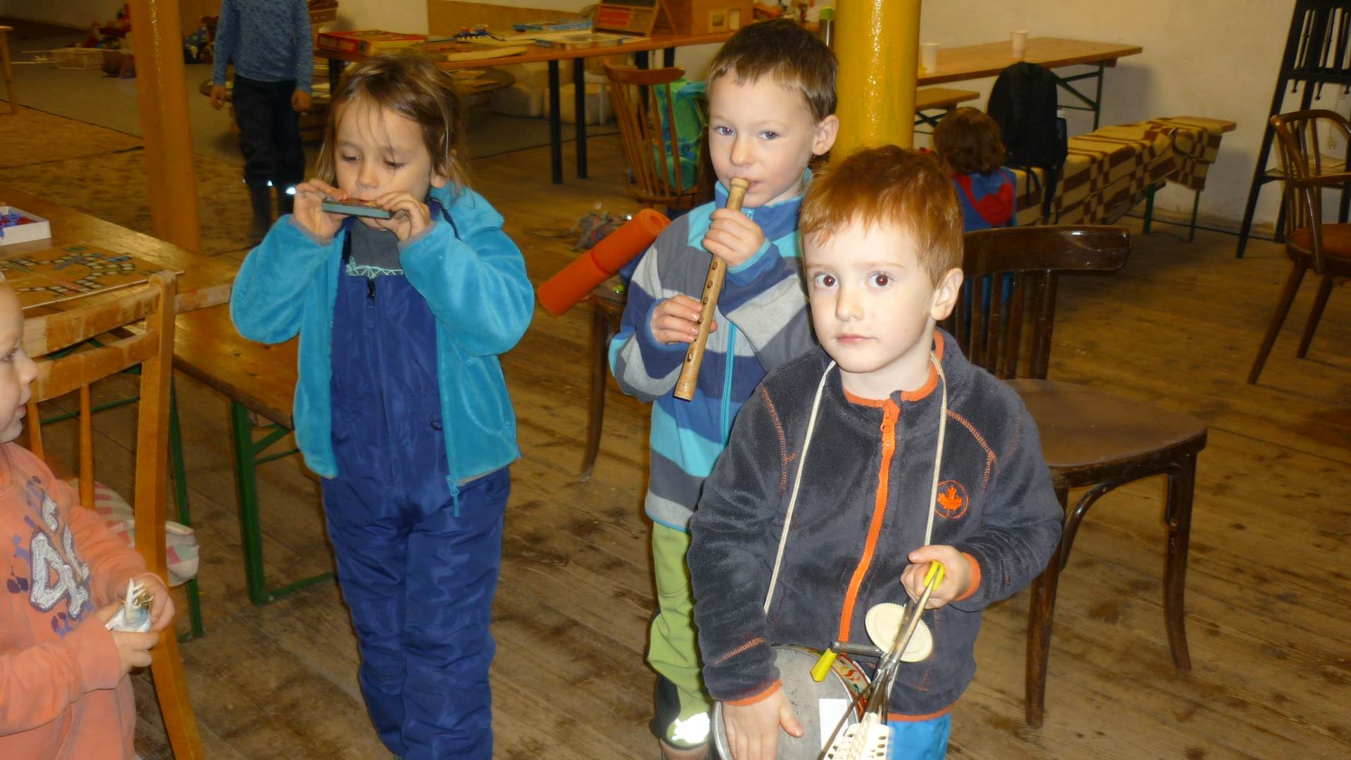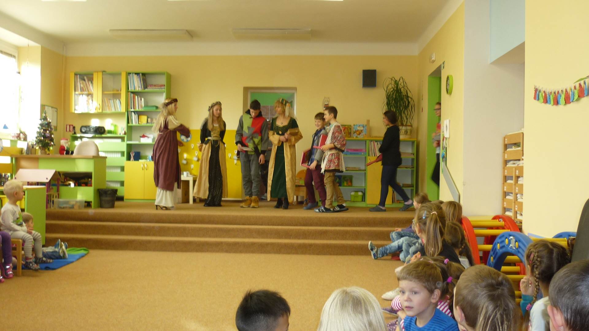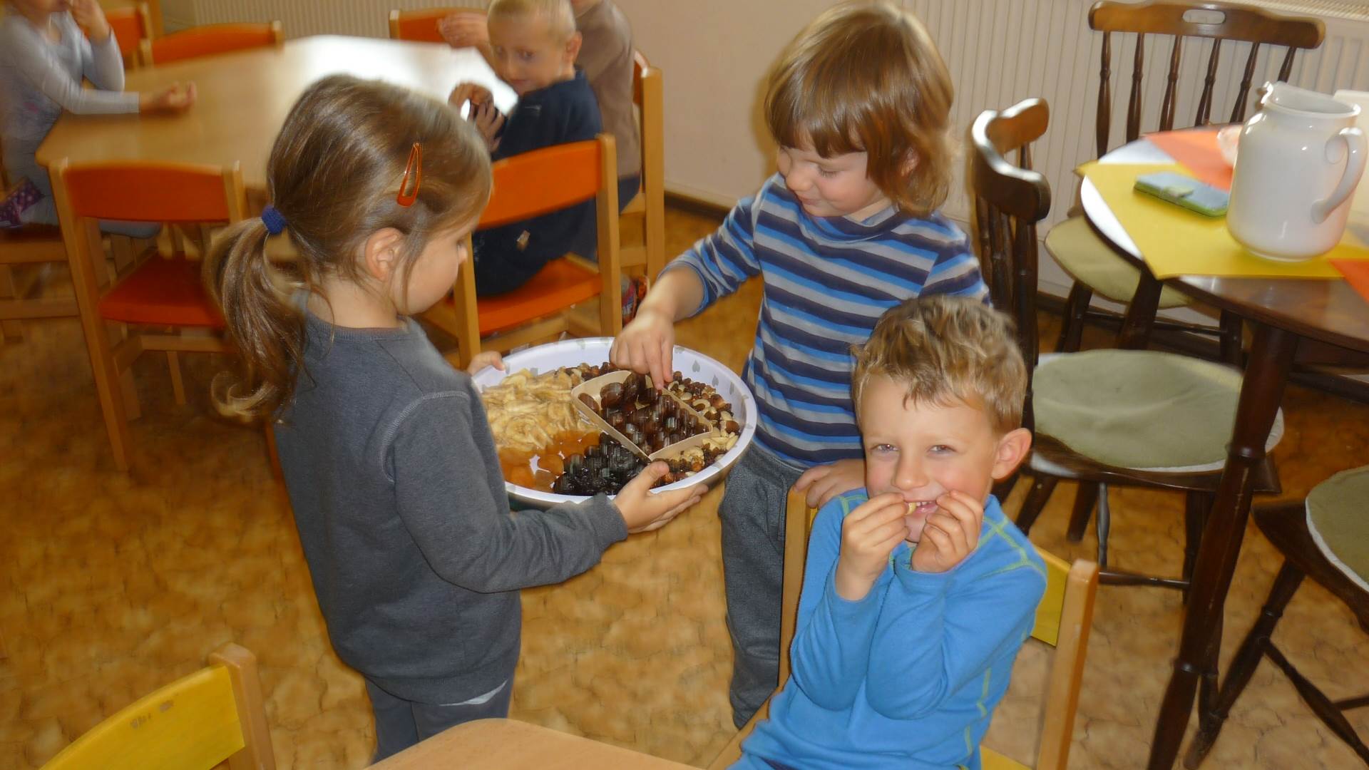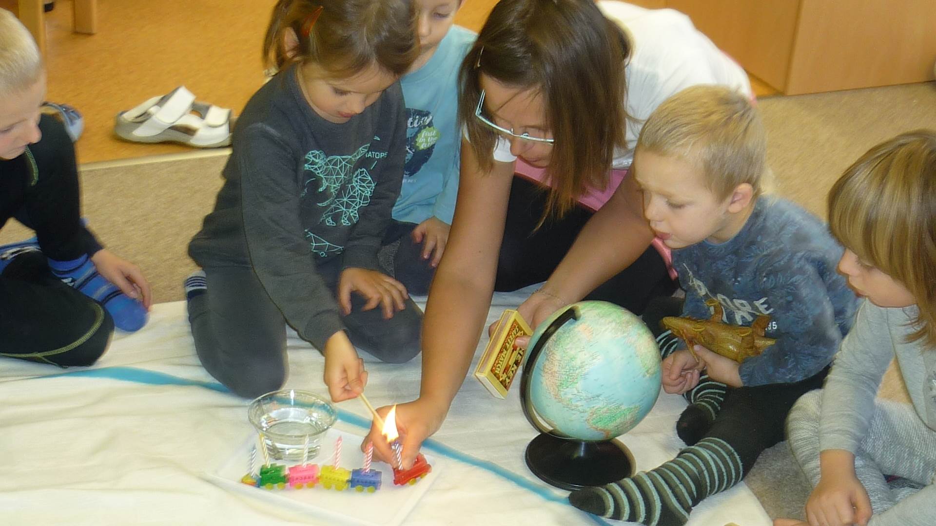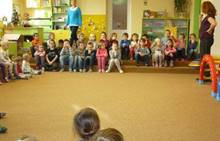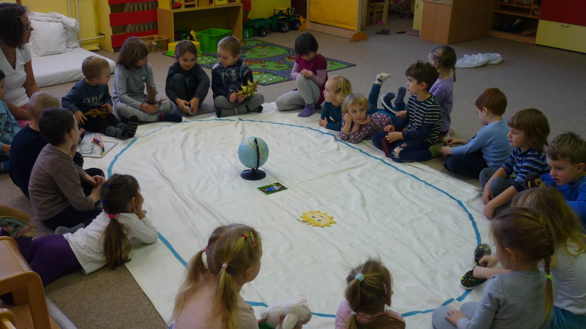 Poslední listopadový týden jsme pozvaní na farní "sýpku" na tzv. Retrovýstavu. Najdeme tu nejen historické hračky, ale třeba i celý obývací pokoj a spoustu věcí k běžnému užívání. V lesním zázemí si každý najde činnost, která je mu blízká. Pracujeme s pilou, sekerou, lopatou či rýči. Povídáme si o ptácích a zvířatech, jak se připravují na zimu, vytleskáváme slabiky ve slovech, hrajeme pexeso, dáváme si hádanky, pozorujeme námrazu a zkoumáme, jak tenký je led na rybníčku. Slavíme také Františkovi a Timonkovi narozeniny a jsme pozváni do Sluníček ke slavnostnímu pasování prvňáčků do řad čtenářů. Umí už všechna písmenka, a tak dostávají svůj první Slabikář. Už se těšíme, až nám budou číst před spaním pohádky!