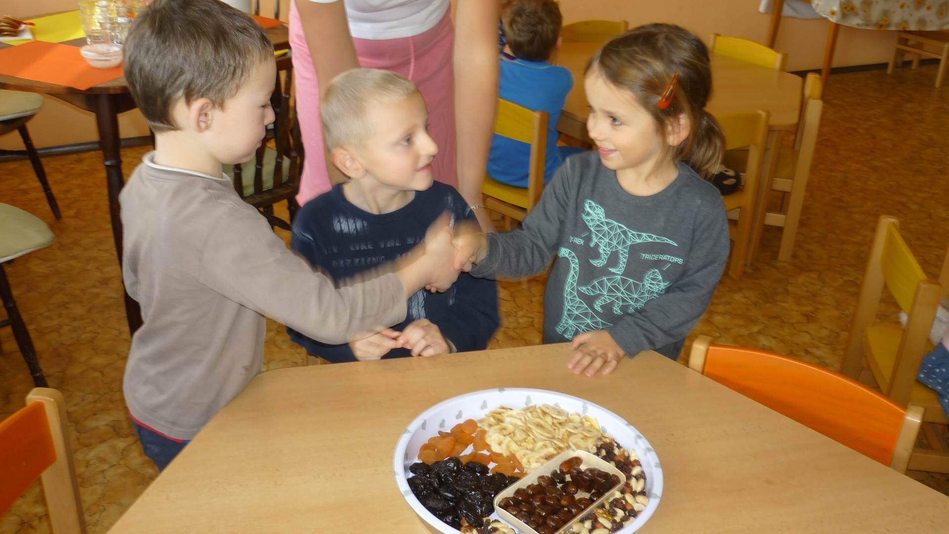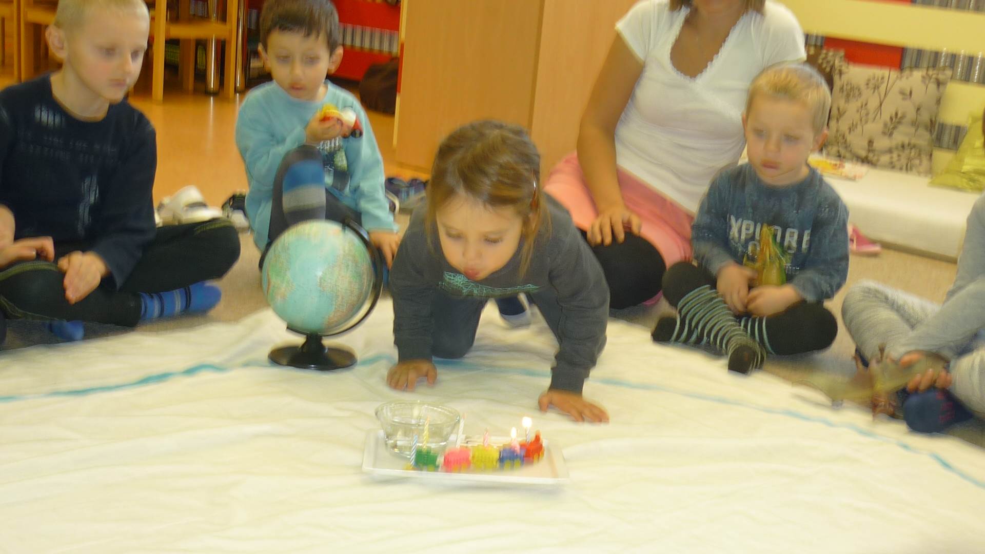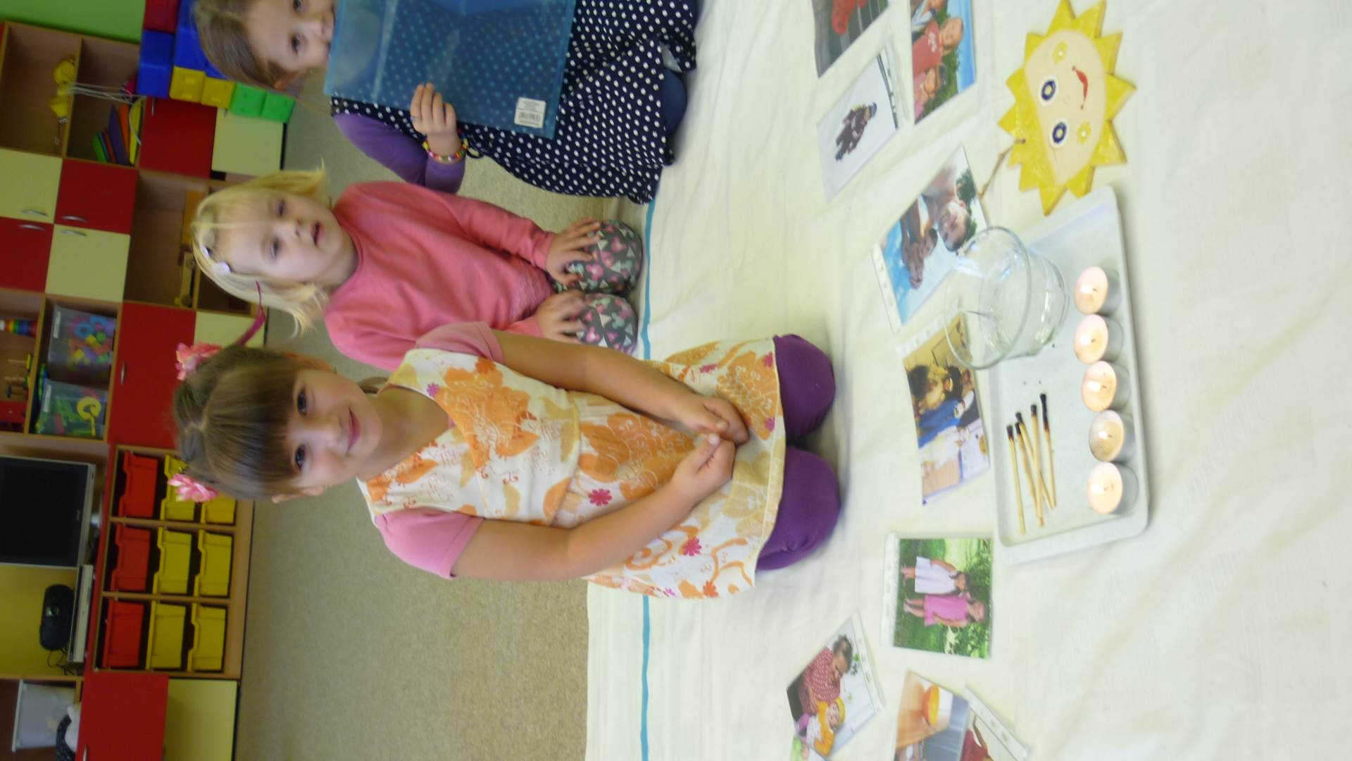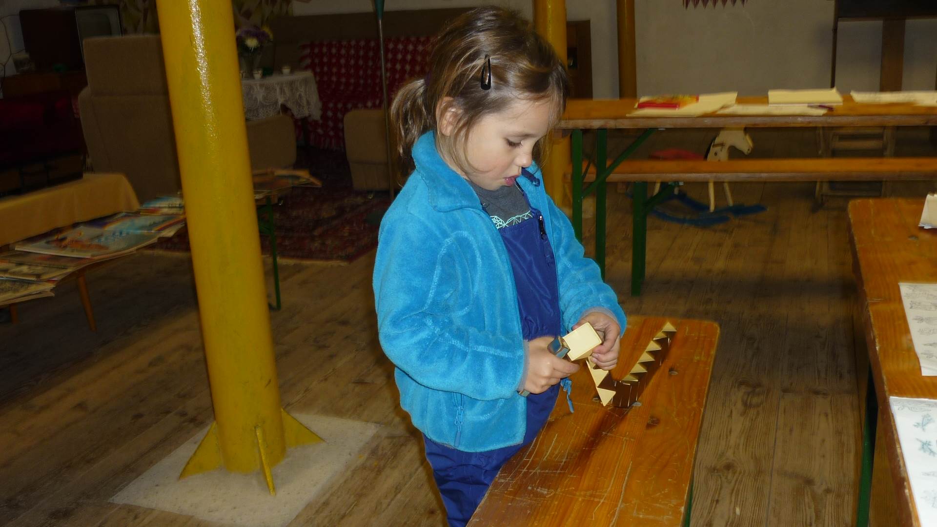 Poslední listopadový týden jsme pozvaní na farní "sýpku" na tzv. Retrovýstavu. Najdeme tu nejen historické hračky, ale třeba i celý obývací pokoj a spoustu věcí k běžnému užívání. V lesním zázemí si každý najde činnost, která je mu blízká. Pracujeme s pilou, sekerou, lopatou či rýči. Povídáme si o ptácích a zvířatech, jak se připravují na zimu, vytleskáváme slabiky ve slovech, hrajeme pexeso, dáváme si hádanky, pozorujeme námrazu a zkoumáme, jak tenký je led na rybníčku. Slavíme také Františkovi a Timonkovi narozeniny a jsme pozváni do Sluníček ke slavnostnímu pasování prvňáčků do řad čtenářů. Umí už všechna písmenka, a tak dostávají svůj první Slabikář. Už se těšíme, až nám budou číst před spaním pohádky!