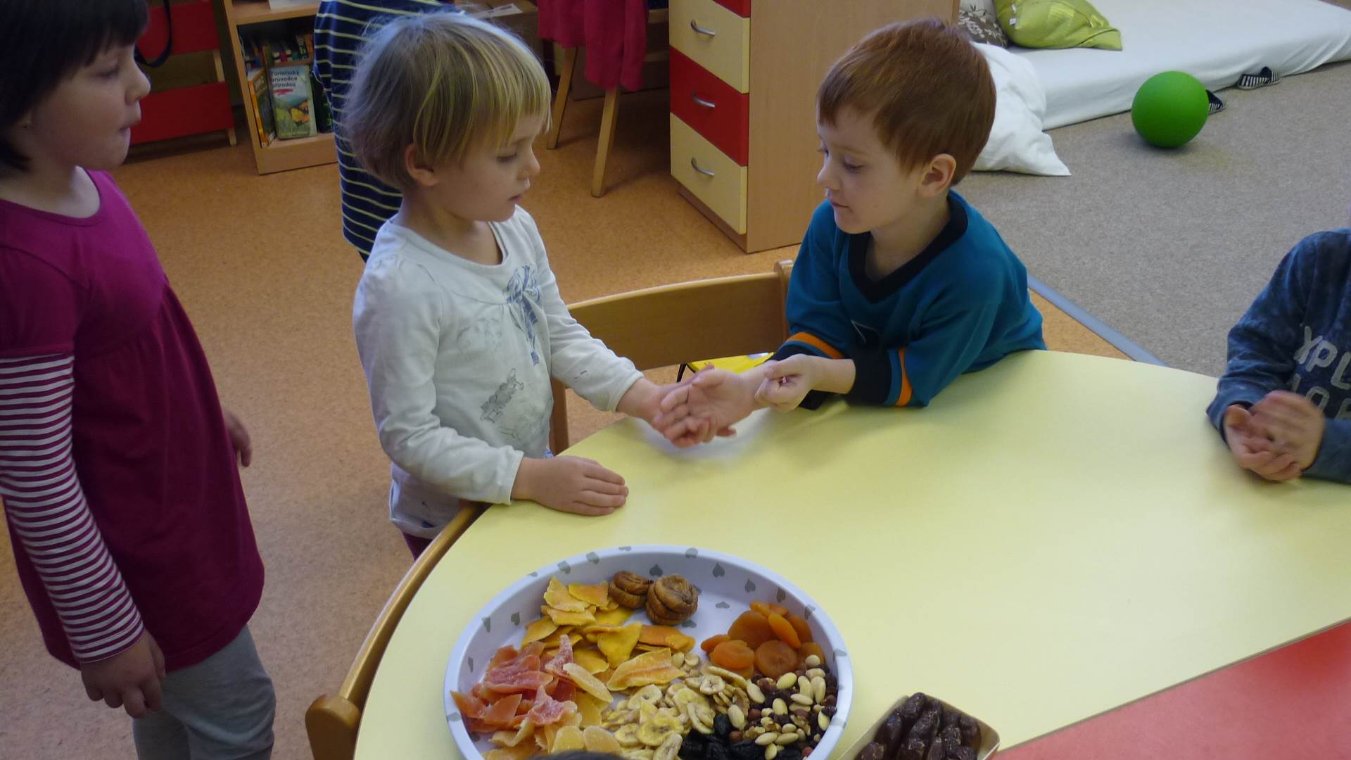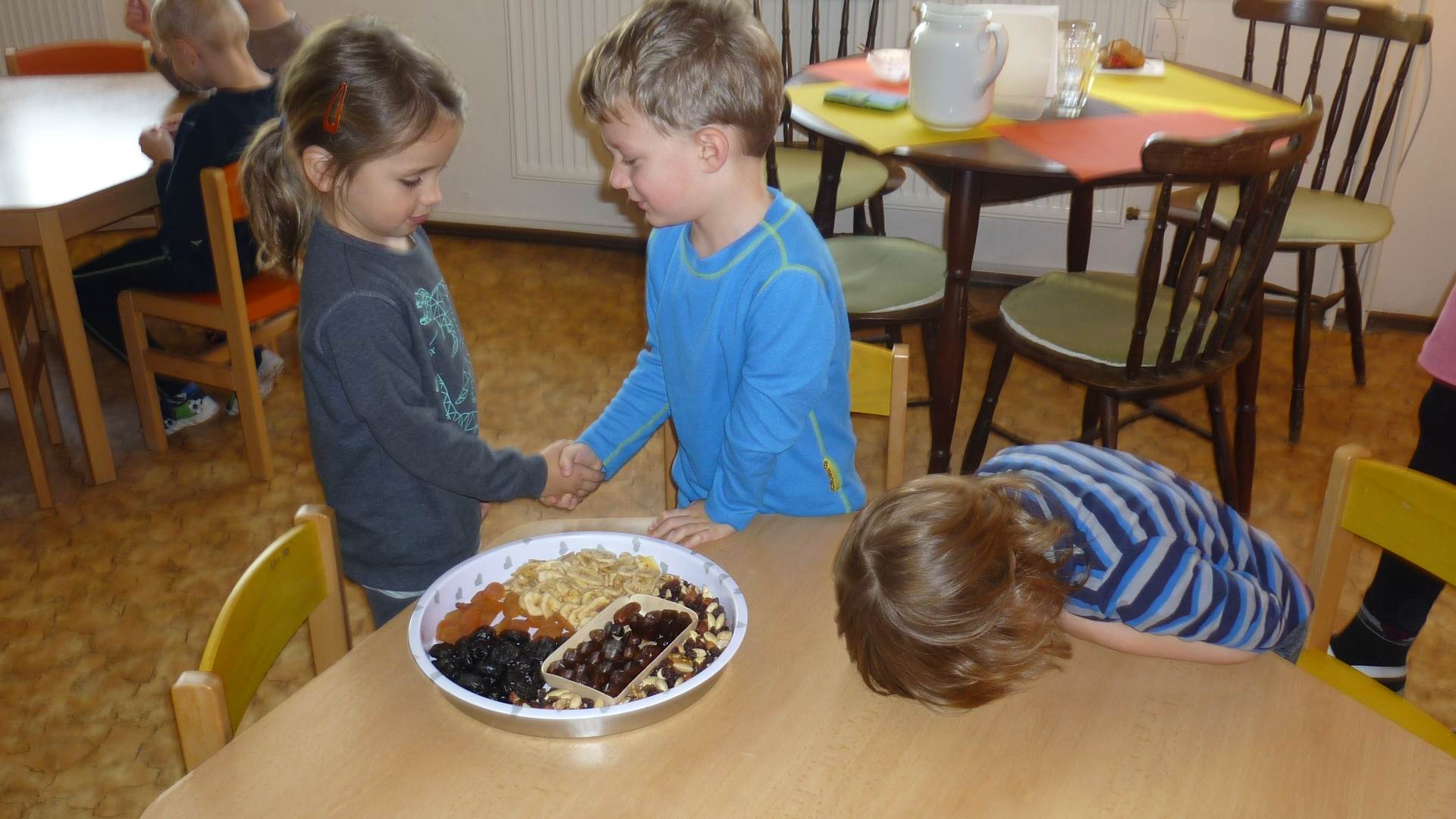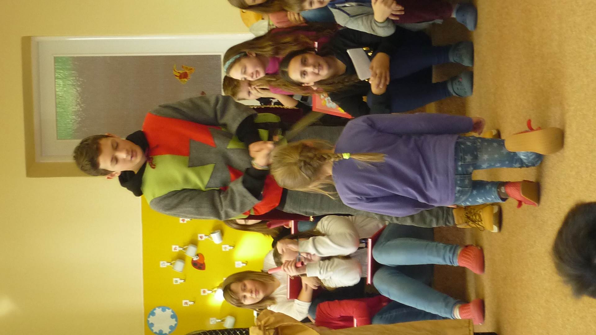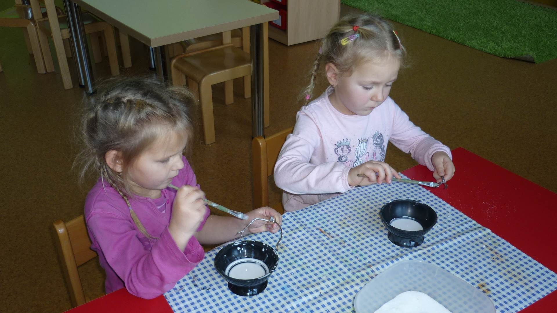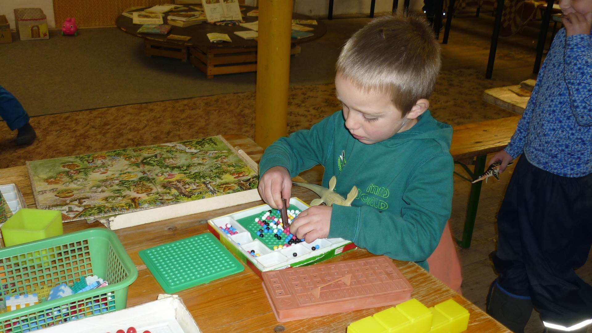 Poslední listopadový týden jsme pozvaní na farní "sýpku" na tzv. Retrovýstavu. Najdeme tu nejen historické hračky, ale třeba i celý obývací pokoj a spoustu věcí k běžnému užívání. V lesním zázemí si každý najde činnost, která je mu blízká. Pracujeme s pilou, sekerou, lopatou či rýči. Povídáme si o ptácích a zvířatech, jak se připravují na zimu, vytleskáváme slabiky ve slovech, hrajeme pexeso, dáváme si hádanky, pozorujeme námrazu a zkoumáme, jak tenký je led na rybníčku. Slavíme také Františkovi a Timonkovi narozeniny a jsme pozváni do Sluníček ke slavnostnímu pasování prvňáčků do řad čtenářů. Umí už všechna písmenka, a tak dostávají svůj první Slabikář. Už se těšíme, až nám budou číst před spaním pohádky!