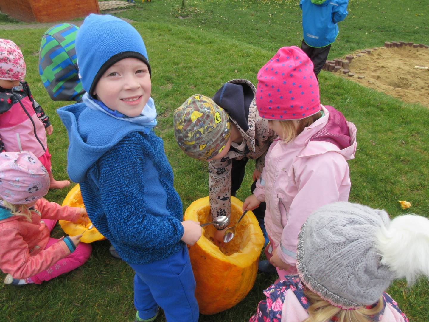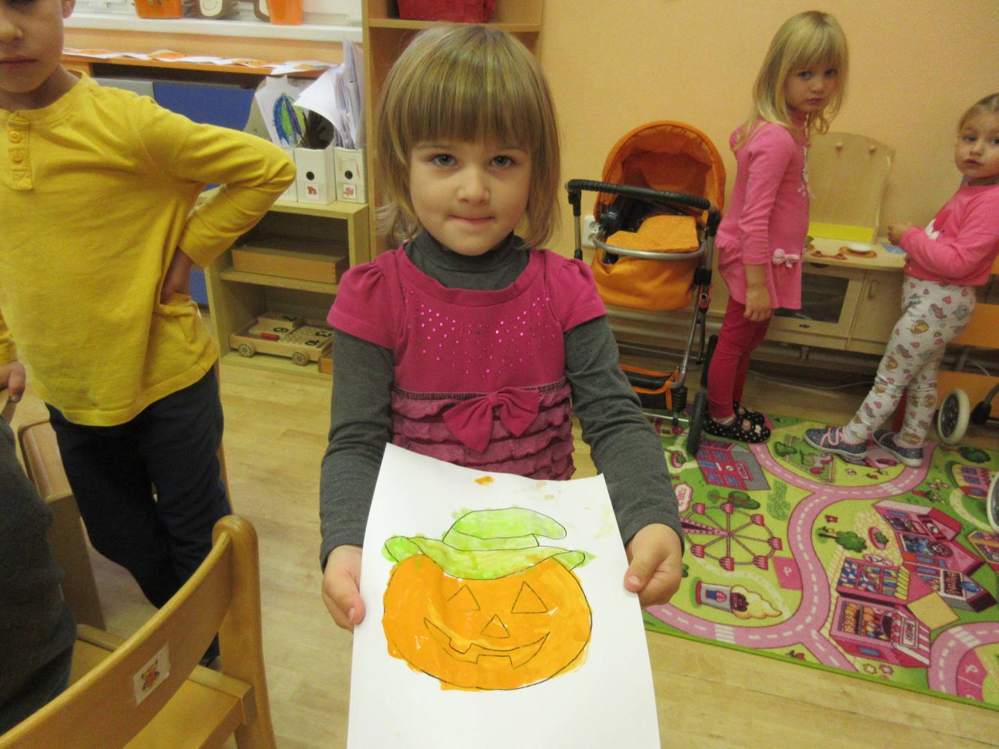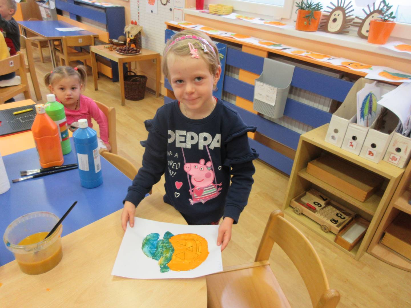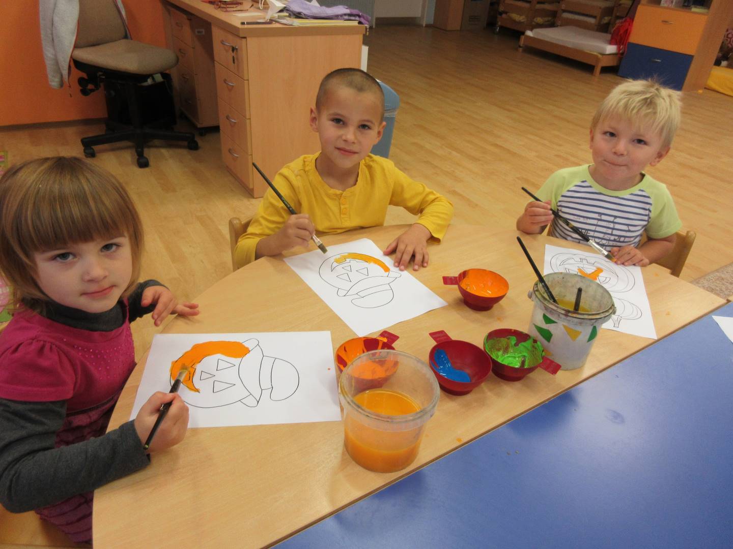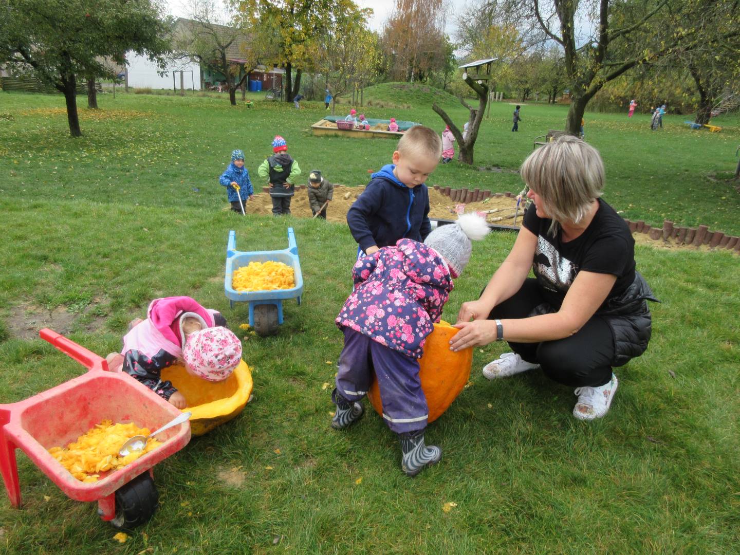 Povídali jsme si o Halloweenu a Dušičkách. Vydlabali jsme dýni, která nám venku krásně svítila. Vyráběli jsme draky, pracovali s listy, kaštany a šiškami. Děti se učily nové básničky a písničky. Vyprávěli jsme si o přírodě, která se chystá na zimu. Oslavili jsme svátek Svatého Martina a vyrobili bílé koníky, kteří nám zdobí vchod MŠ.