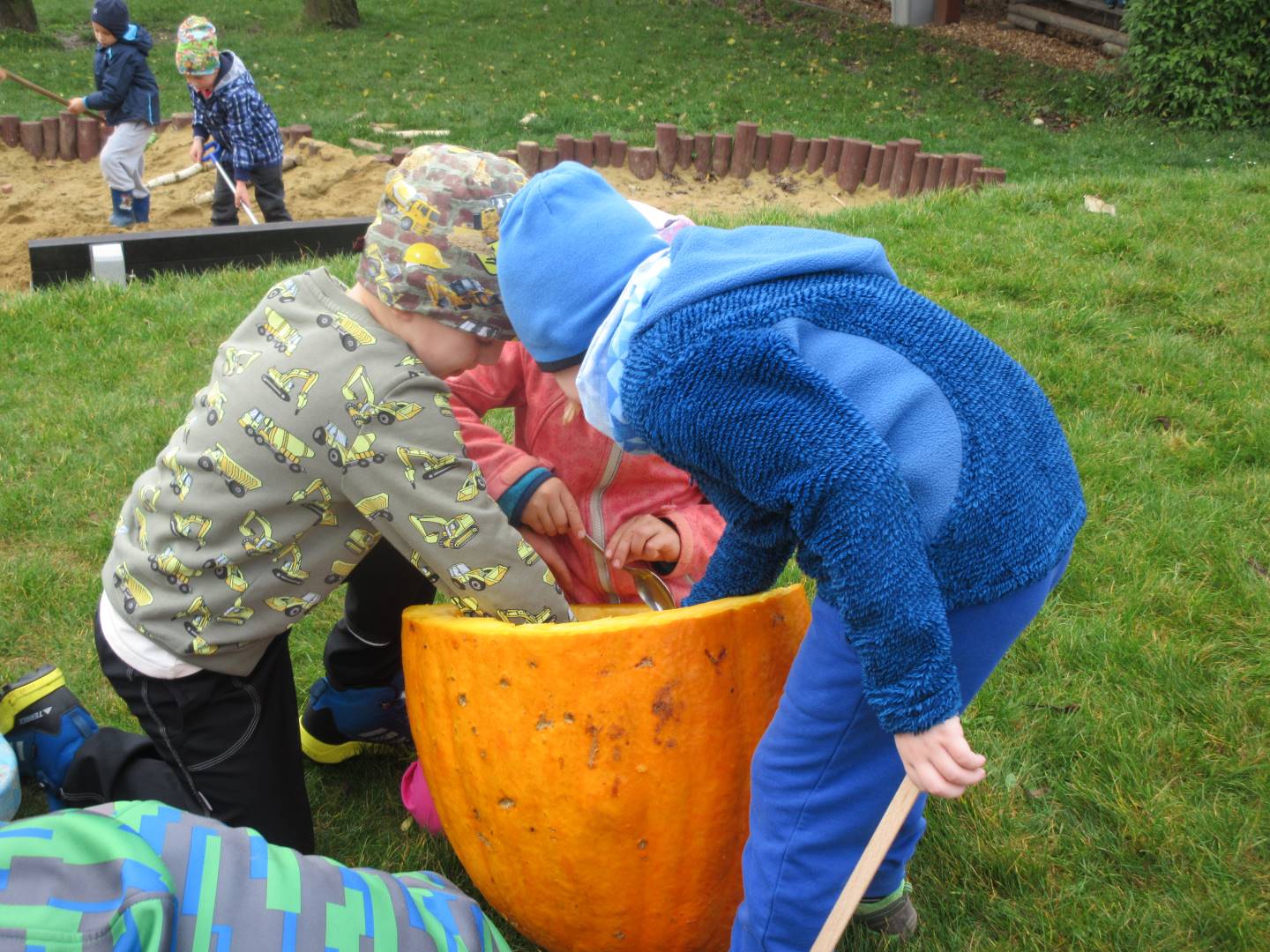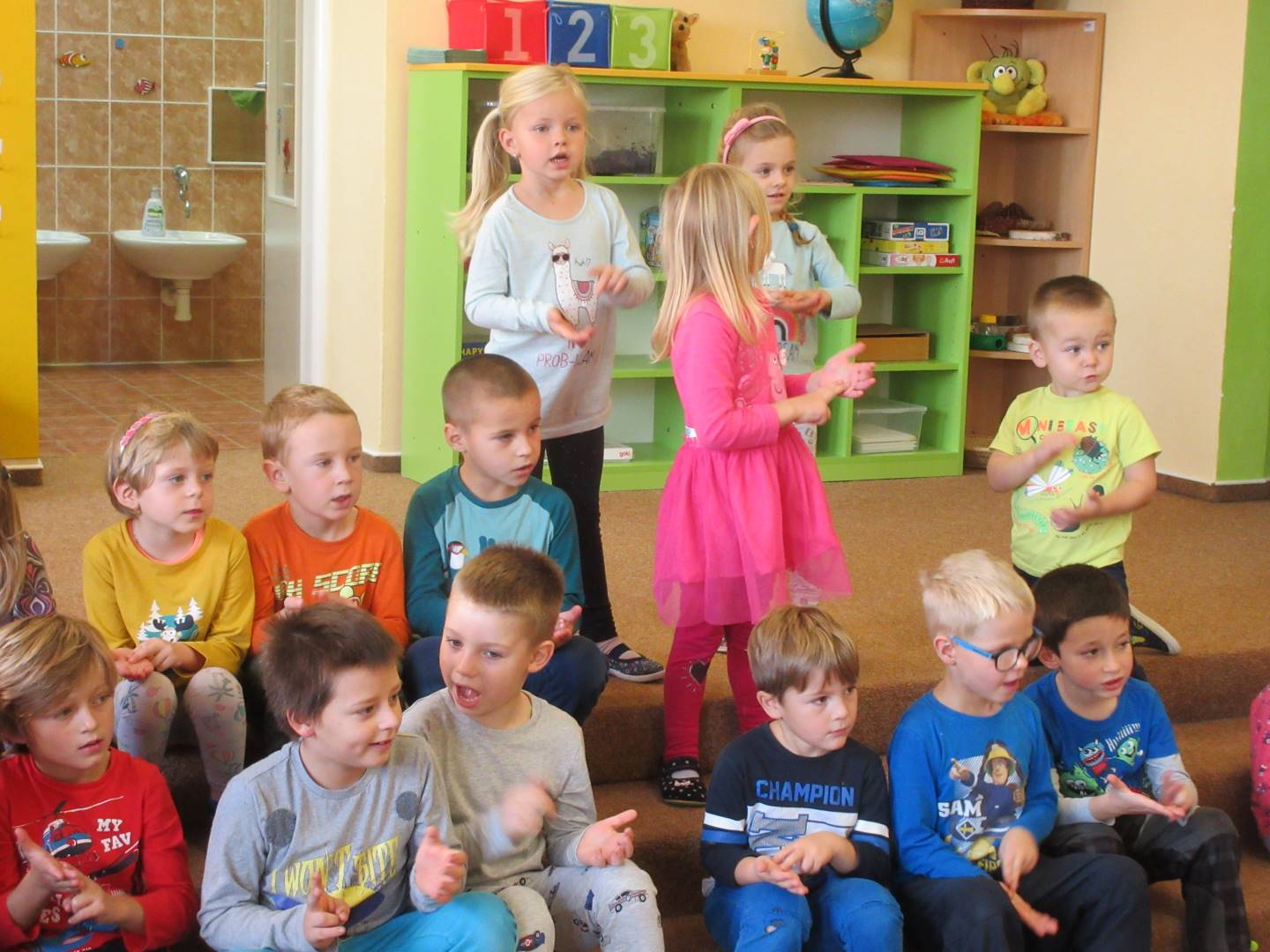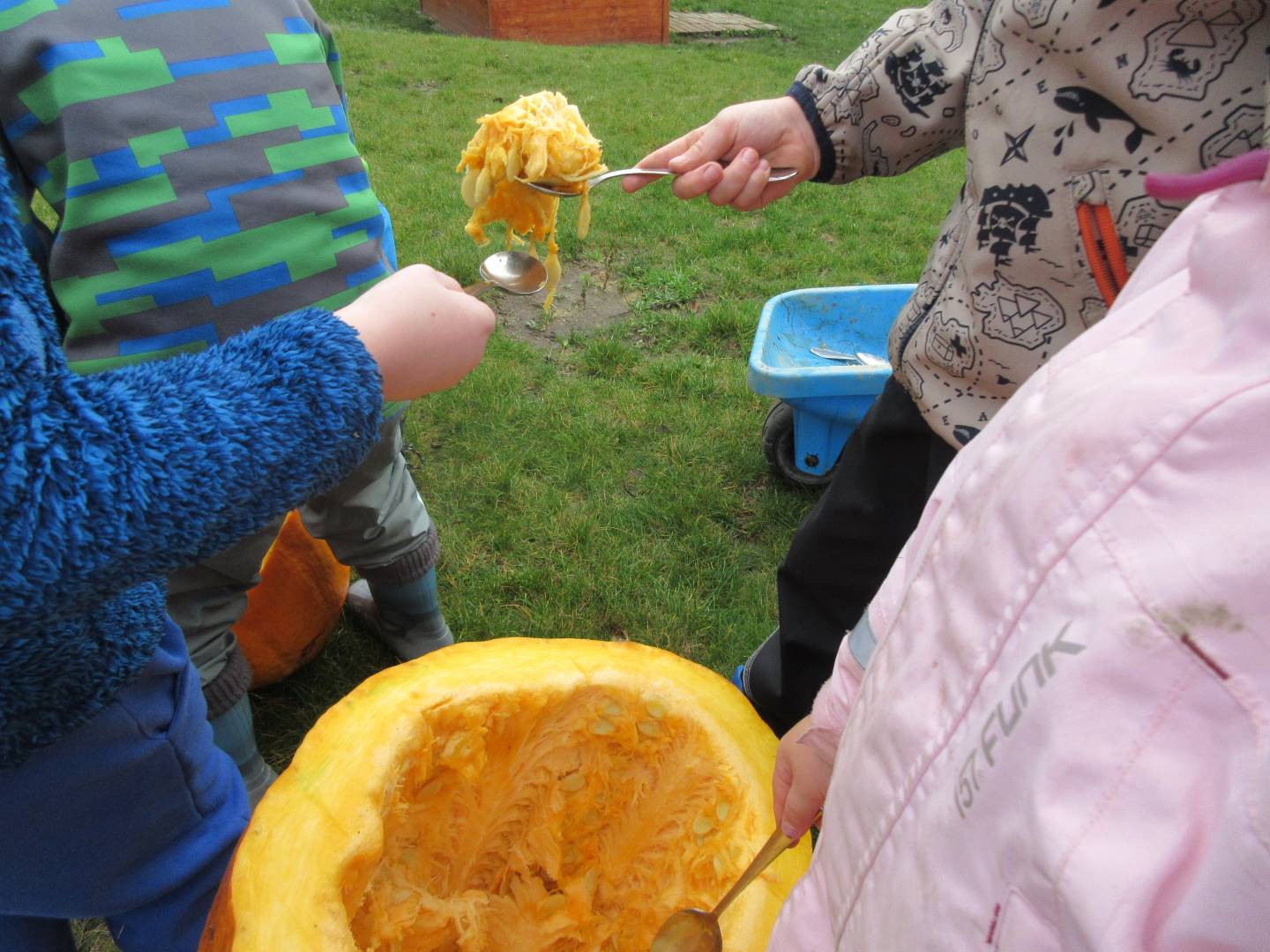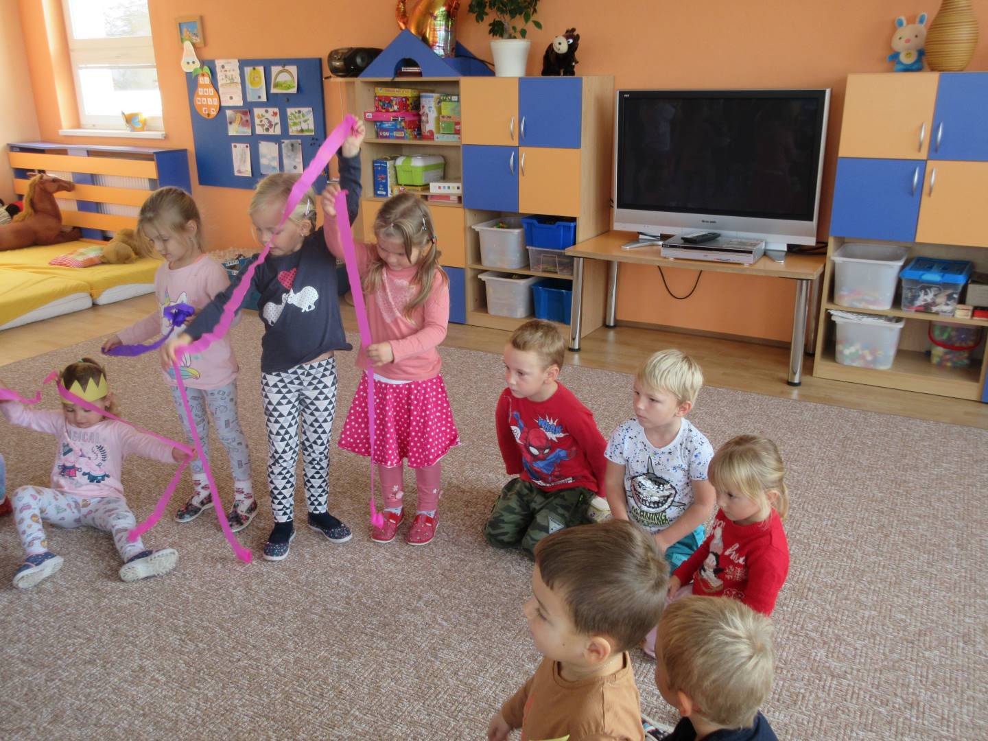 Povídali jsme si o Halloweenu a Dušičkách. Vydlabali jsme dýni, která nám venku krásně svítila. Vyráběli jsme draky, pracovali s listy, kaštany a šiškami. Děti se učily nové básničky a písničky. Vyprávěli jsme si o přírodě, která se chystá na zimu. Oslavili jsme svátek Svatého Martina a vyrobili bílé koníky, kteří nám zdobí vchod MŠ.