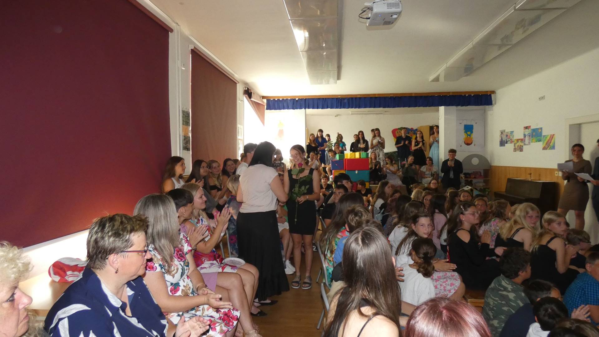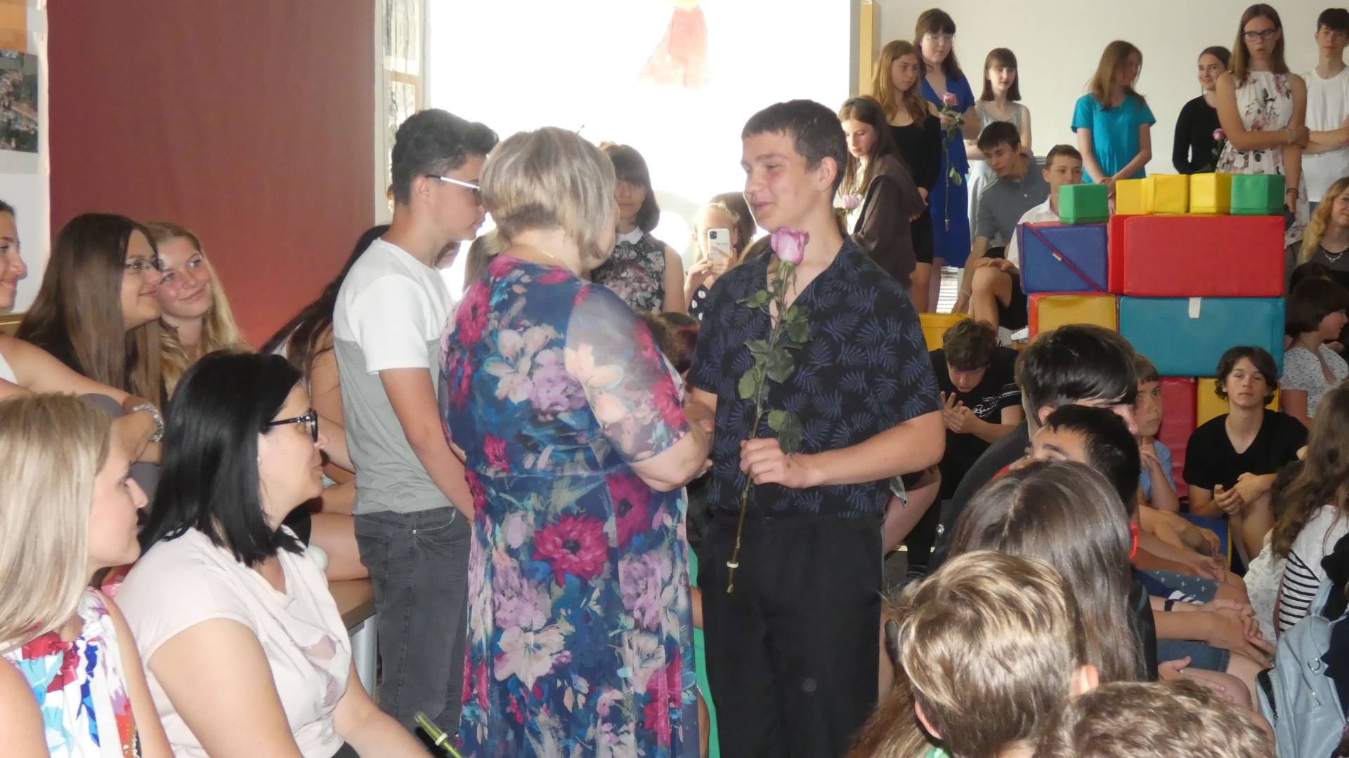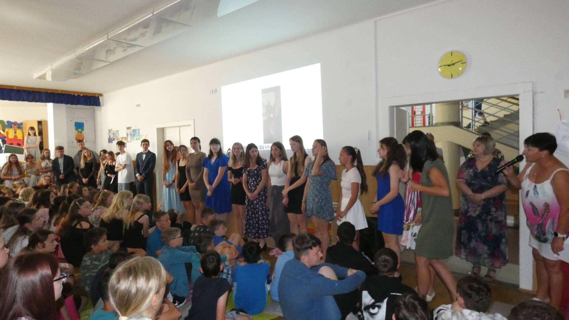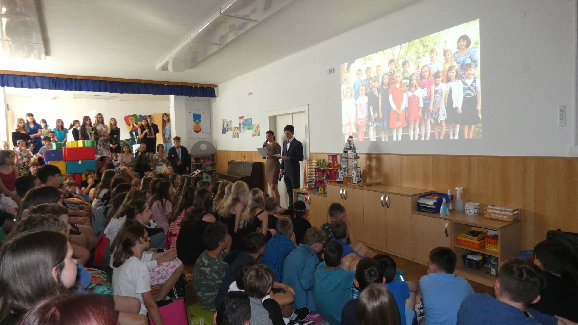 Dnes se s námi rozloučili žáci devátého ročníku. Připravili si poděkování vyučujícím i vzpomínkové video. Během společného slavnostního zakončení byli také oceněni žáci, kteří školu reprezentovali nebo výrazně pomáhali ve třídních kolektivech nebo na akcích školy. Knínickou jedničkou se pro letošní rok stala Anička Fialová, která neúnavně pracovala pro kolektiv, každému ochotně pomohla a vždy se na ni dalo spolehnout. Po ukončení slavnostního rozloučení jsme deváťákům zazvonili na jejich poslední společnou cestu z naší školy. Přejeme jim hodně úspěchů na středních školách a těšíme se, že se za námi někdy zase přijdou podívat.