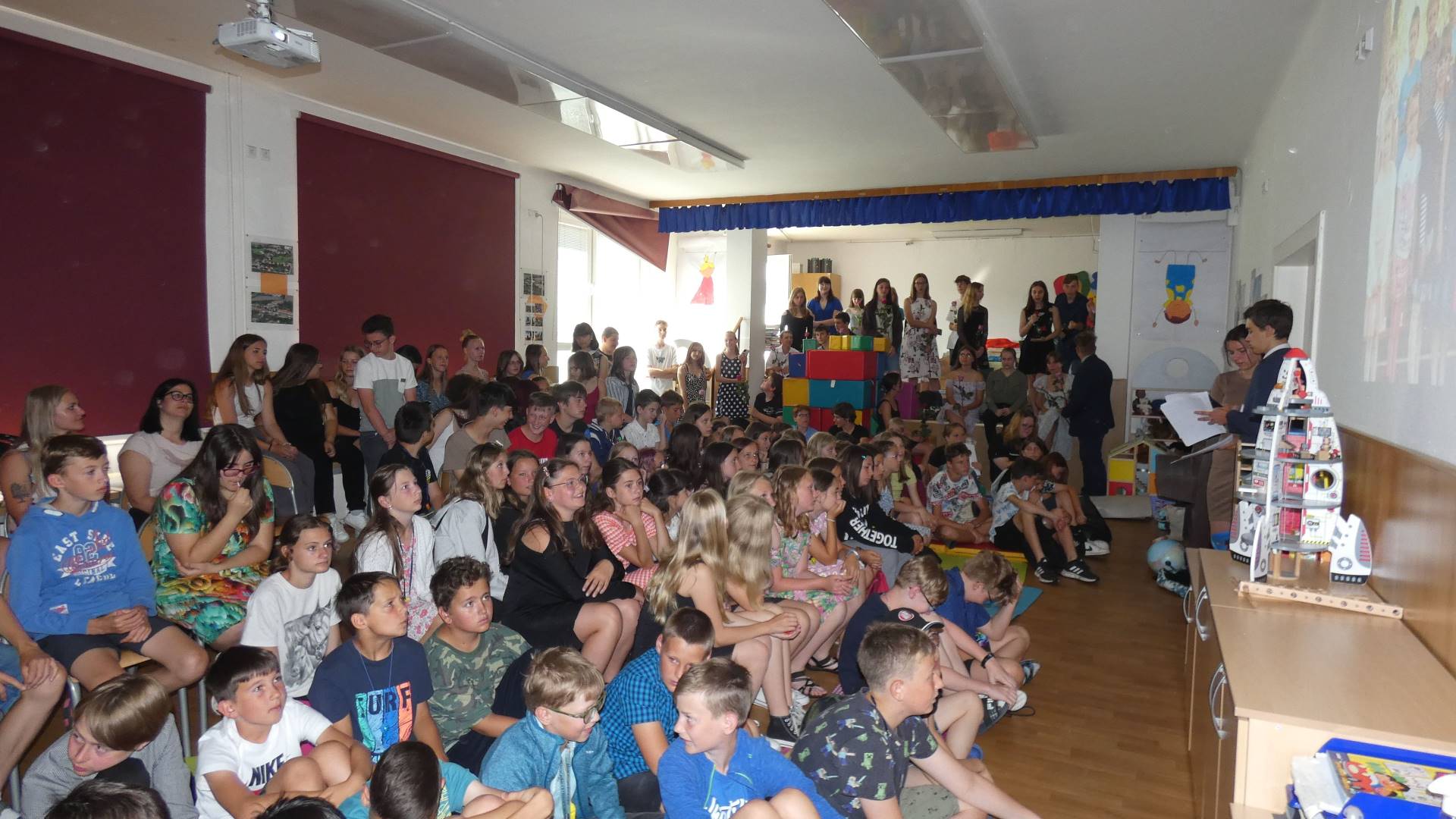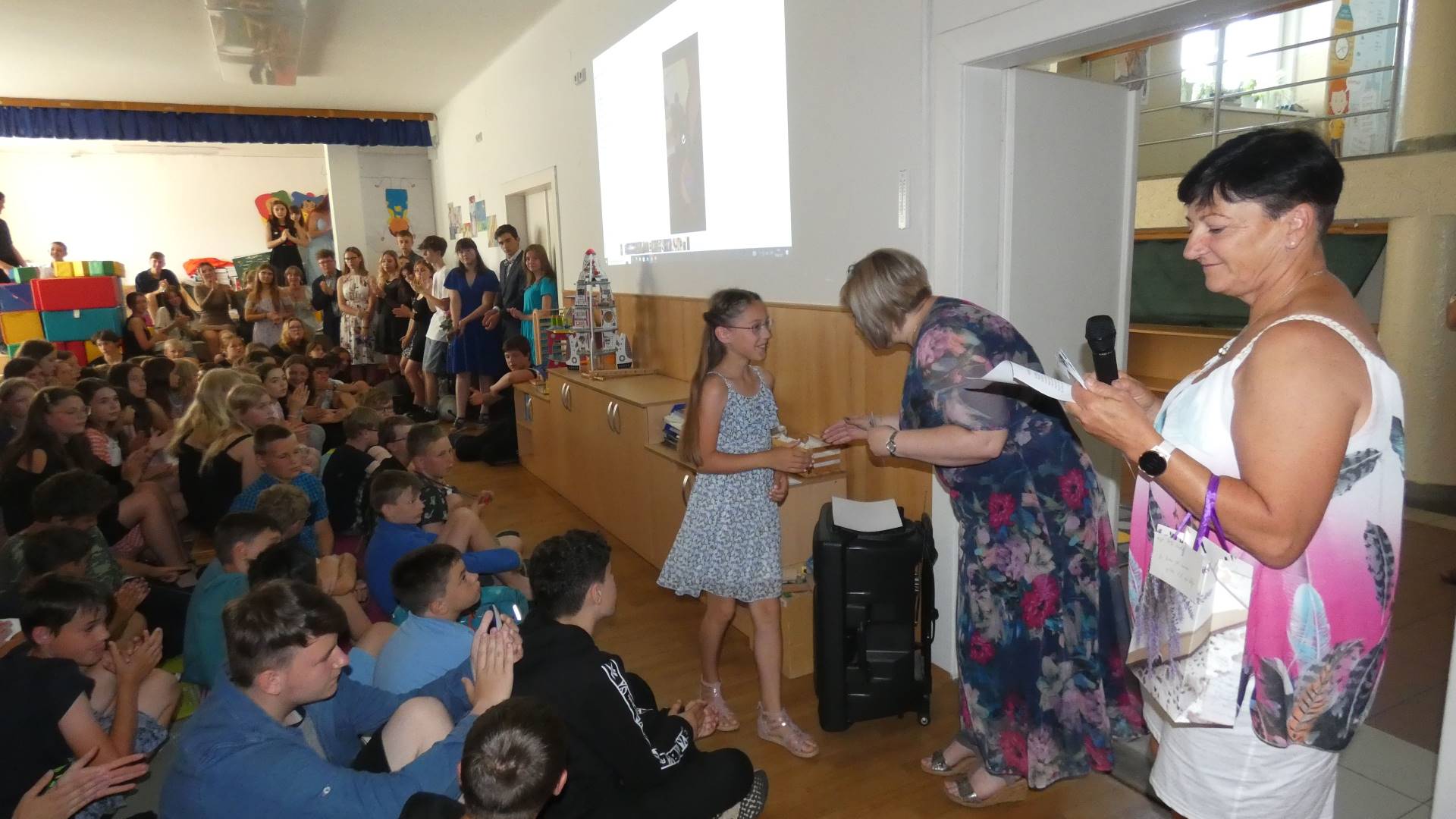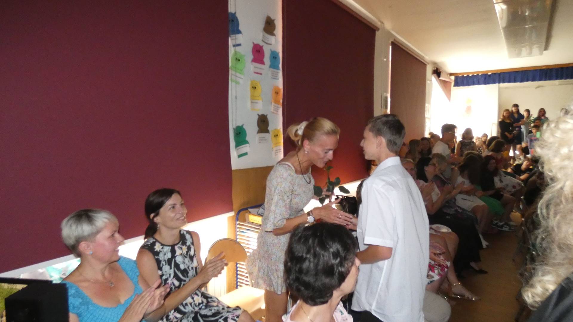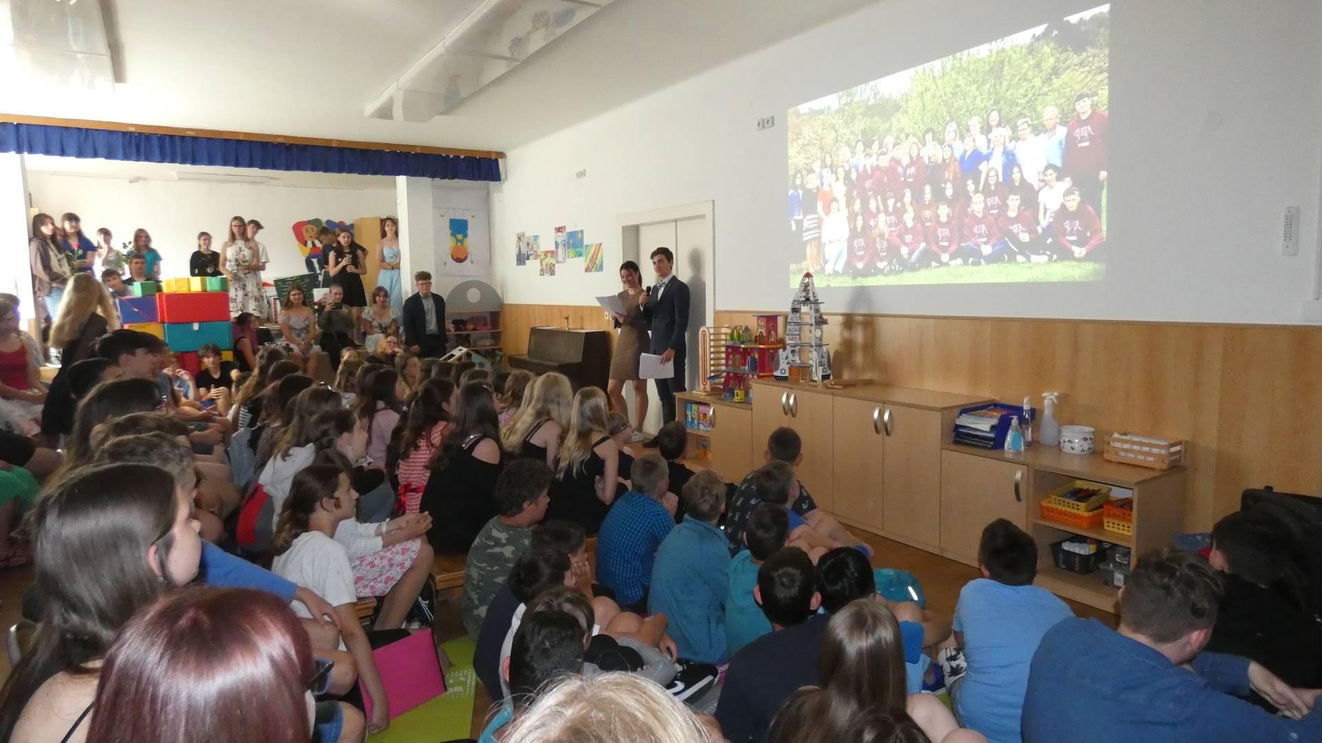 Dnes se s námi rozloučili žáci devátého ročníku. Připravili si poděkování vyučujícím i vzpomínkové video. Během společného slavnostního zakončení byli také oceněni žáci, kteří školu reprezentovali nebo výrazně pomáhali ve třídních kolektivech nebo na akcích školy. Knínickou jedničkou se pro letošní rok stala Anička Fialová, která neúnavně pracovala pro kolektiv, každému ochotně pomohla a vždy se na ni dalo spolehnout. Po ukončení slavnostního rozloučení jsme deváťákům zazvonili na jejich poslední společnou cestu z naší školy. Přejeme jim hodně úspěchů na středních školách a těšíme se, že se za námi někdy zase přijdou podívat.
