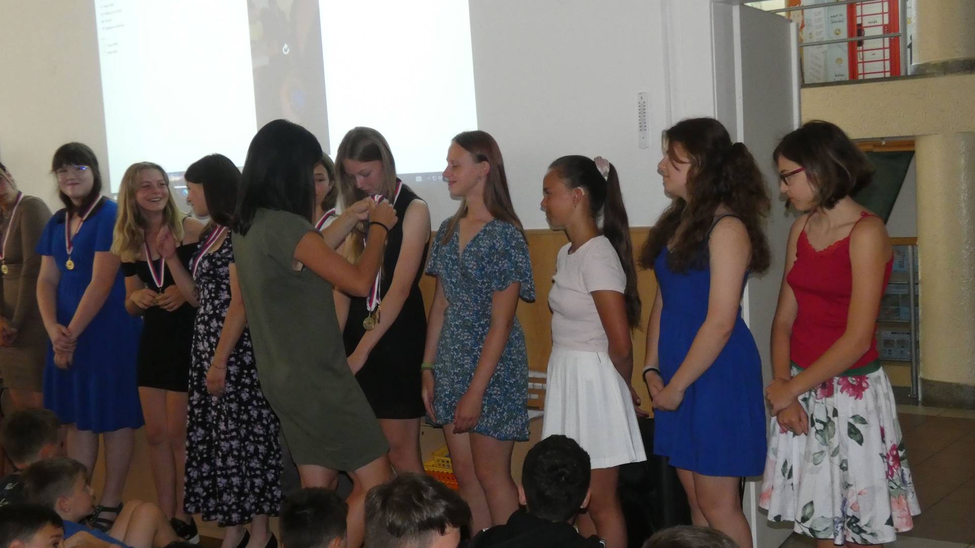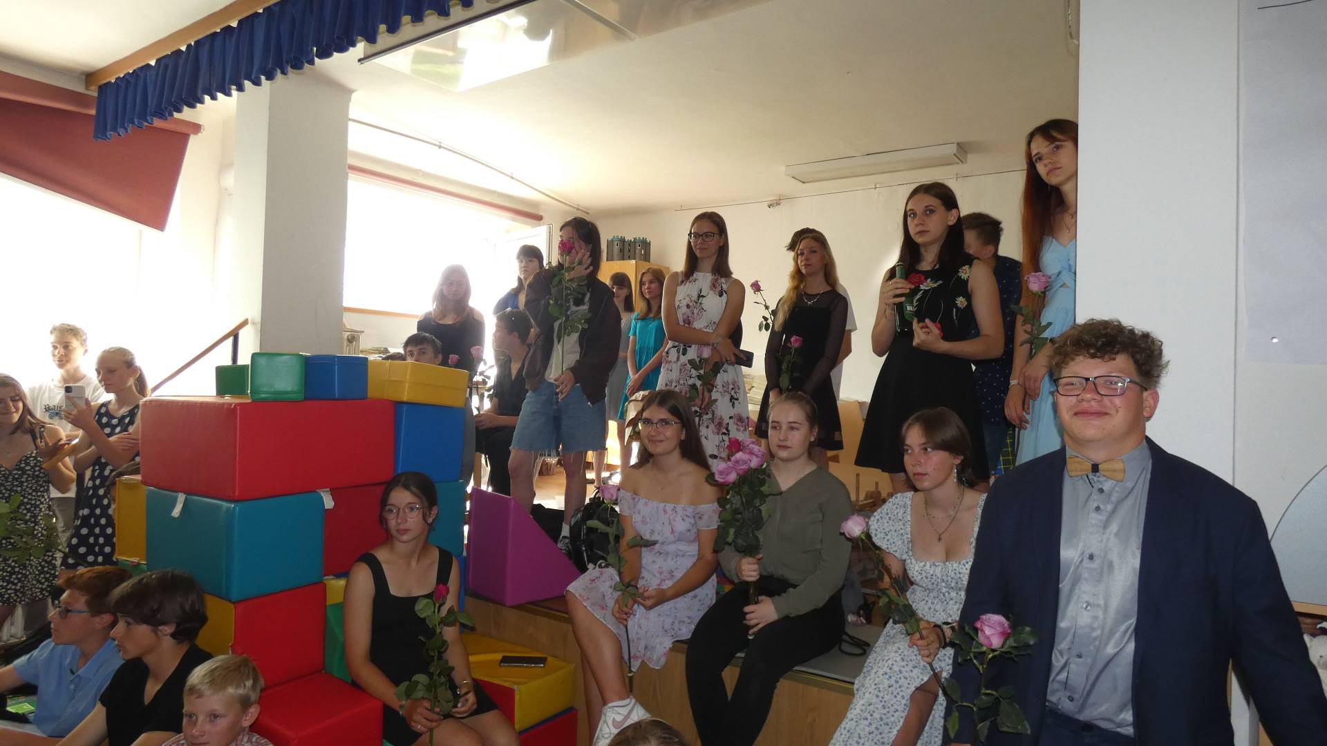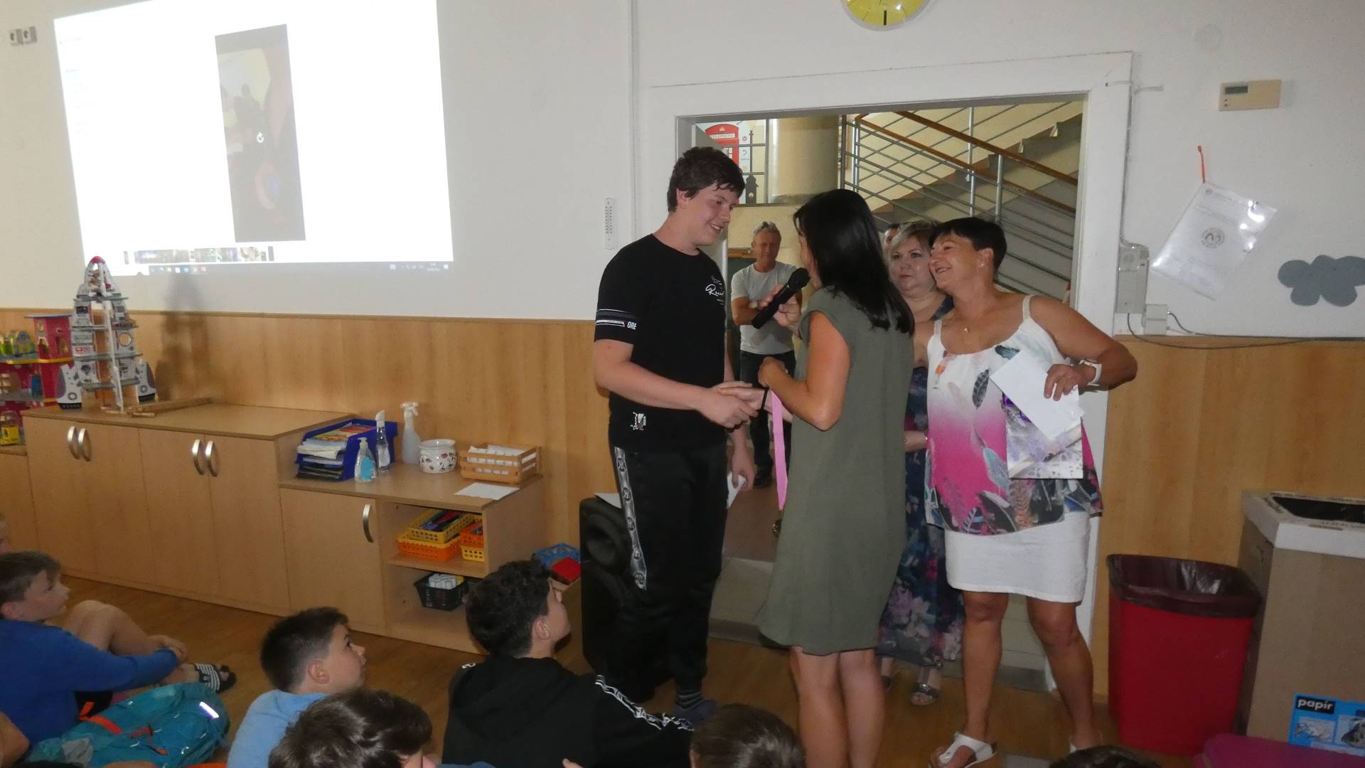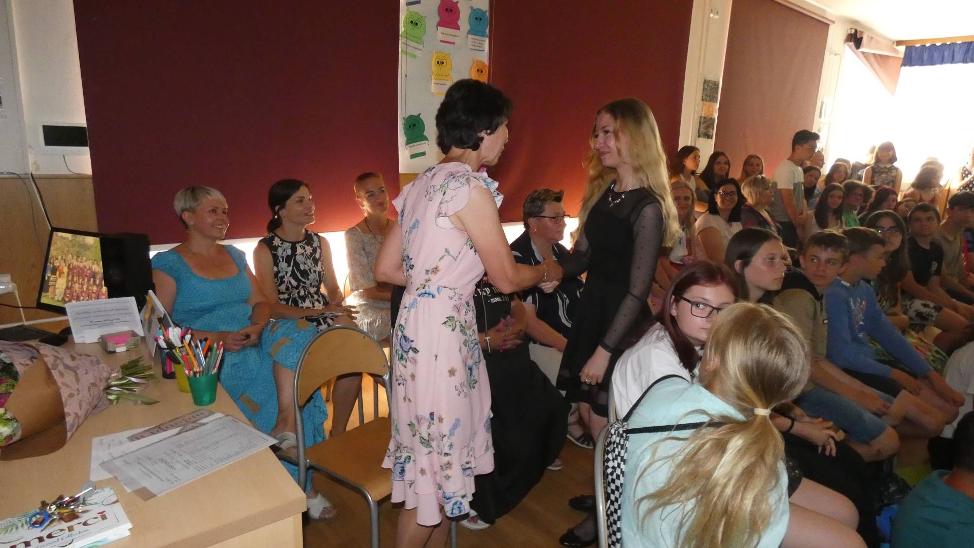 Dnes se s námi rozloučili žáci devátého ročníku. Připravili si poděkování vyučujícím i vzpomínkové video. Během společného slavnostního zakončení byli také oceněni žáci, kteří školu reprezentovali nebo výrazně pomáhali ve třídních kolektivech nebo na akcích školy. Knínickou jedničkou se pro letošní rok stala Anička Fialová, která neúnavně pracovala pro kolektiv, každému ochotně pomohla a vždy se na ni dalo spolehnout. Po ukončení slavnostního rozloučení jsme deváťákům zazvonili na jejich poslední společnou cestu z naší školy. Přejeme jim hodně úspěchů na středních školách a těšíme se, že se za námi někdy zase přijdou podívat.