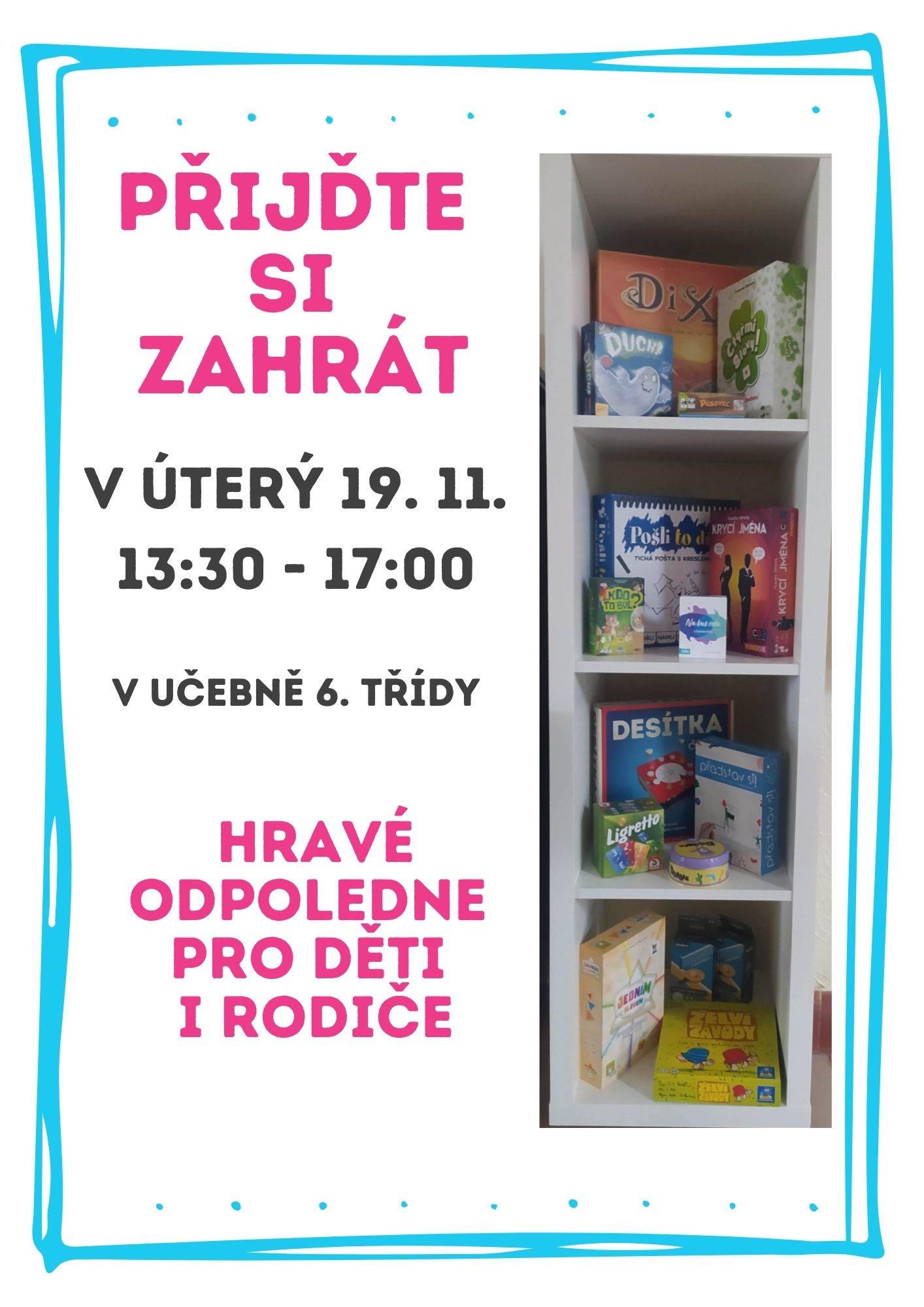 v úterý 19. listopadu odpoledne si budete moci přijít vyzkoušet hry, které jsme do školy pořídili pro žáky na ukrácení dlouhé chvíle nejen o volných hodinách.