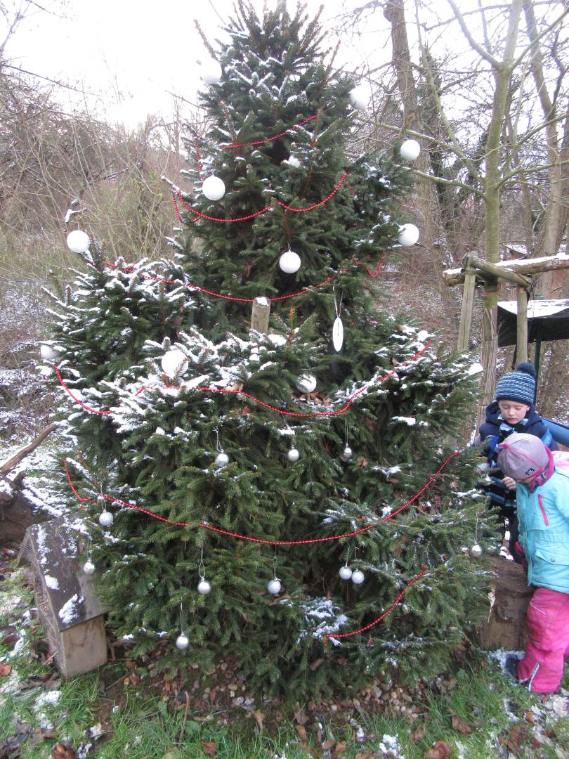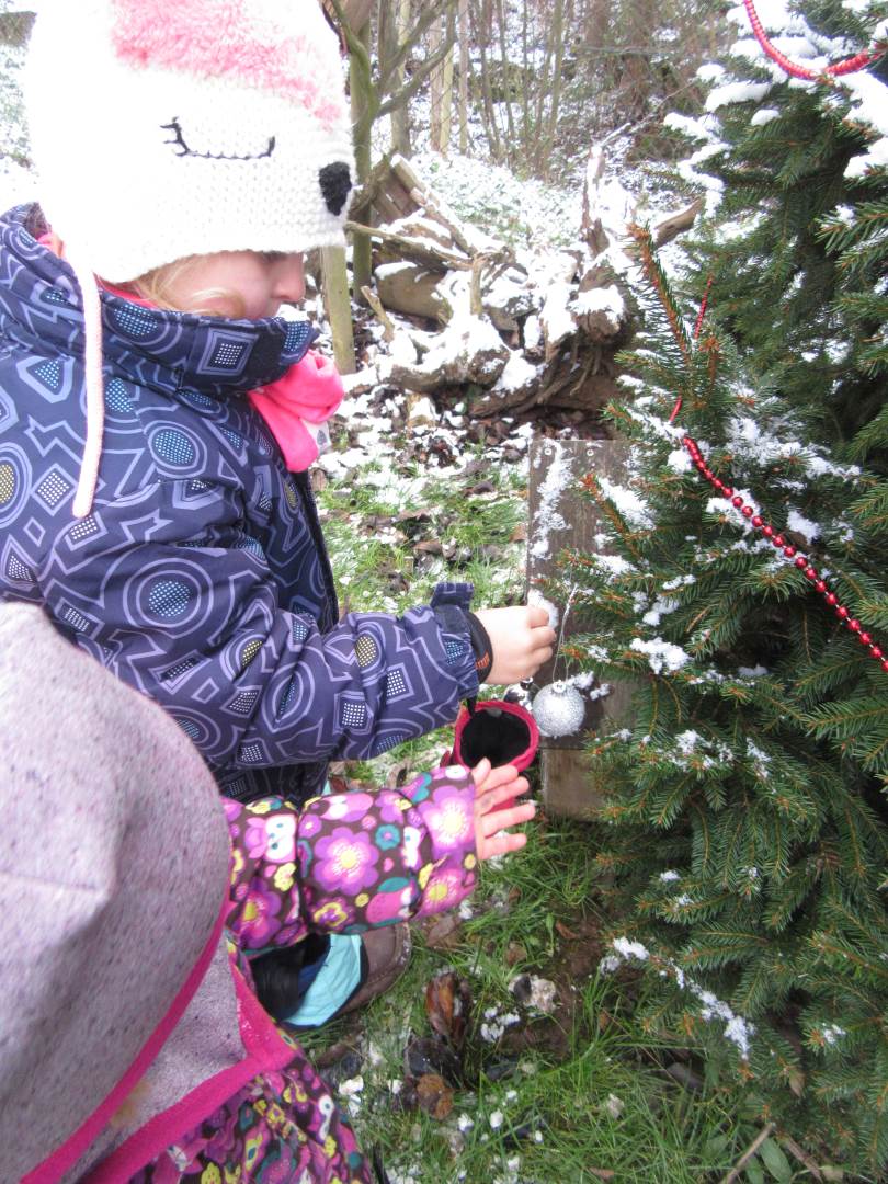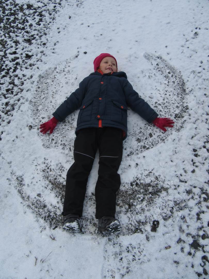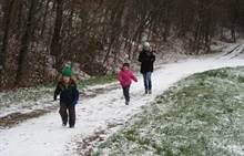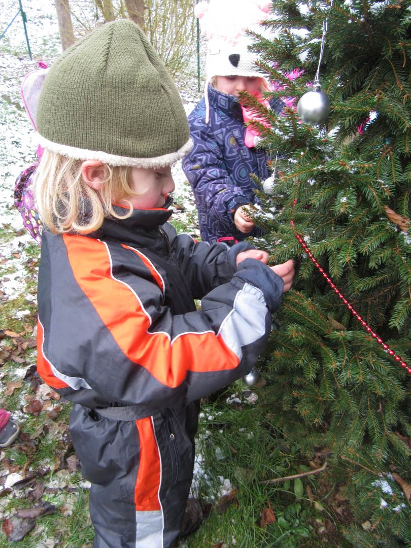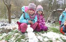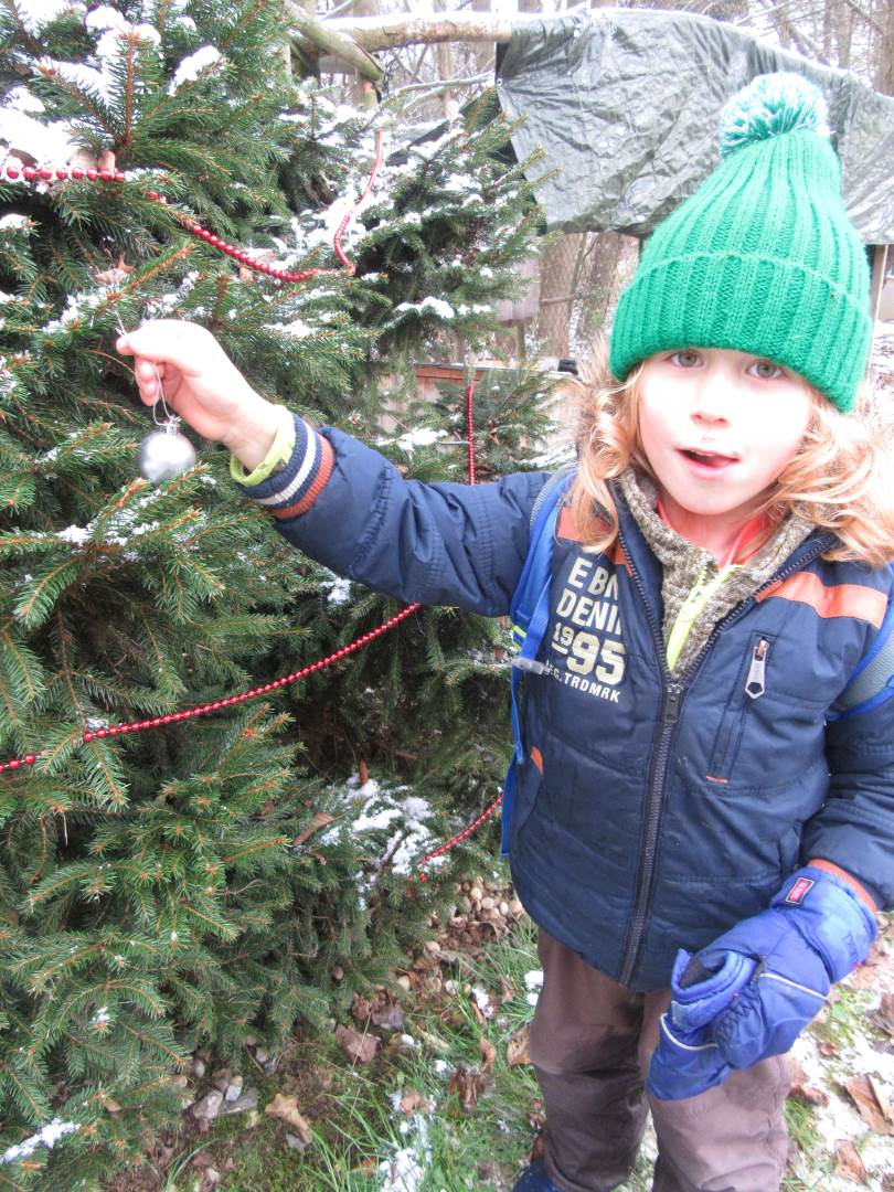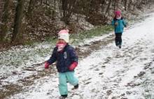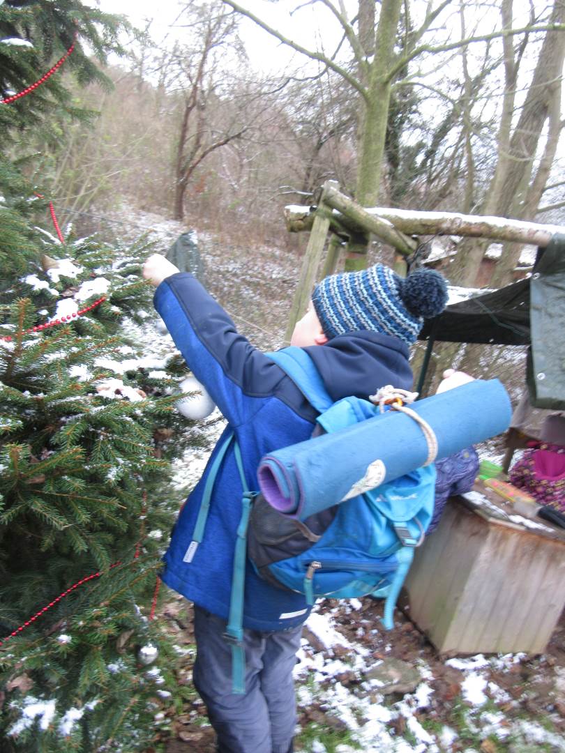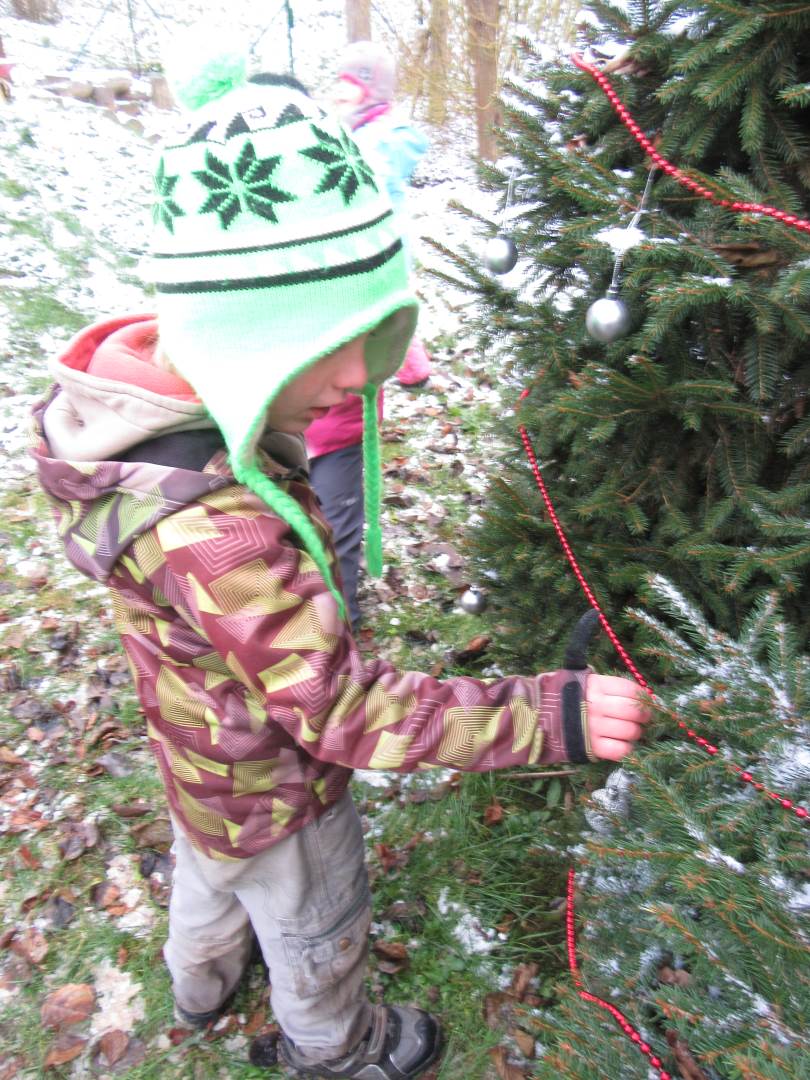 V úterý nám napadl první sních. Vyrazili jsme k maringotce postavit sněhuláky, zahrát si koulovačku, udělat ve sněhu andílka a nazdobit stromeček. Seznámili jsme se s písničkou „Prosinec“ od Uhlíře a Svěráka. Cestou jsme objevili ve sněhu stopy různých zvířátek. Zjistili jsme, že rybník u lesní školky je poloprázdný a zamrzlý. I my jsme byli zmrzlí a tak jsme oběhli celý rybník dokolečka.